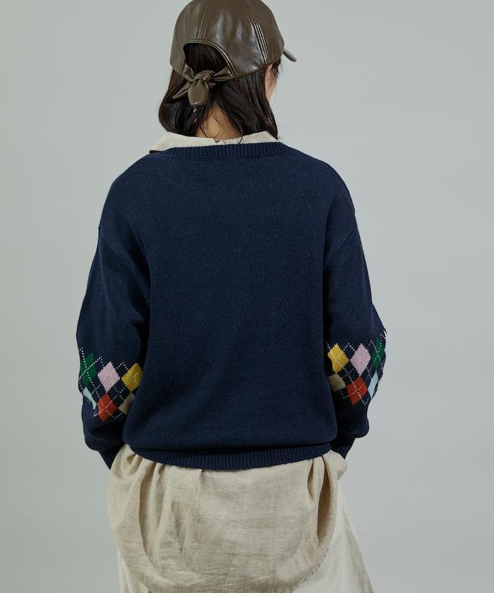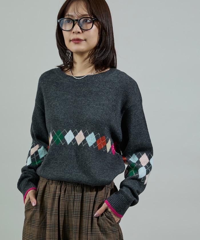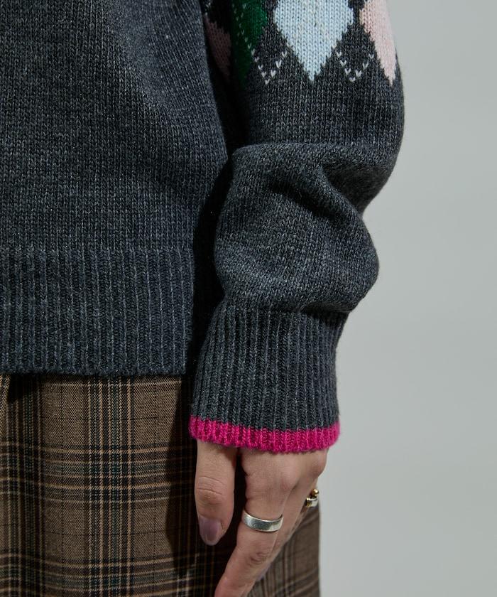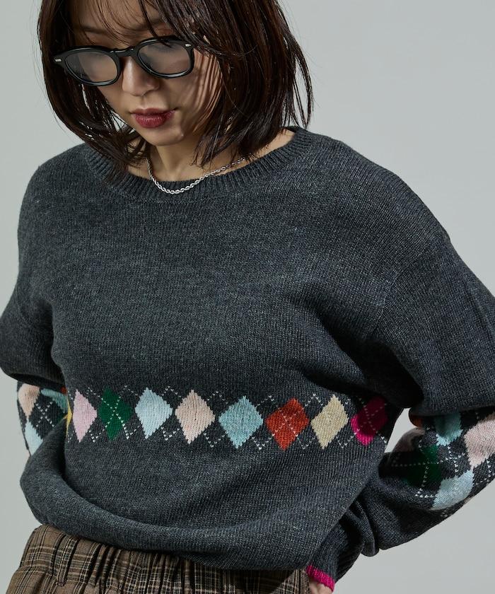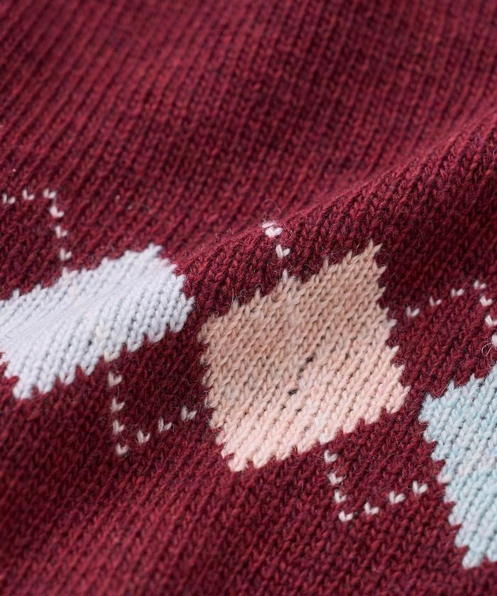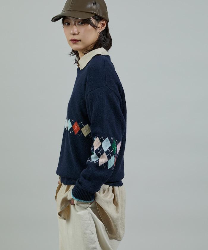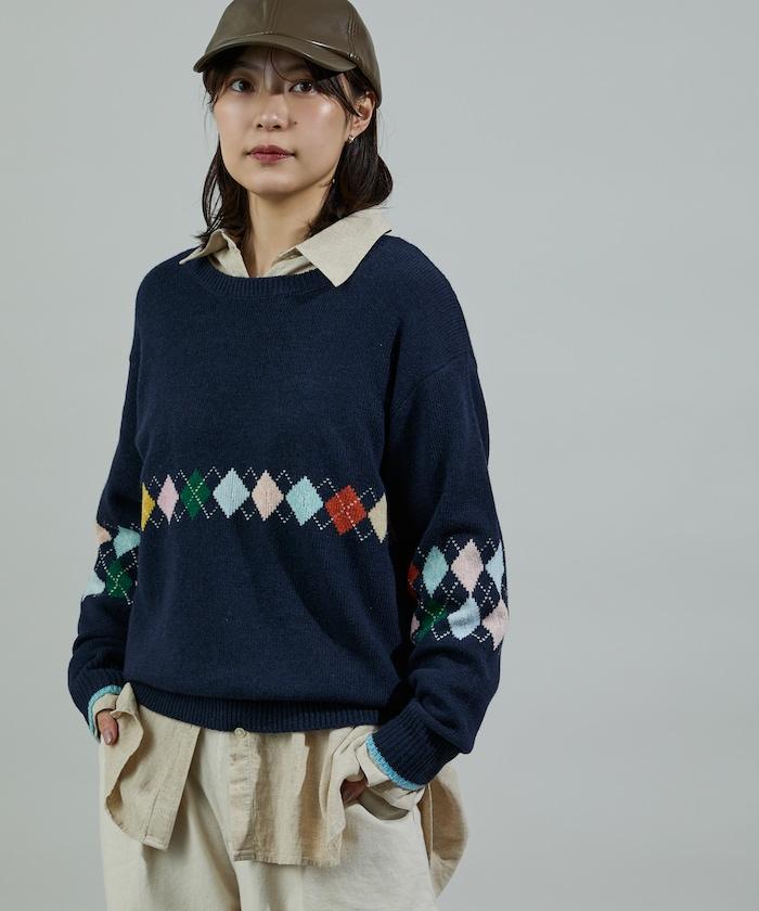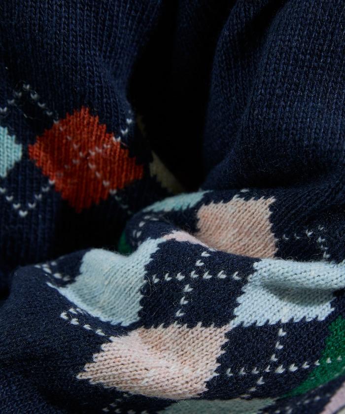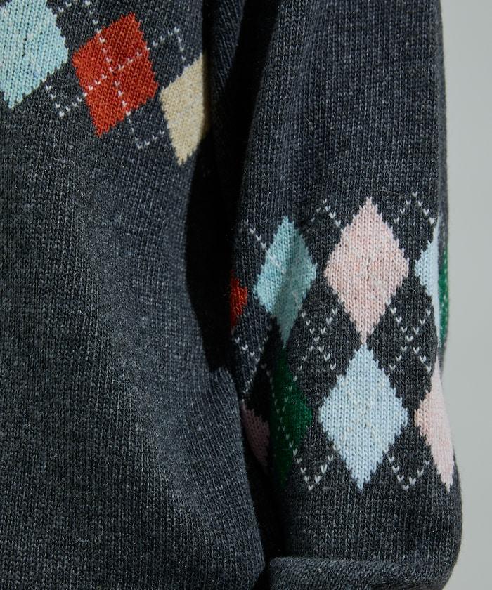 優雅復古的圓領針織衫,配以色彩繽紛的菱格紋圖案。