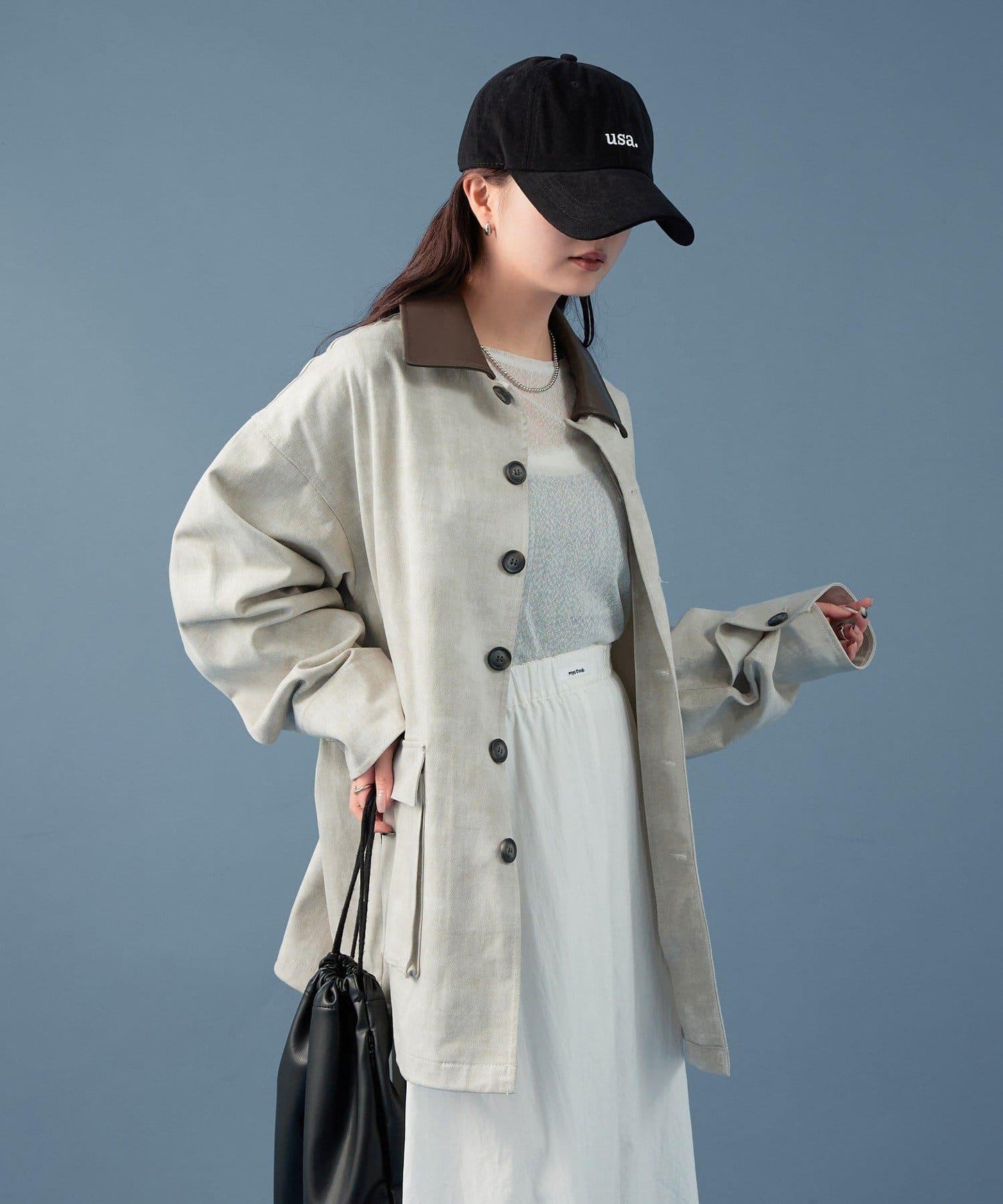 合成革衣領為造型增添了一絲優雅。