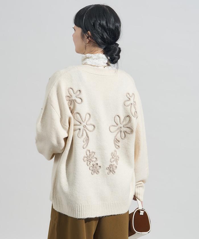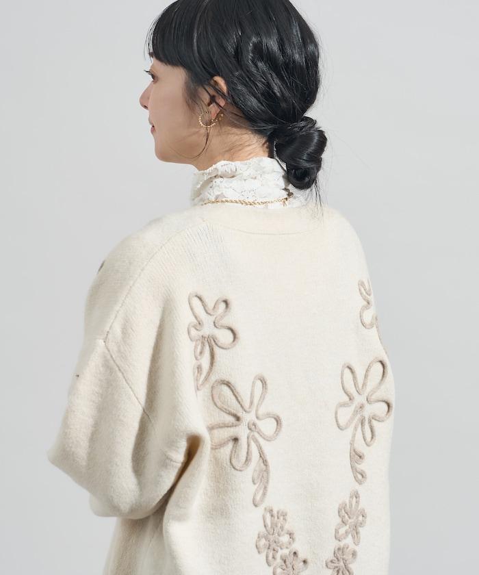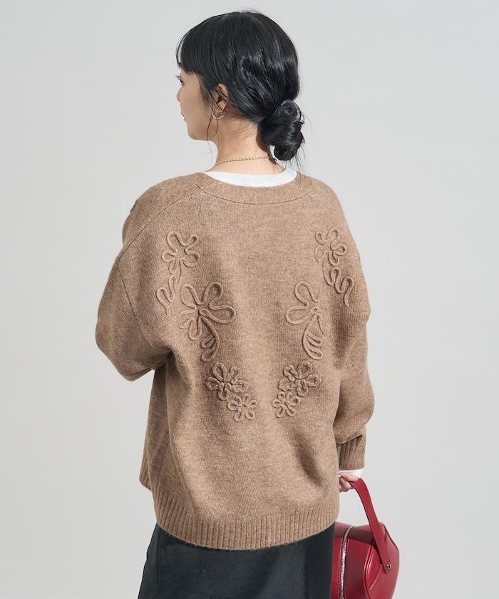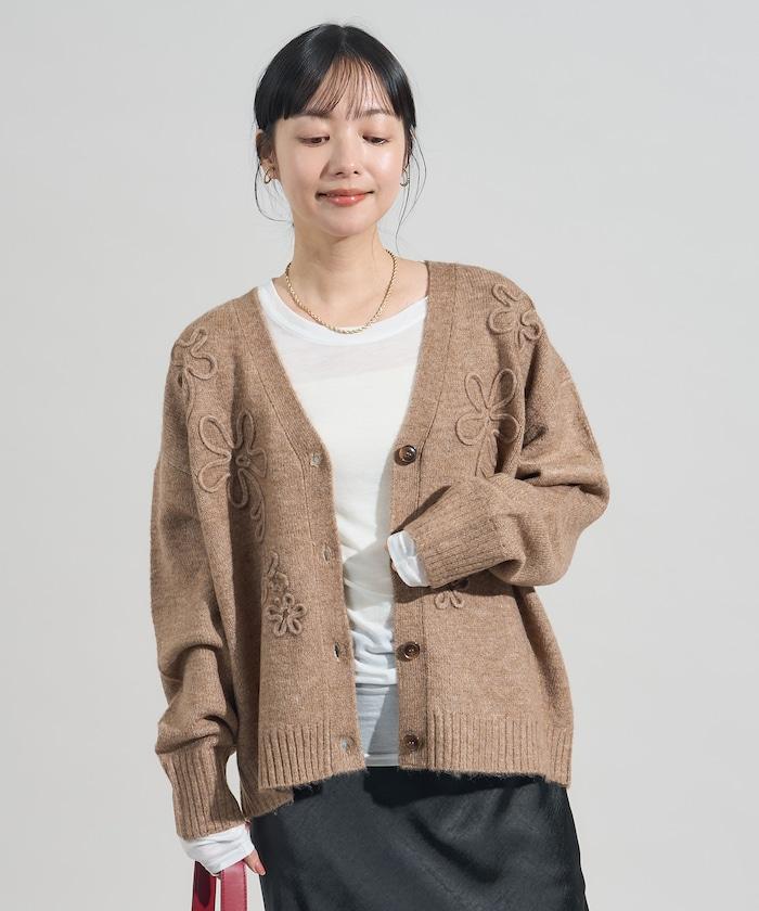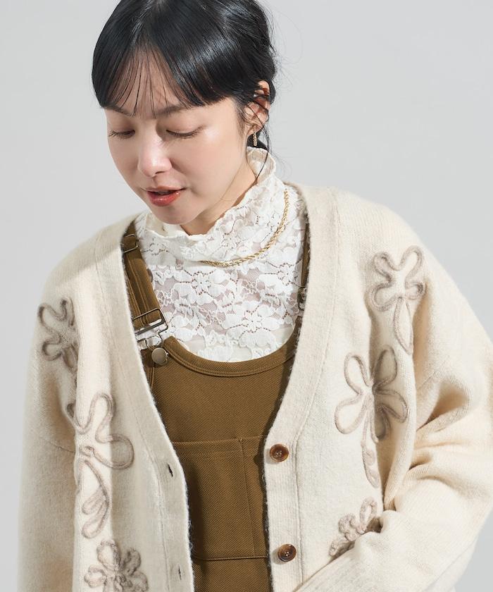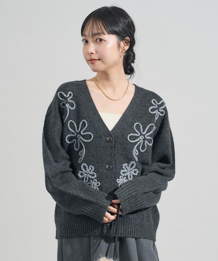 針織開衫上繡有花朵圖案,配以繩帶,盡顯成人女性風範。