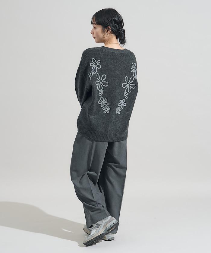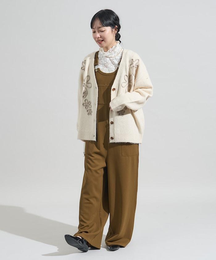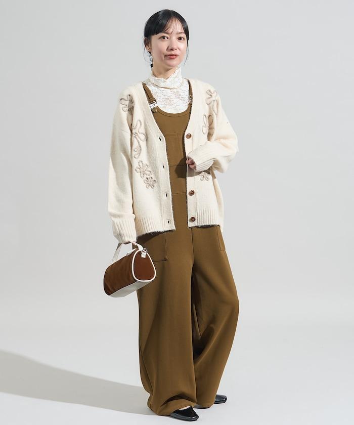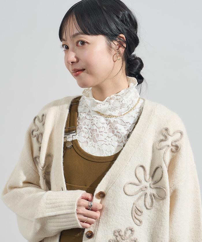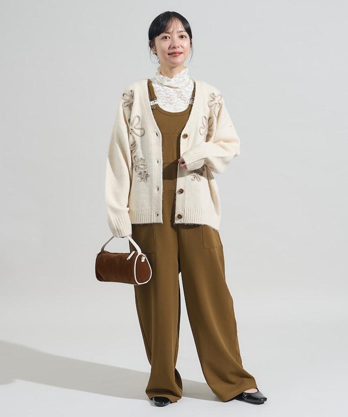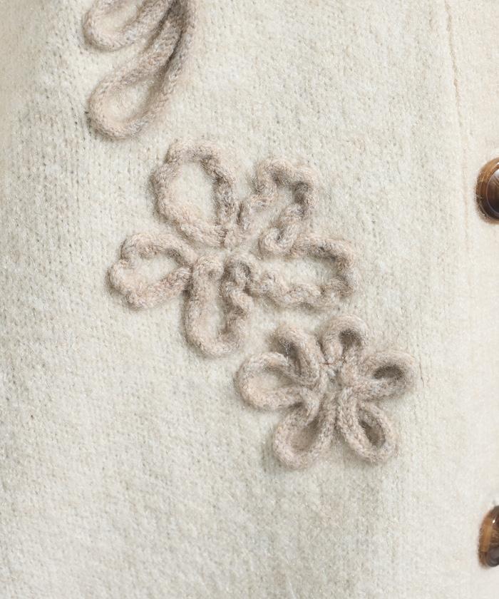 針織開衫上繡有花朵圖案,配以繩帶,盡顯成人女性風範。
