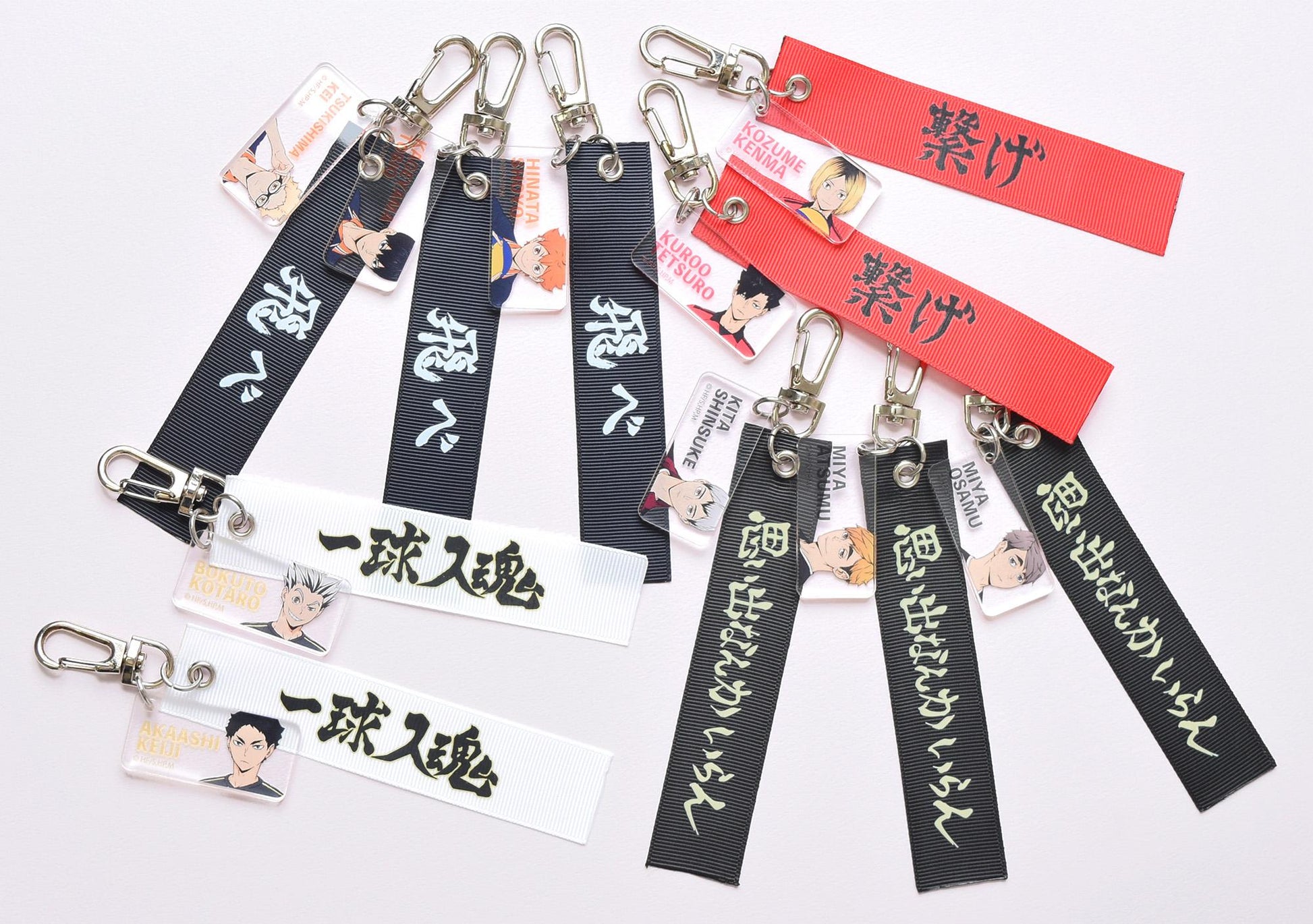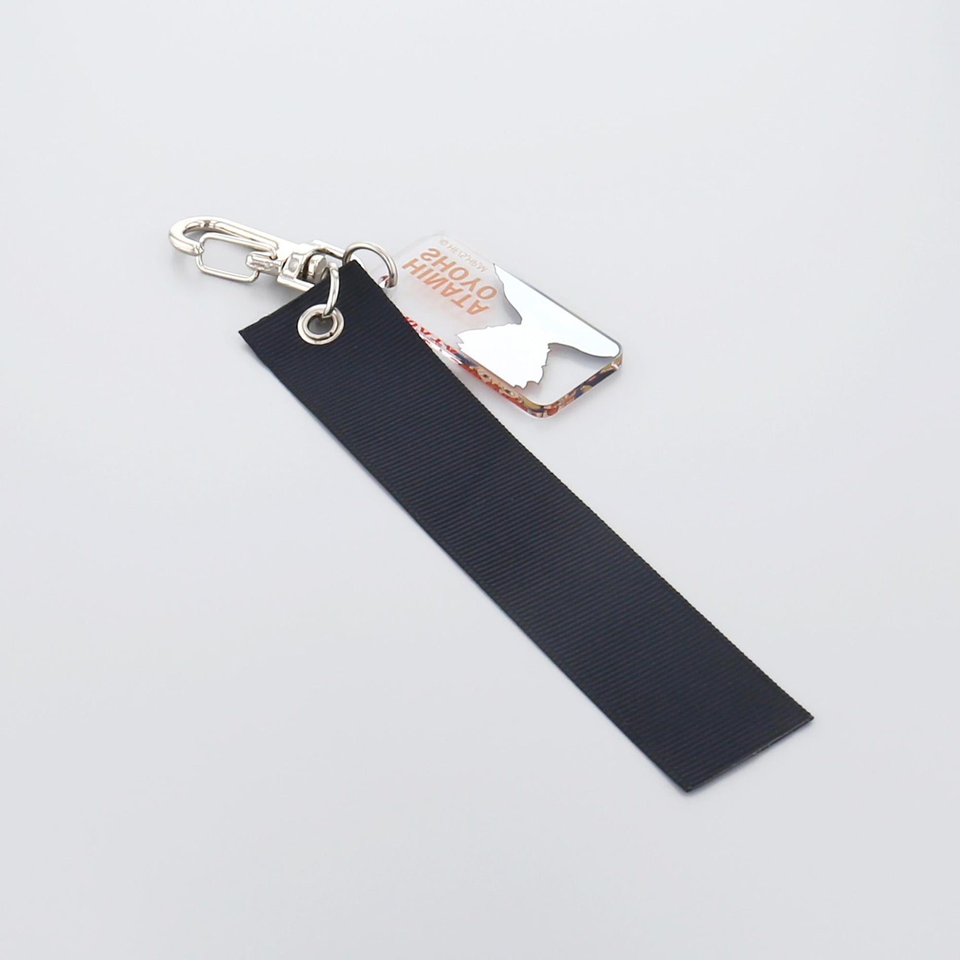鑰匙圈上的亞克力吊飾與帶有橫幅圖案的膠帶相連。