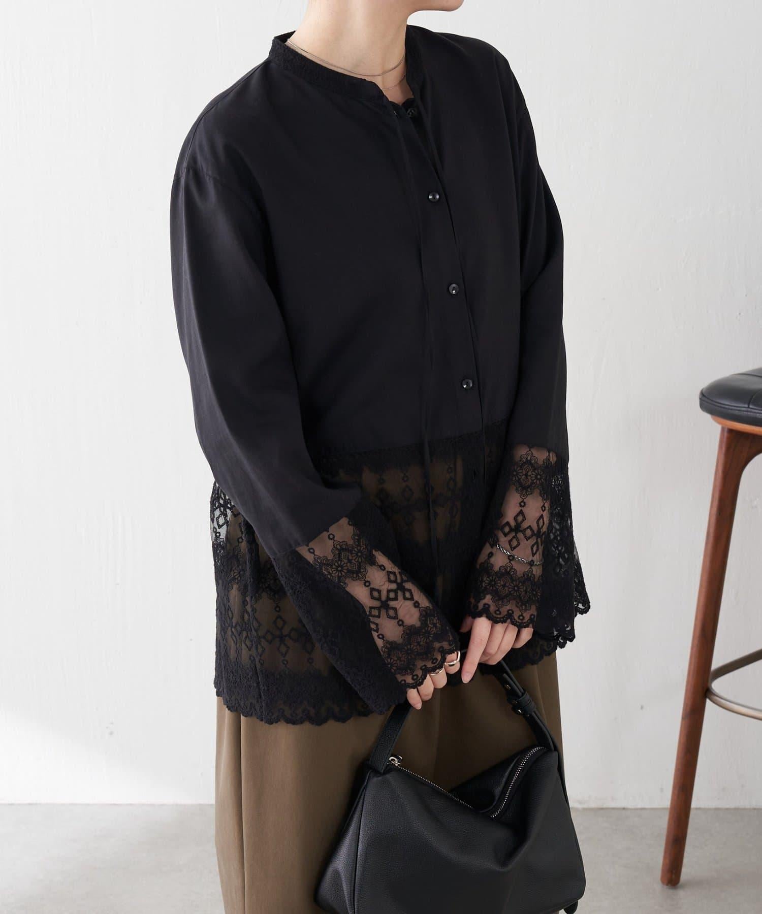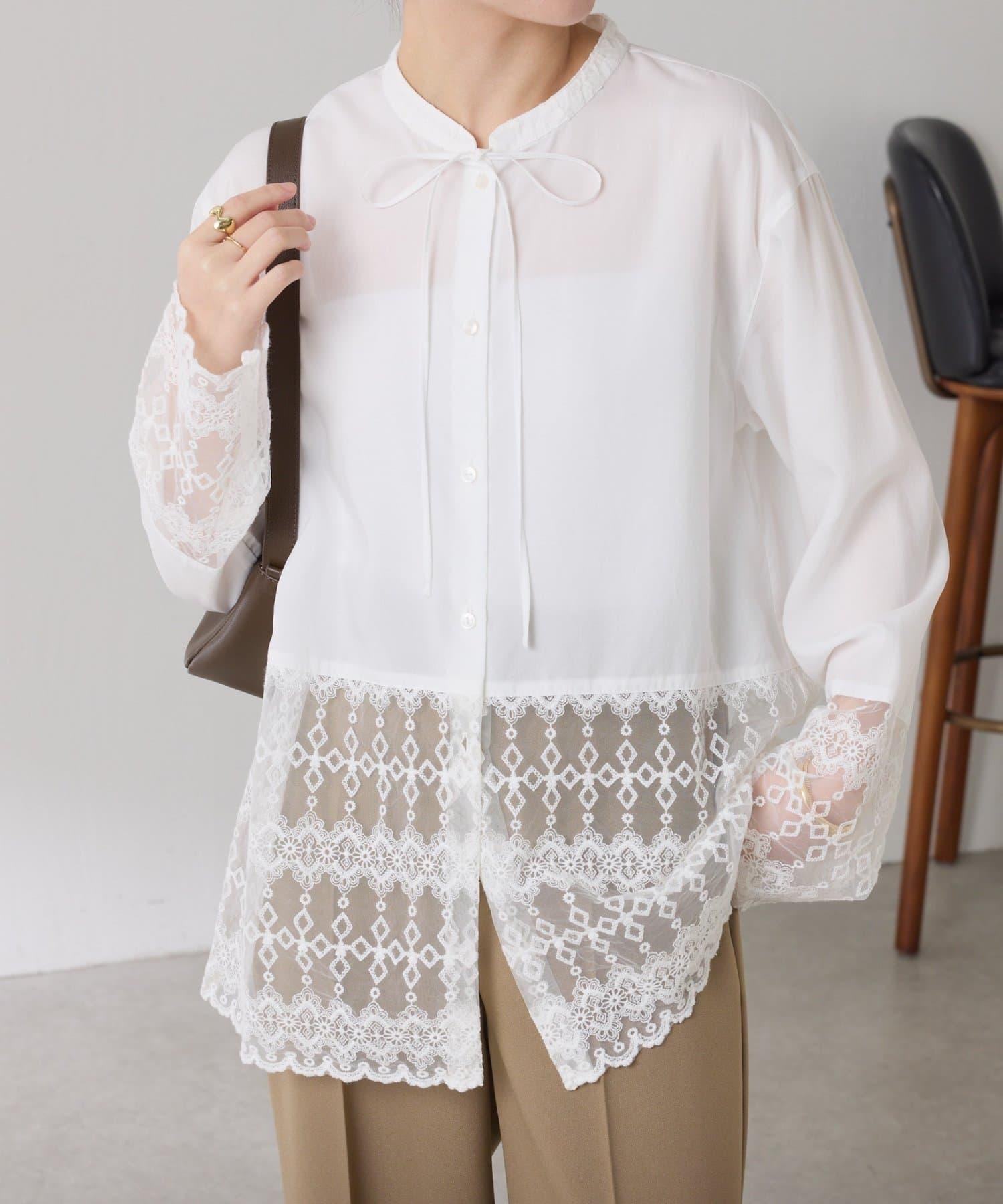 【推薦疊穿】蝴蝶結領下襬蕾絲拼接襯衫