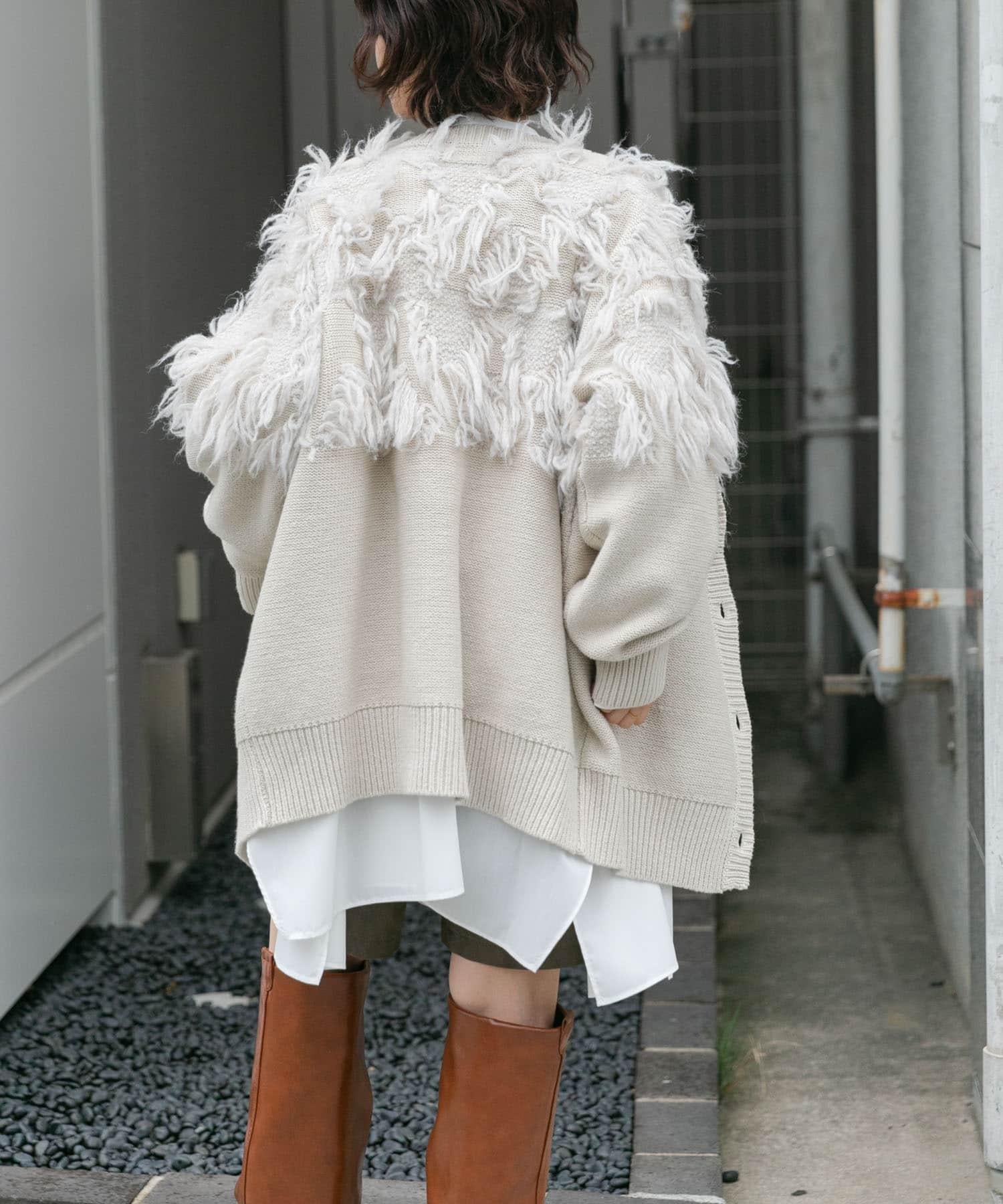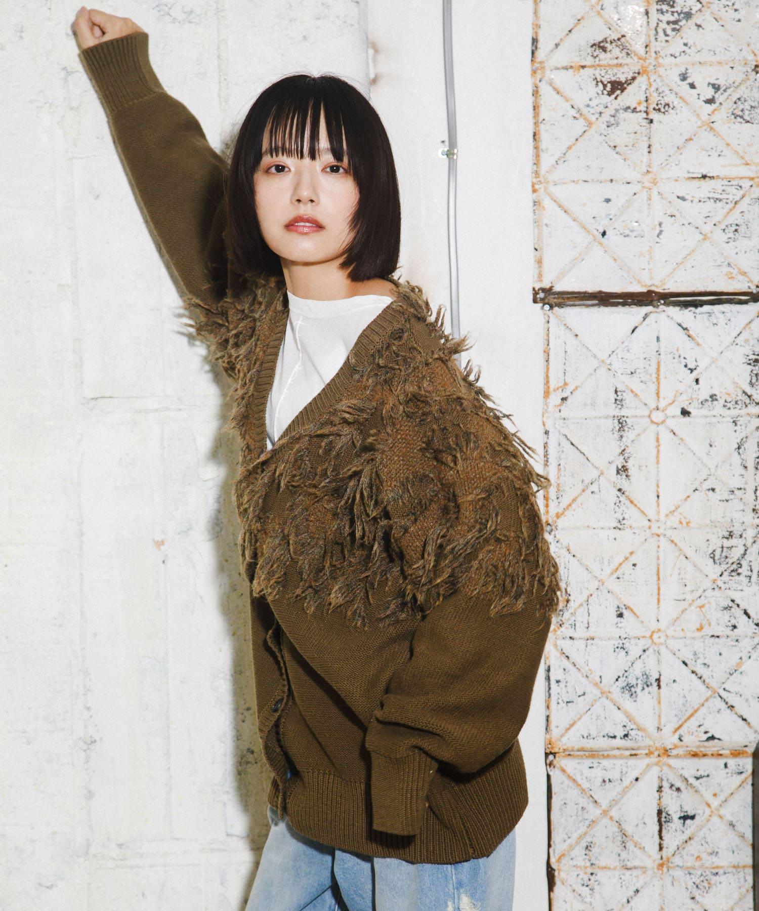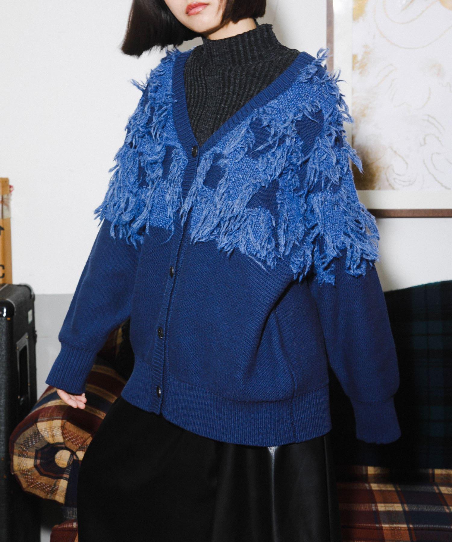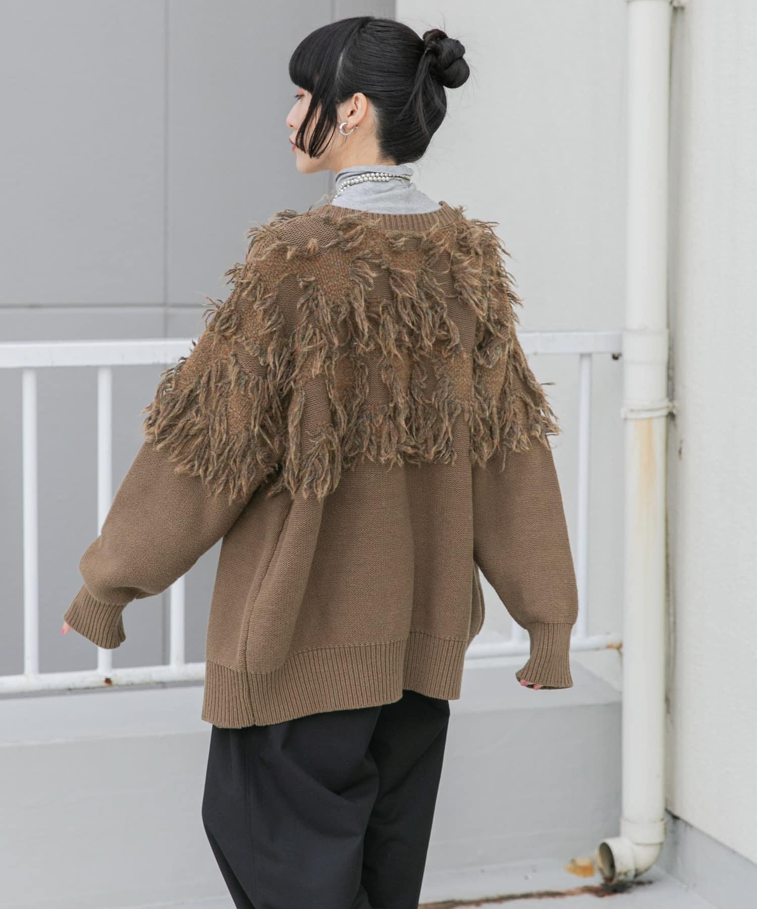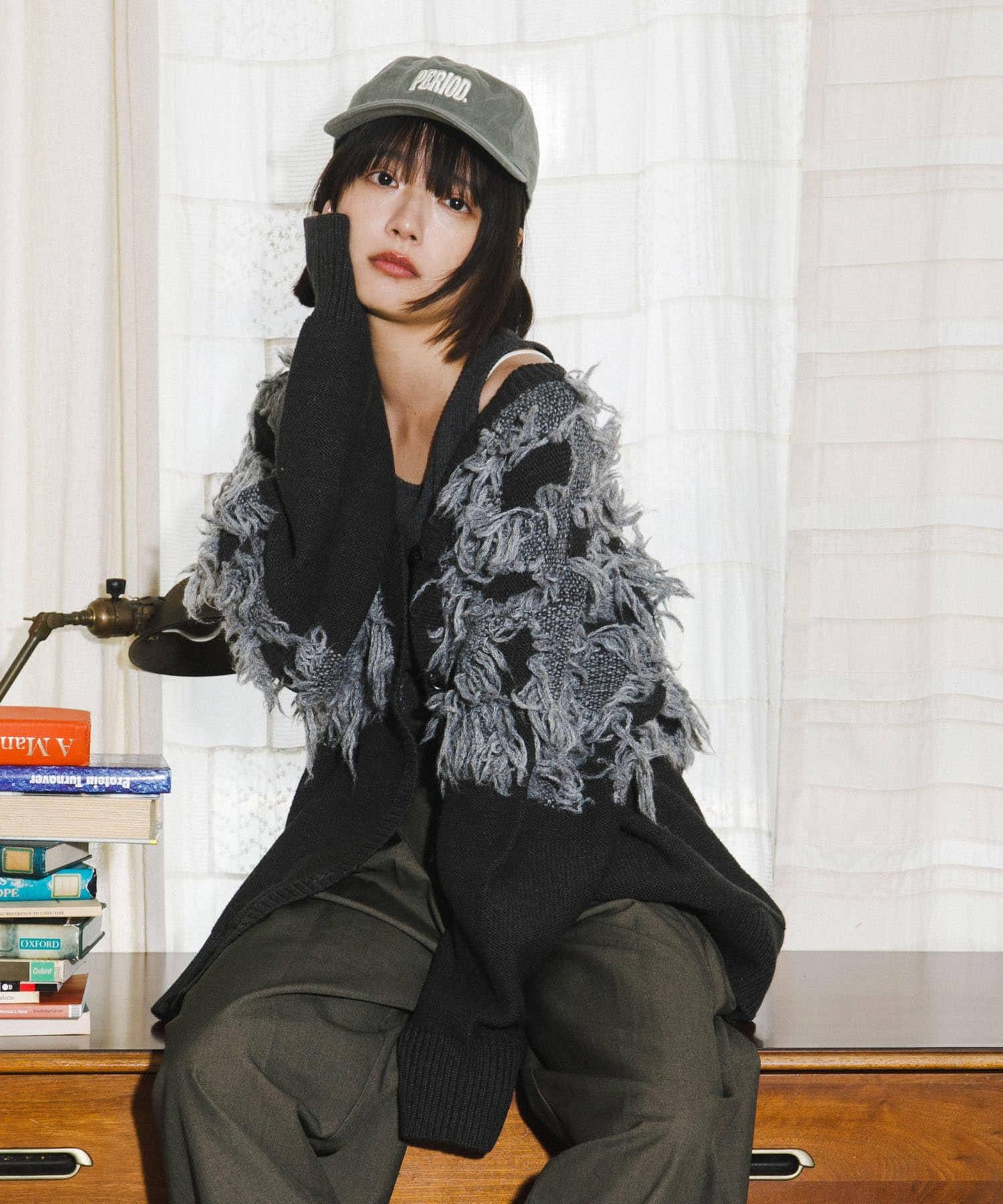 這款開襟羊毛衫的上部帶有獨特、蓬鬆的提花流蘇。它的長度和寬鬆的輪廓遮住了腰部,可作為外衣穿著。根據內搭的不同,它還可以長期穿著。豐富的色彩變化搭配不同的氛圍也值得一提。