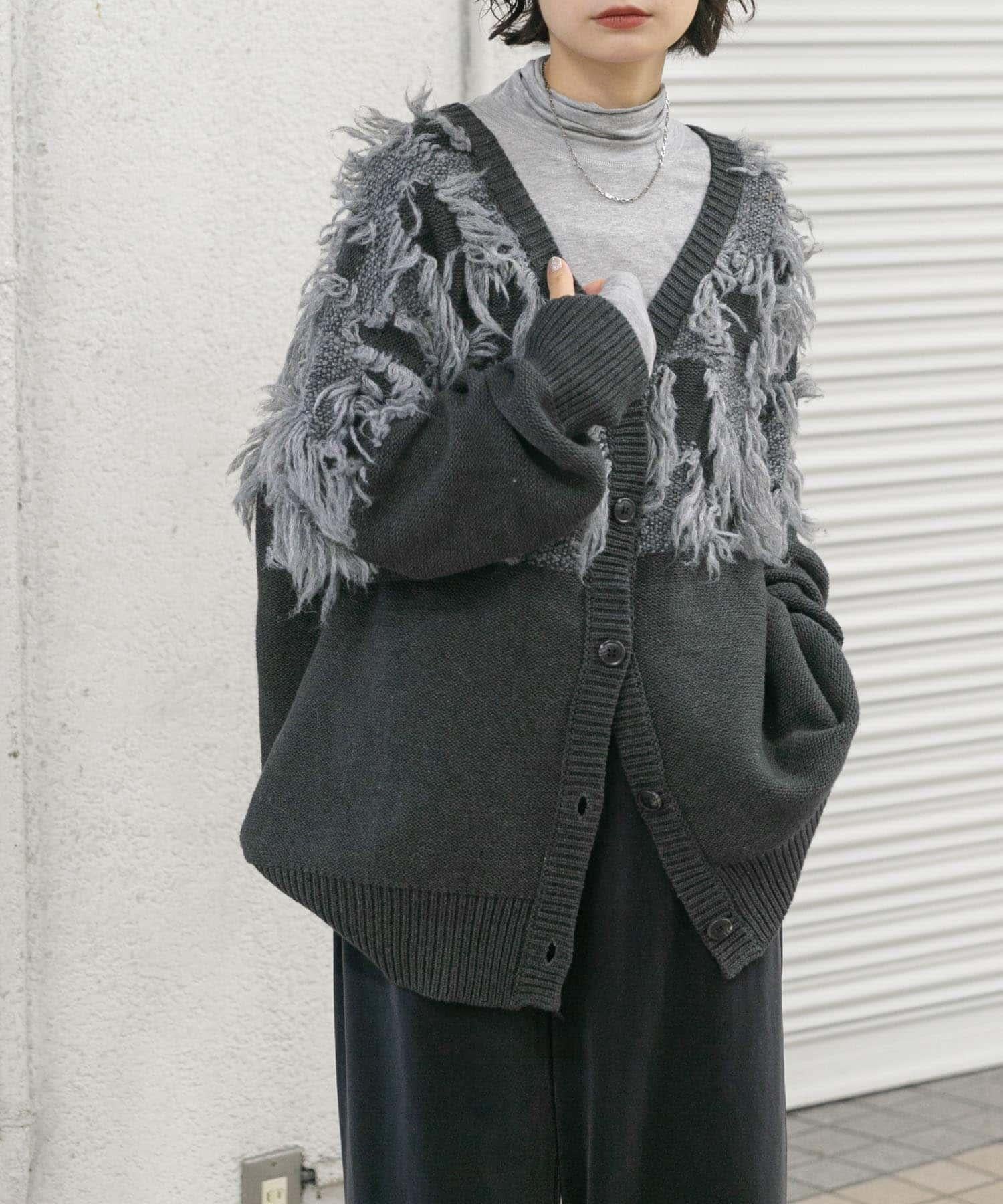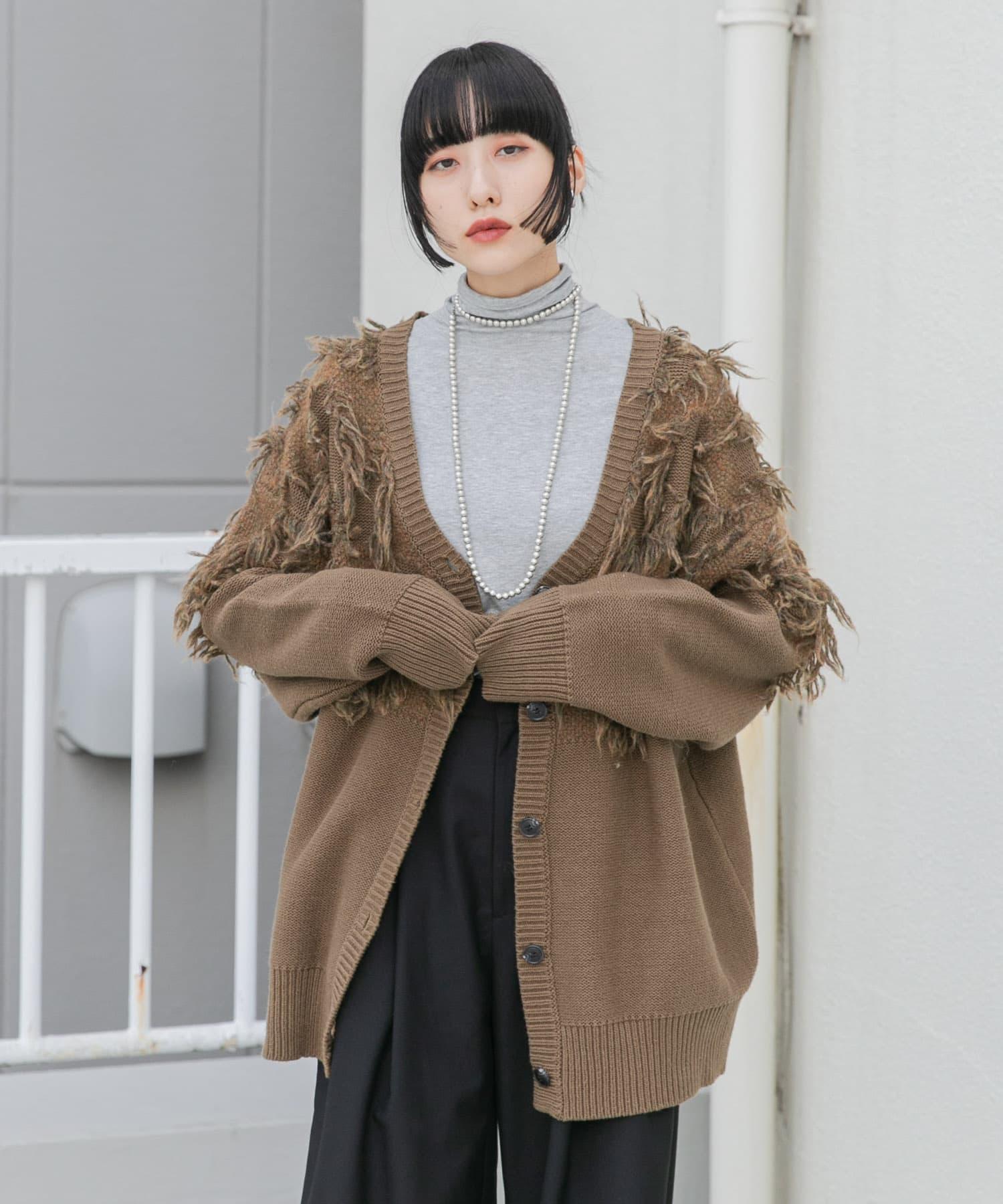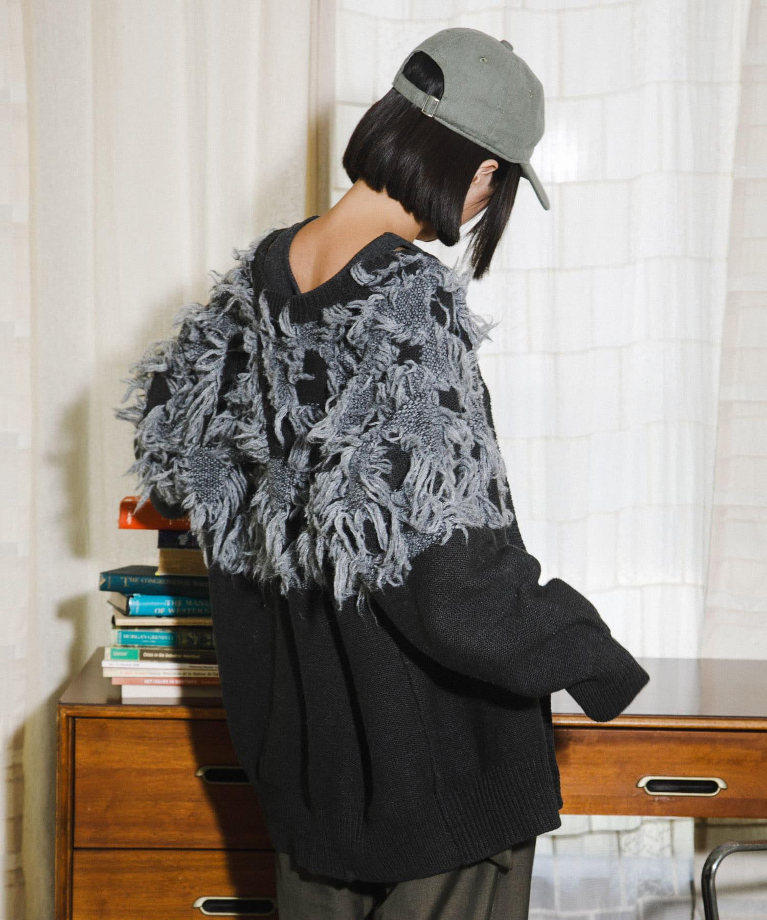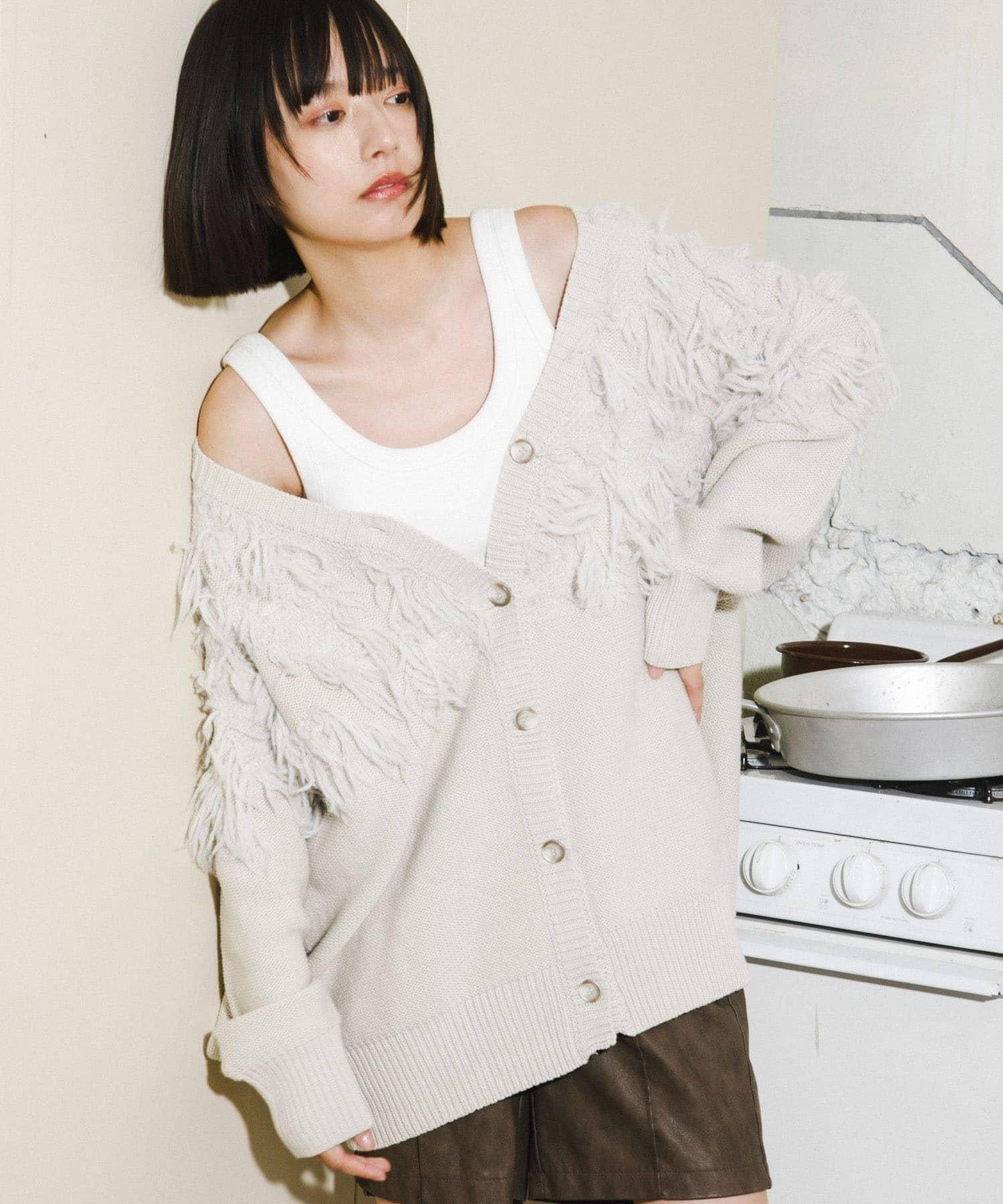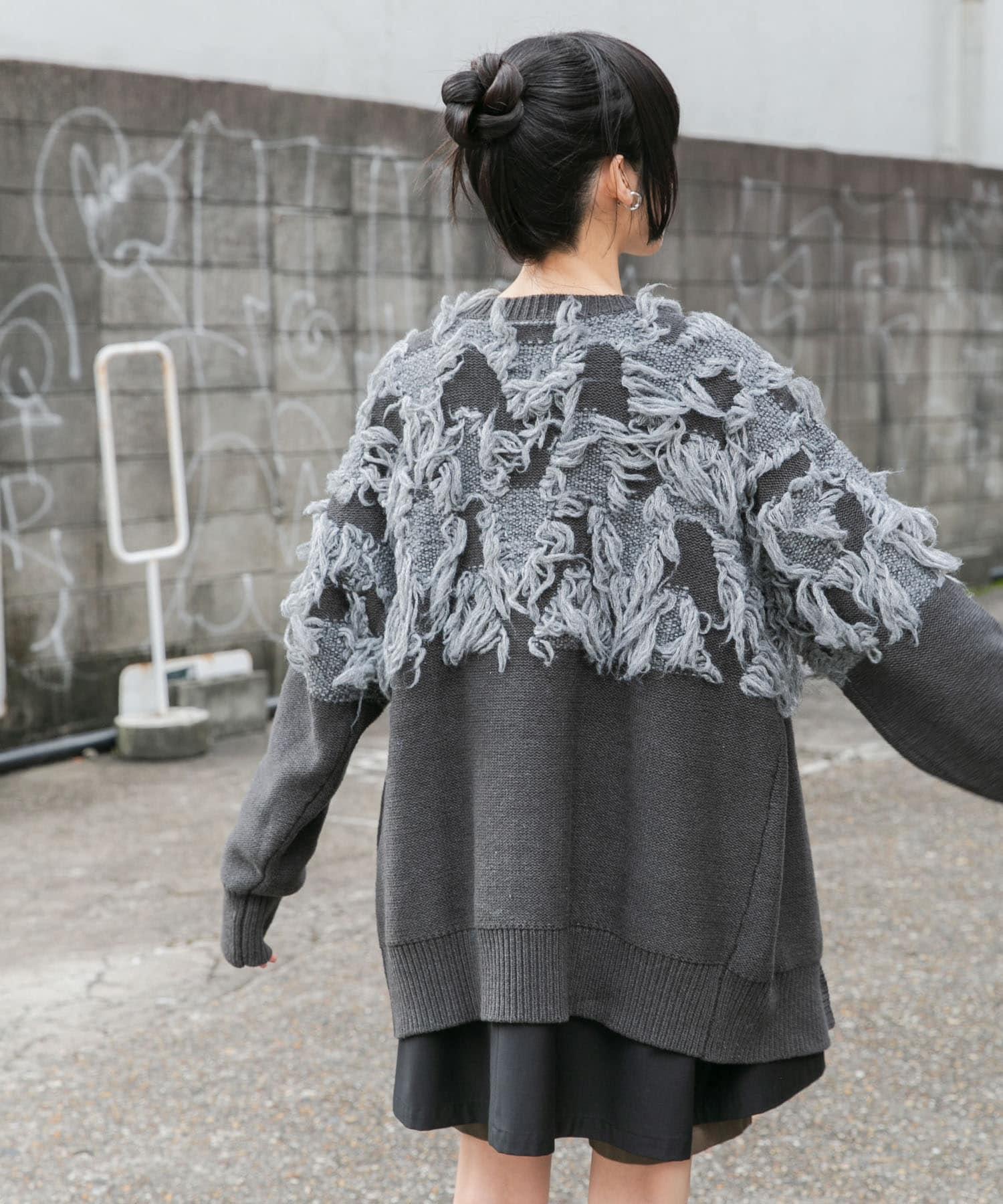 這款開襟羊毛衫的上部帶有獨特、蓬鬆的提花流蘇。它的長度和寬鬆的輪廓遮住了腰部,可作為外衣穿著。根據內搭的不同,它還可以長期穿著。豐富的色彩變化搭配不同的氛圍也值得一提。