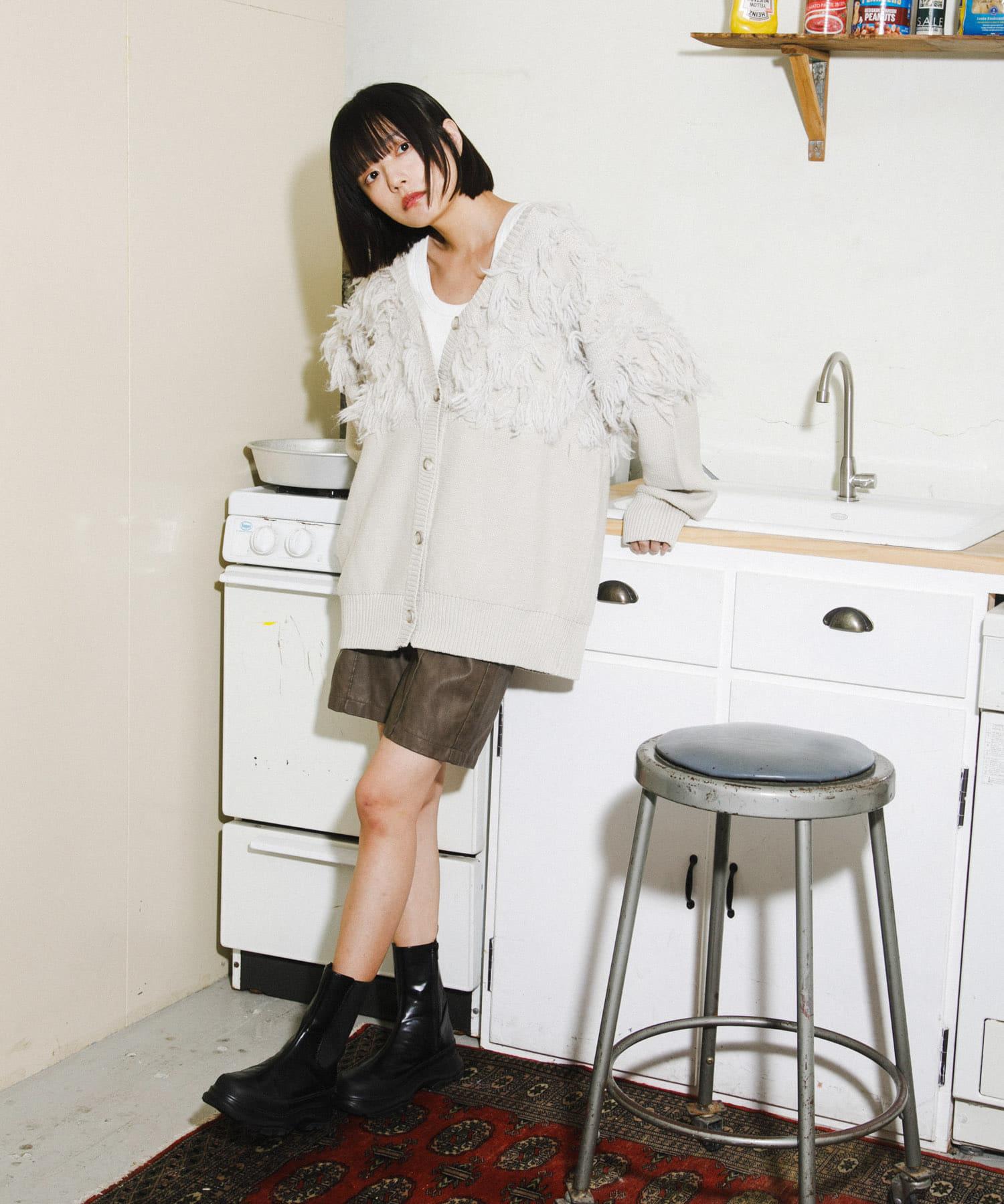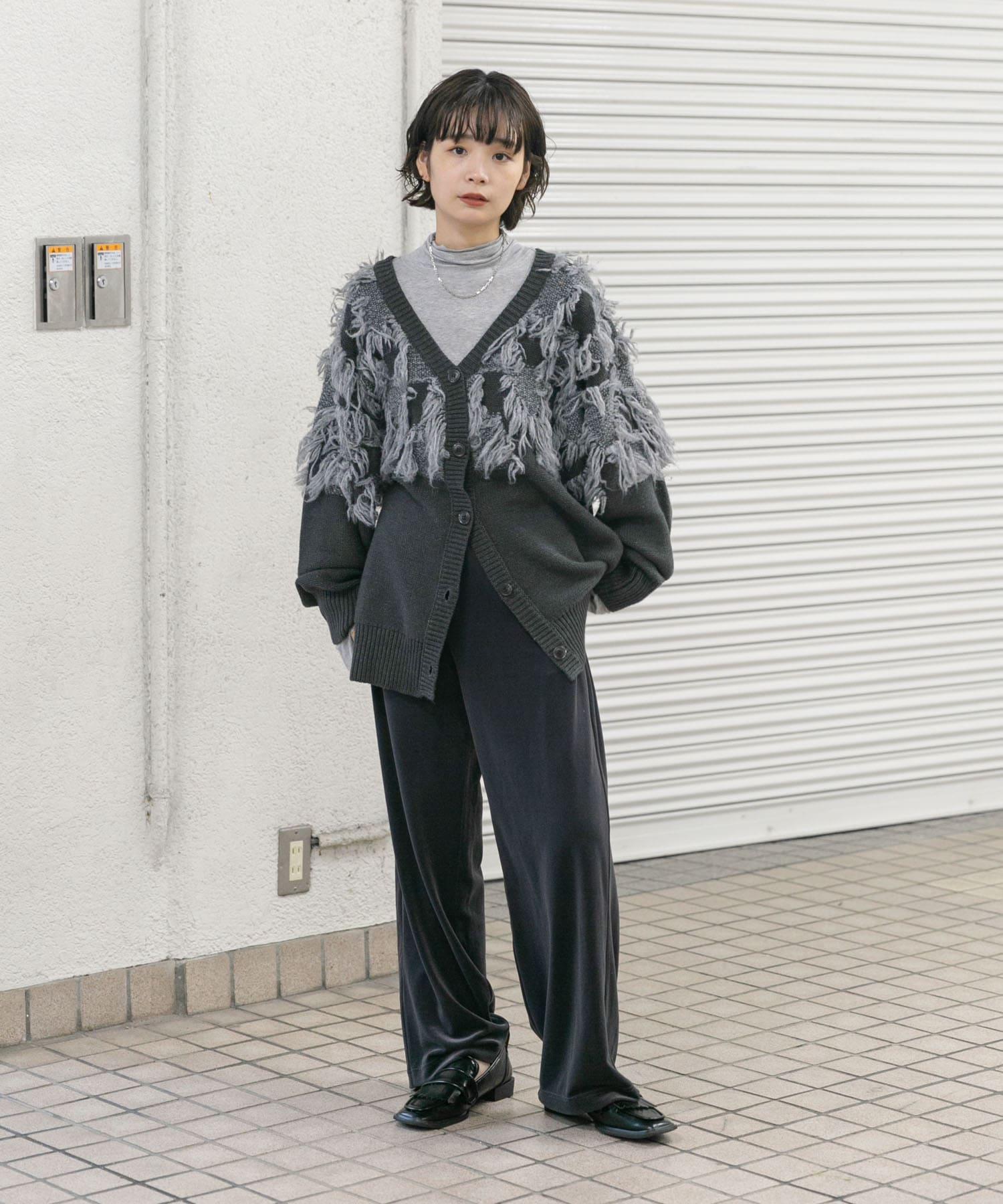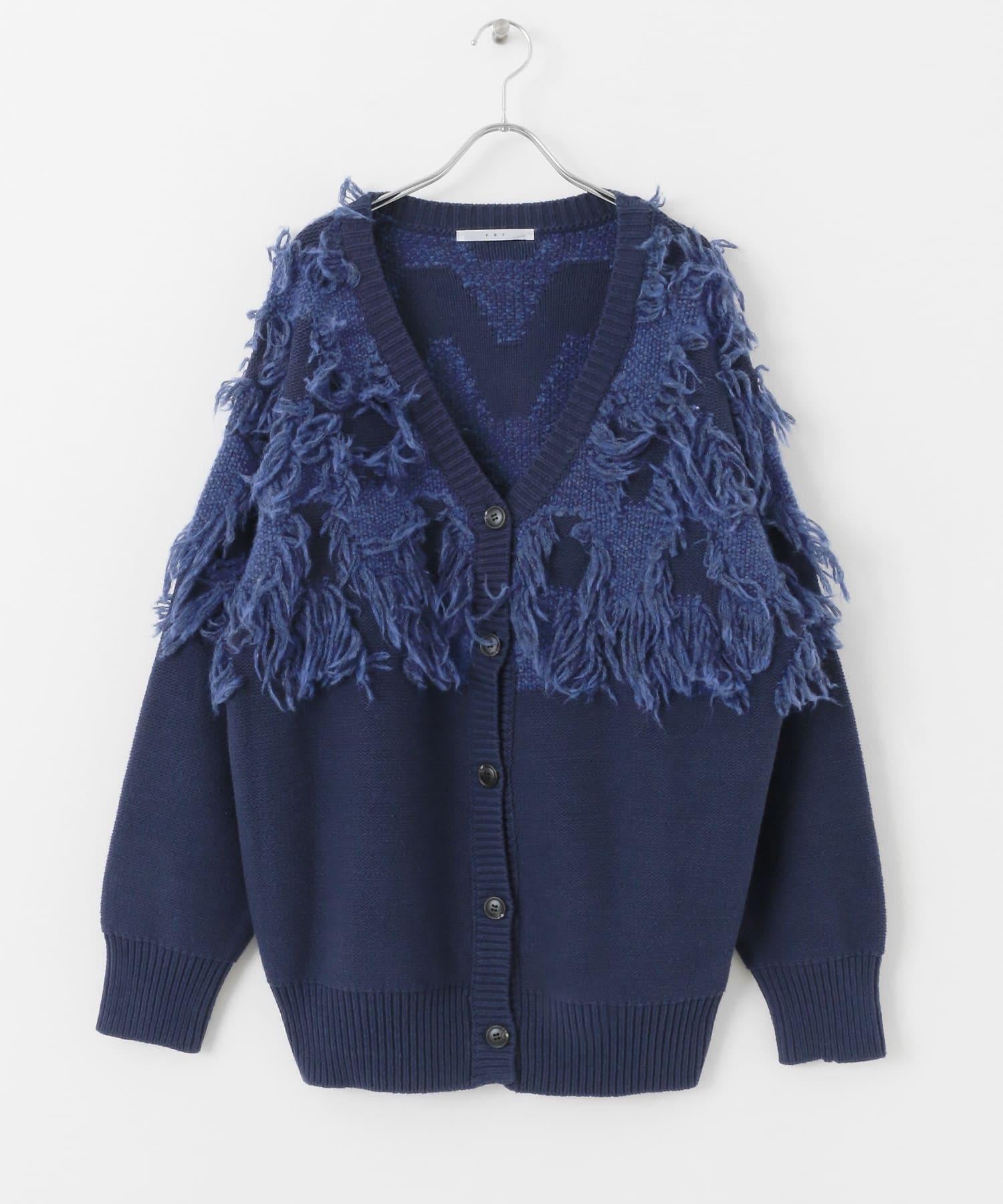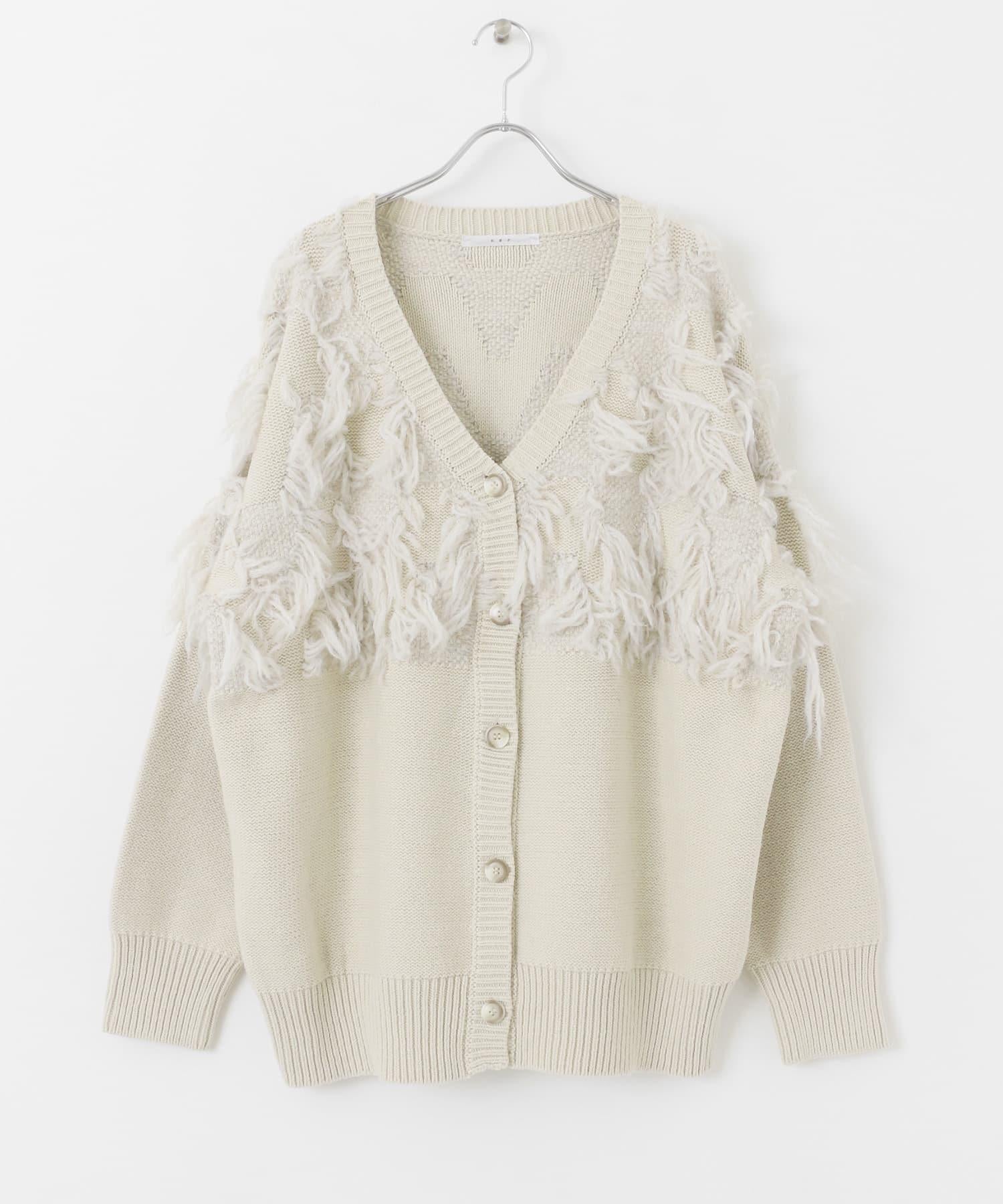 這款開襟羊毛衫的上部帶有獨特、蓬鬆的提花流蘇。它的長度和寬鬆的輪廓遮住了腰部,可作為外衣穿著。根據內搭的不同,它還可以長期穿著。豐富的色彩變化搭配不同的氛圍也值得一提。