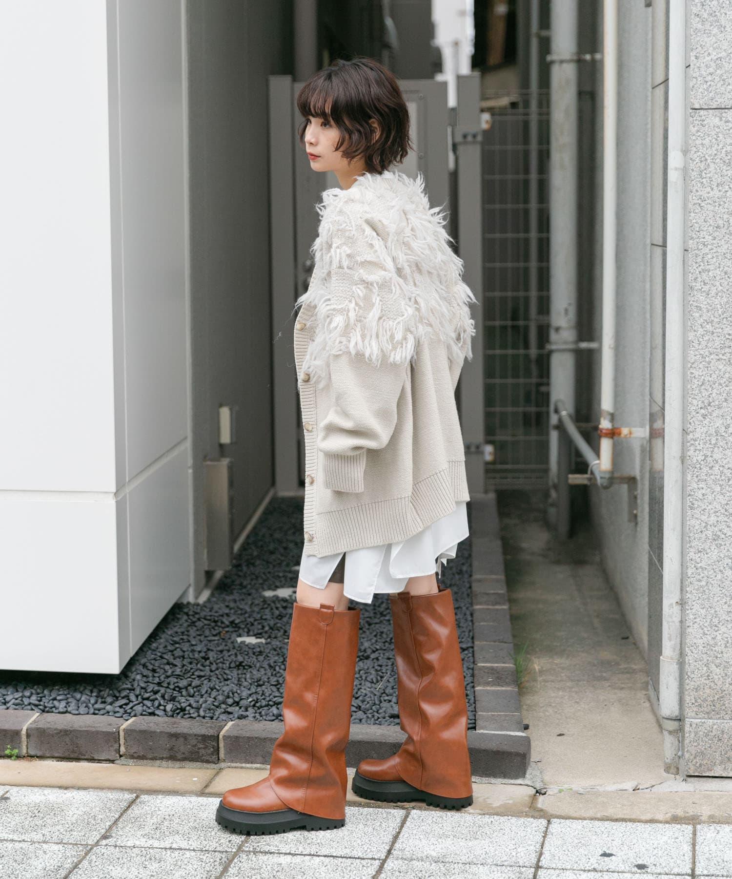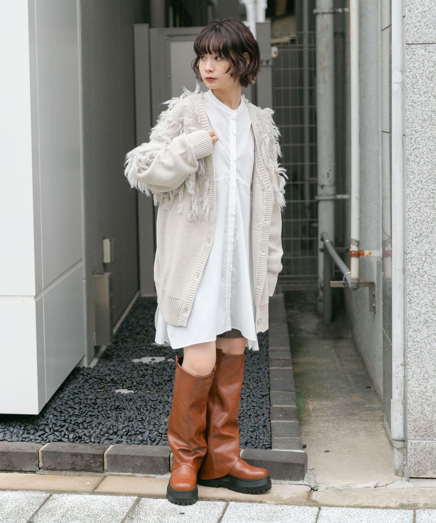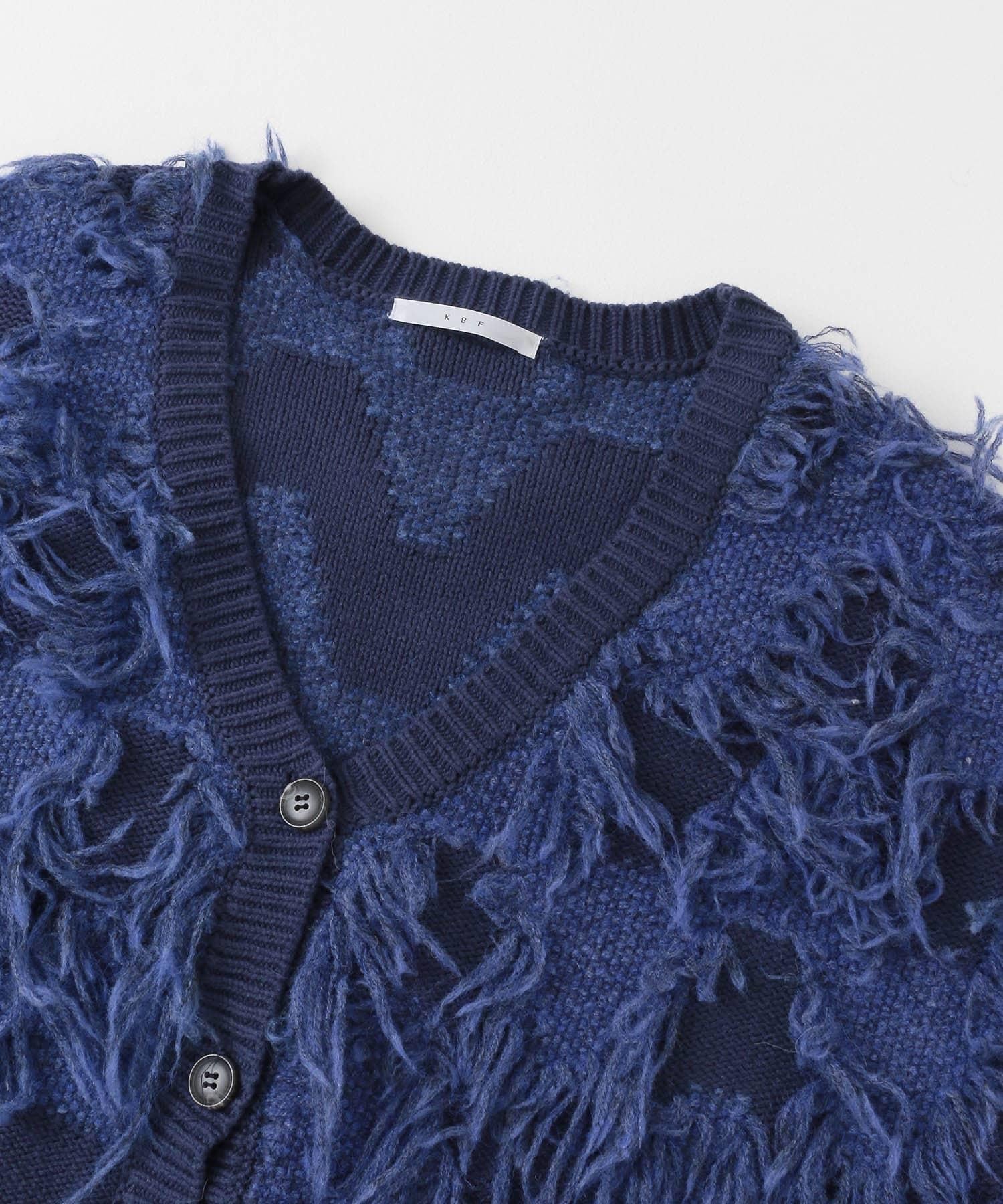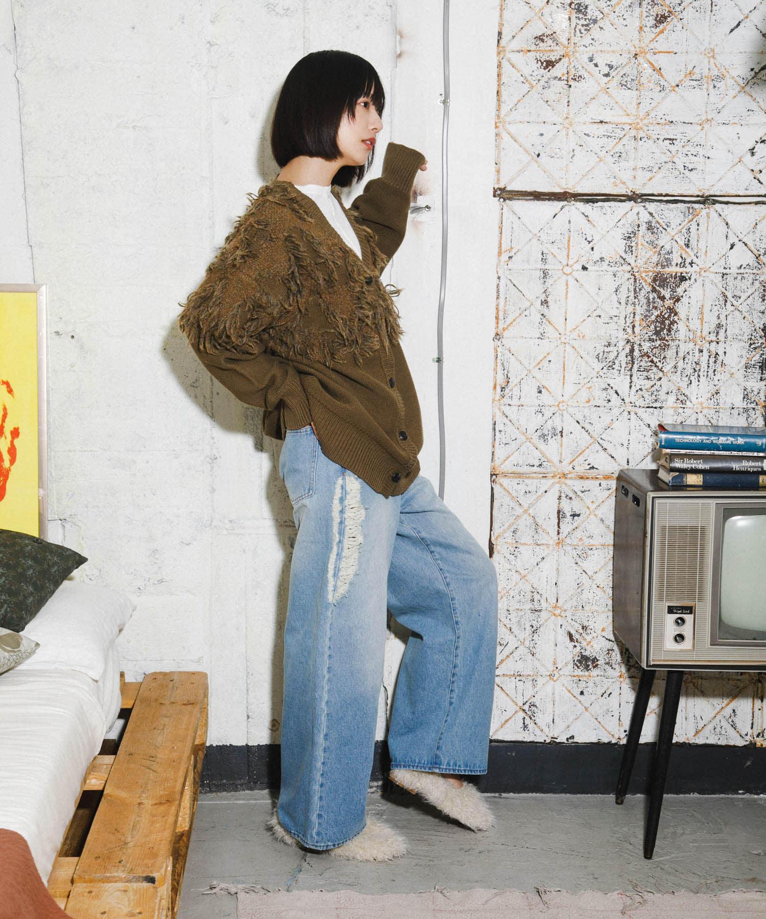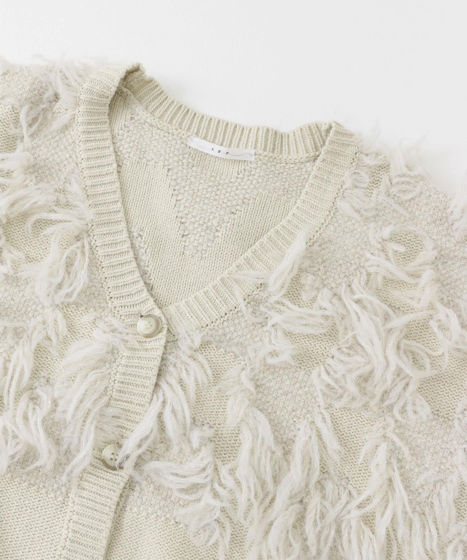 這款開襟羊毛衫的上部帶有獨特、蓬鬆的提花流蘇。它的長度和寬鬆的輪廓遮住了腰部,可作為外衣穿著。根據內搭的不同,它還可以長期穿著。豐富的色彩變化搭配不同的氛圍也值得一提。