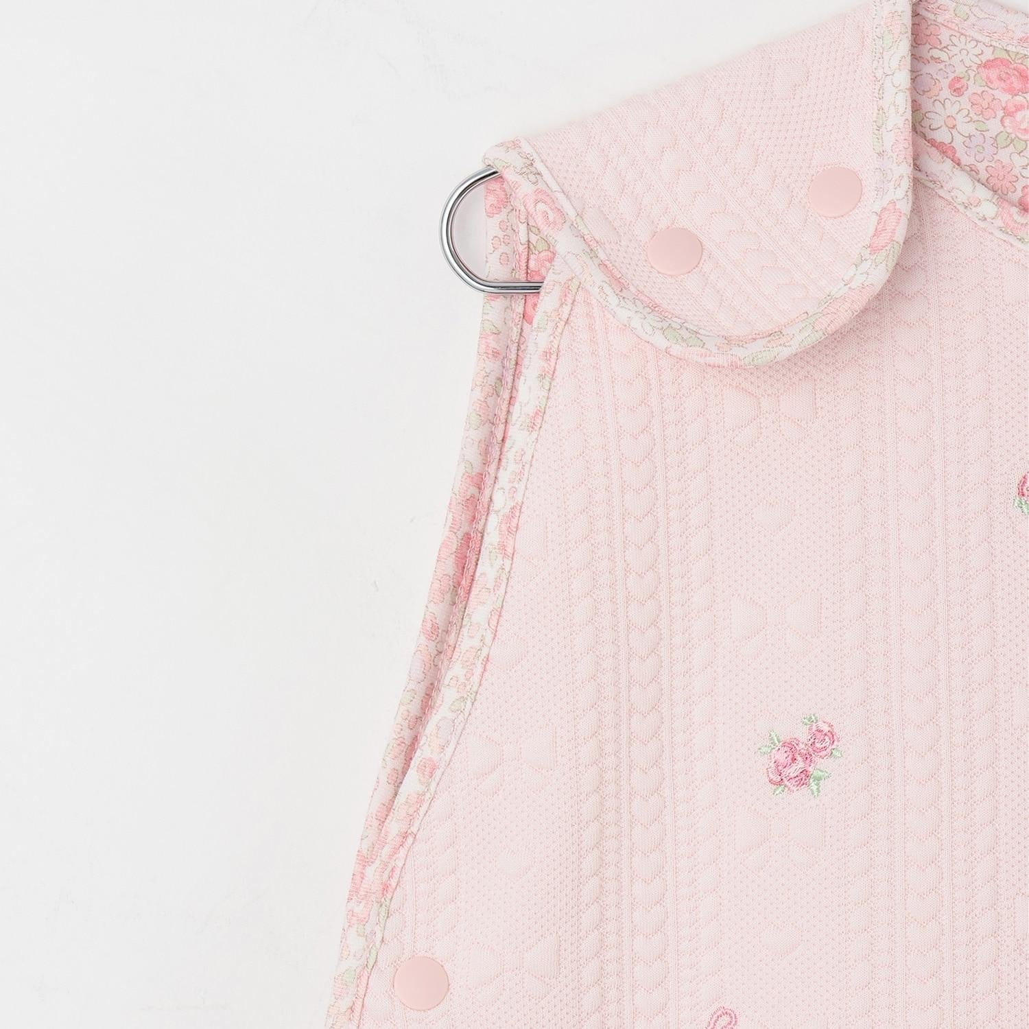 表面由 Mezzopiano 獨創的絲帶圖案蓬鬆提花布製成,內裡由小花圖案的光滑面料製成,這種保暖面料從初秋天氣轉冷時開始使用。