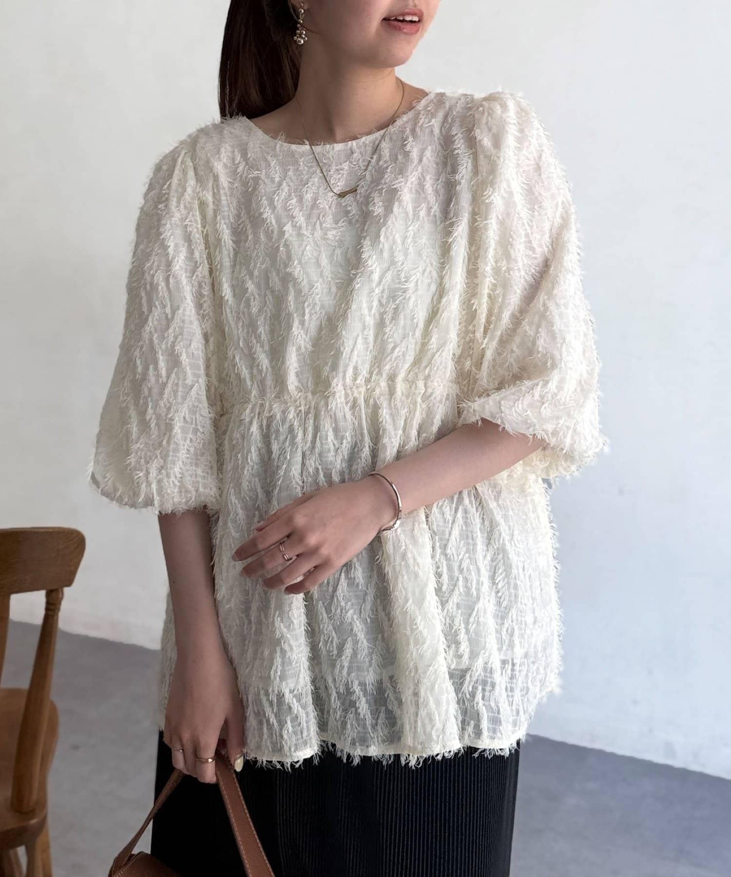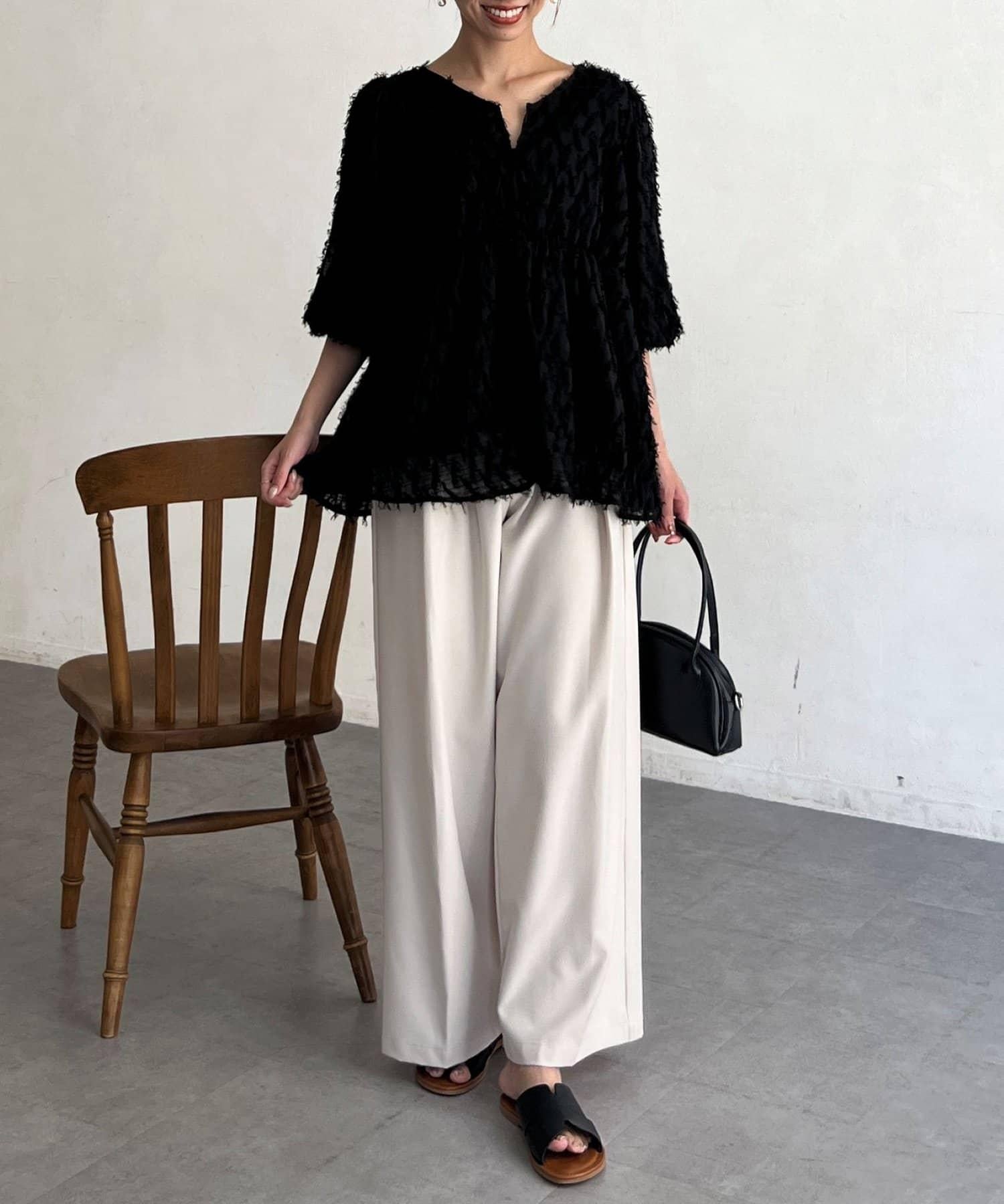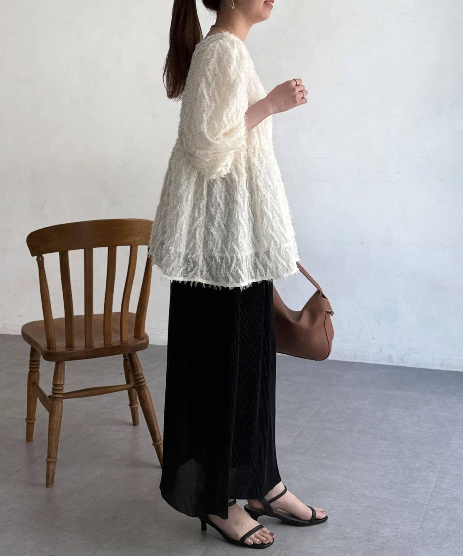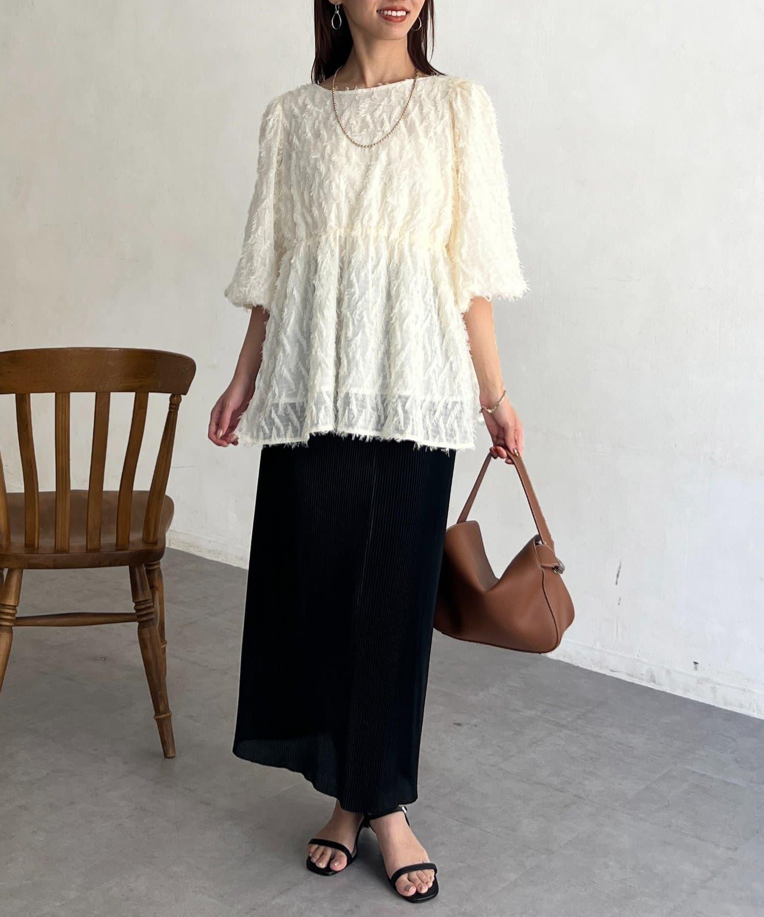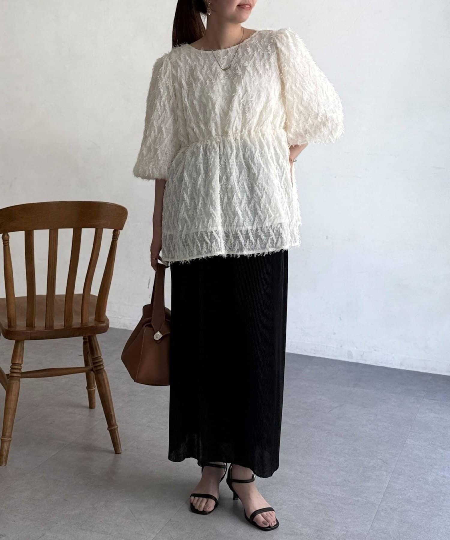 立體感適中的蓬鬆袖子和從胸口以下接縫處向下延伸的喇叭形線條,給人以女性化的印象!