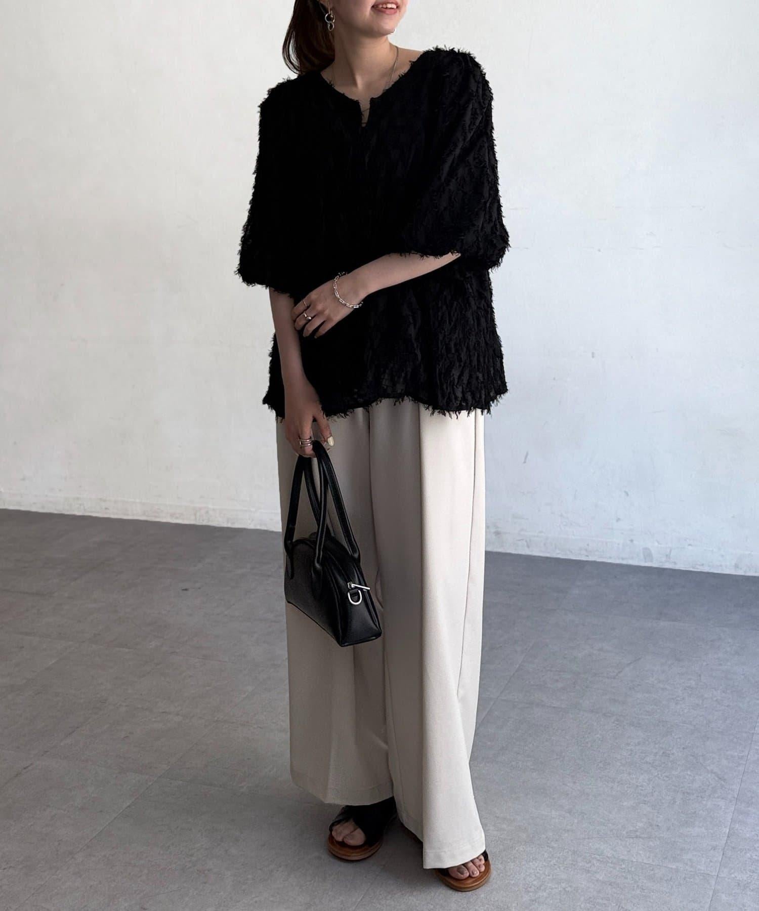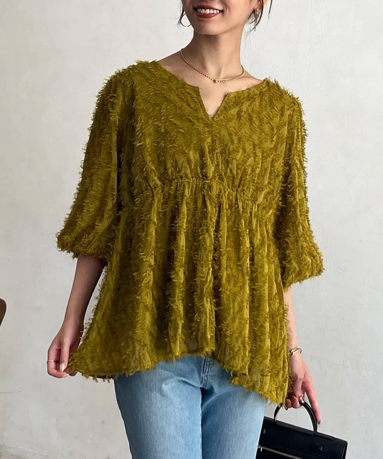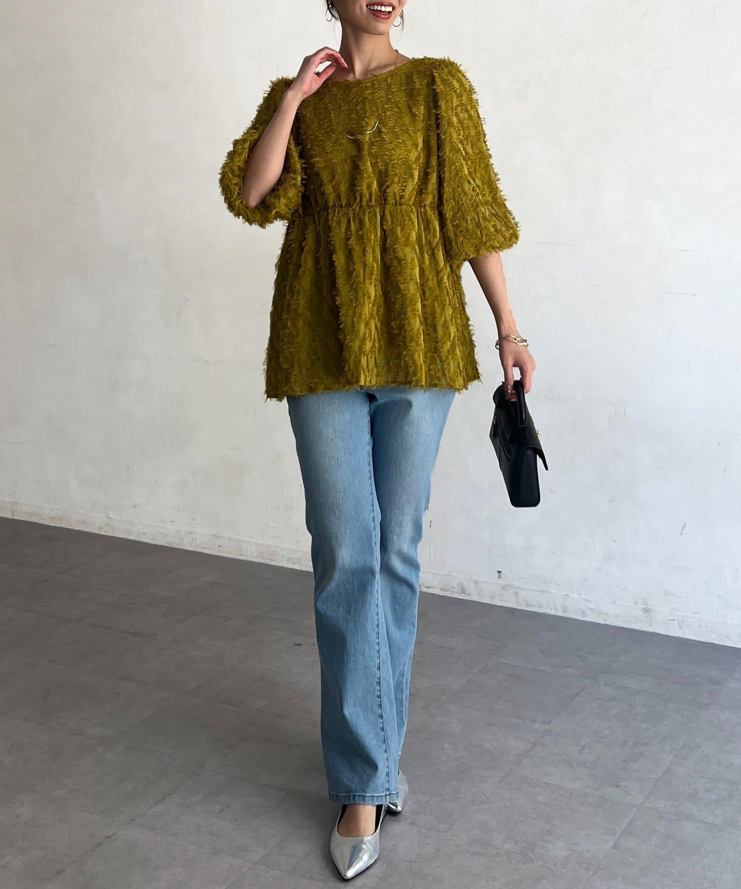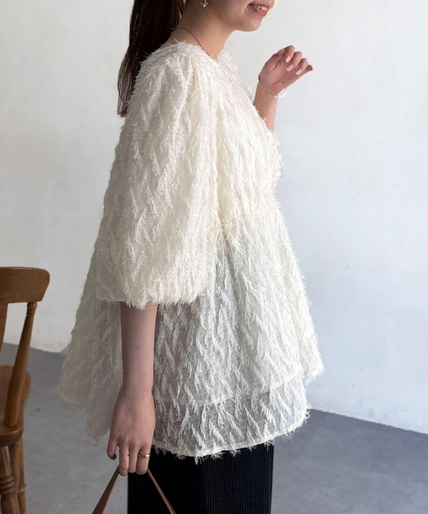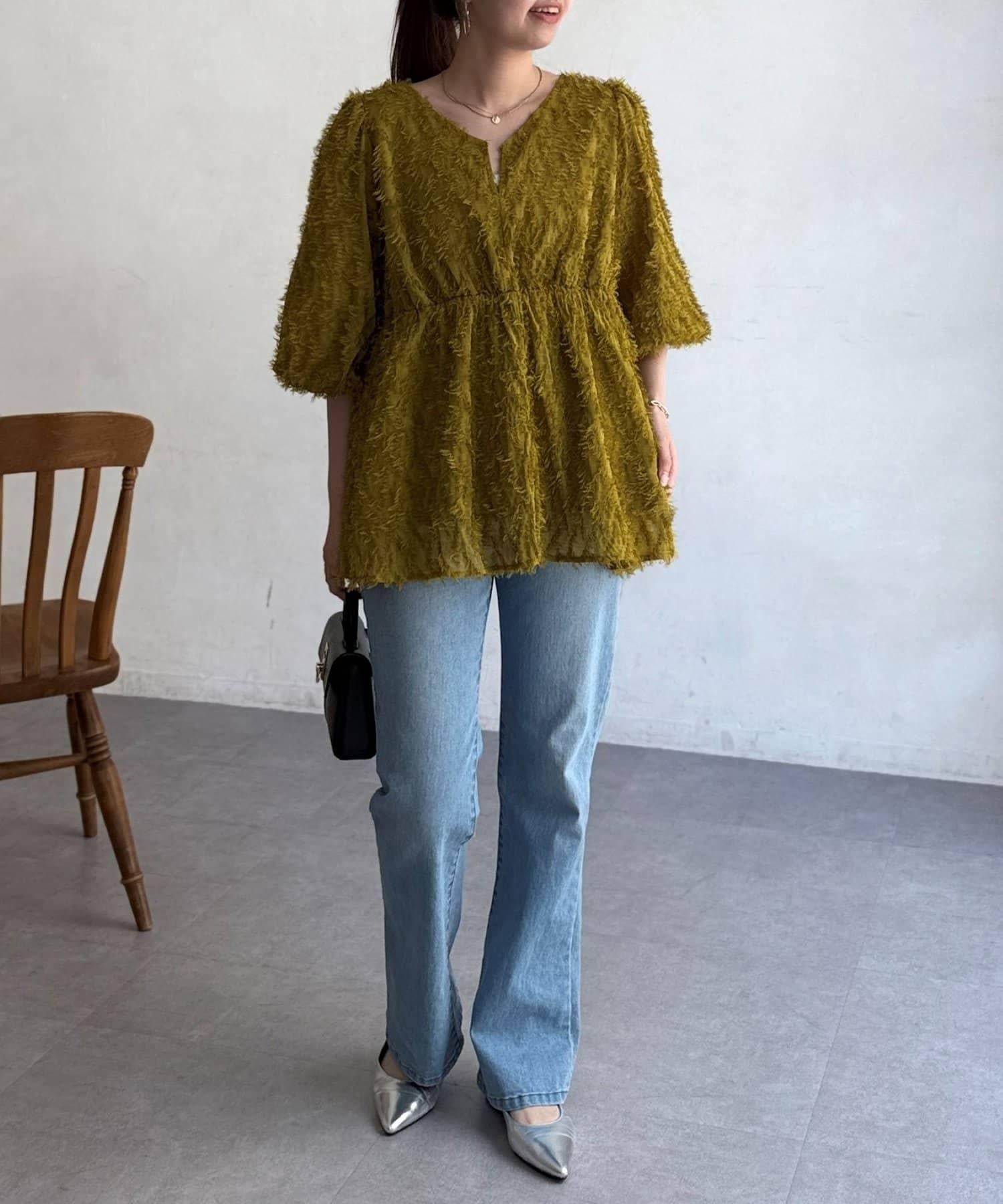 立體感適中的蓬鬆袖子和從胸口以下接縫處向下延伸的喇叭形線條,給人以女性化的印象!