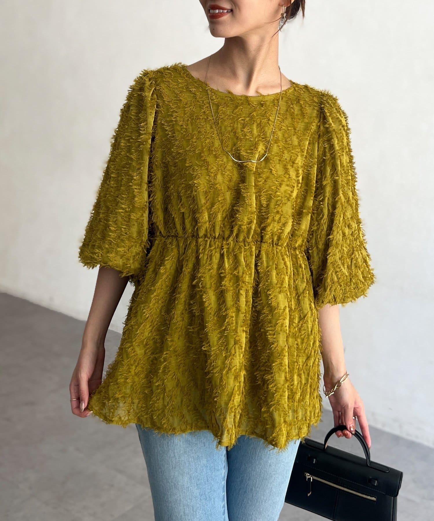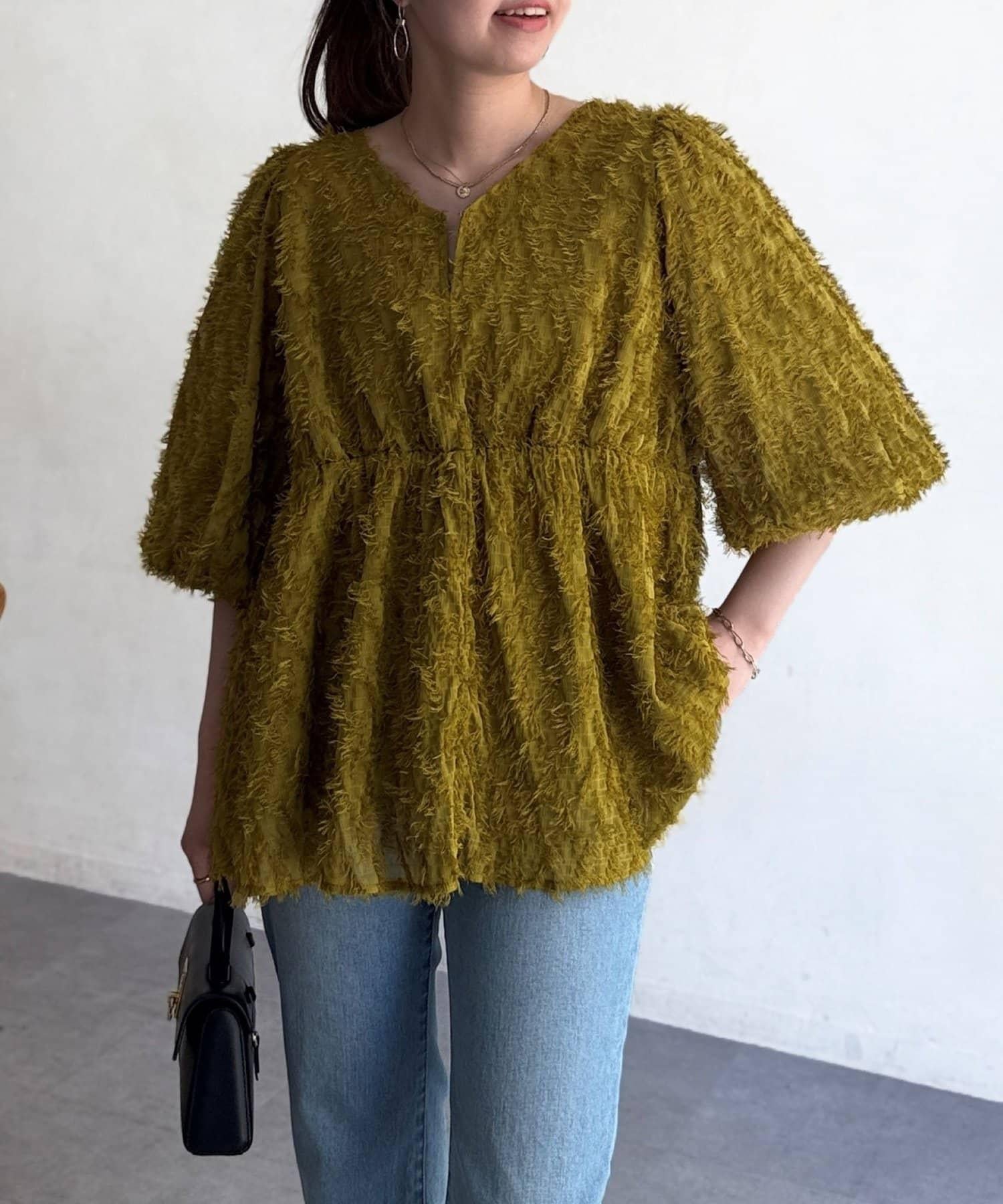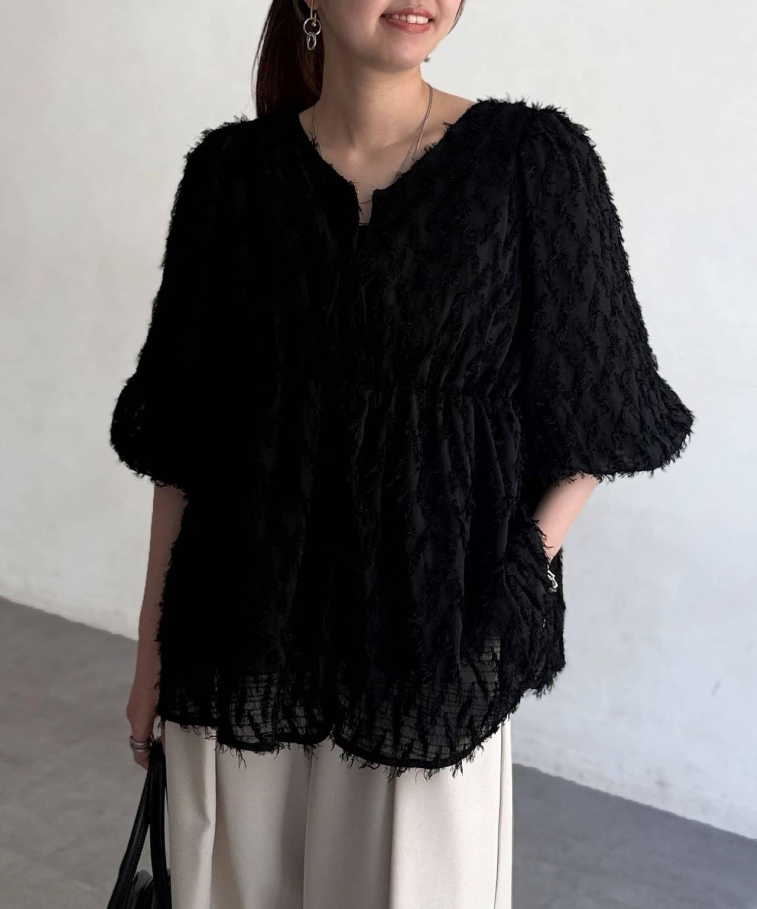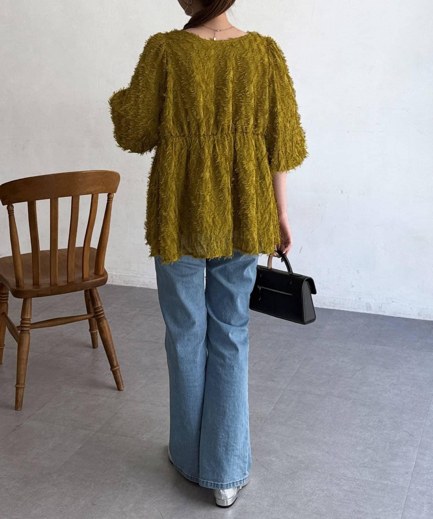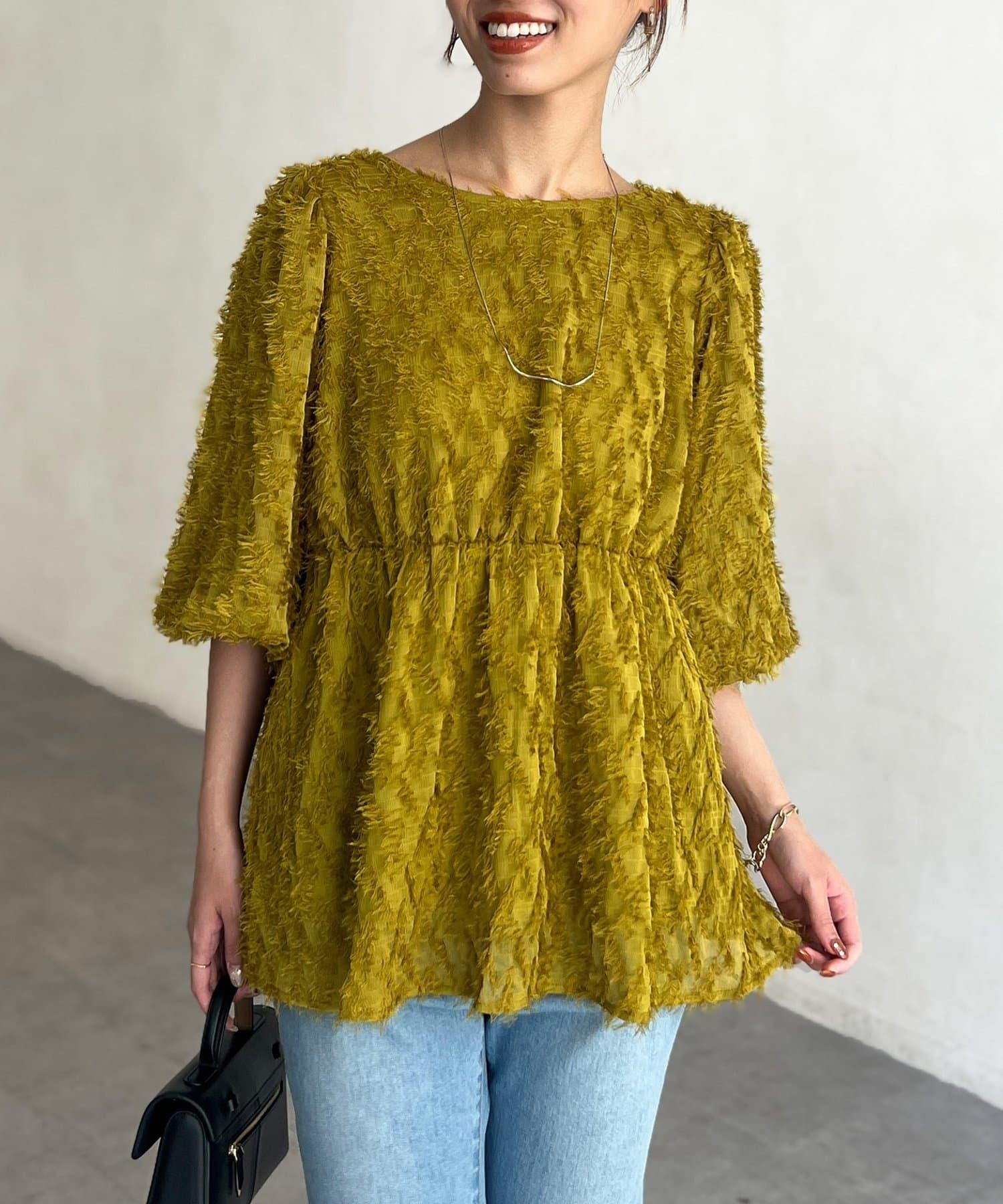 立體感適中的蓬鬆袖子和從胸口以下接縫處向下延伸的喇叭形線條,給人以女性化的印象!