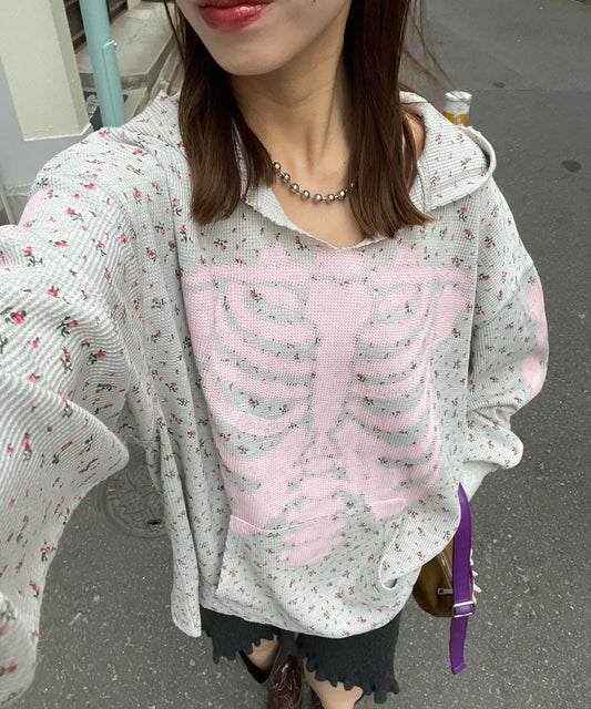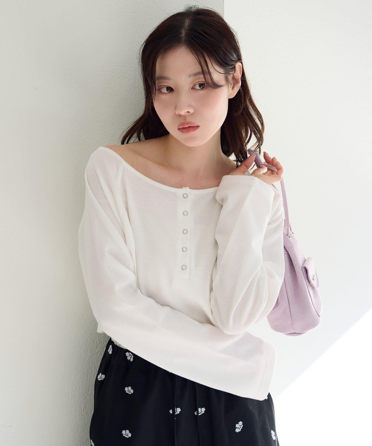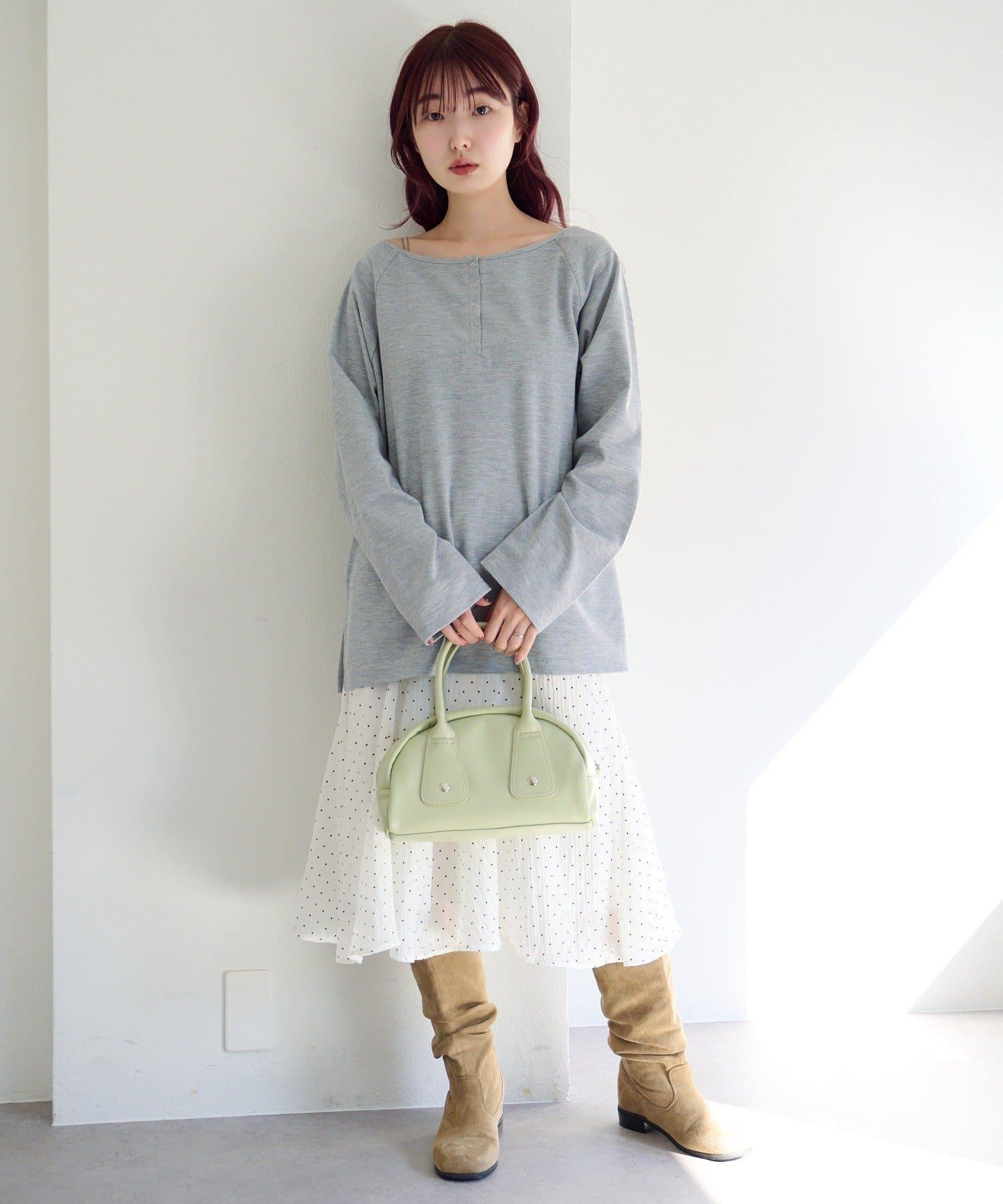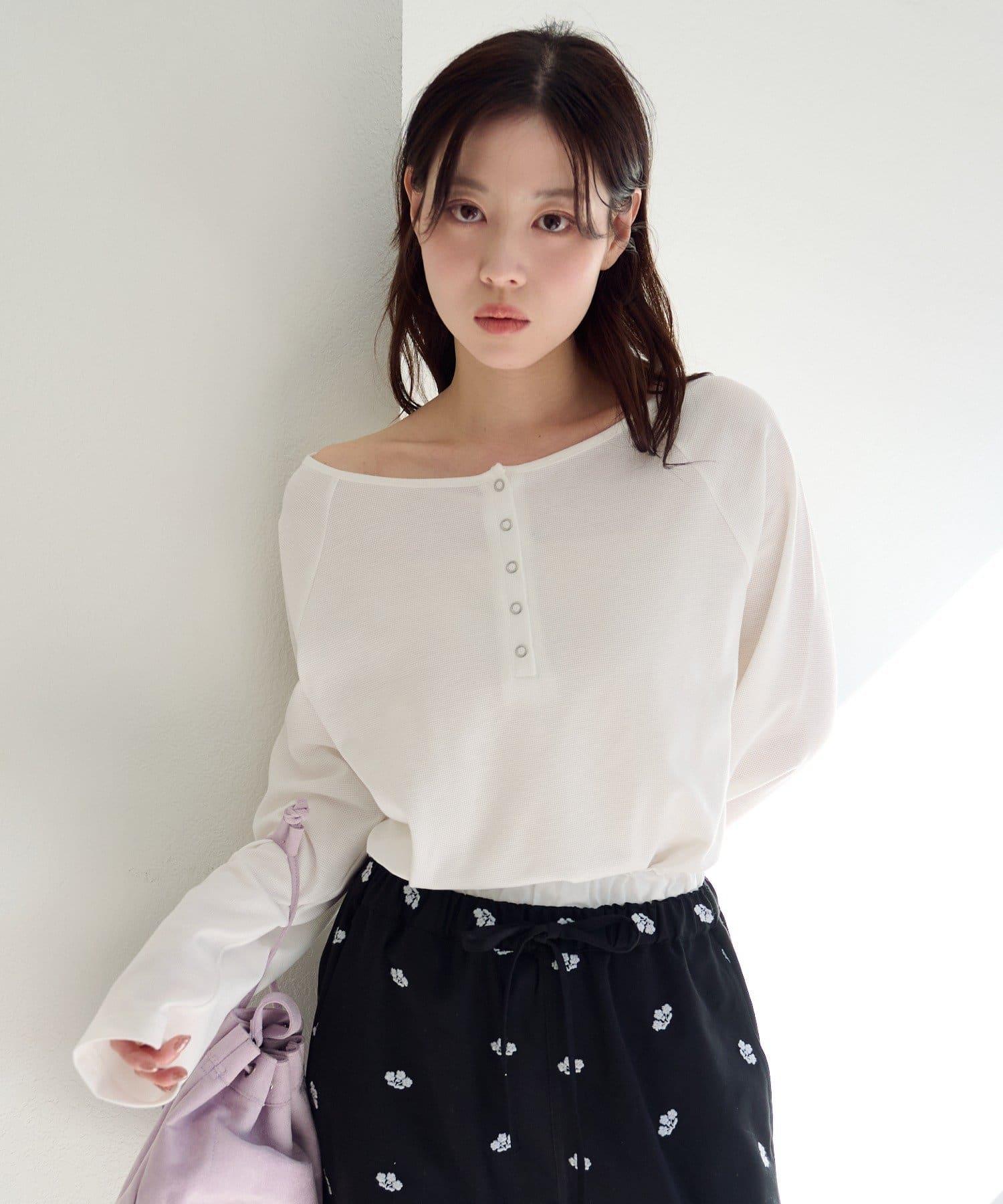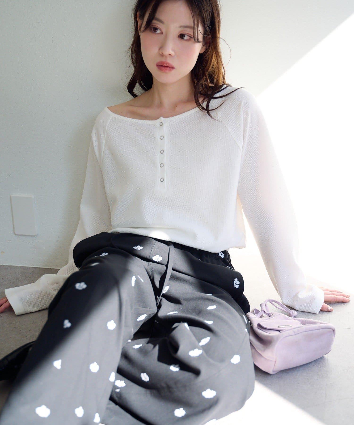 搭配花紋短裙,露肩寬鬆的造型給人女性化的印象。