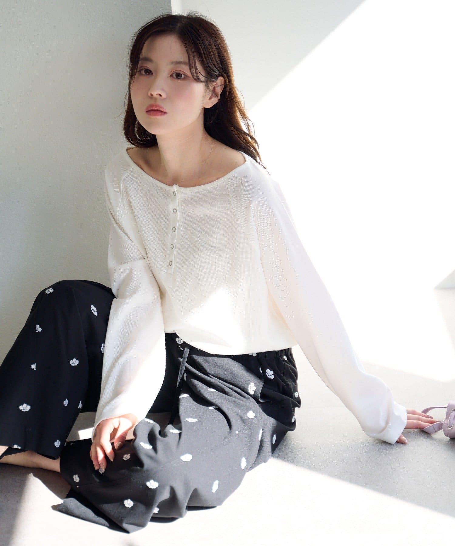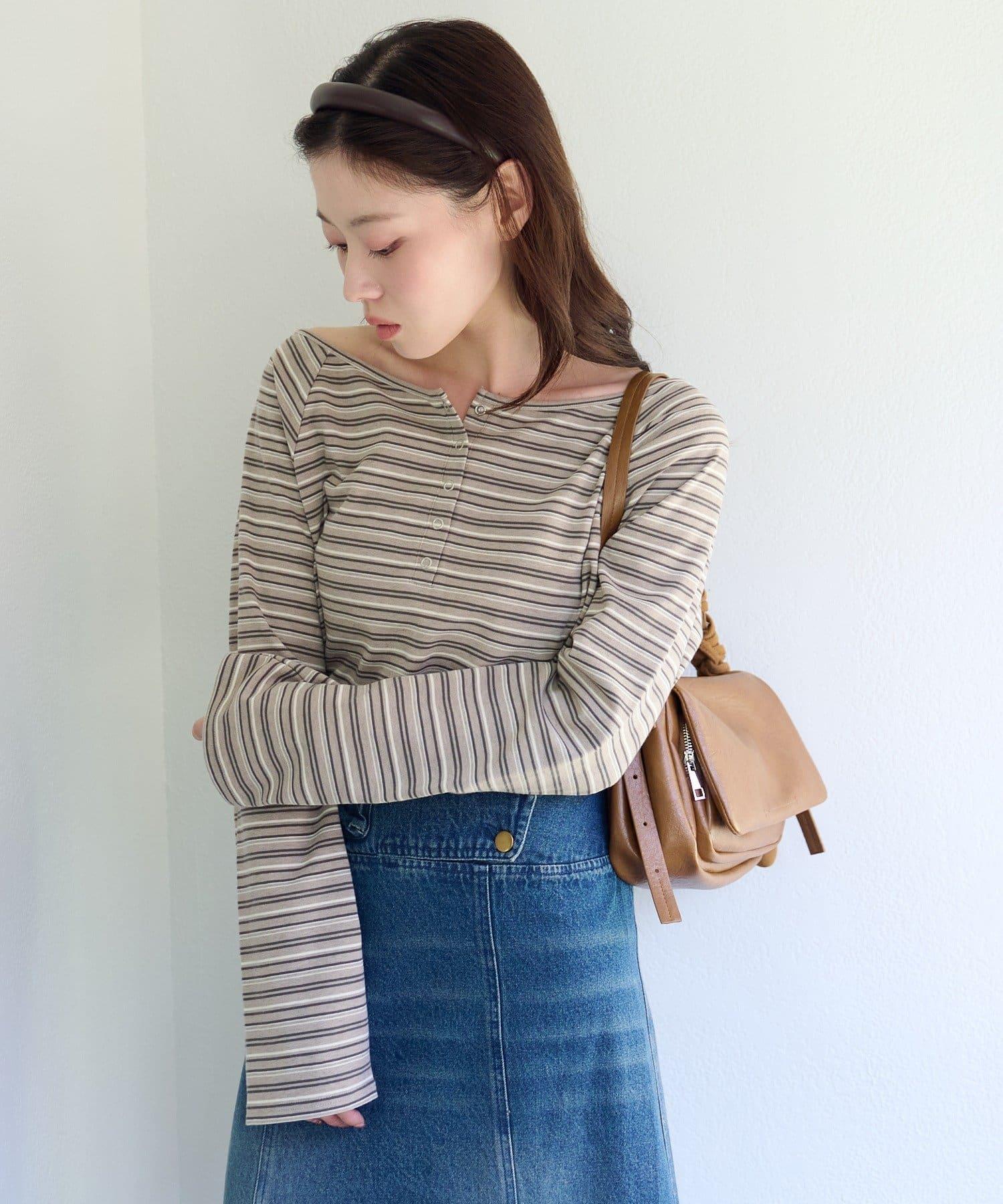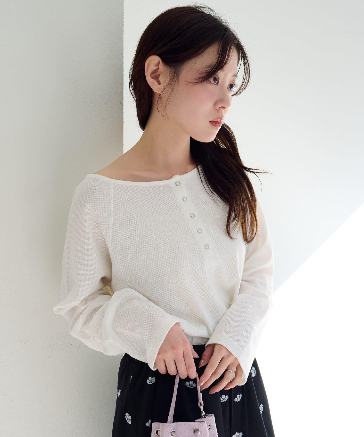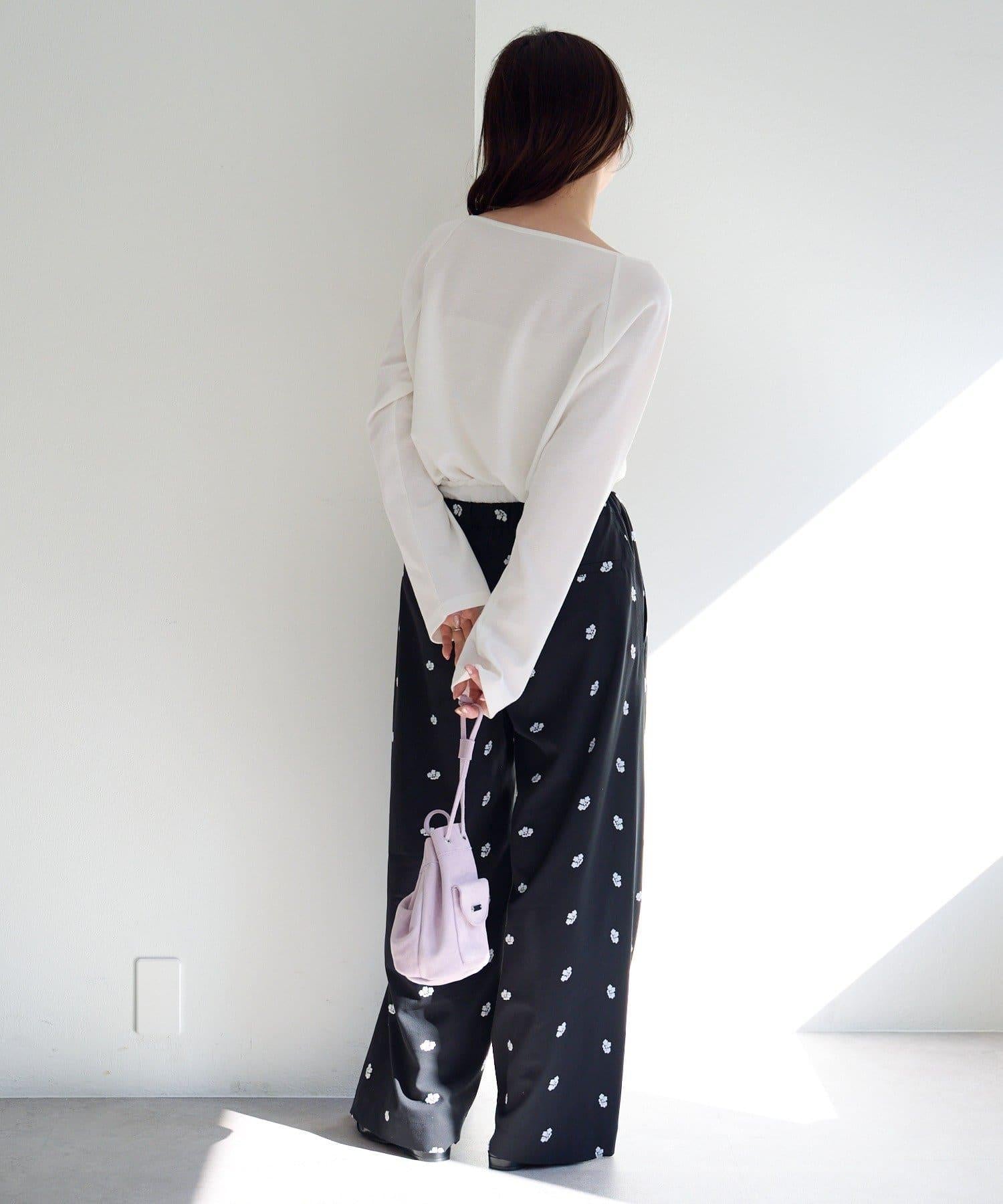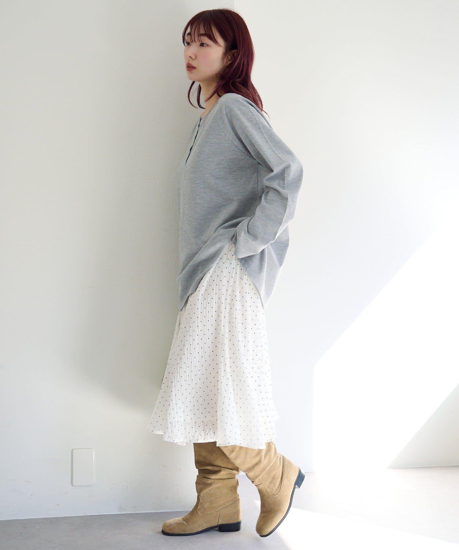 搭配花紋短裙,露肩寬鬆的造型給人女性化的印象。