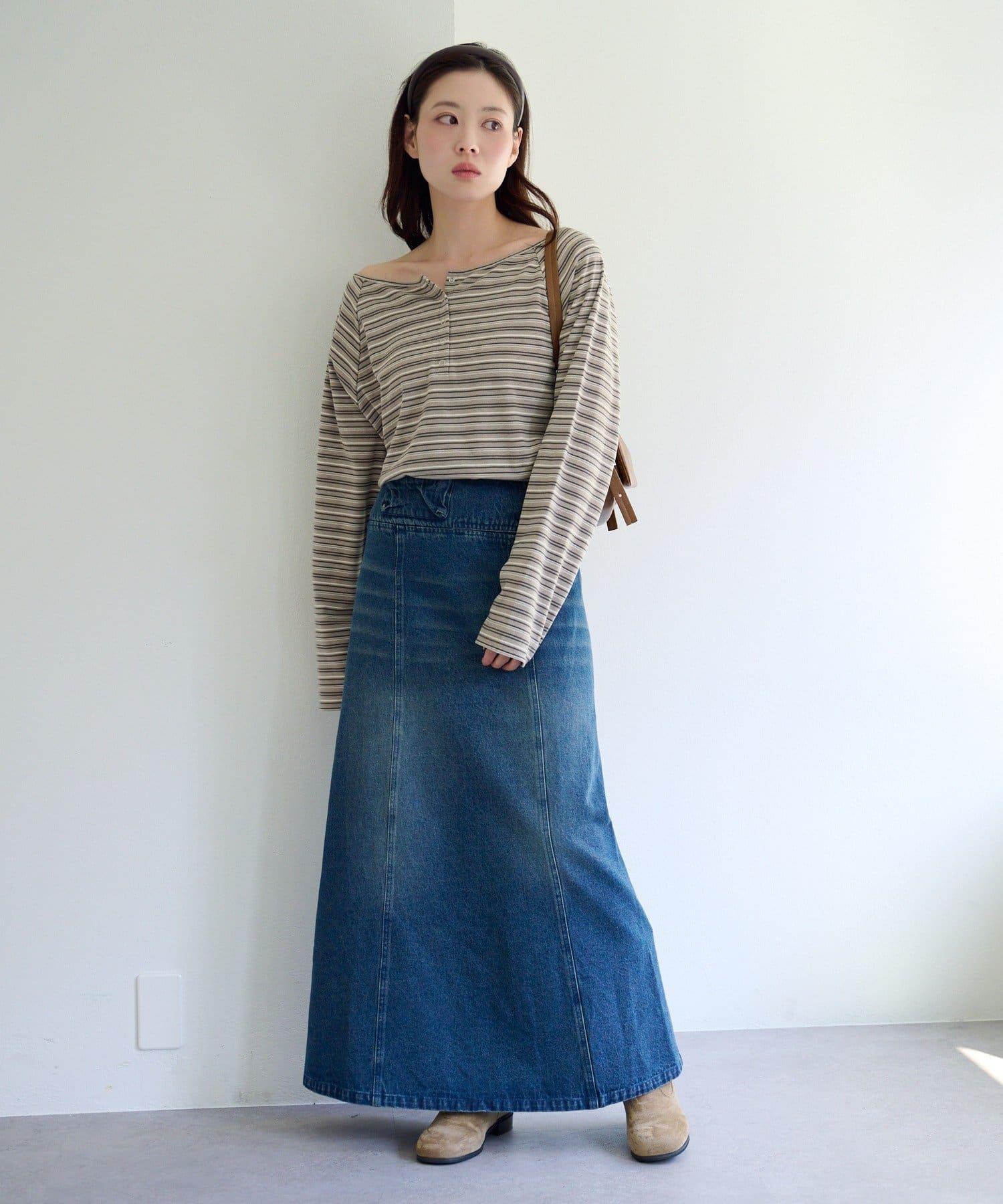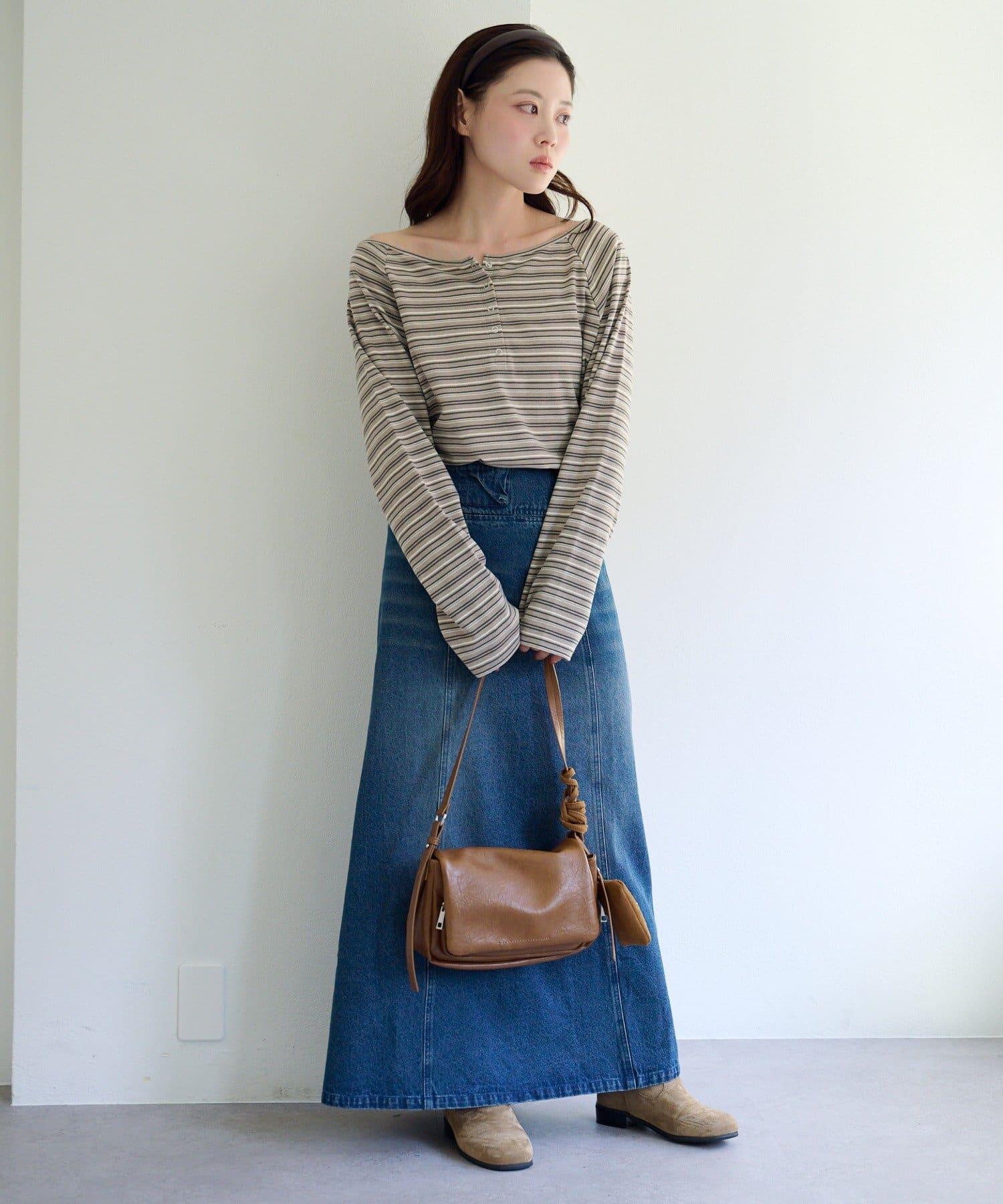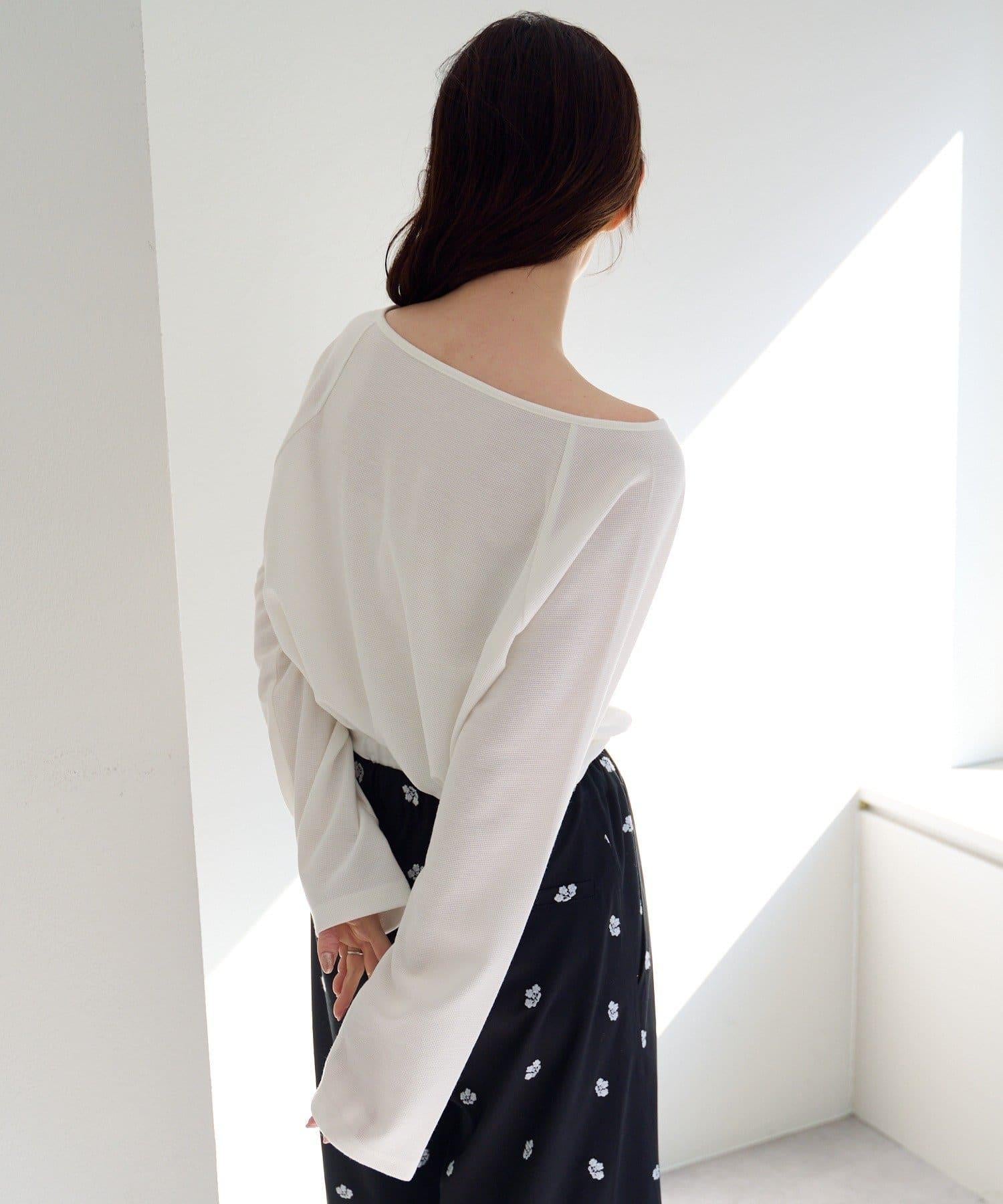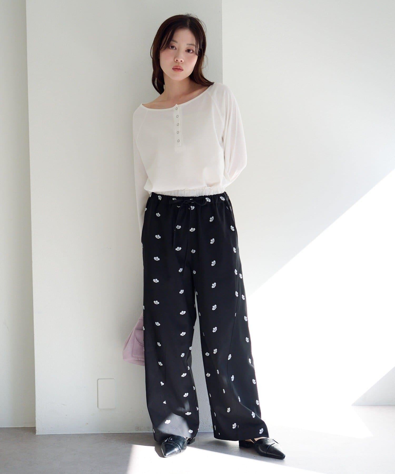 搭配花紋短裙,露肩寬鬆的造型給人女性化的印象。