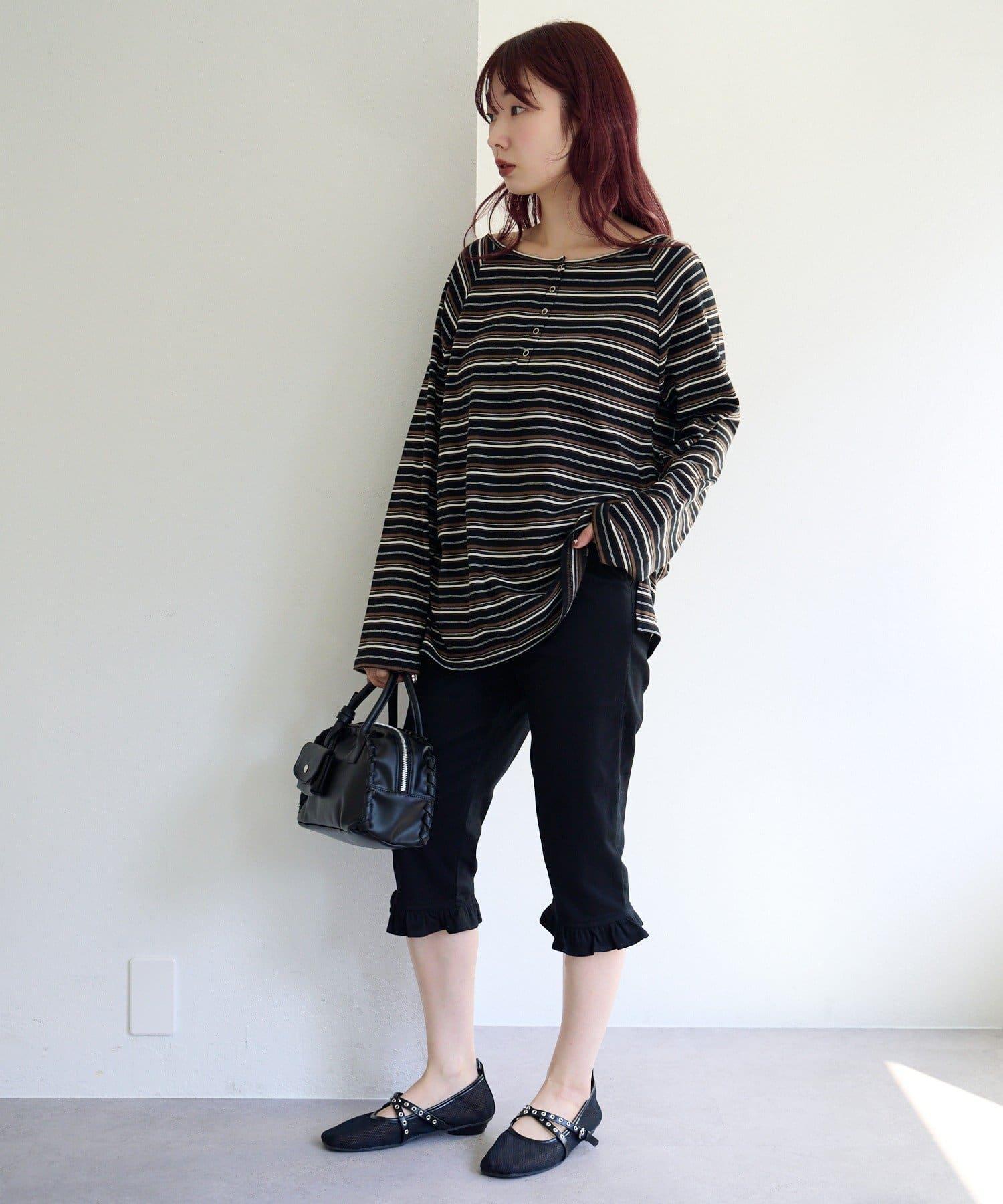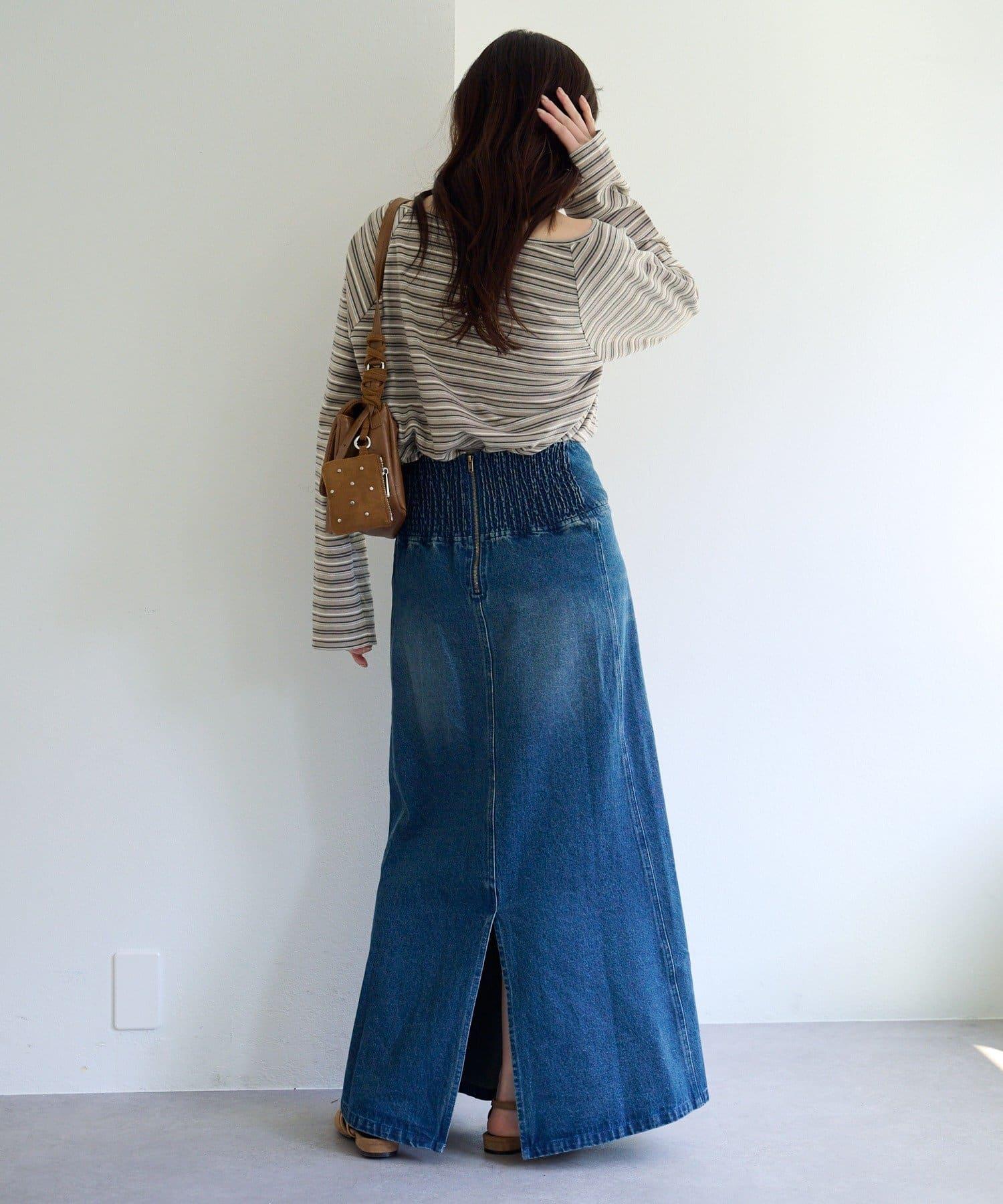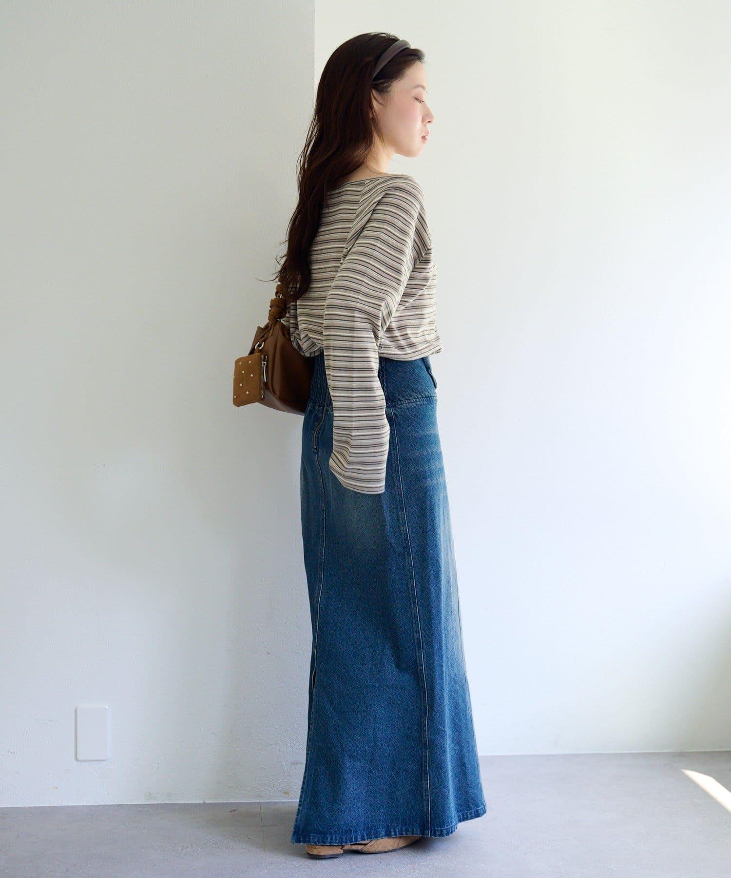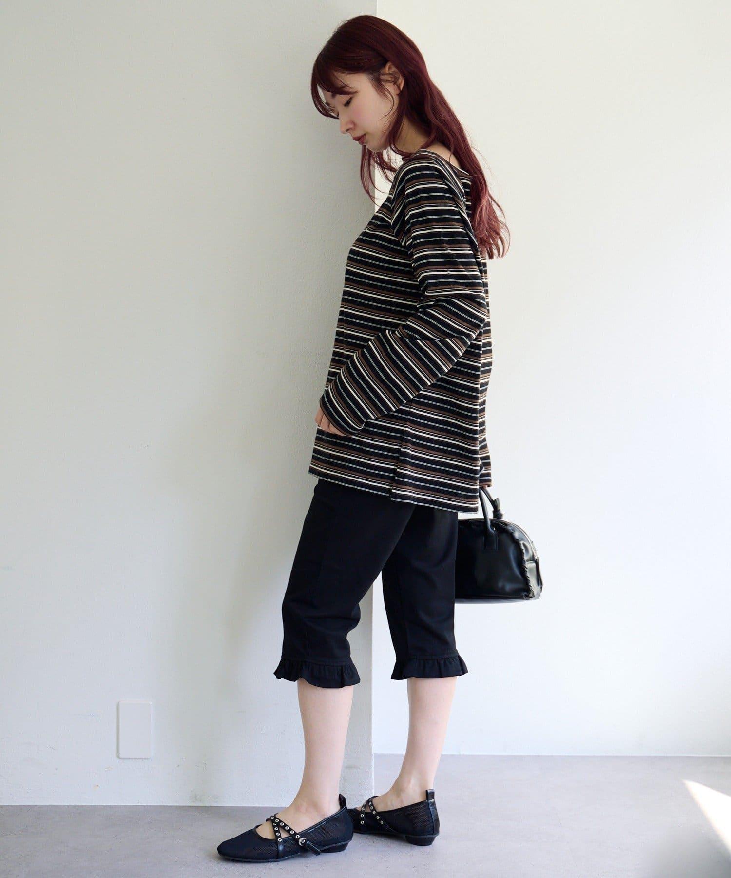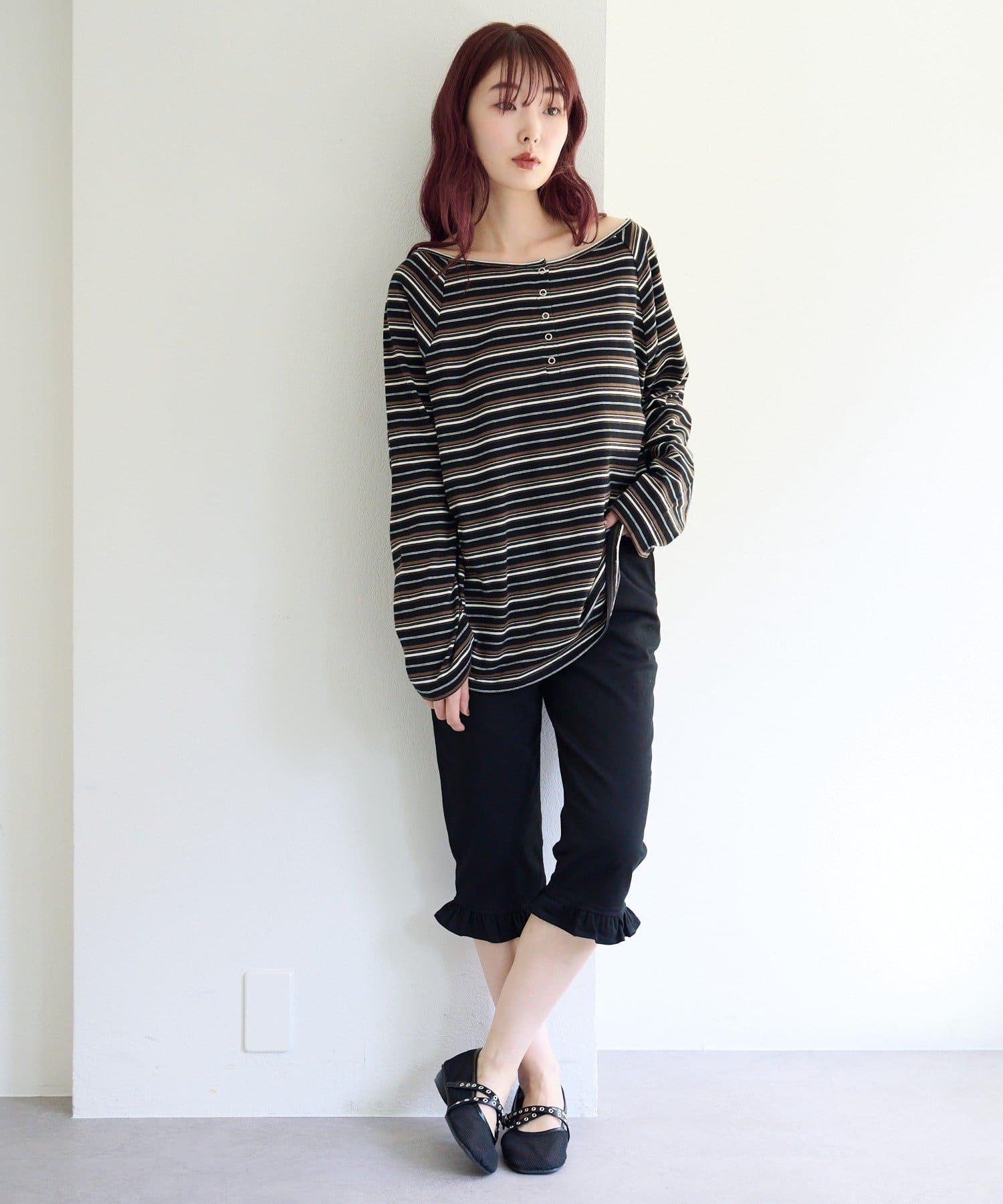 搭配花紋短裙,露肩寬鬆的造型給人女性化的印象。