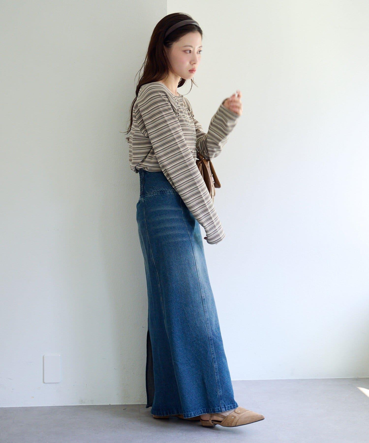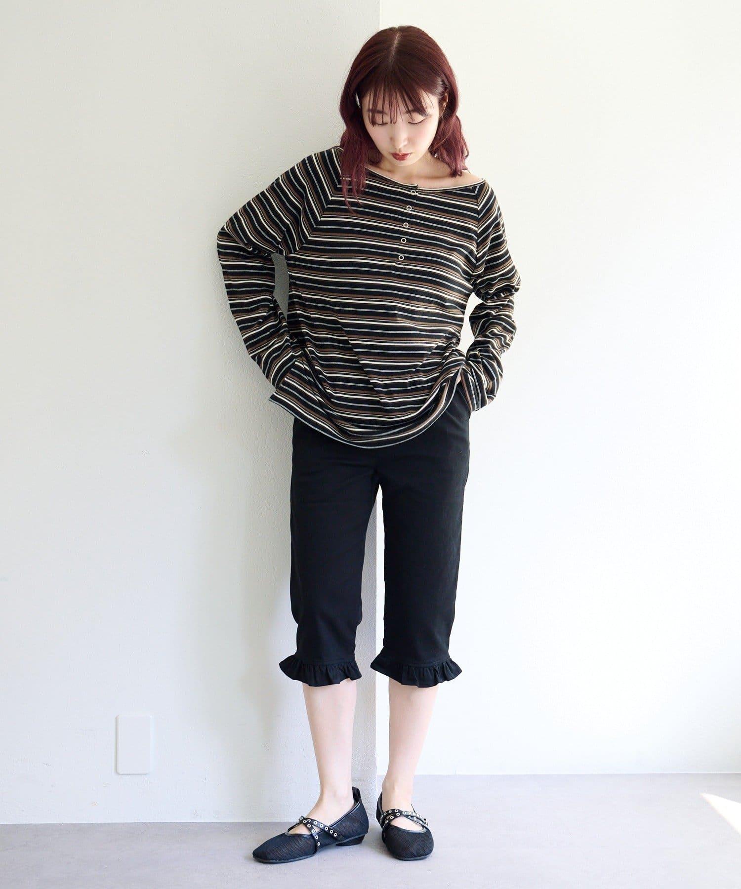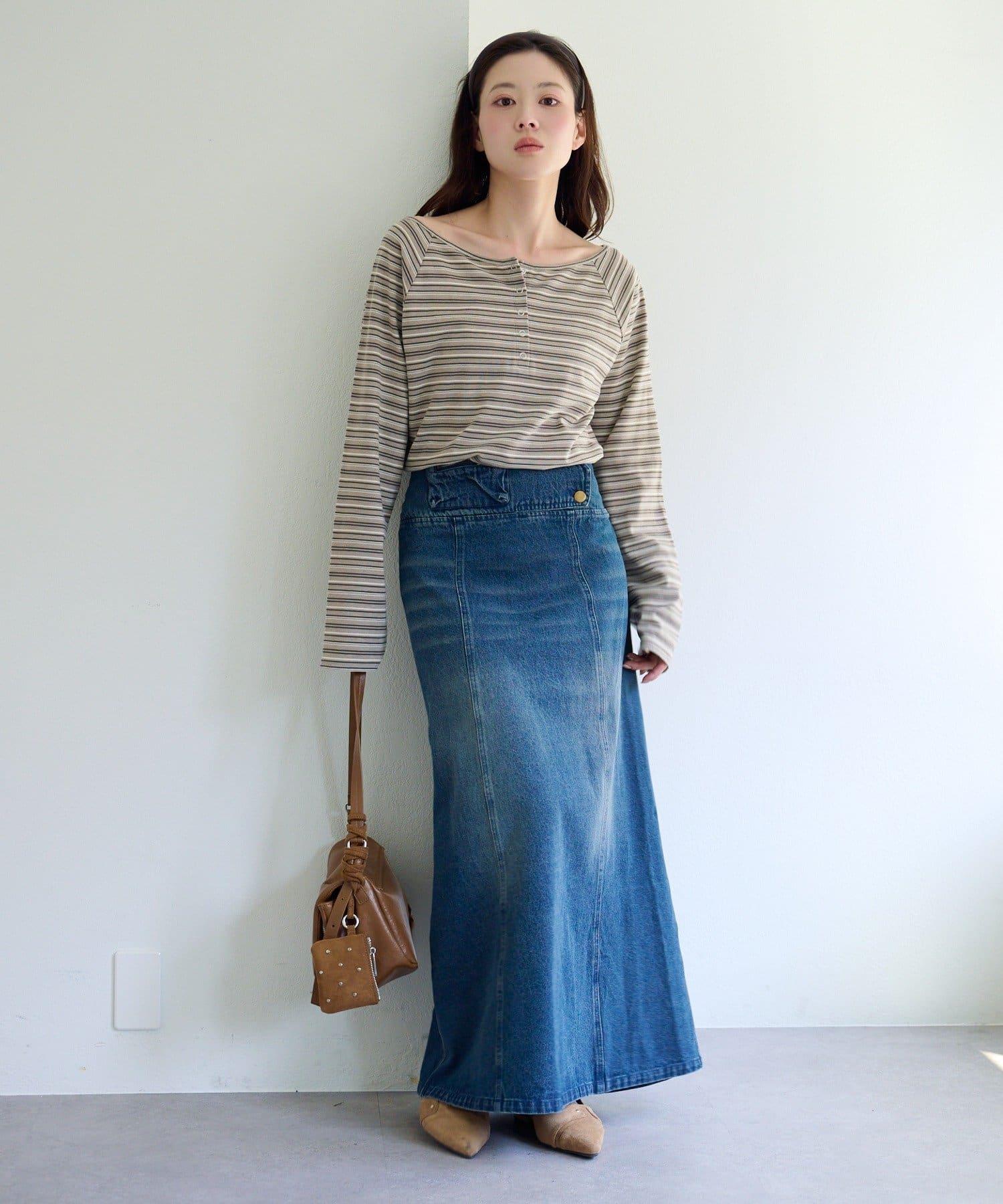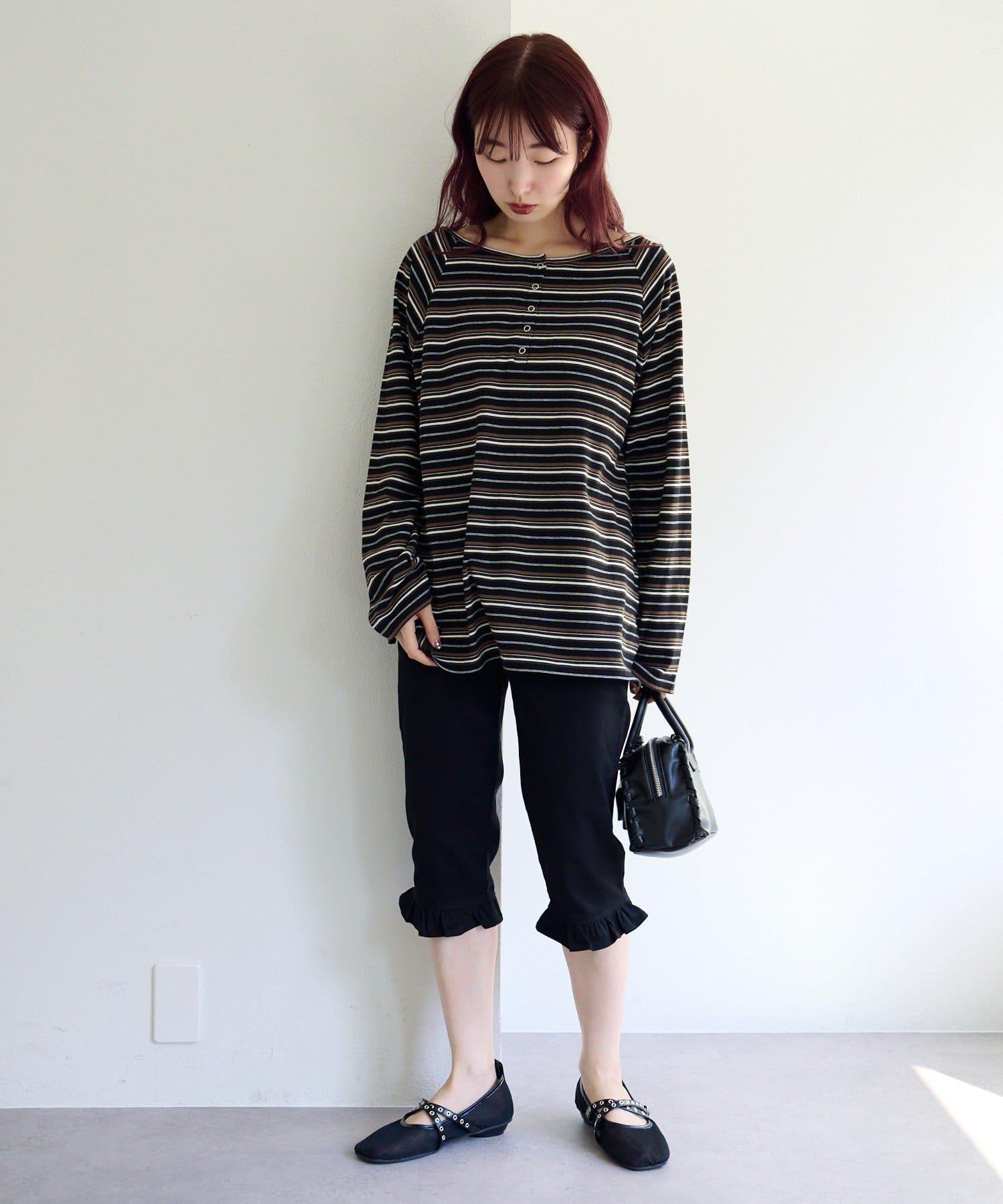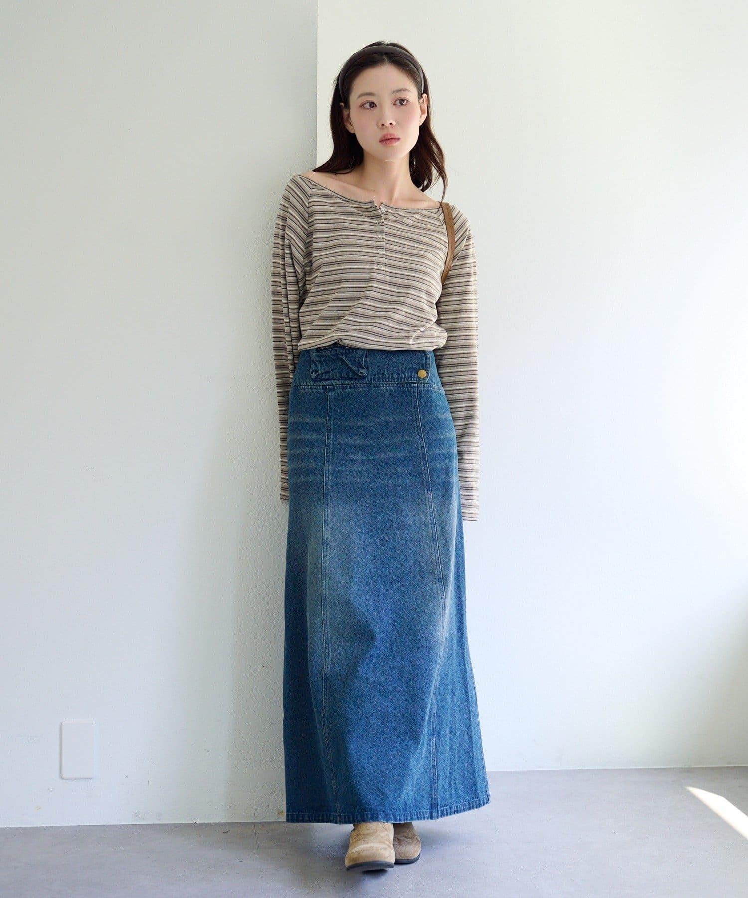 搭配花紋短裙,露肩寬鬆的造型給人女性化的印象。