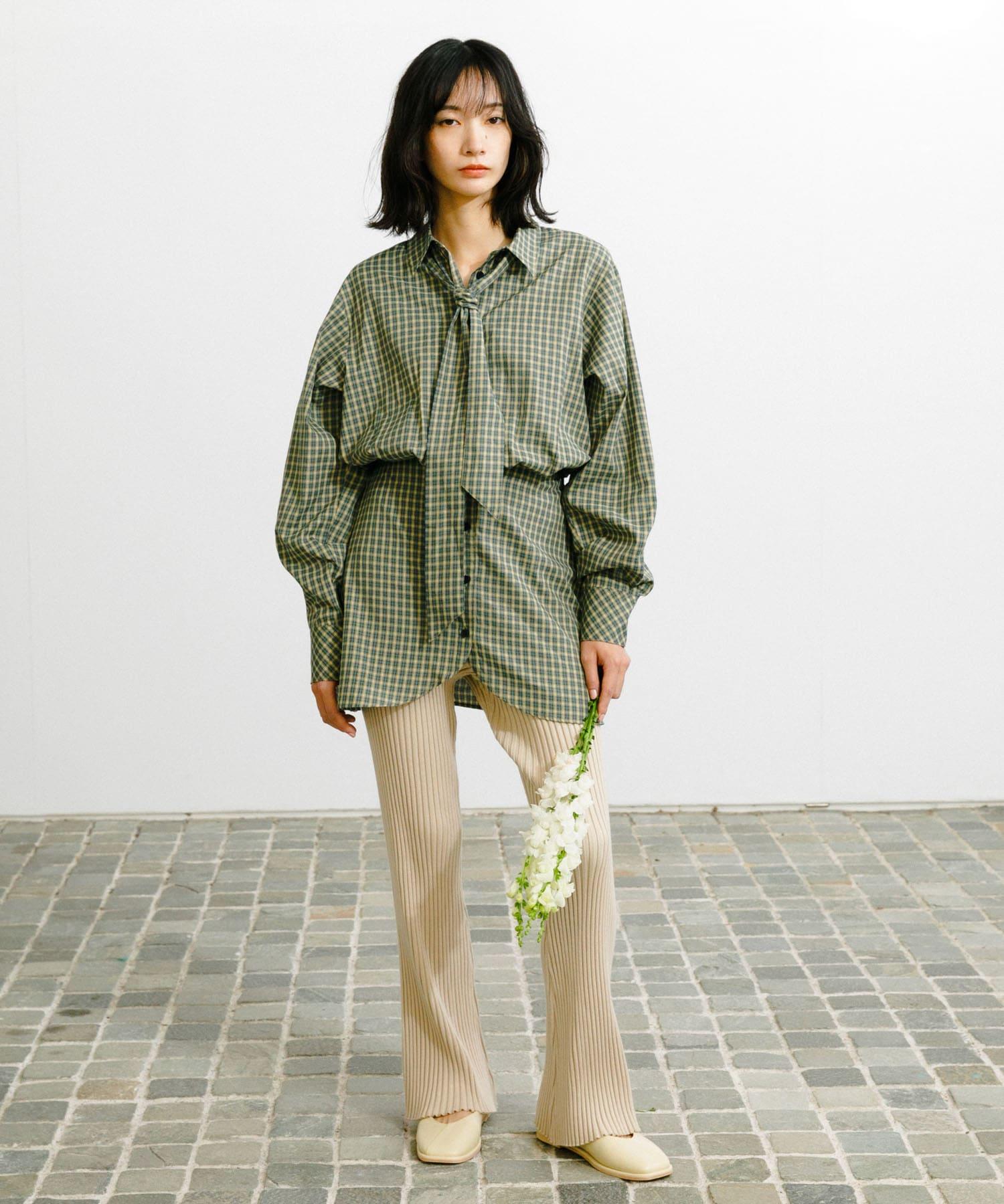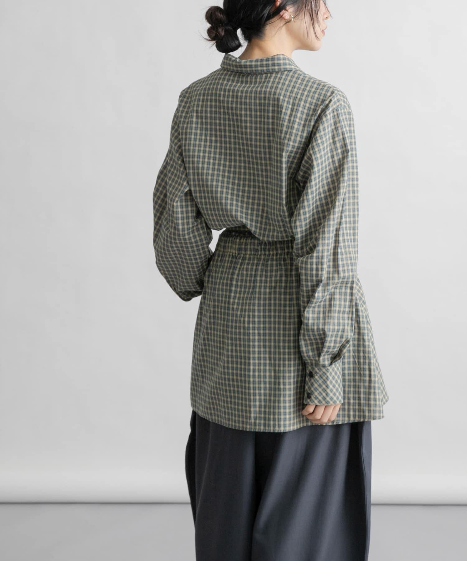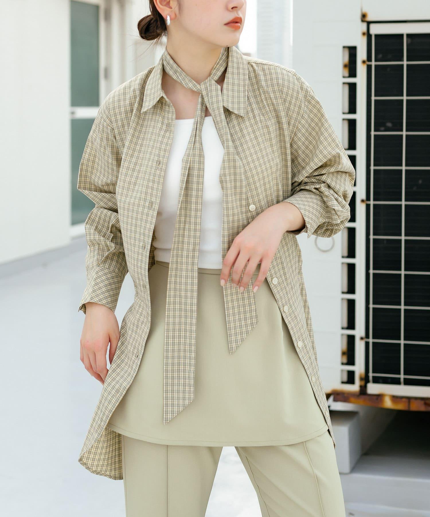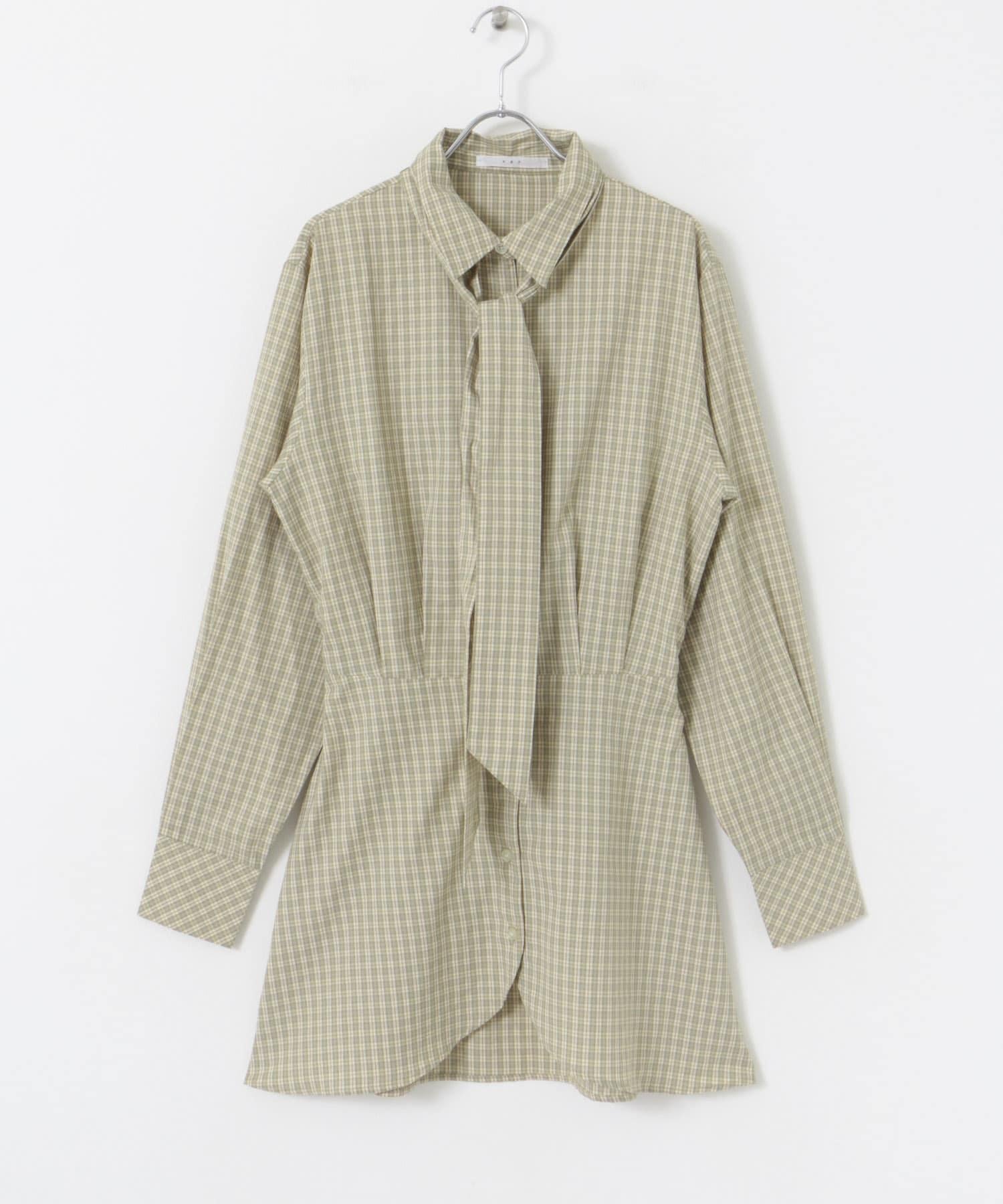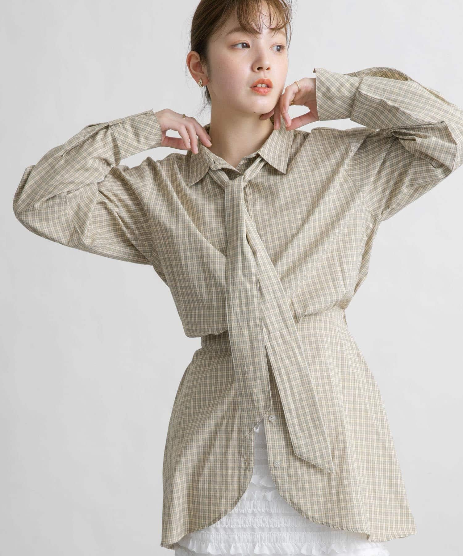 一件可更換的上衣,其輪廓看起來就像襯衫和裙子的疊穿。細微的彩色格紋圖案也很吸引人。襯衫後背有鬆緊帶,建議瀏覽後穿著。附帶的蝴蝶結領帶可拆卸,可根據心情繞在脖子上或腰間。它可以輕鬆打造出時尚的韓式搭配風格。