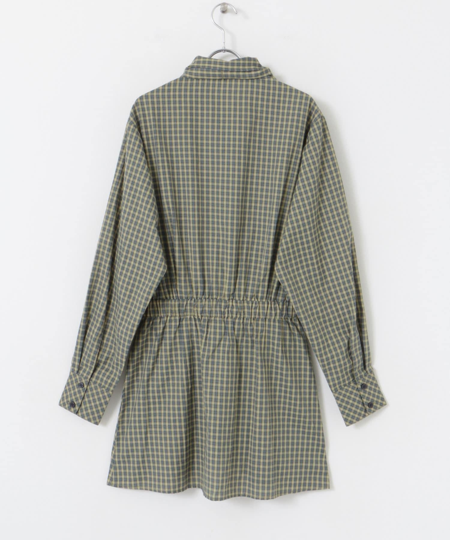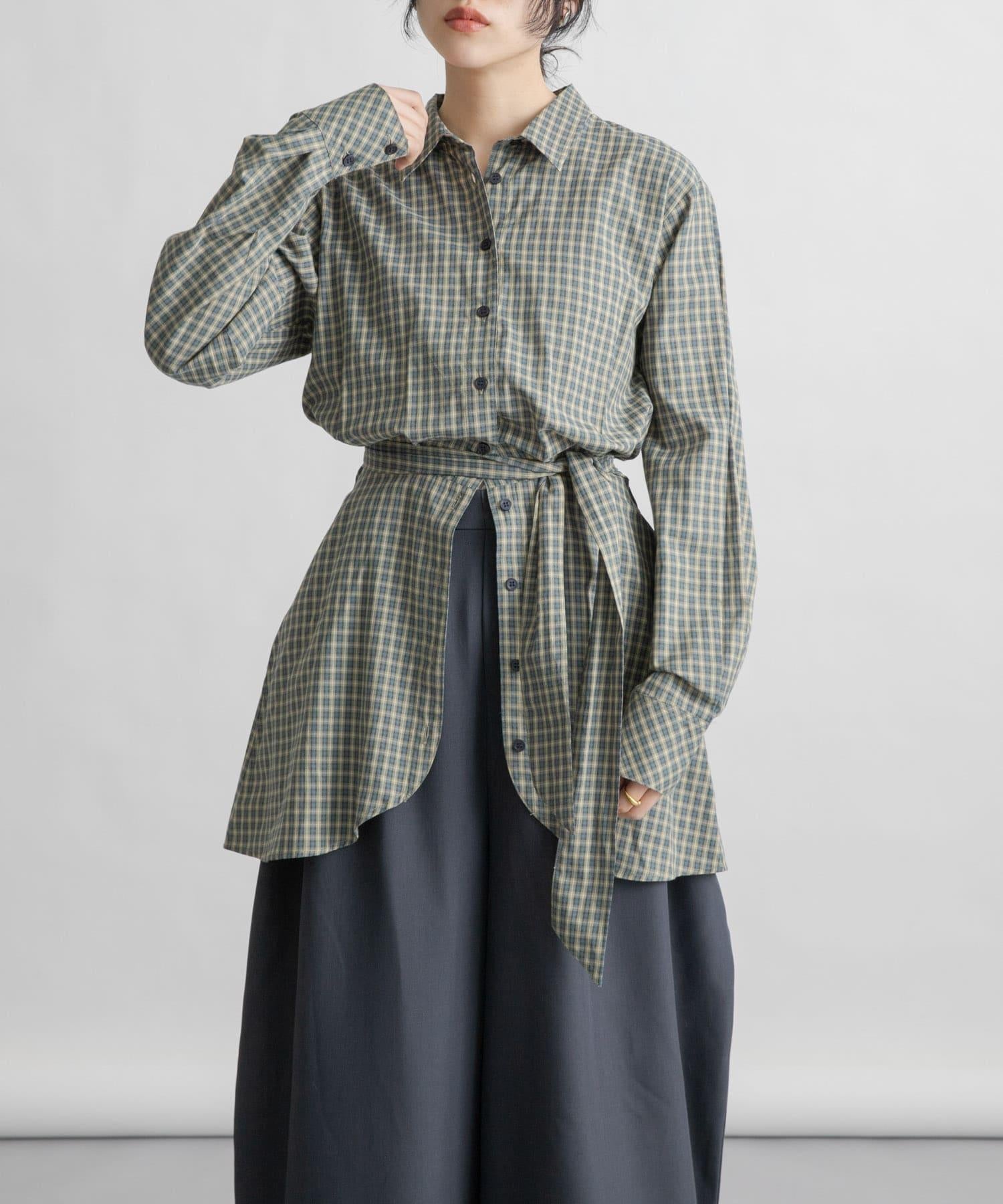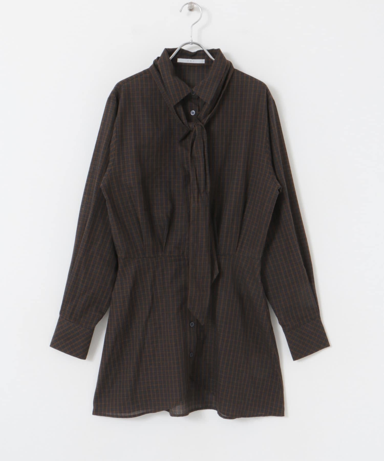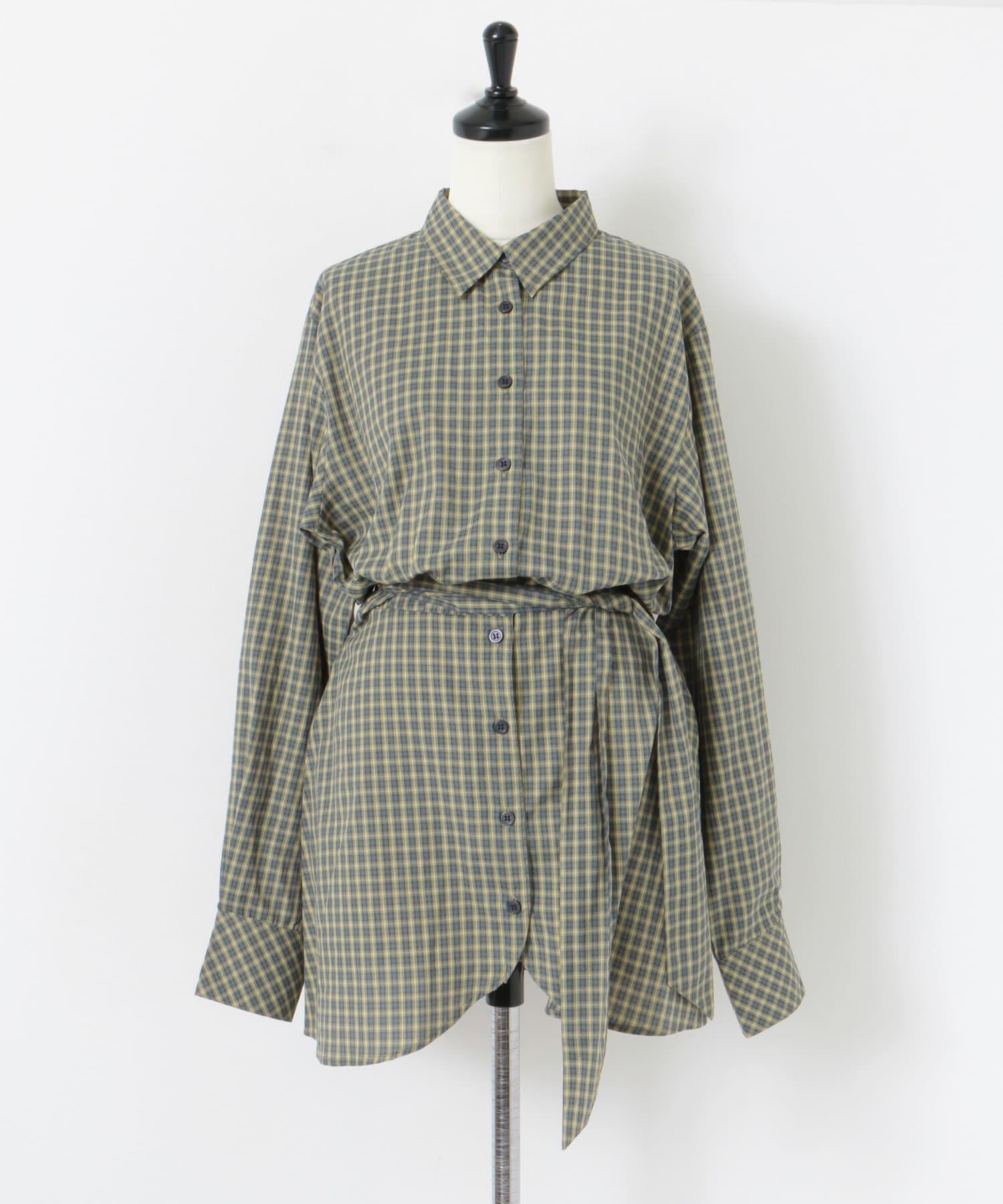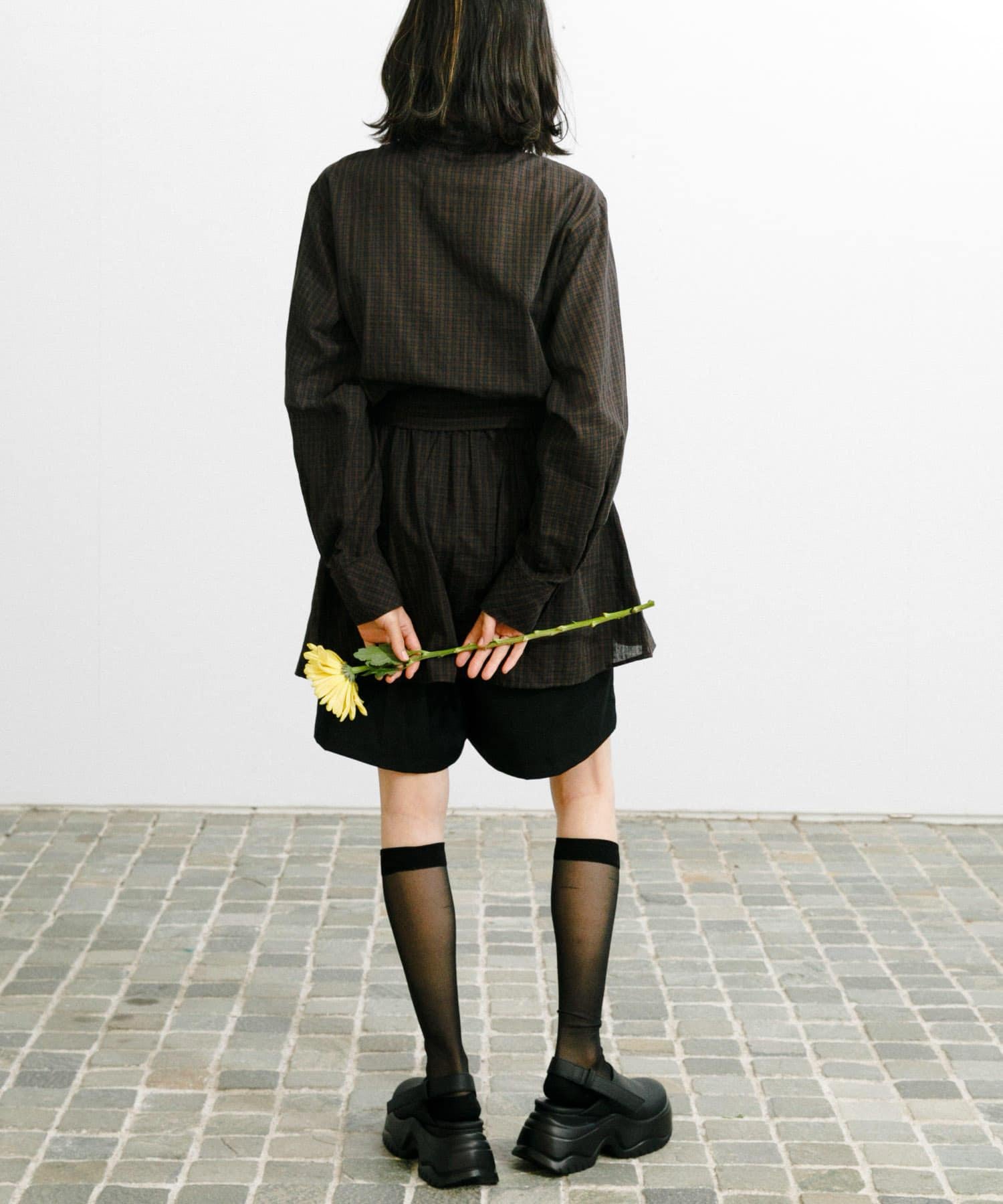 一件可更換的上衣,其輪廓看起來就像襯衫和裙子的疊穿。細微的彩色格紋圖案也很吸引人。襯衫後背有鬆緊帶,建議瀏覽後穿著。附帶的蝴蝶結領帶可拆卸,可根據心情繞在脖子上或腰間。它可以輕鬆打造出時尚的韓式搭配風格。