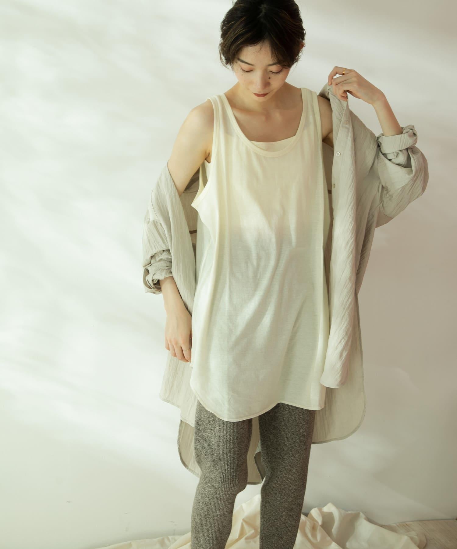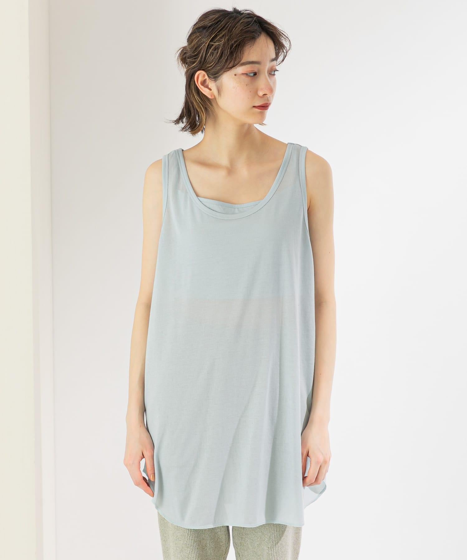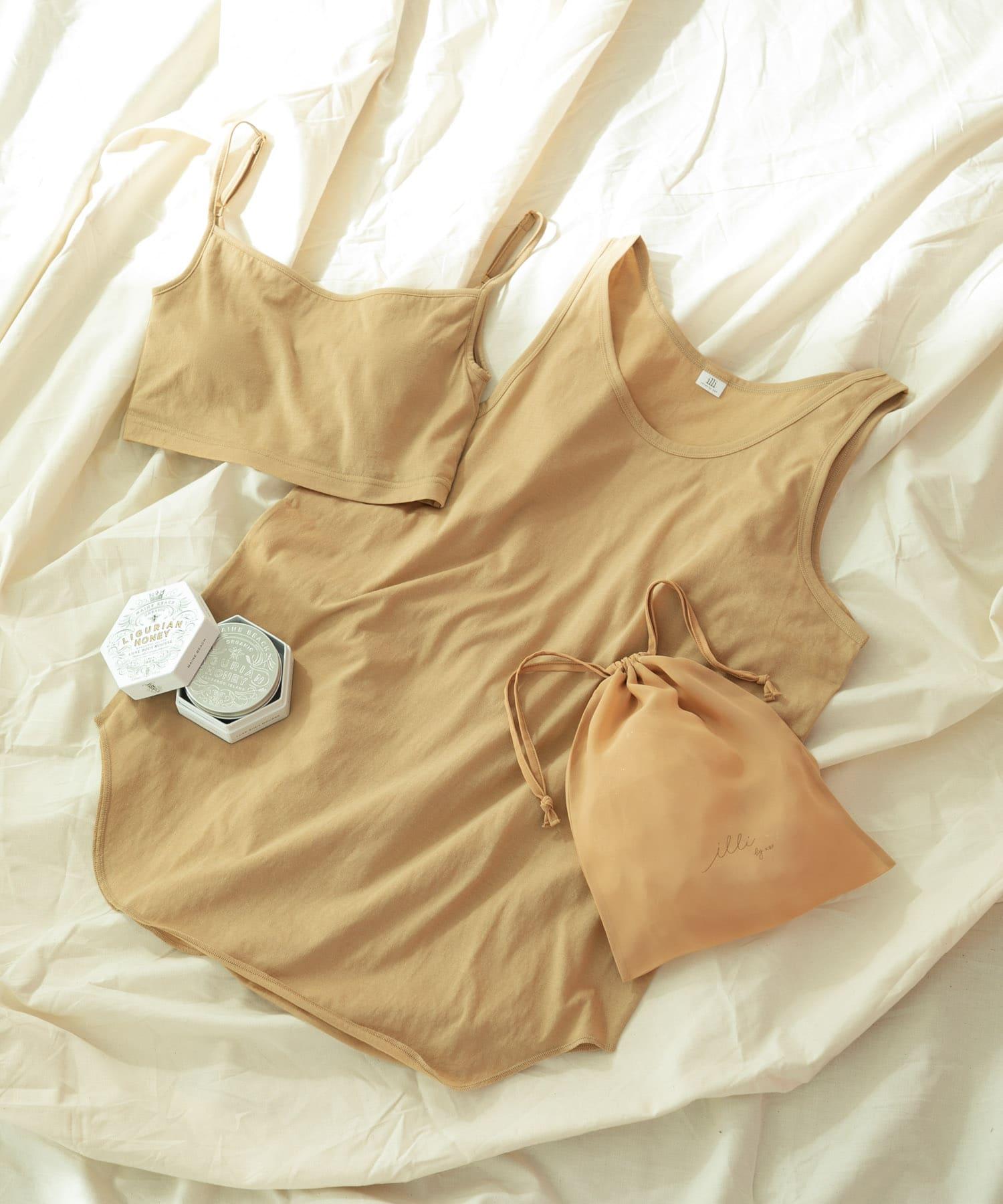 由帶罩杯的胸罩吊帶衫和寬鬆背心組成的套裝。既可作為迷人的內衣,也可只作為背心使用,非常方便。附帶薄紗材質的袋子,也非常適合旅行和過夜時使用。