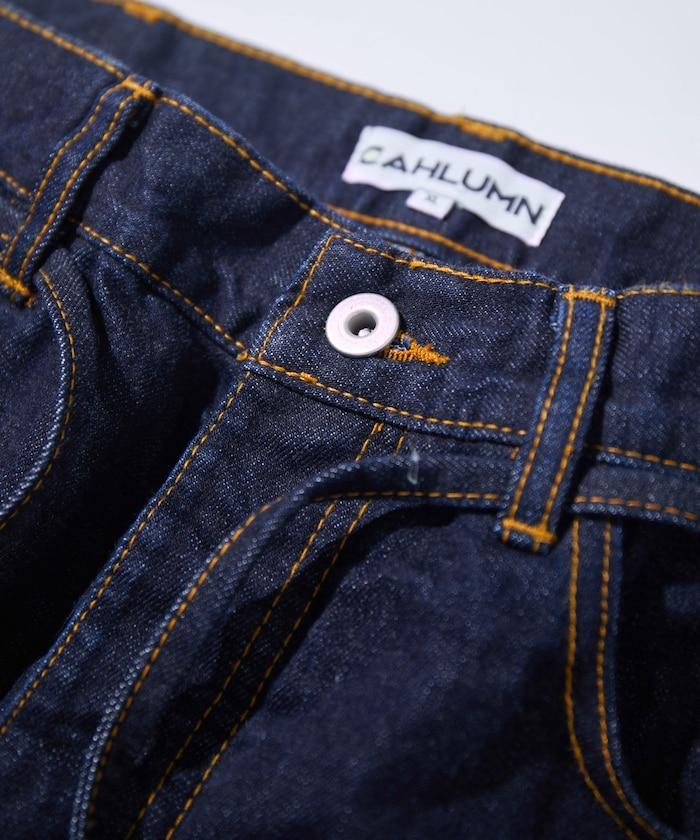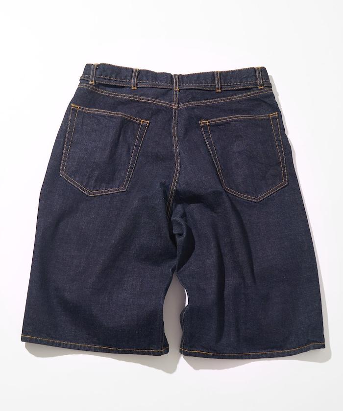 為了讓短褲更薄、更輕、更易於夏季穿著,這款寬鬆短褲的牛仔面料從之前的 14 盎司降至 13.2 盎司。褲邊是藍邊而不是紅邊,對於那些經常穿海軍藍的人來說,這是一條完美的搭配。經紗由 7 支開口紡直紗和 8 支環錠紡短紗線併攏而成,緯紗由 8 支短紗線製成。它是用舊式有梭織機織成的。織物表面凹凸不平,經水洗後更有質感。這是經過一次水洗的靛藍色和黑色面料。我們還為相同的設計製作了兩個硬水洗版本"。(A.H.)