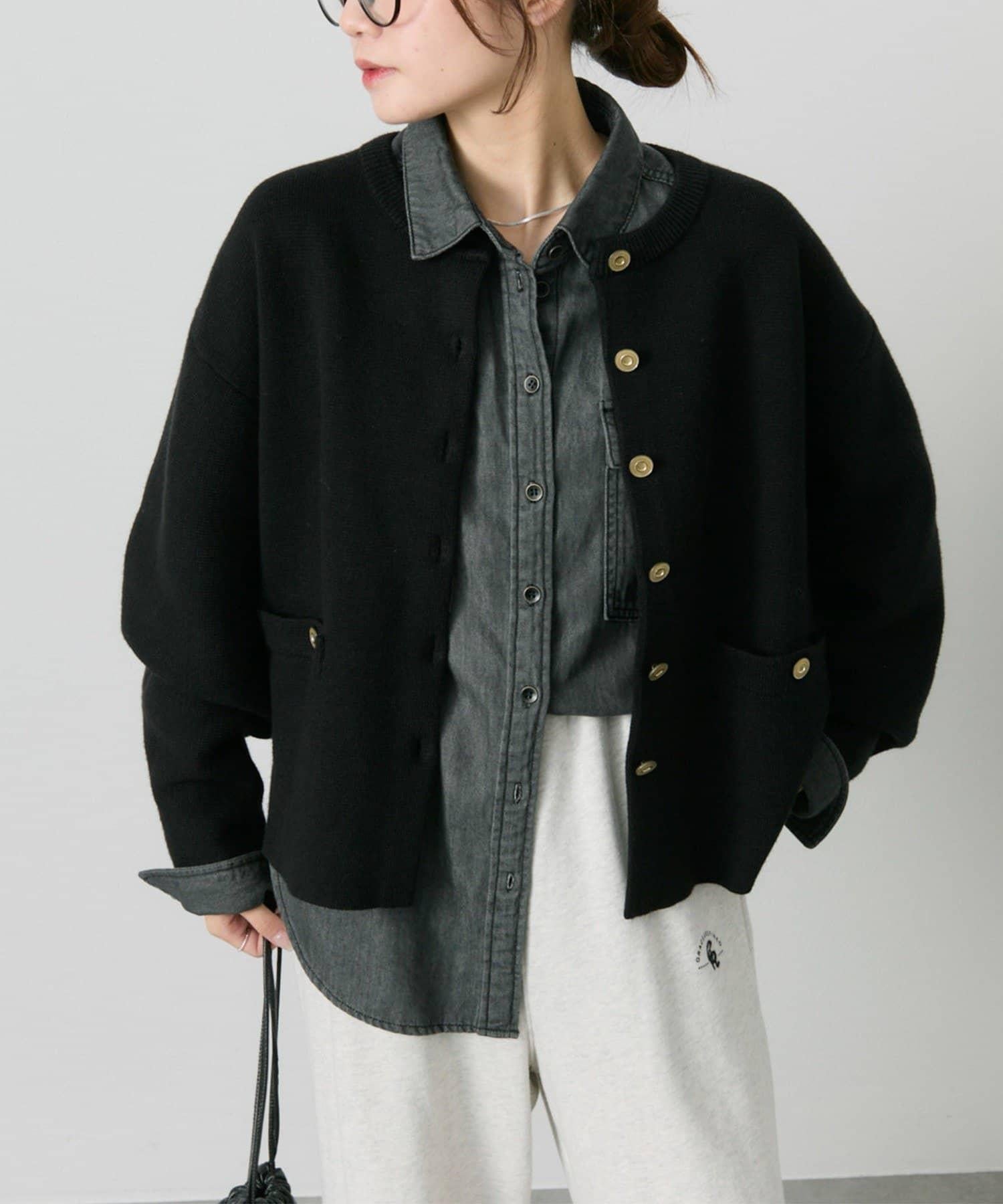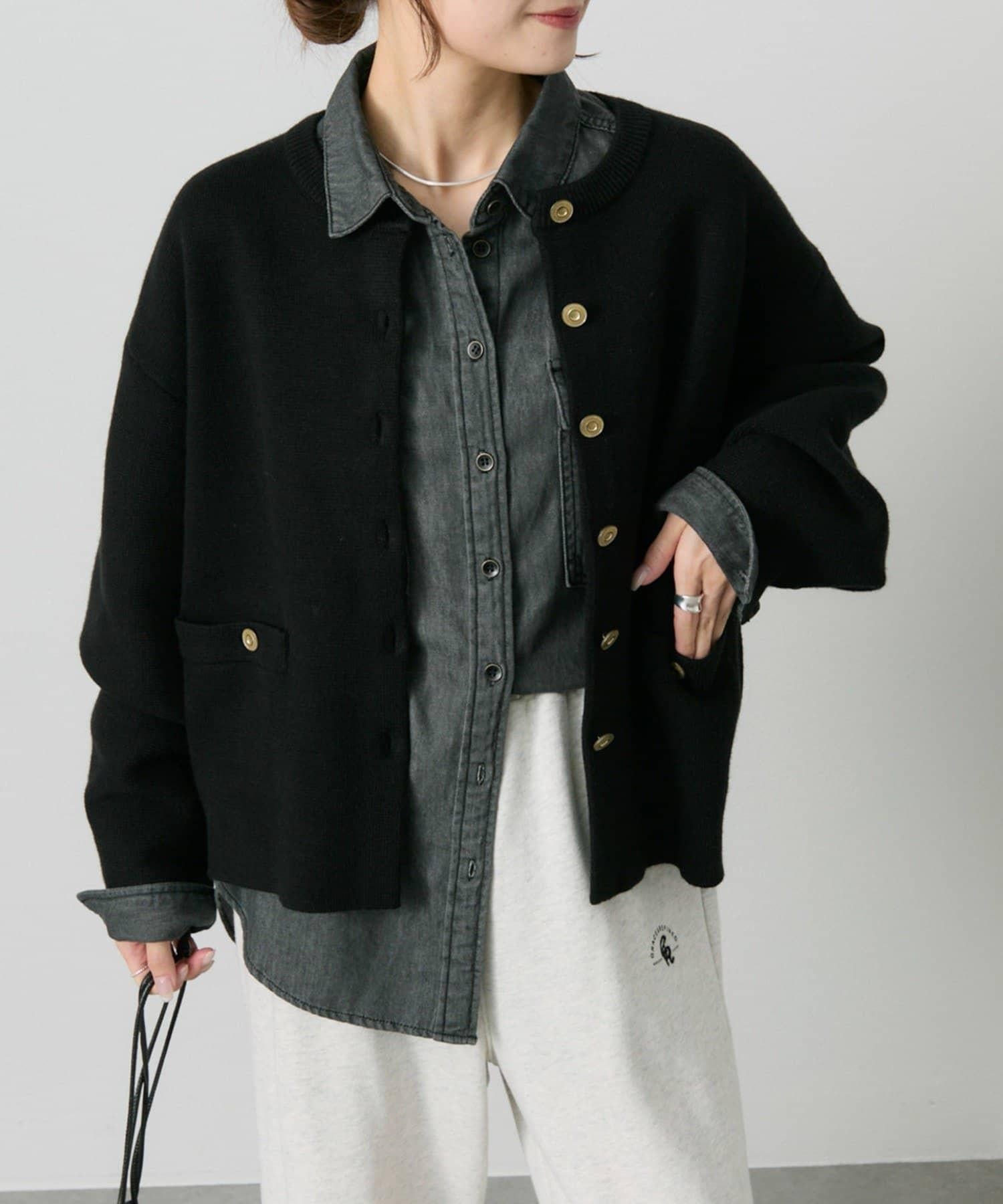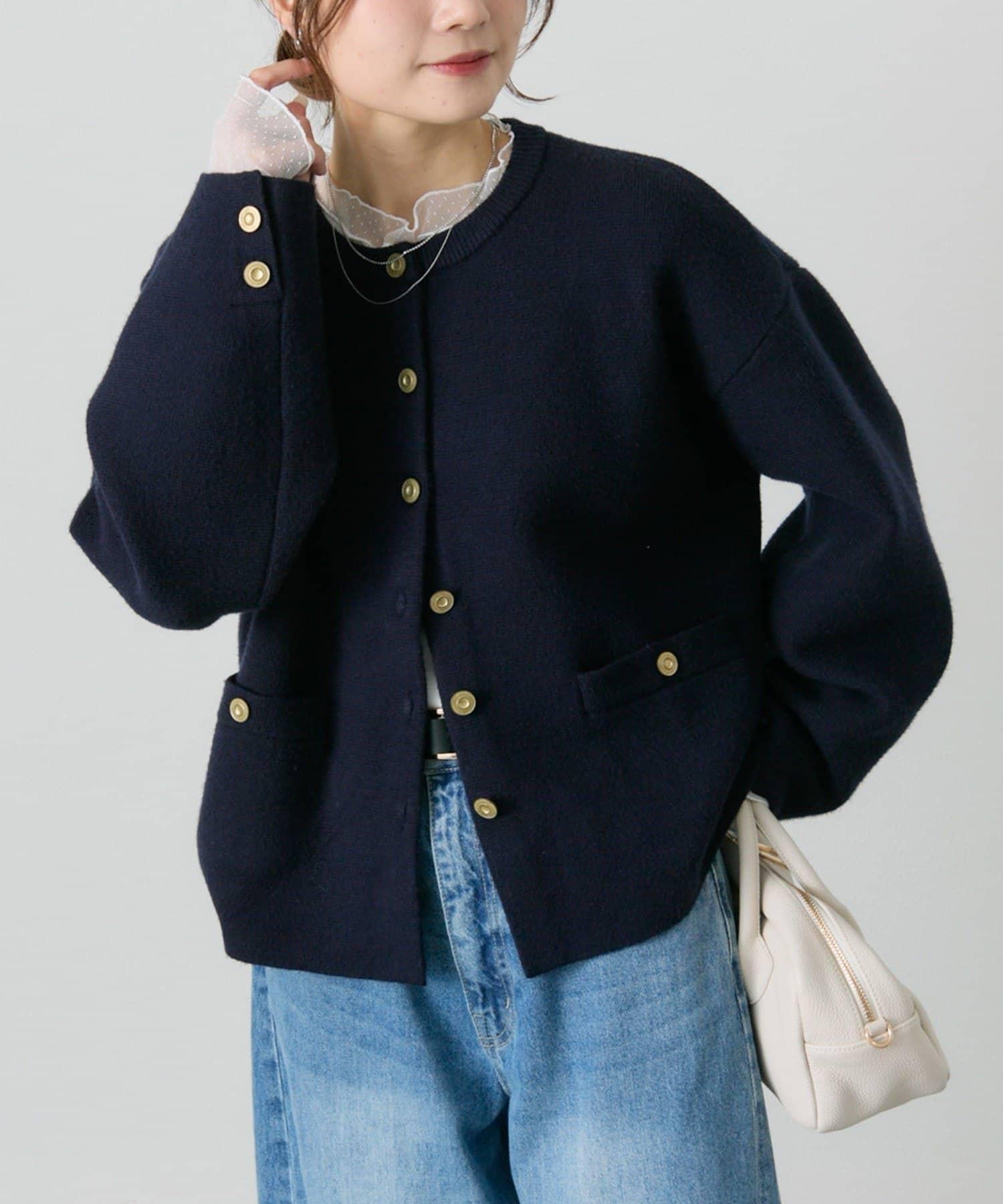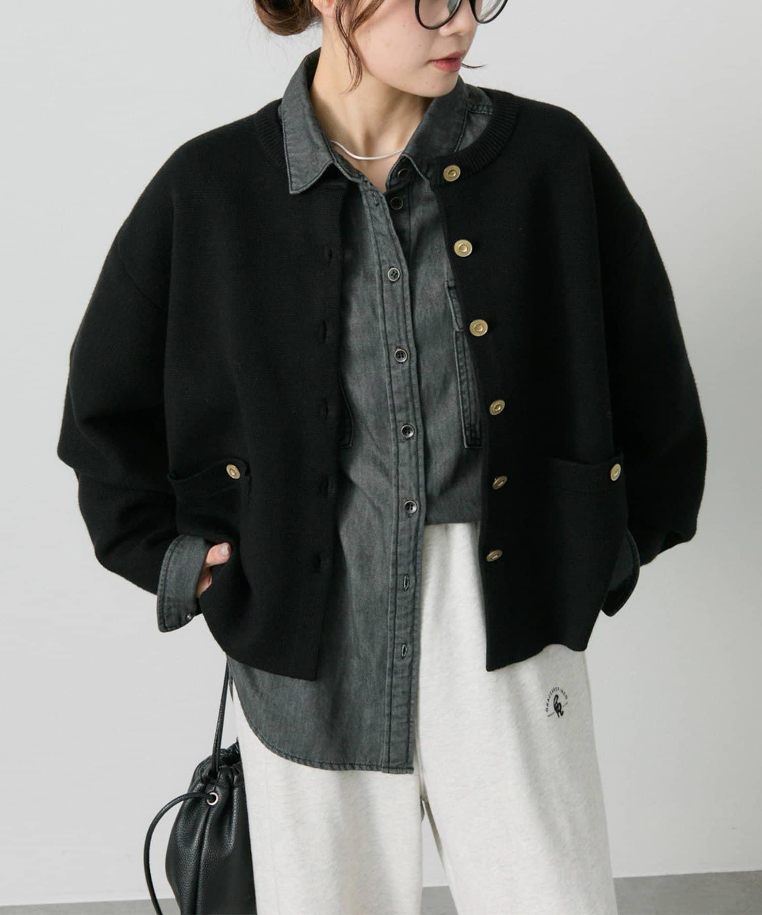 像夾克一樣的開衫,配以有品位的金色紐扣。