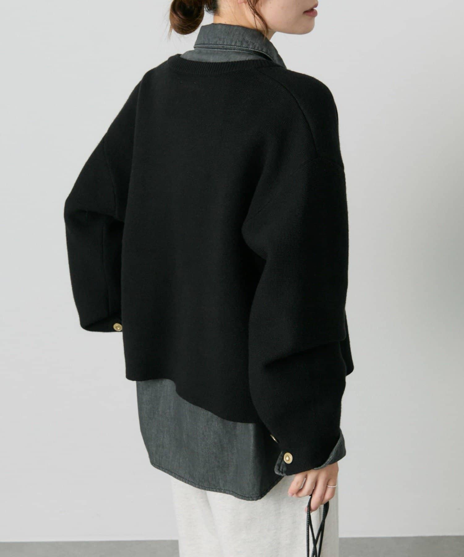 它的衣身寬度和手臂尺寸都很寬鬆,因此可以與襯衫和剪裁平整地搭配穿著,也可以輕鬆地編織在身上。