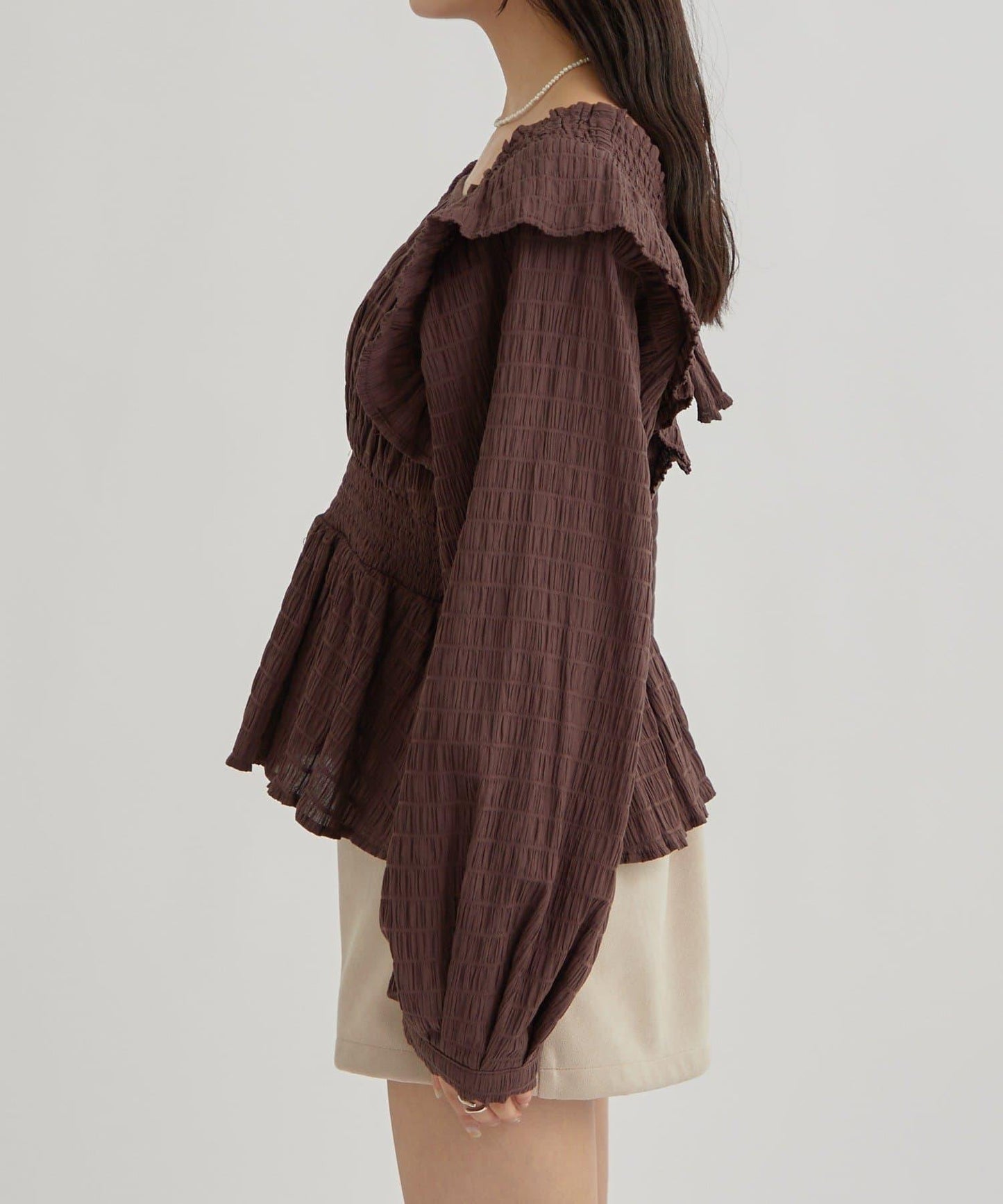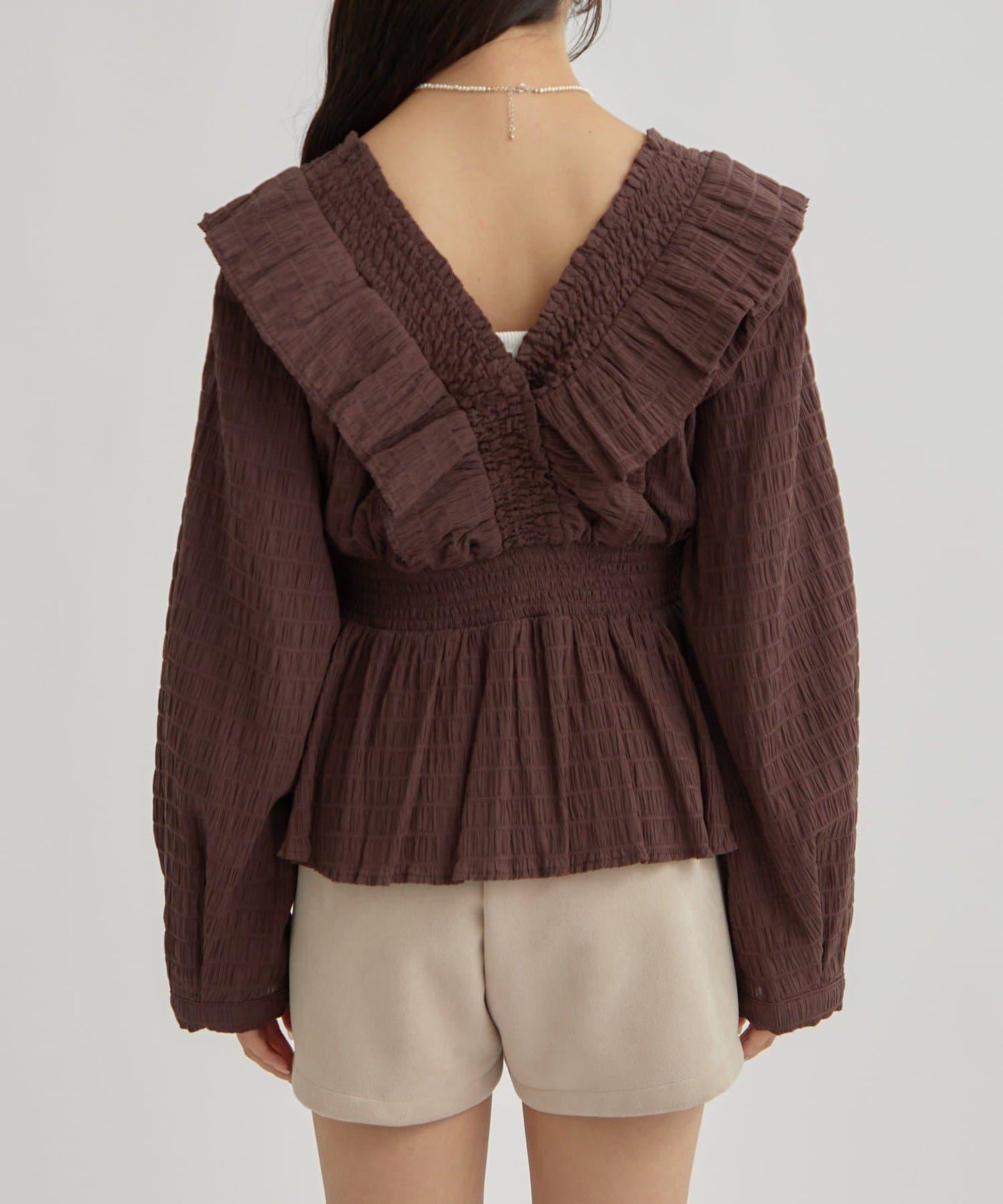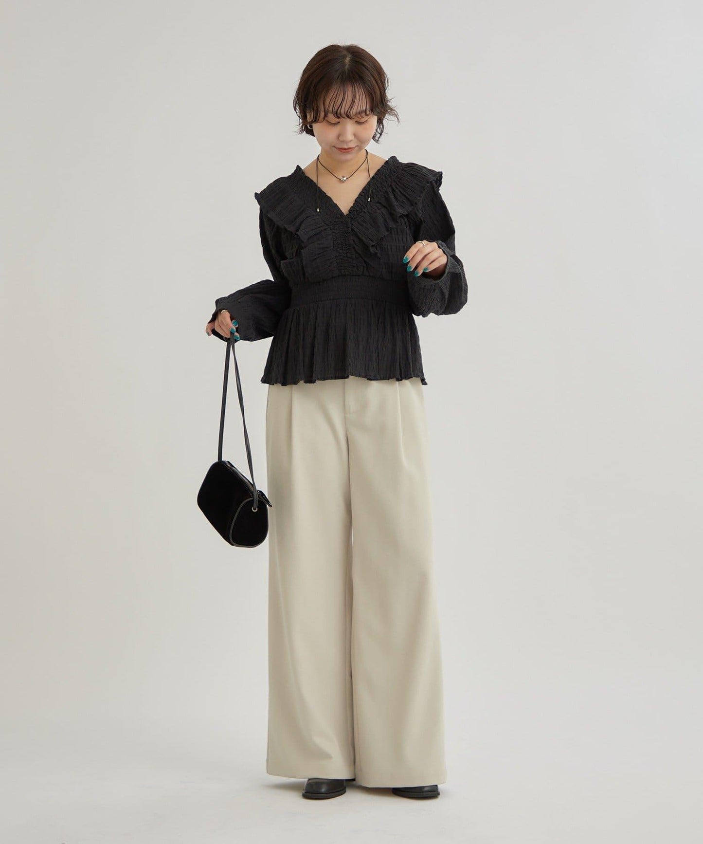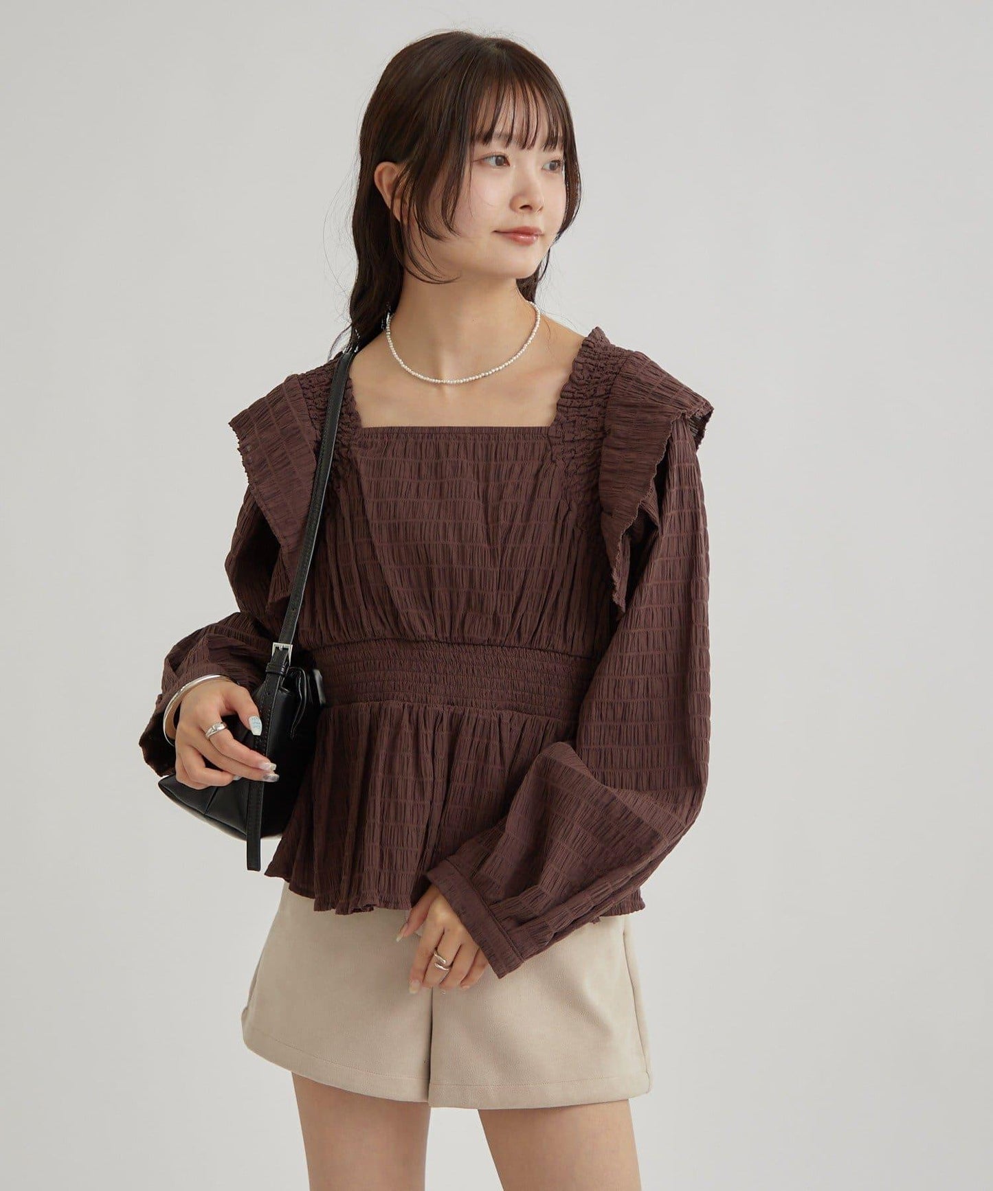 上衣採用方領設計,使頸部看起來乾淨利落,給人以纖細的印象。