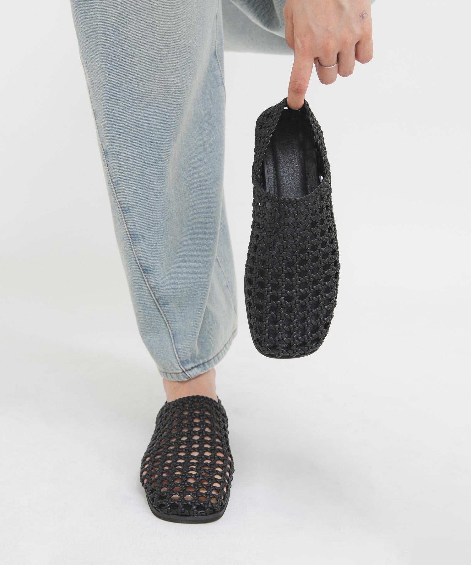 手工編織的迷人網眼布能輕柔地包裹雙腳。設計還具有良好的鬆緊度,方便時尚的腳型和腳跟踩踏。具有穩定感的平底設計使其在日常生活中也能輕鬆行走和活躍。