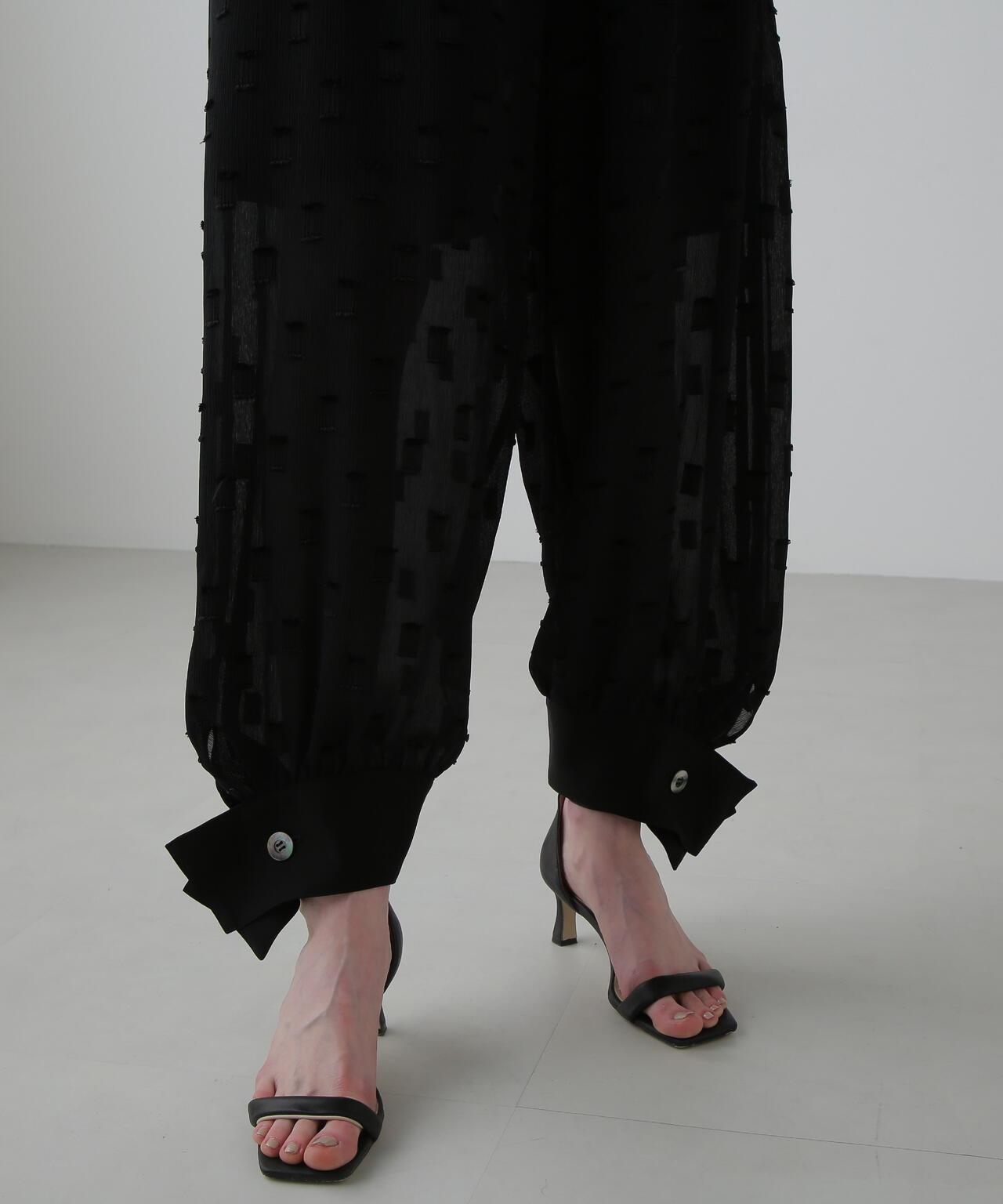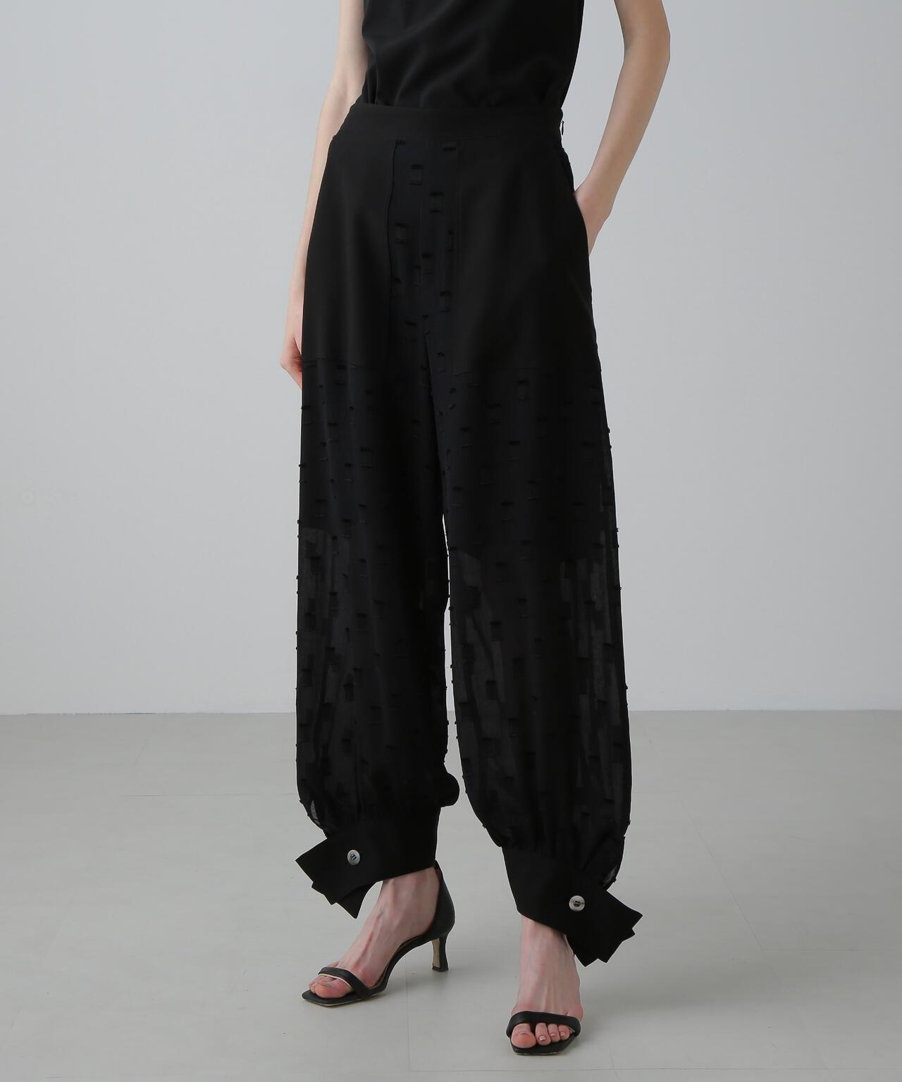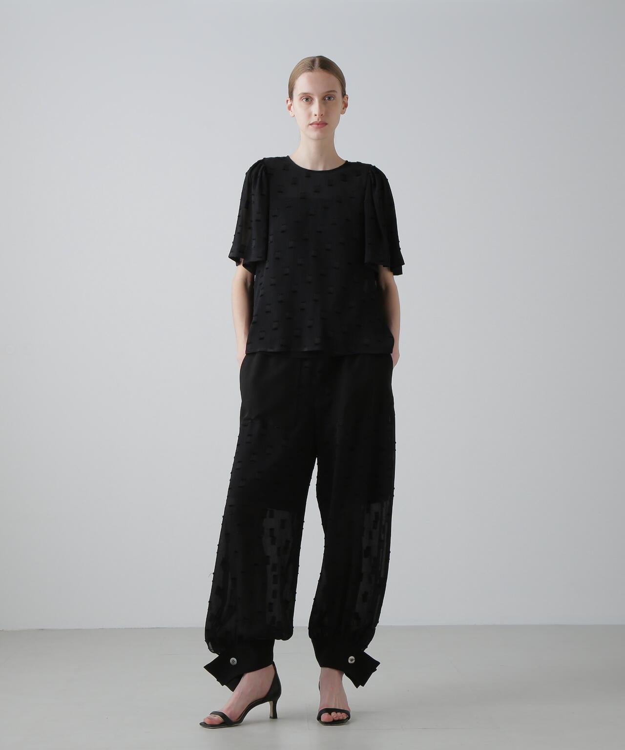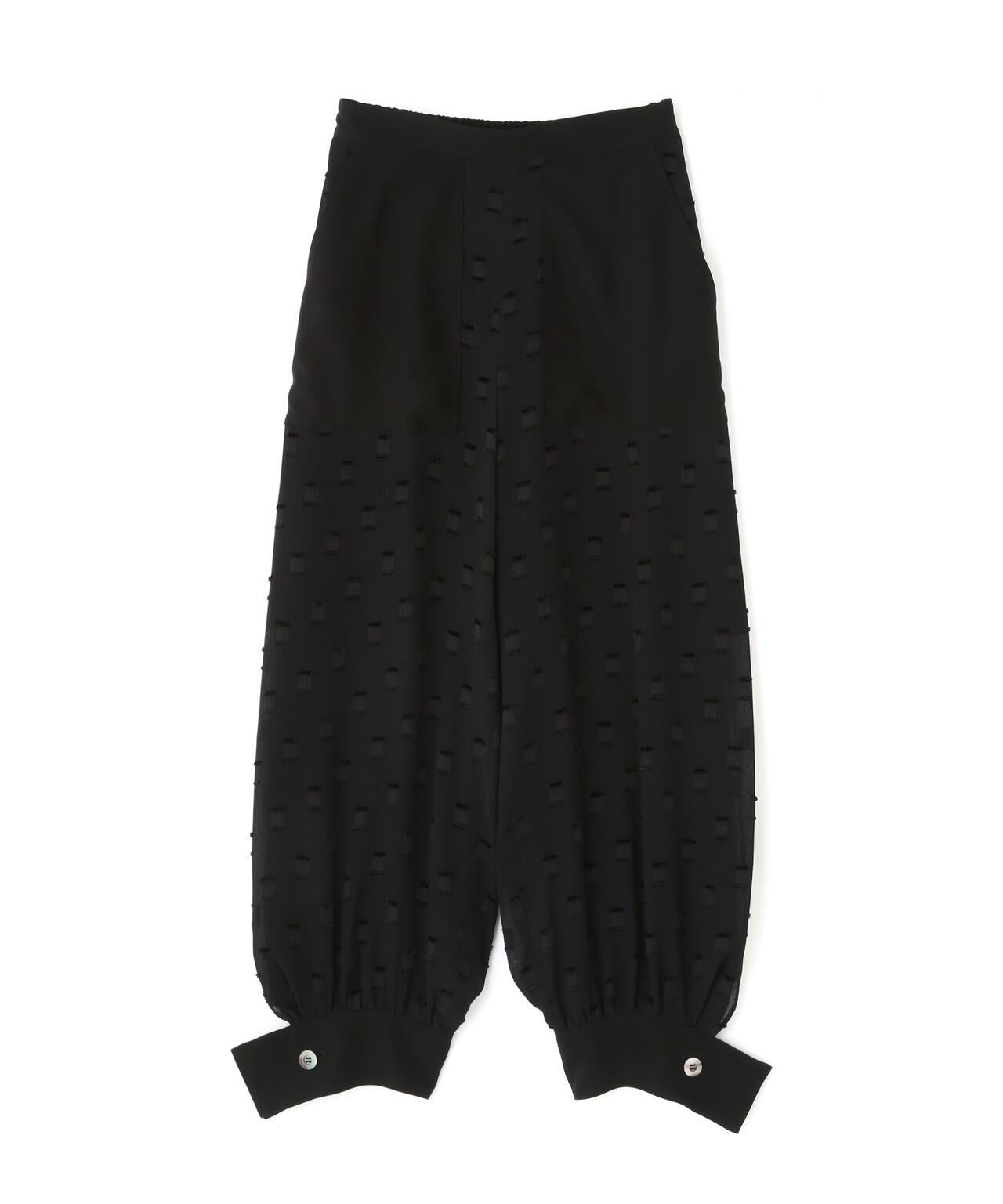 方形圖案提花面料長褲這款長褲採用優質提花面料製成,非常適合初秋穿著。這款長褲剪裁寬鬆,口袋和下襬採用不同的不透明材料製成。下襬部分設計成可以塞進腳踝。建議搭配同款上衣(貨號:531-5210806)。這種提花面料未經加工,但由於紗線捻度和收縮率的不同,經線上會出現柳條般的褶皺,並通過閃亮的聚酯紗線表現出重點剪裁圖案。請注意,這種面料較薄,比較脆弱,請小心不要弄破或撕裂。