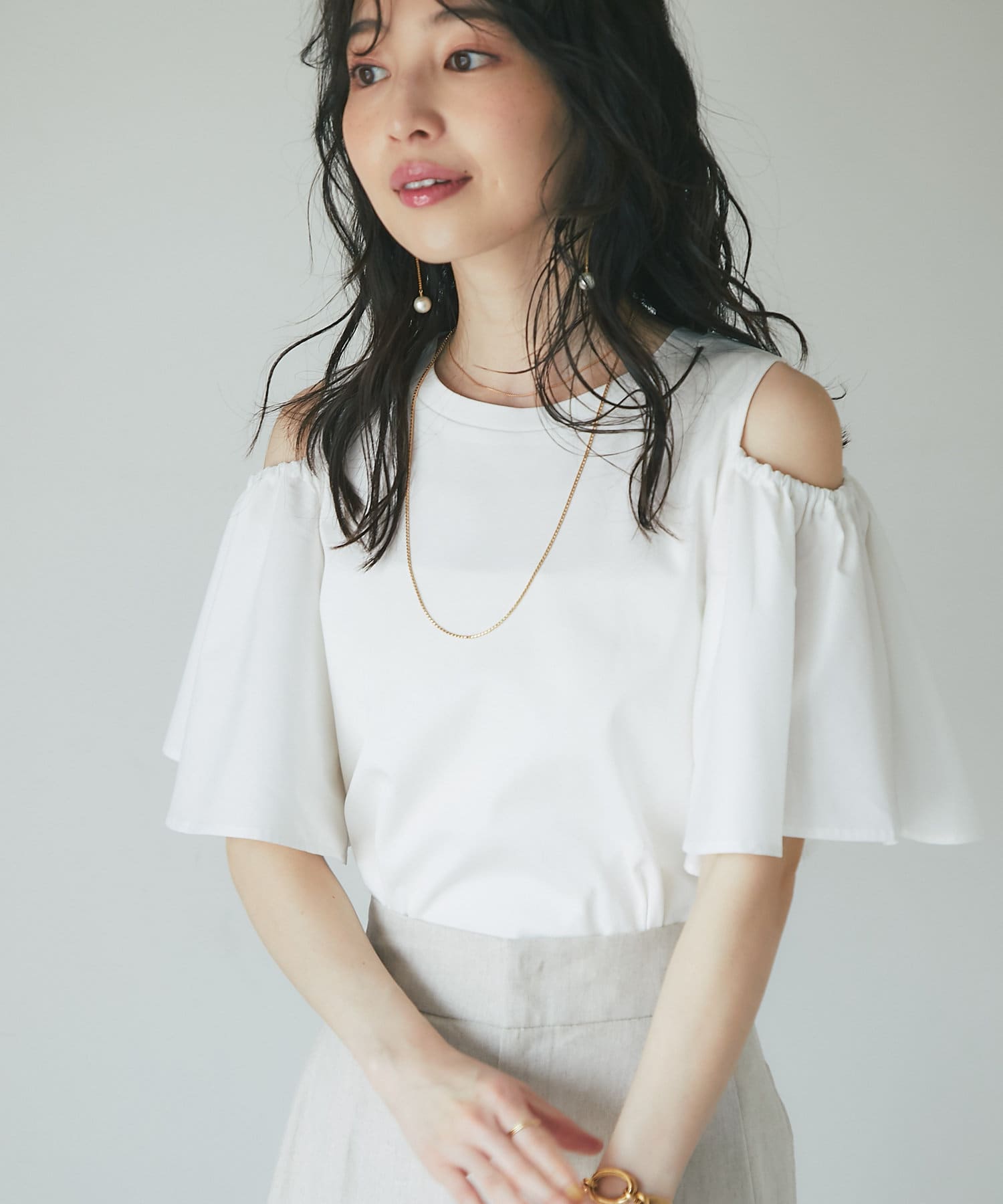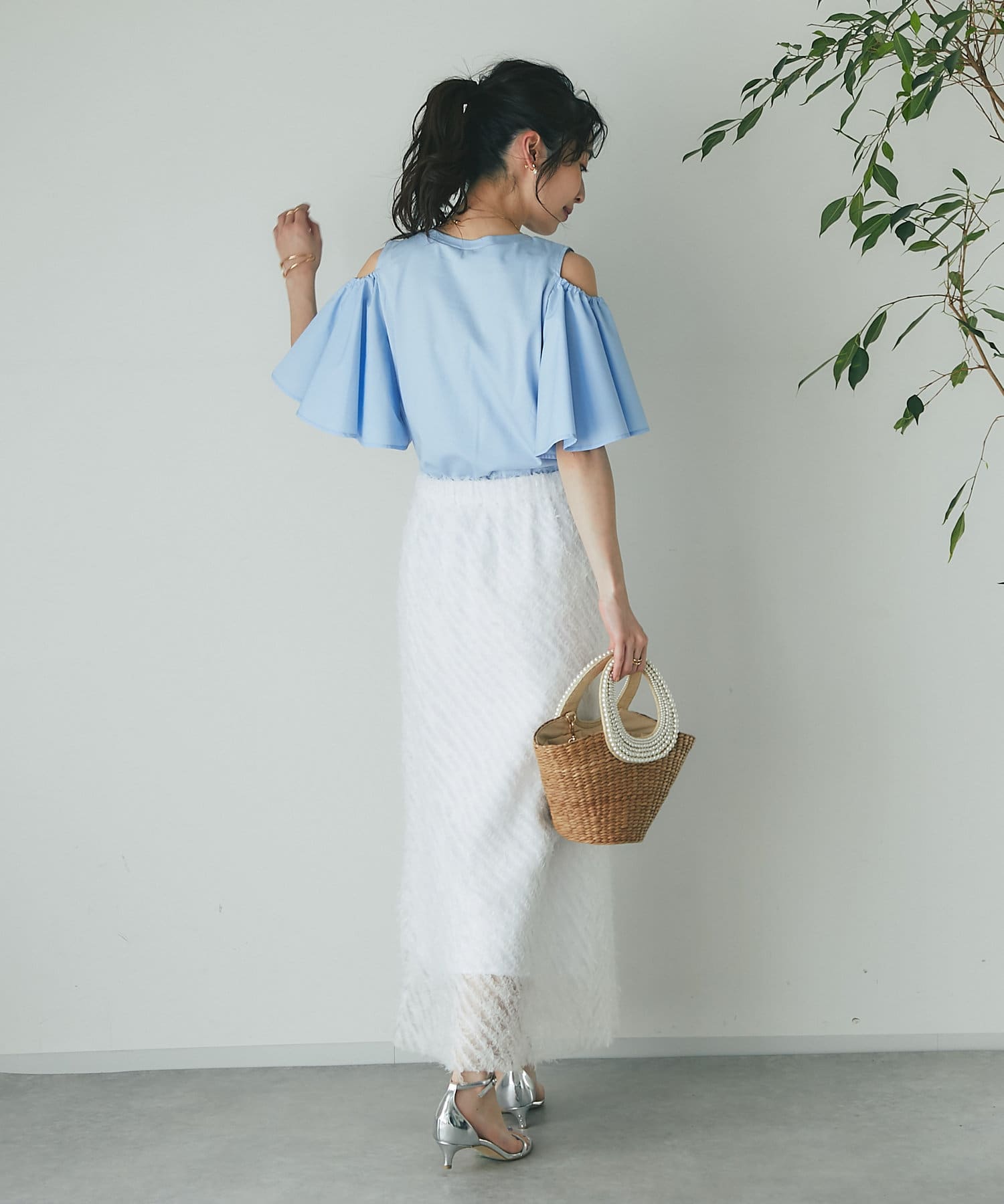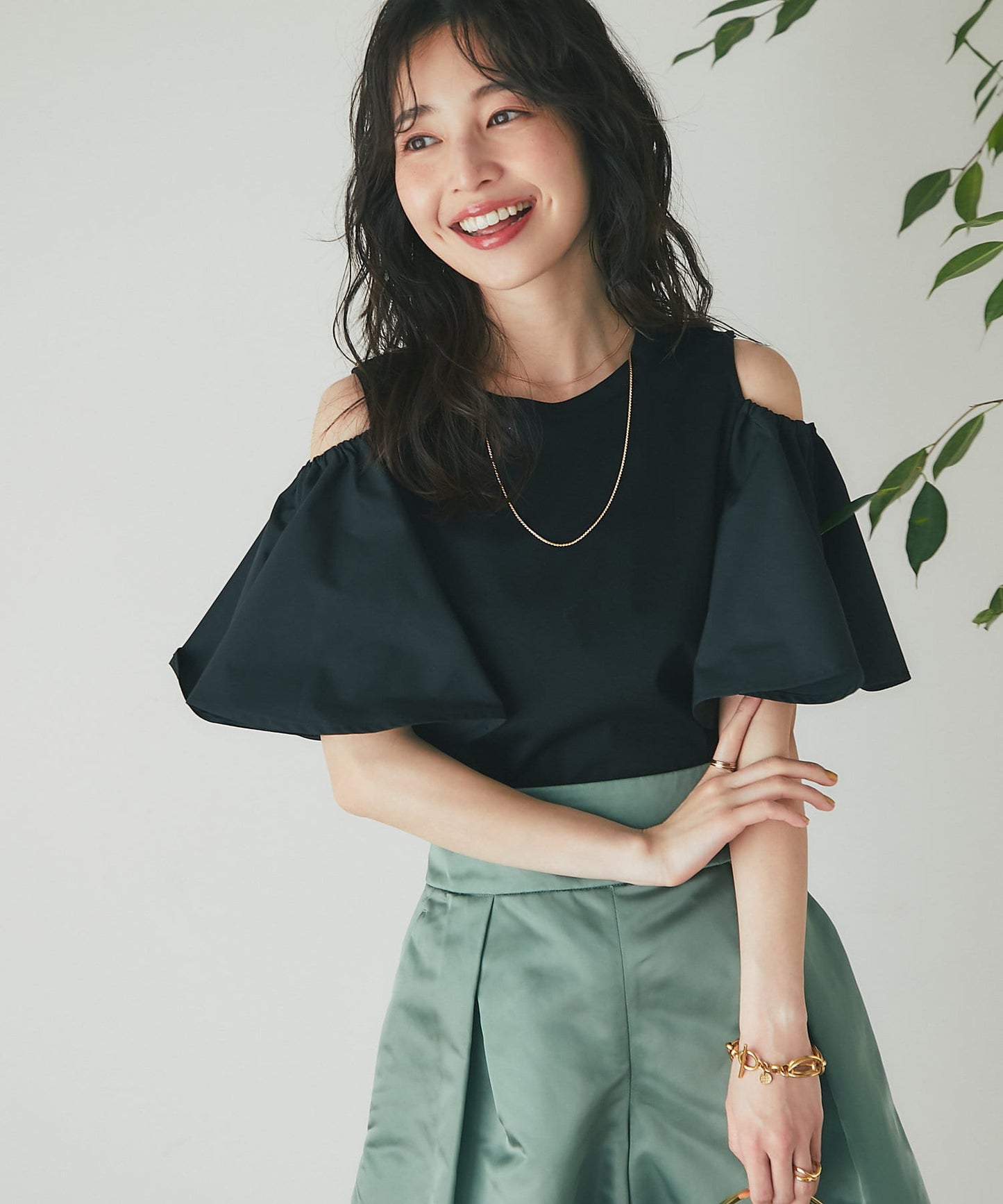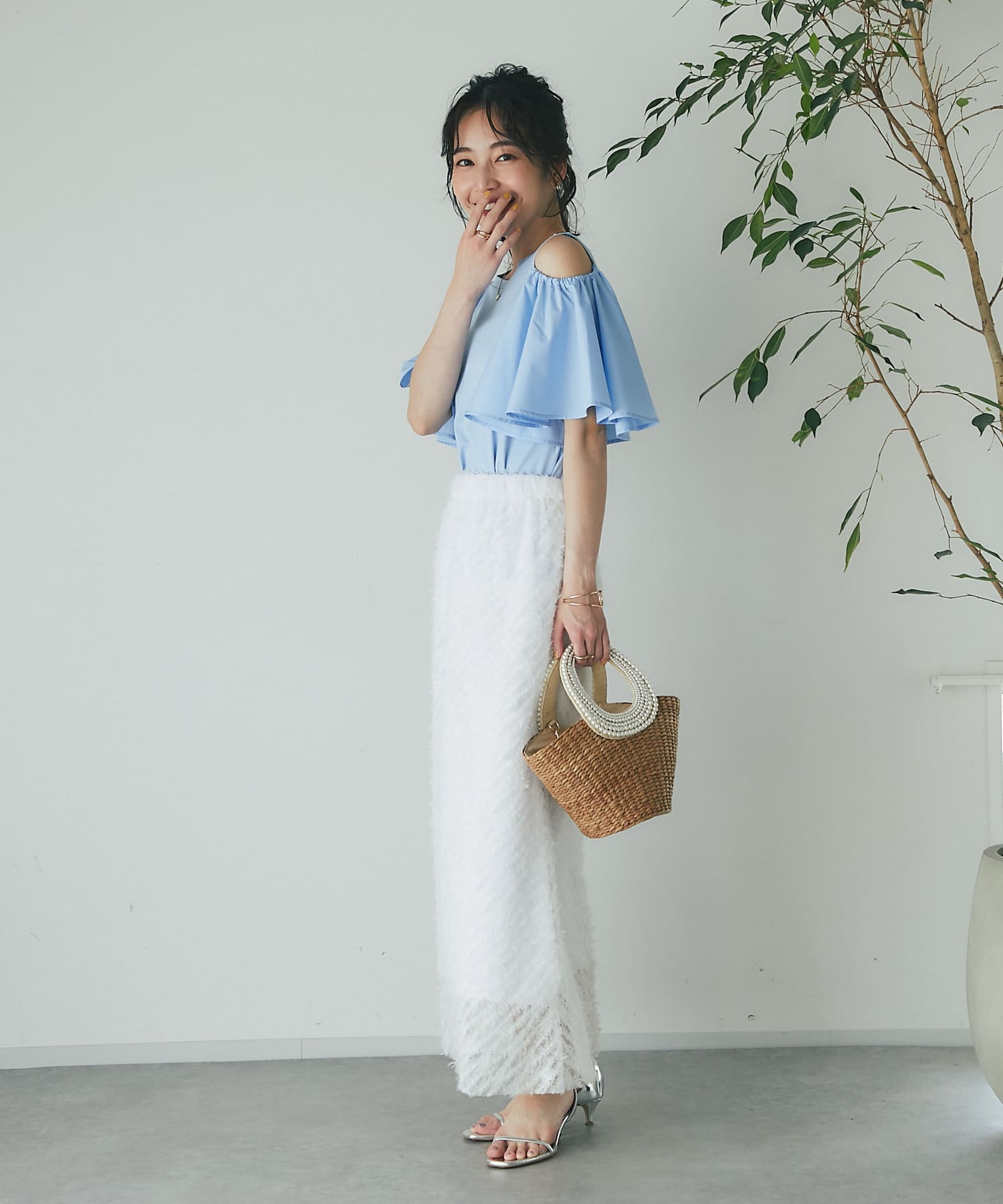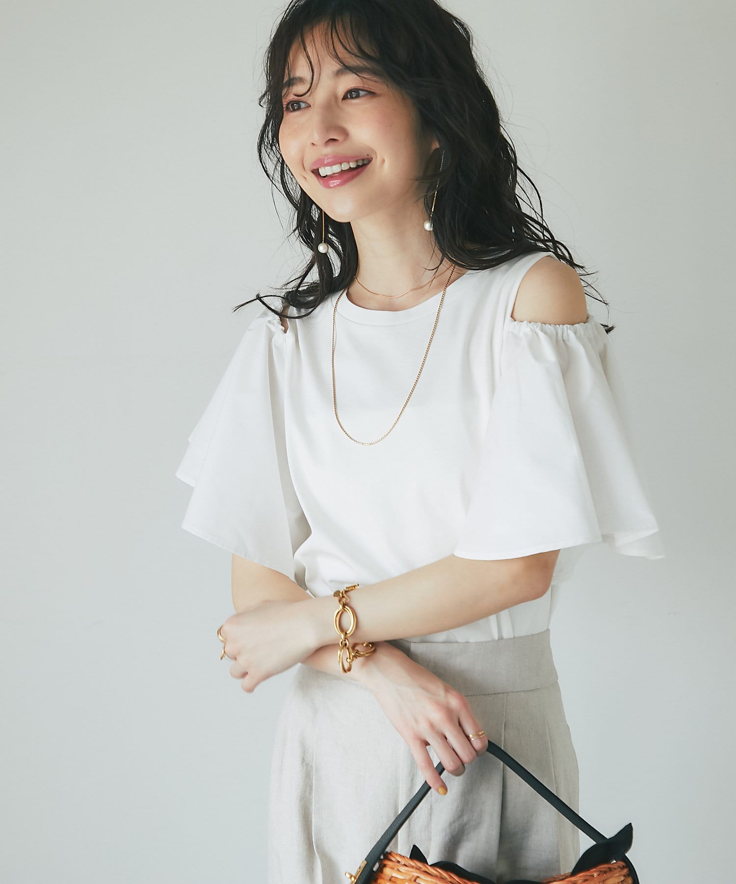 荷葉邊的體積和露肩的健康肌膚給人一種輕鬆的感覺。