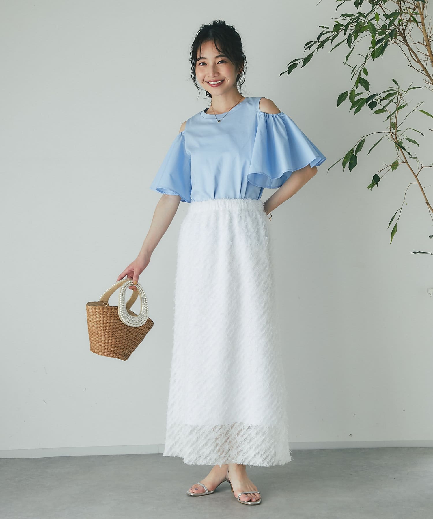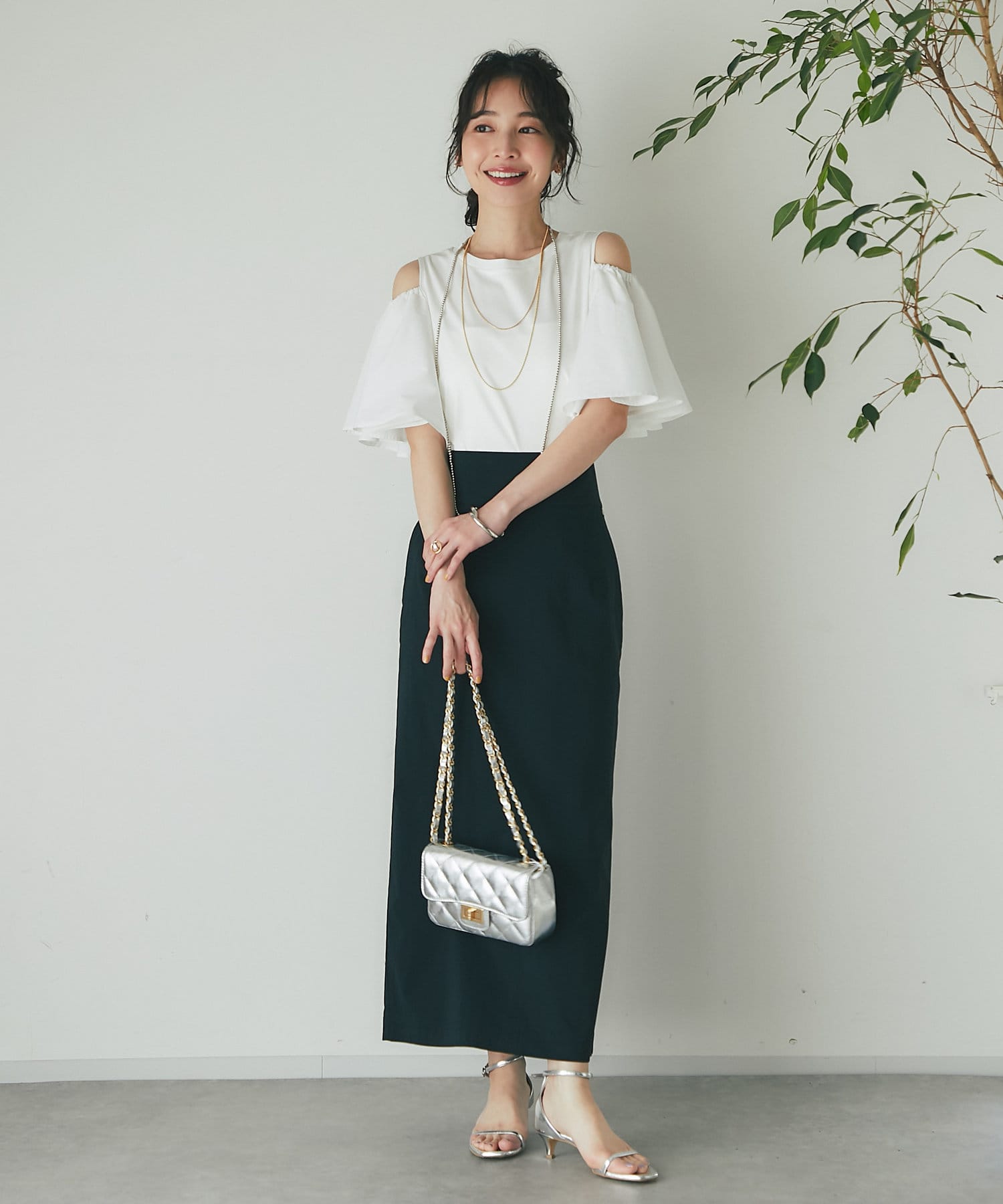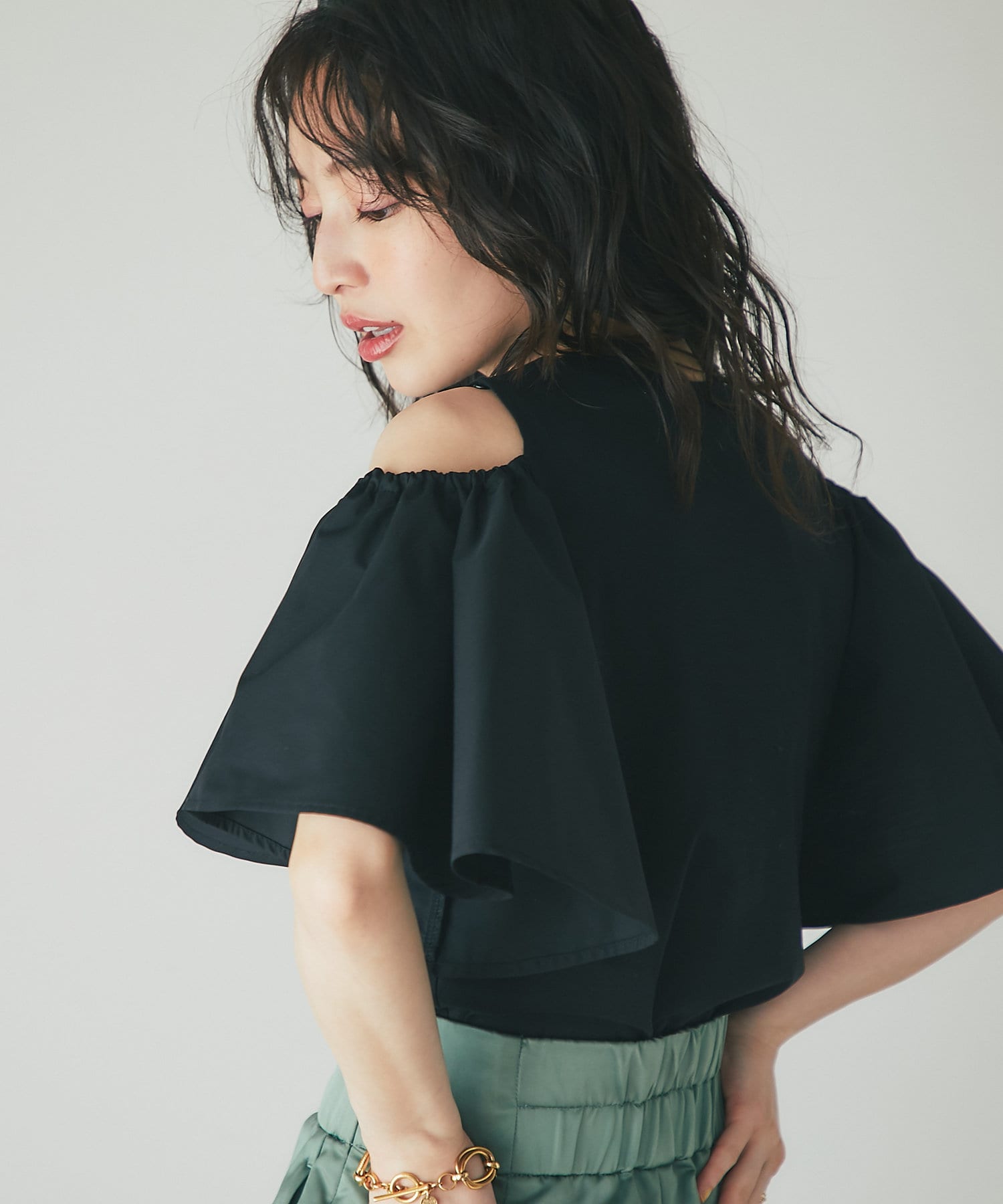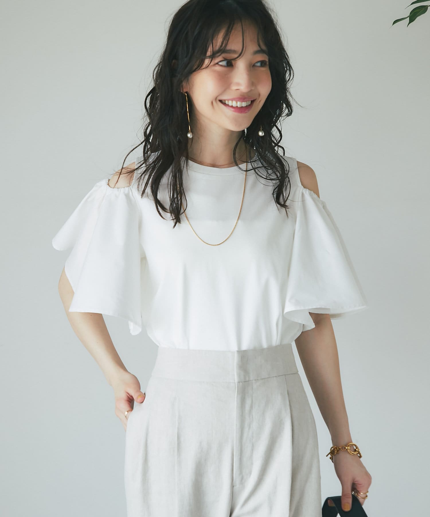 荷葉邊的體積和露肩的健康肌膚給人一種輕鬆的感覺。