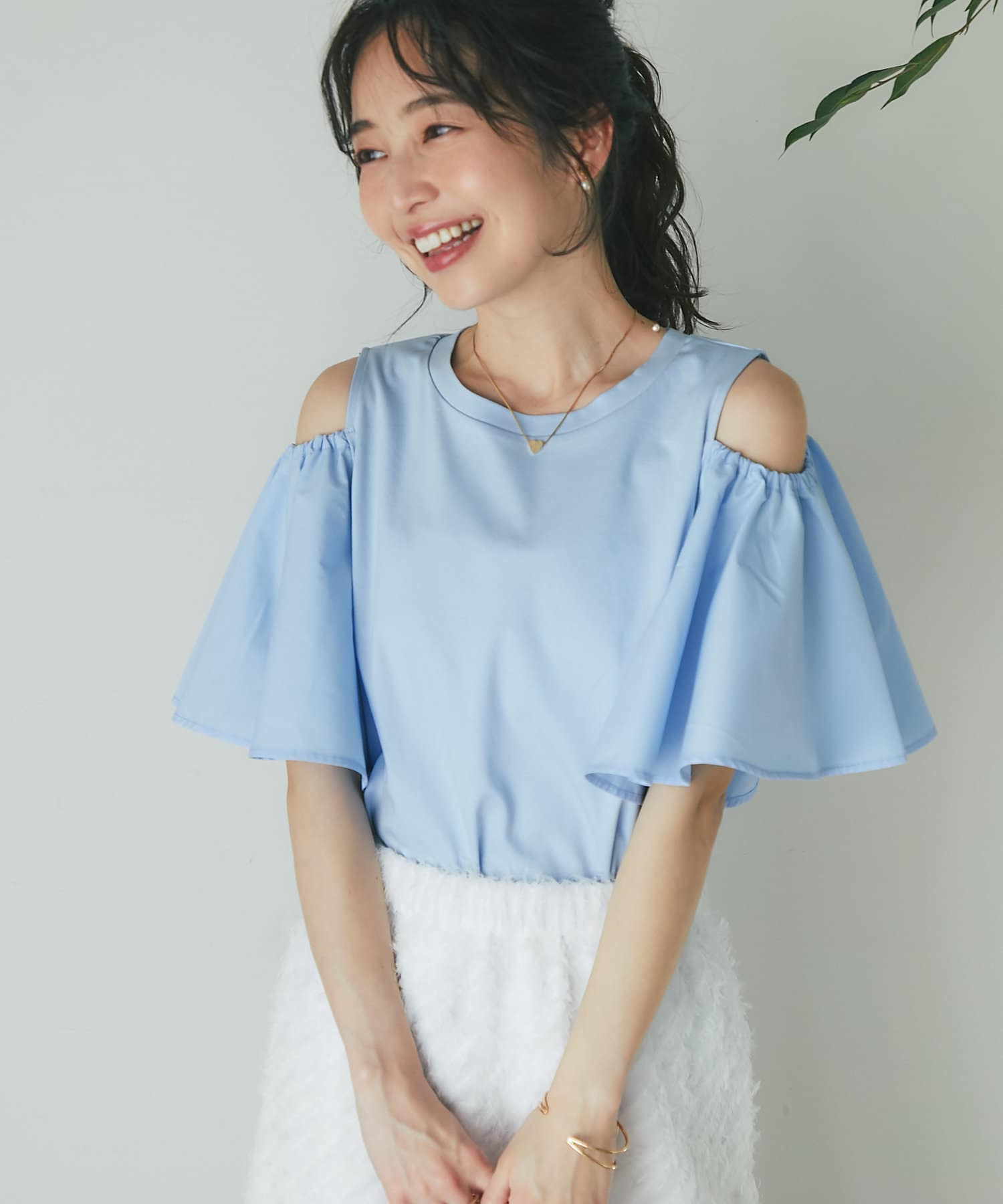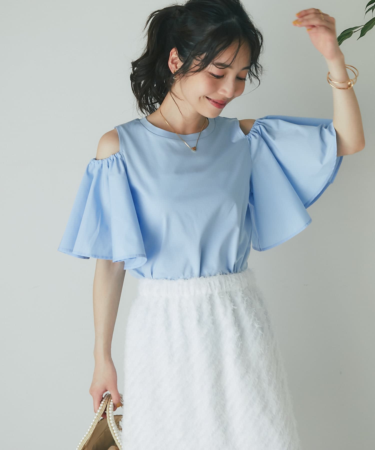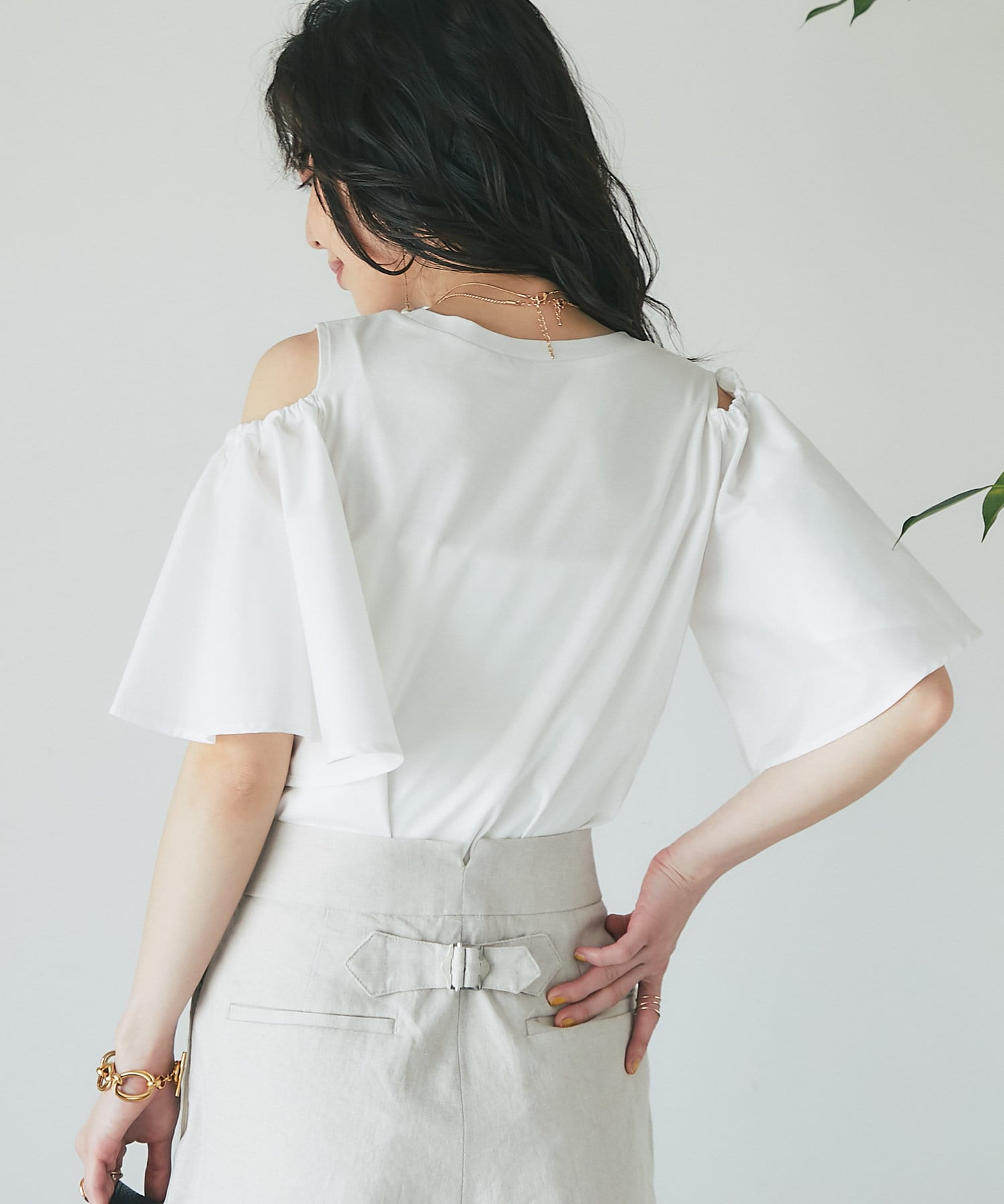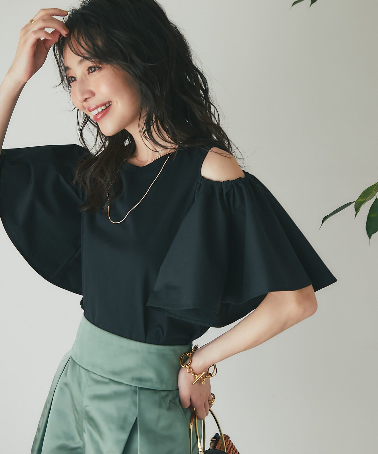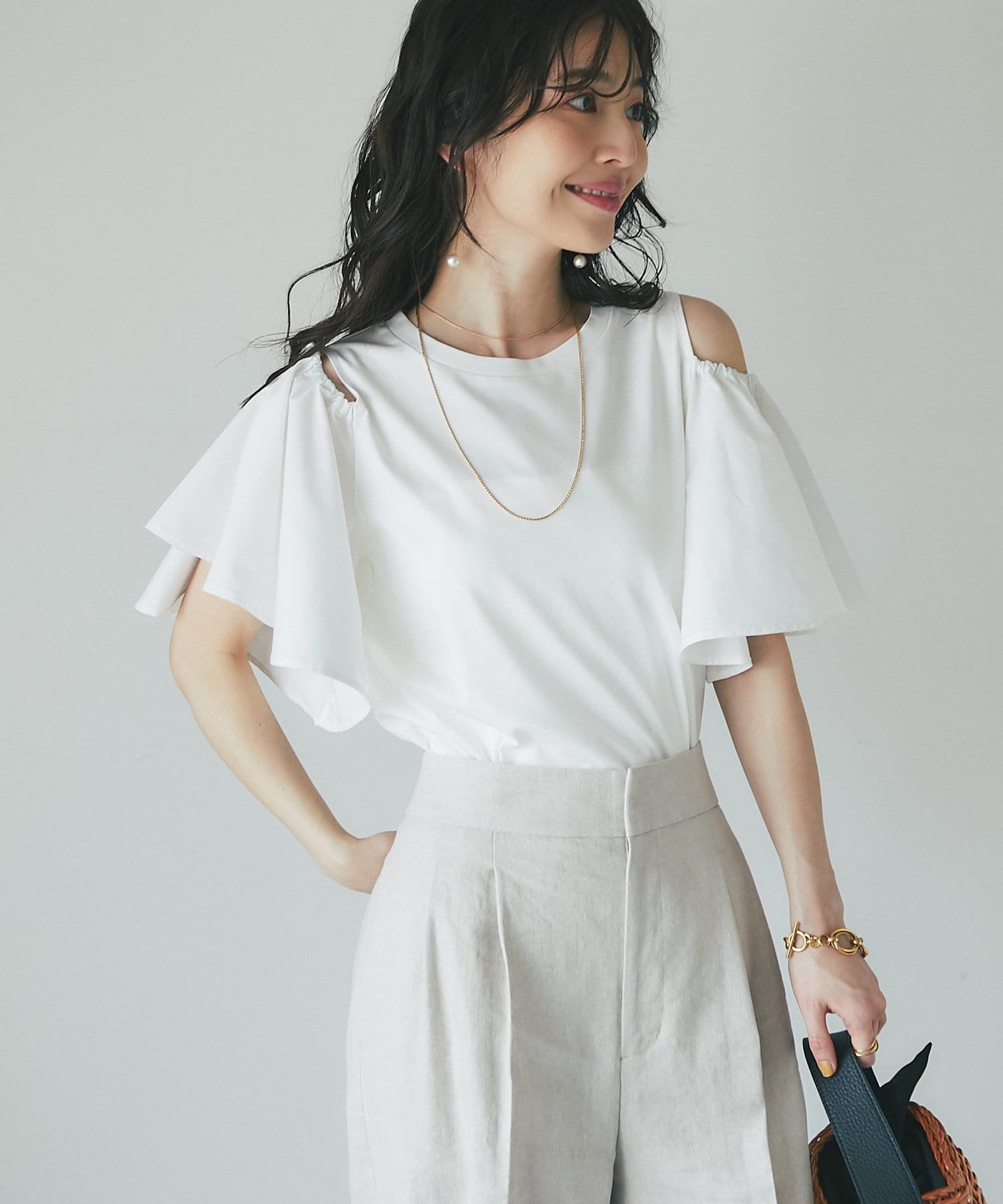 荷葉邊的體積和露肩的健康肌膚給人一種輕鬆的感覺。