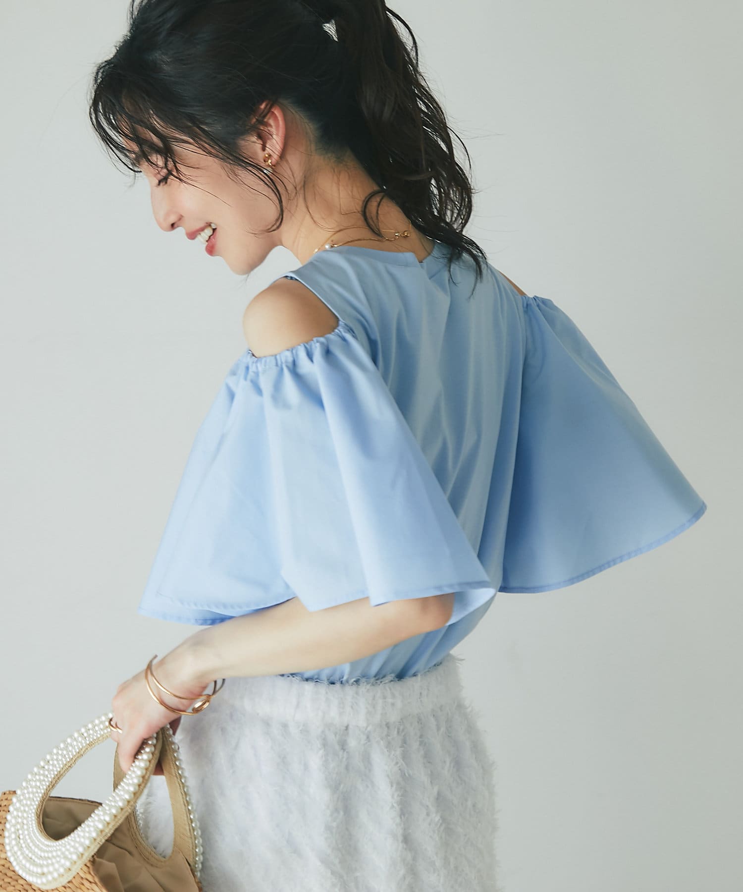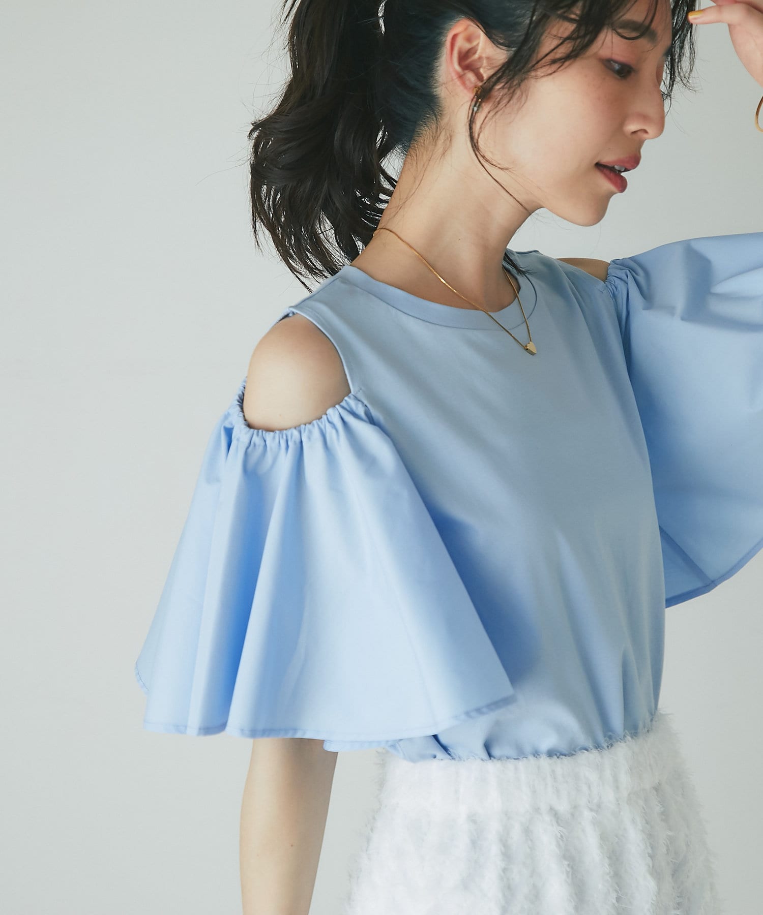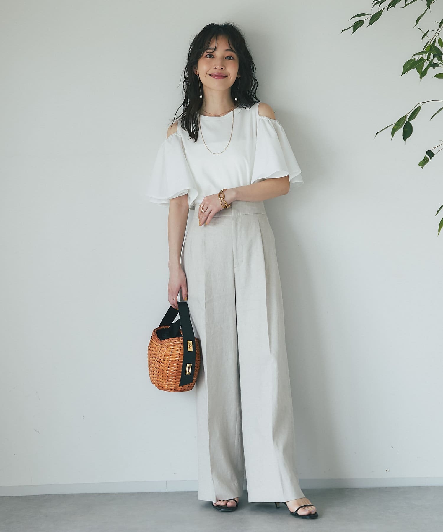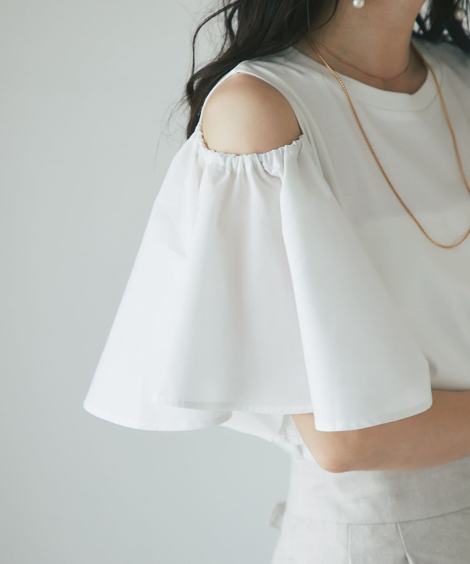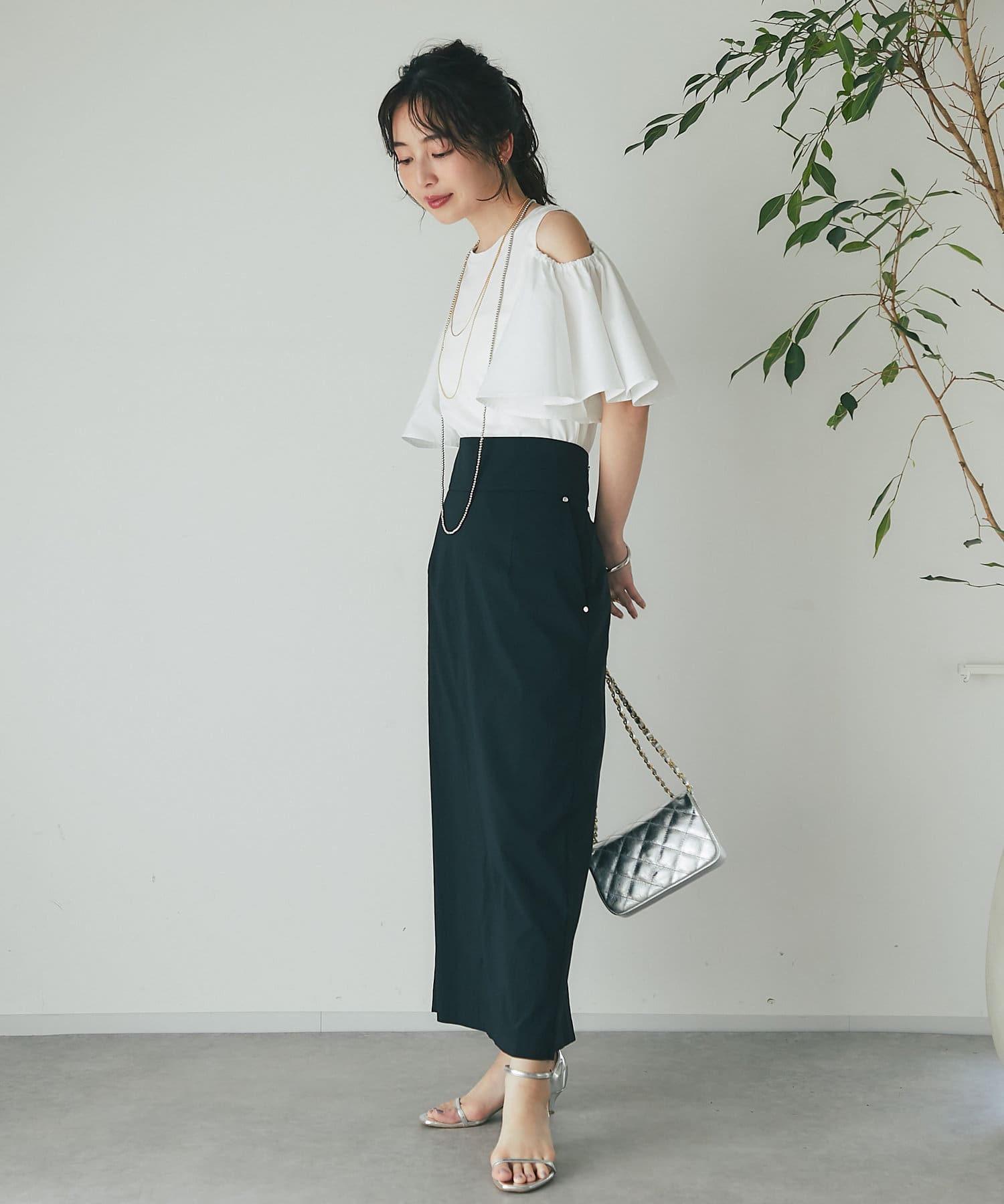 荷葉邊的體積和露肩的健康肌膚給人一種輕鬆的感覺。