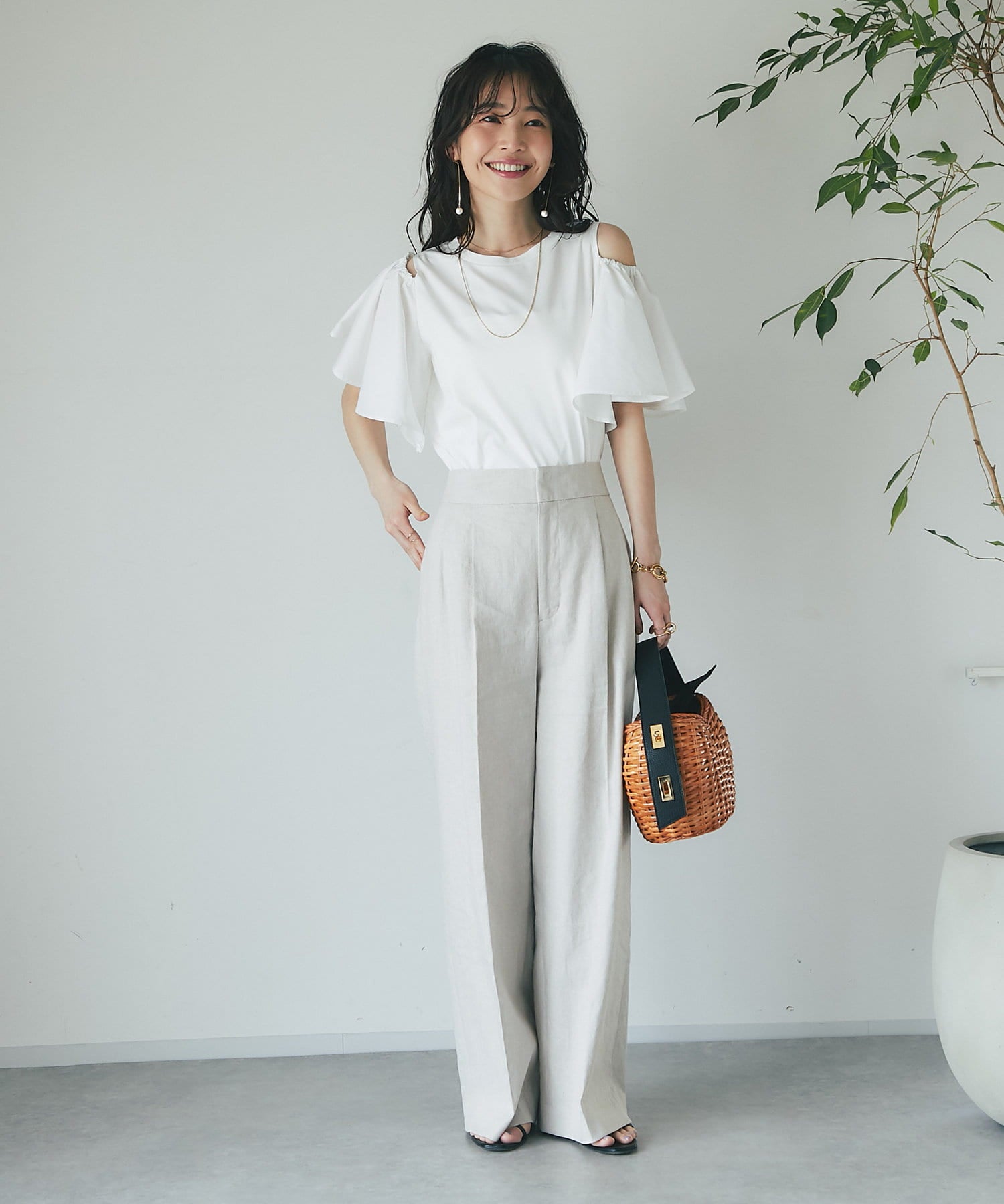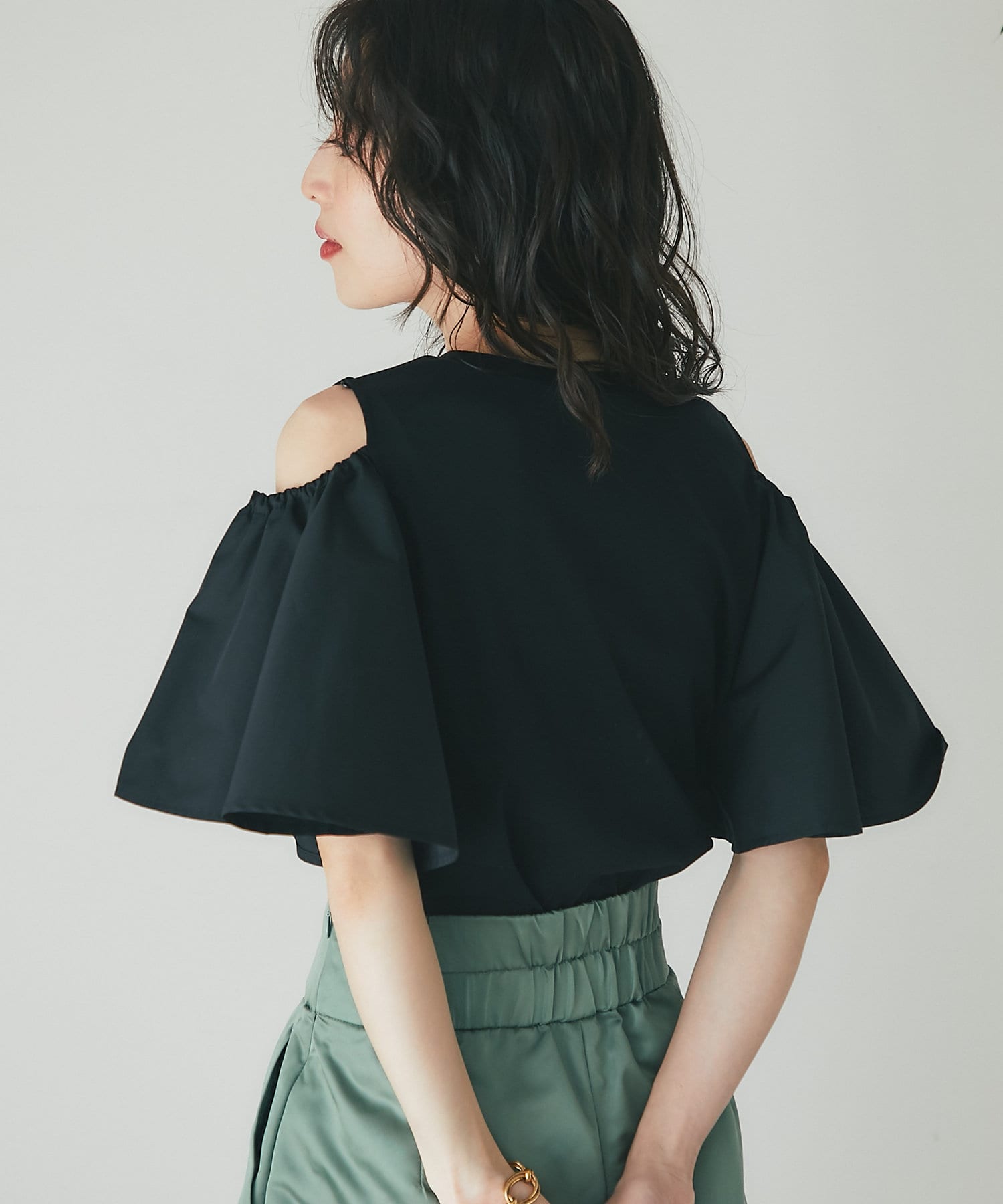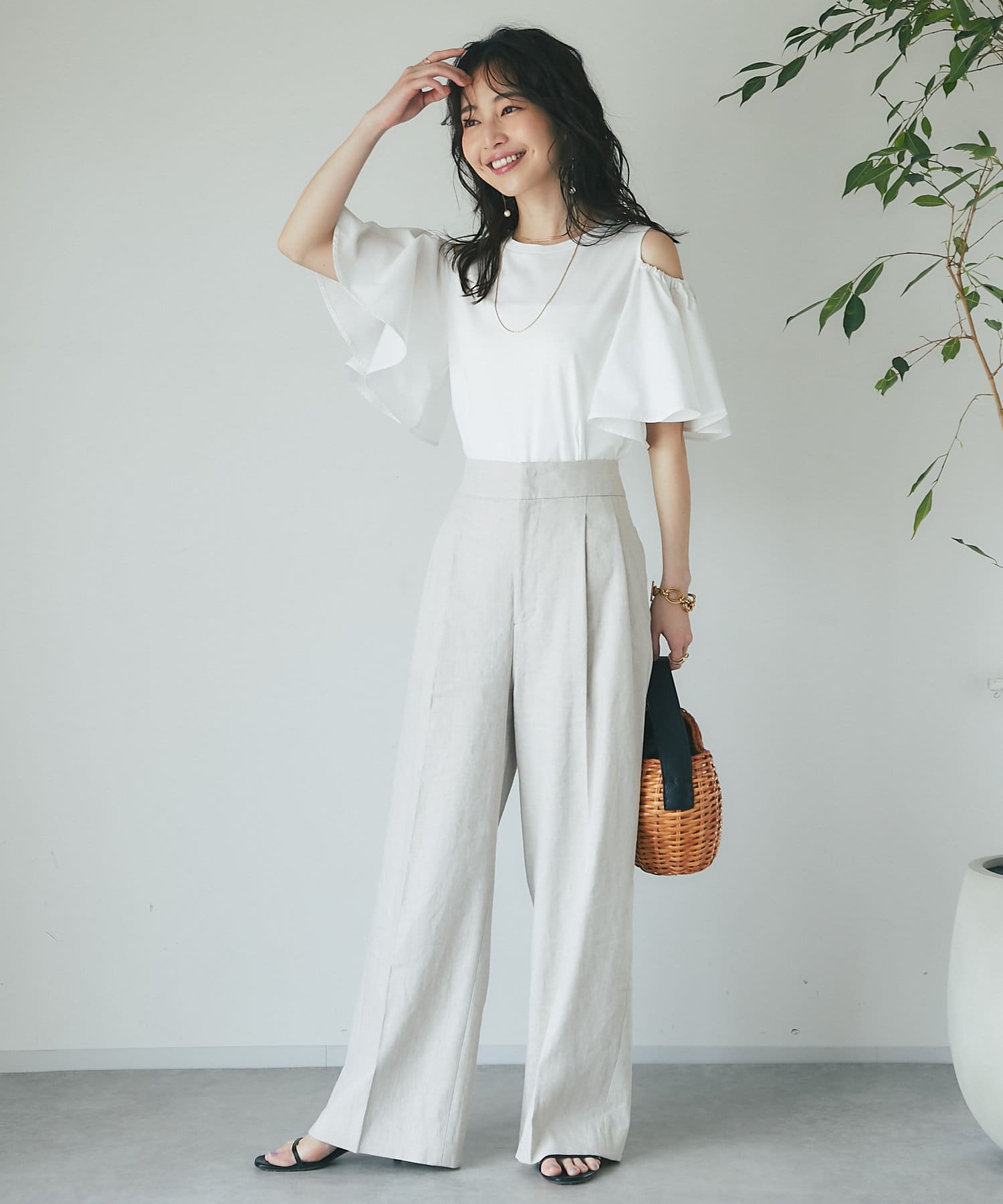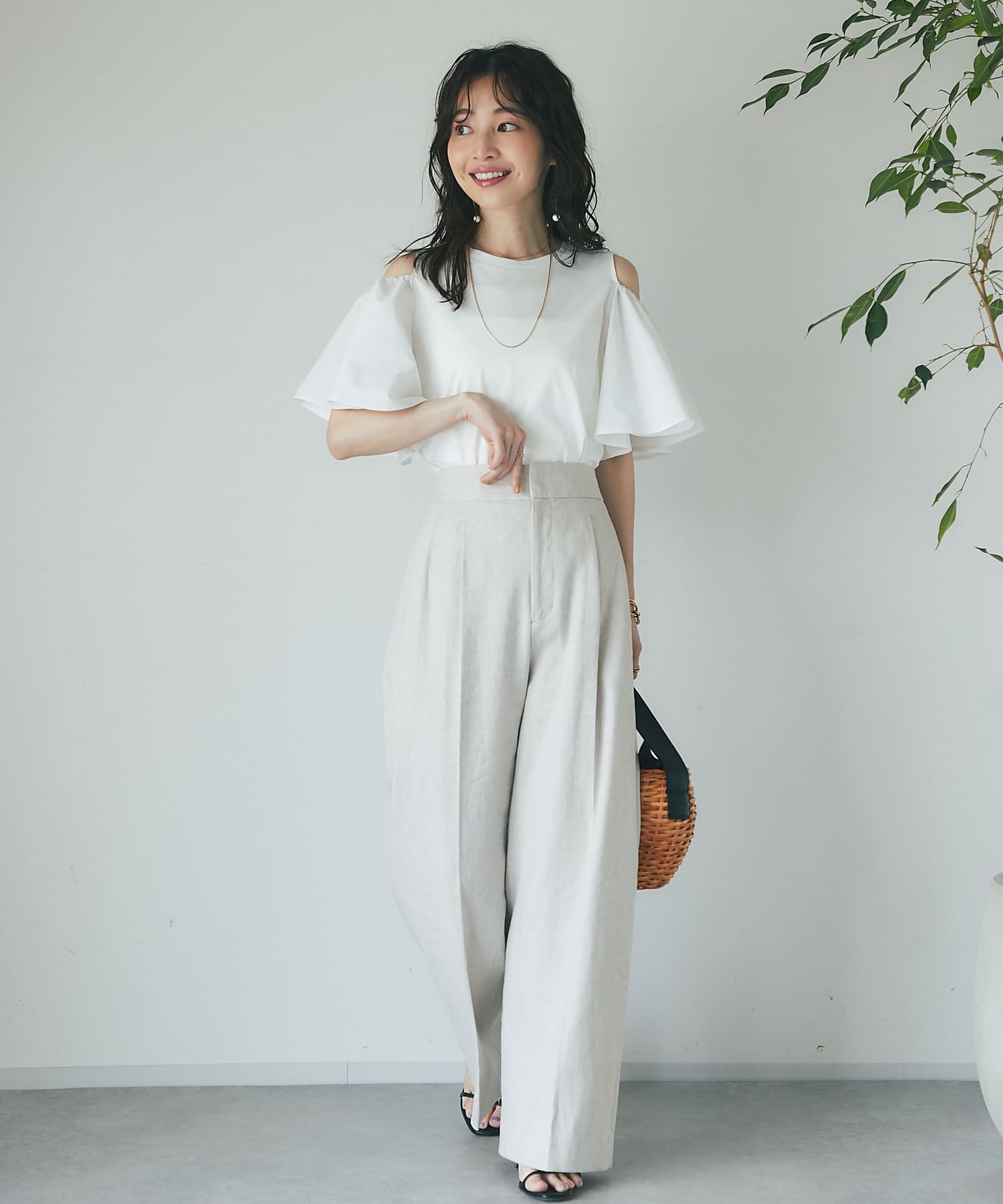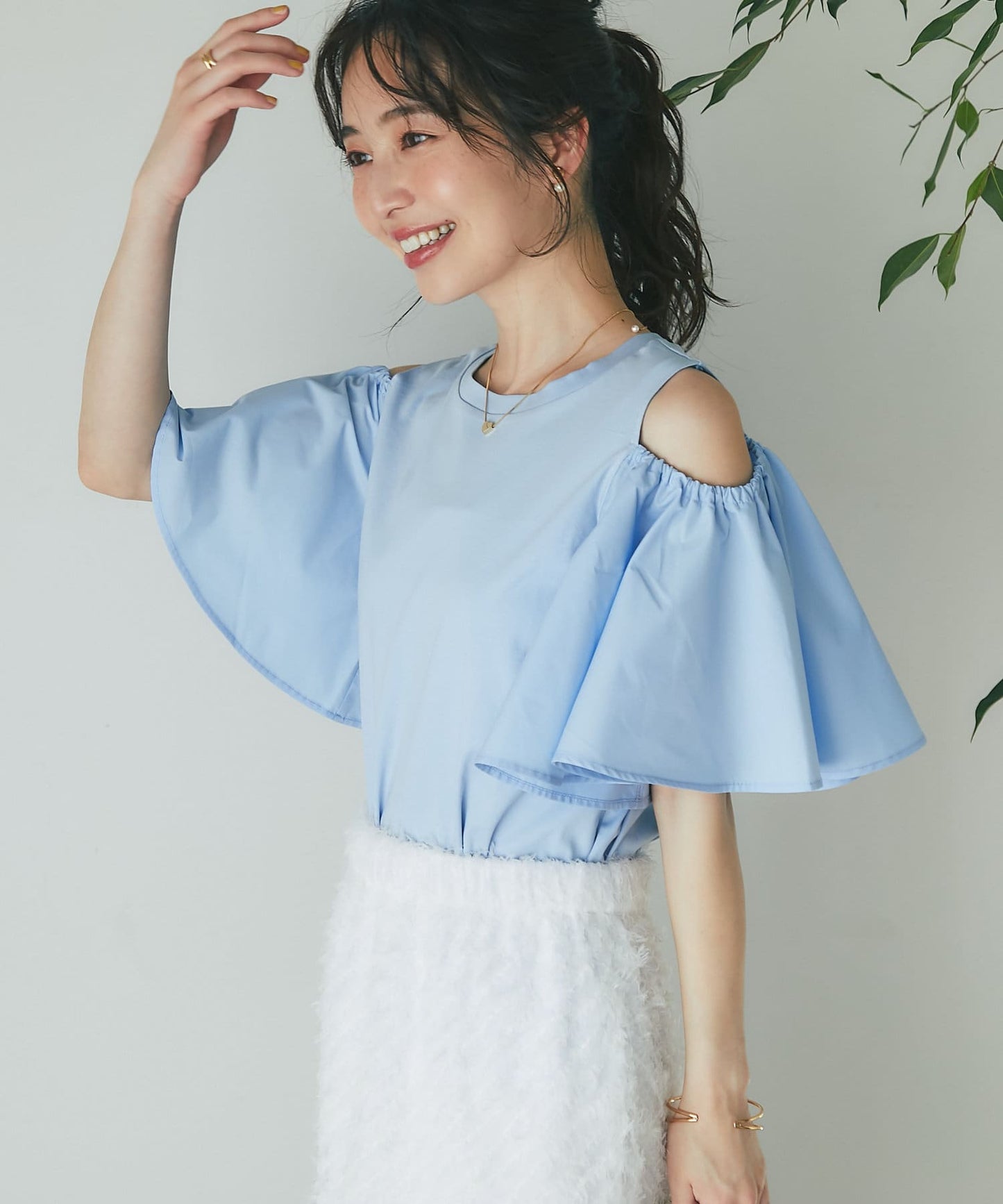 荷葉邊的體積和露肩的健康肌膚給人一種輕鬆的感覺。