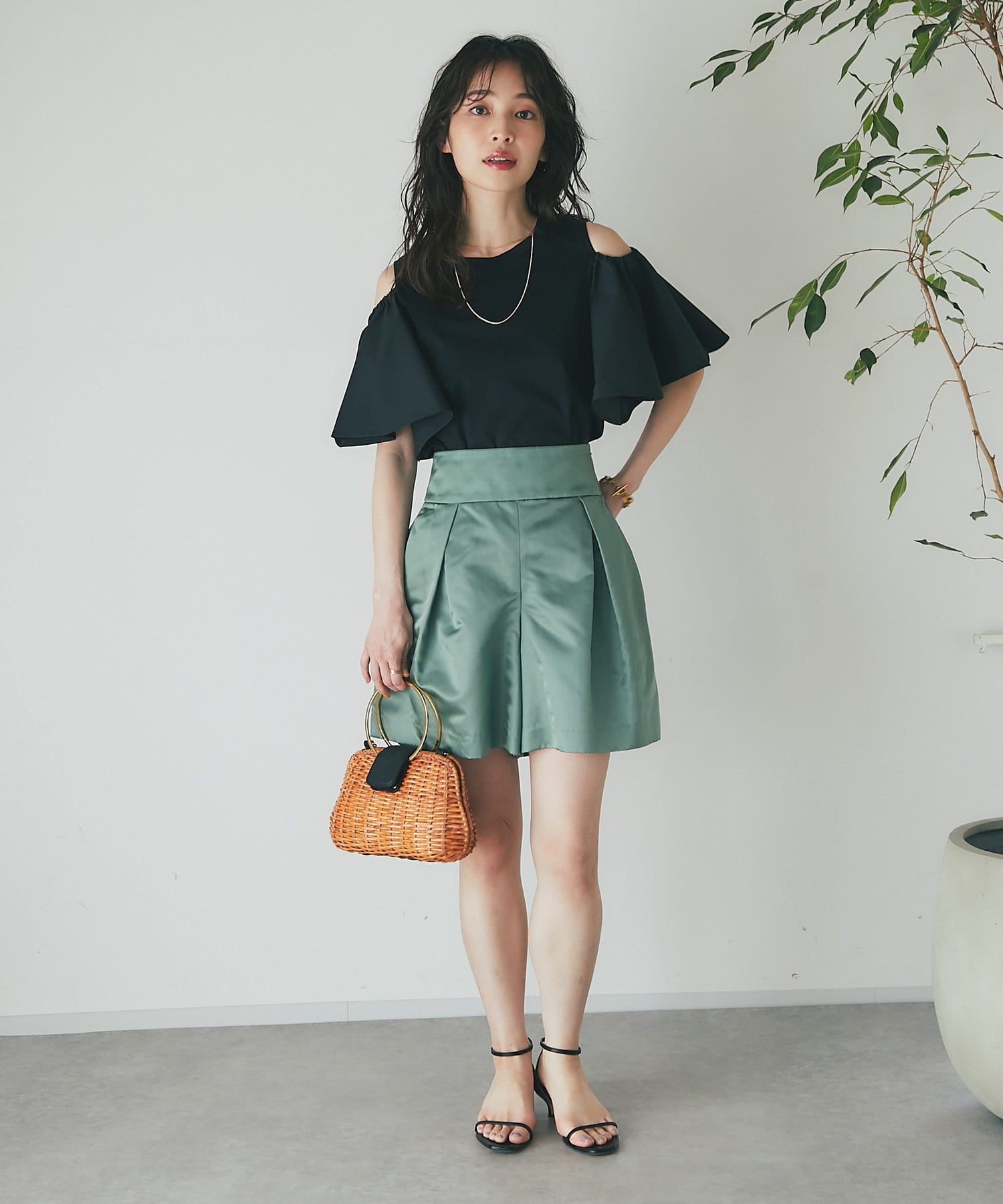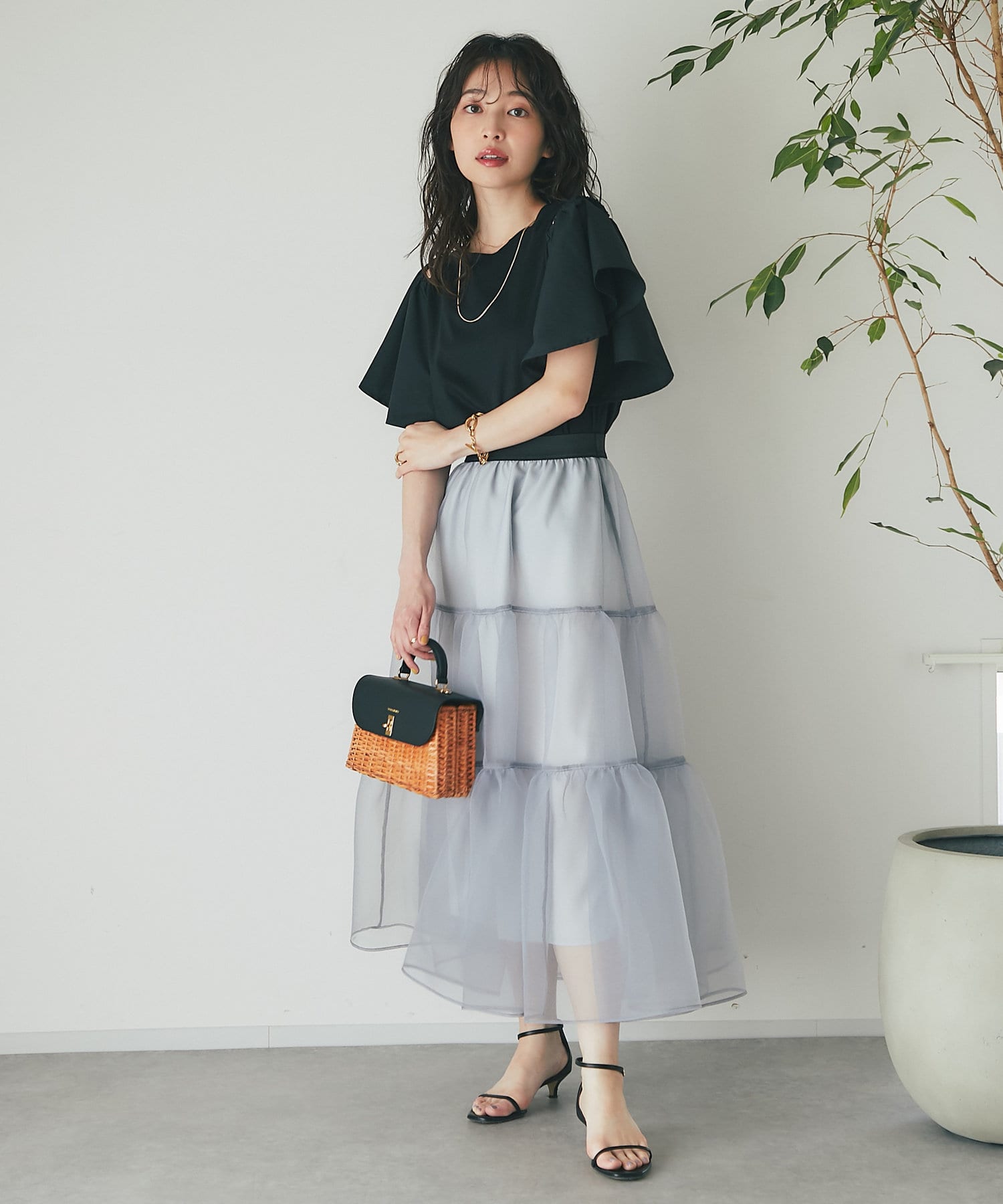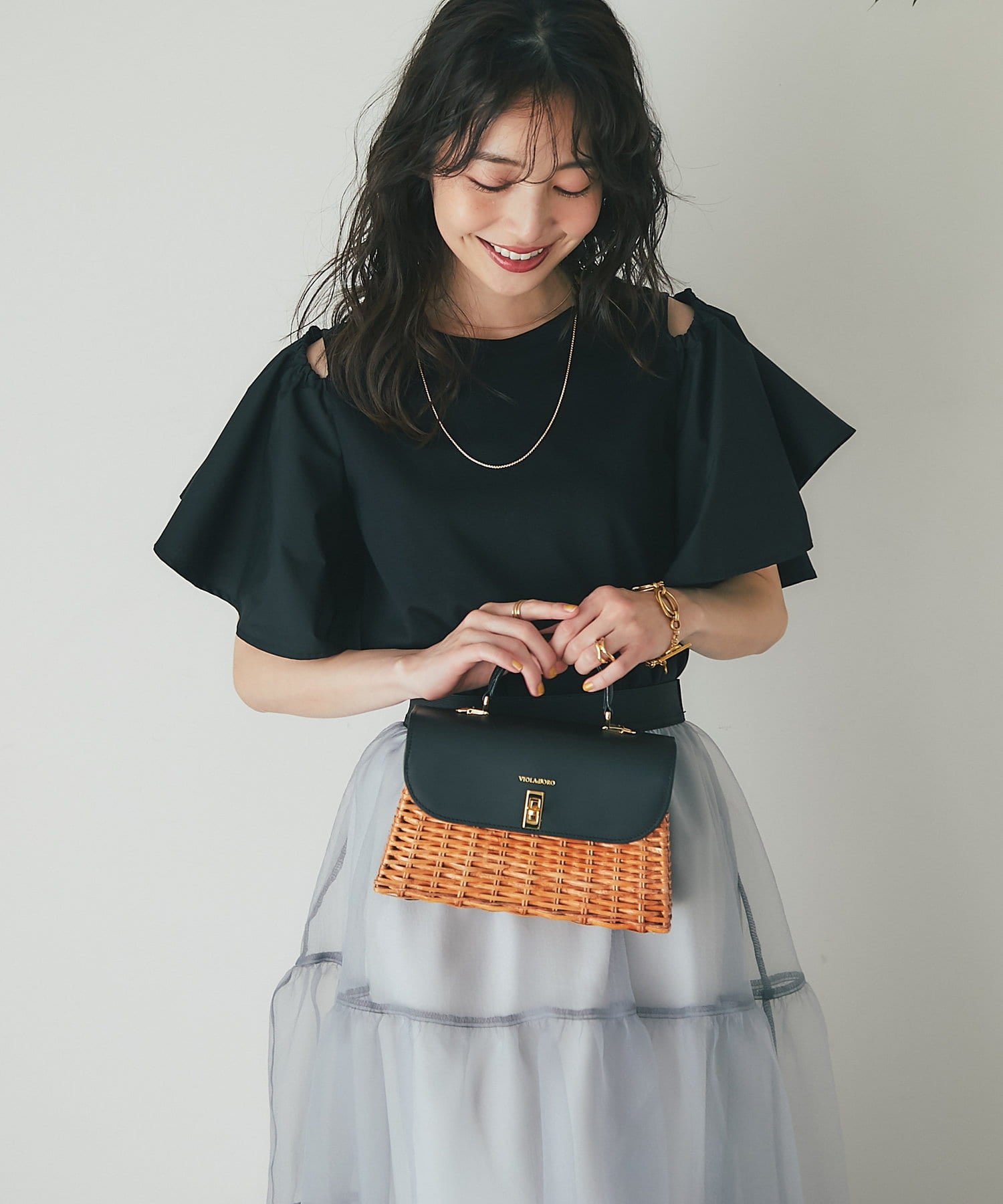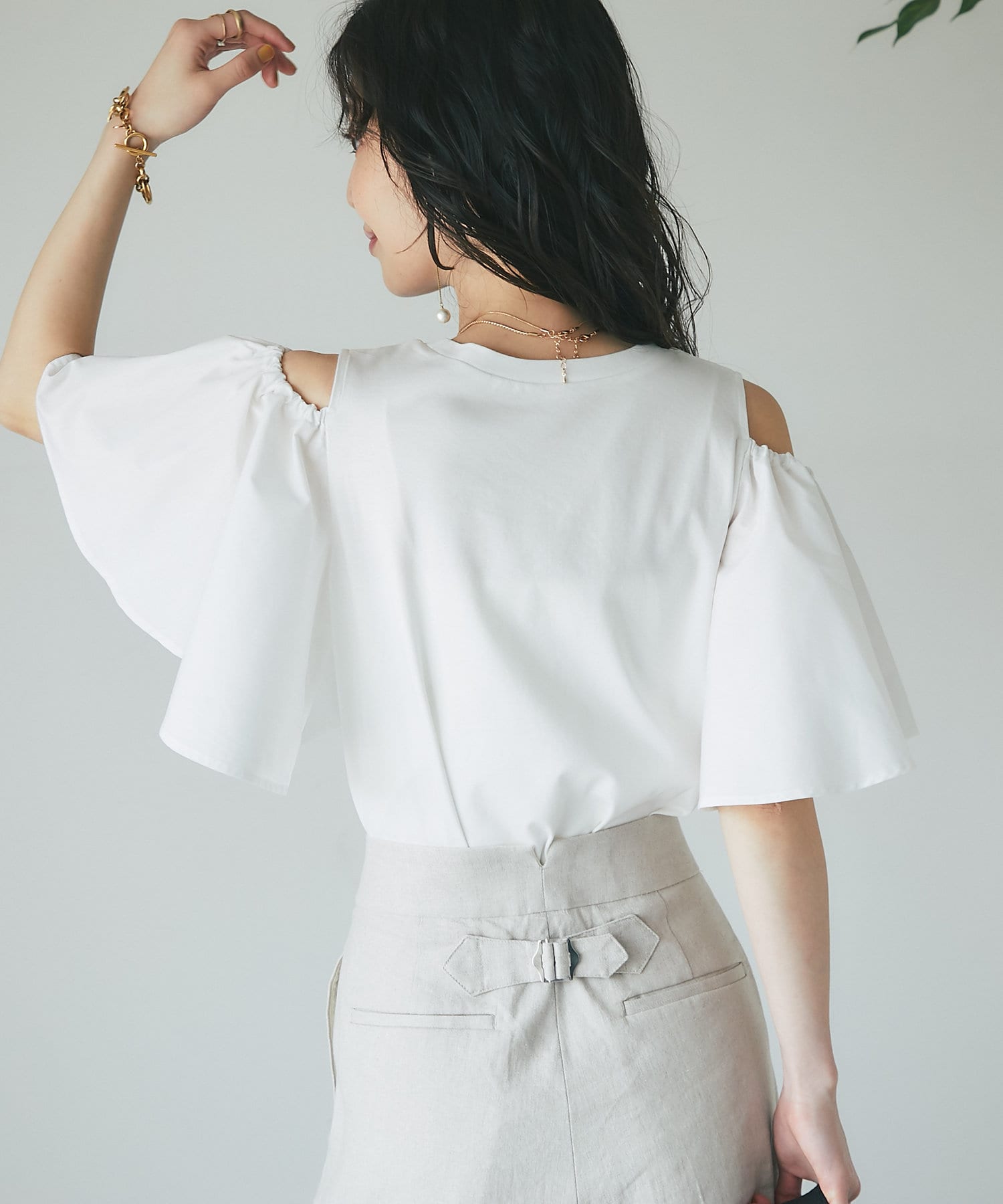 荷葉邊的體積和露肩的健康肌膚給人一種輕鬆的感覺。