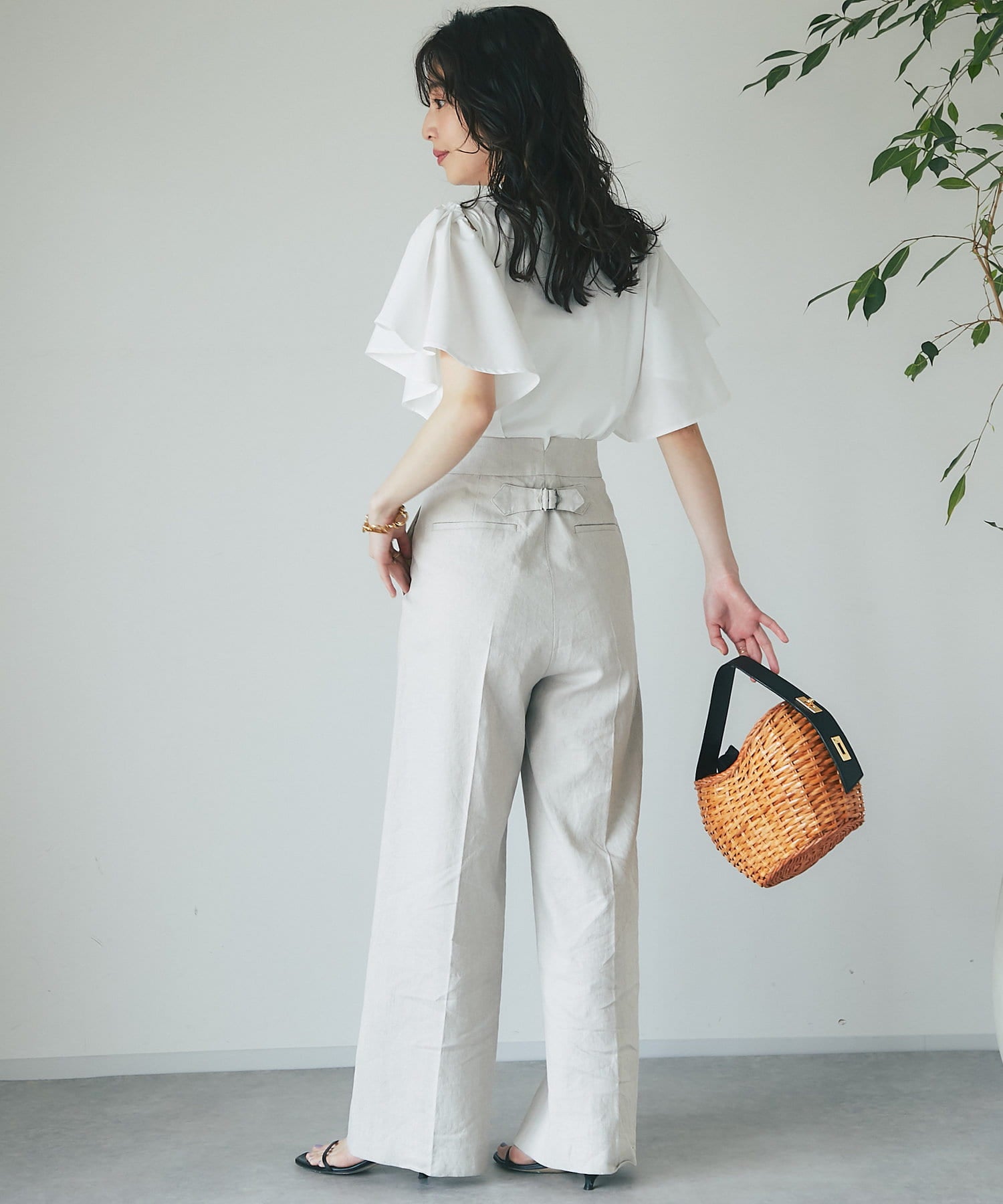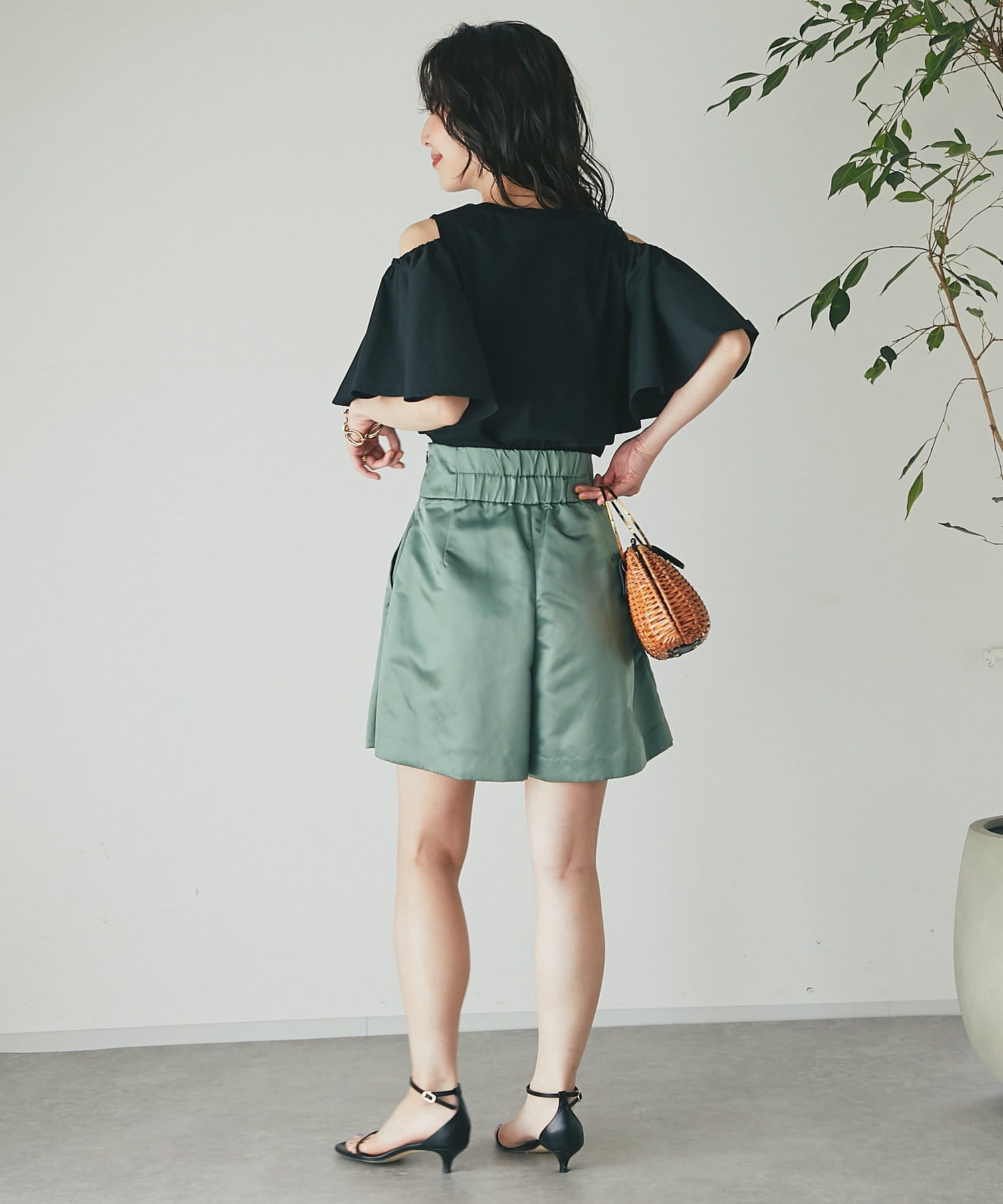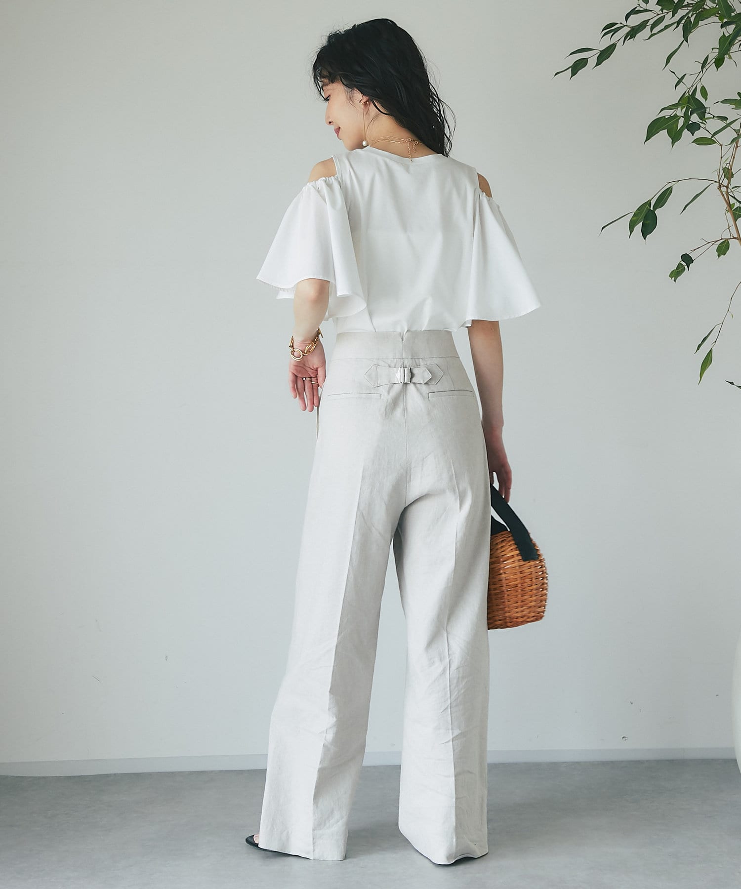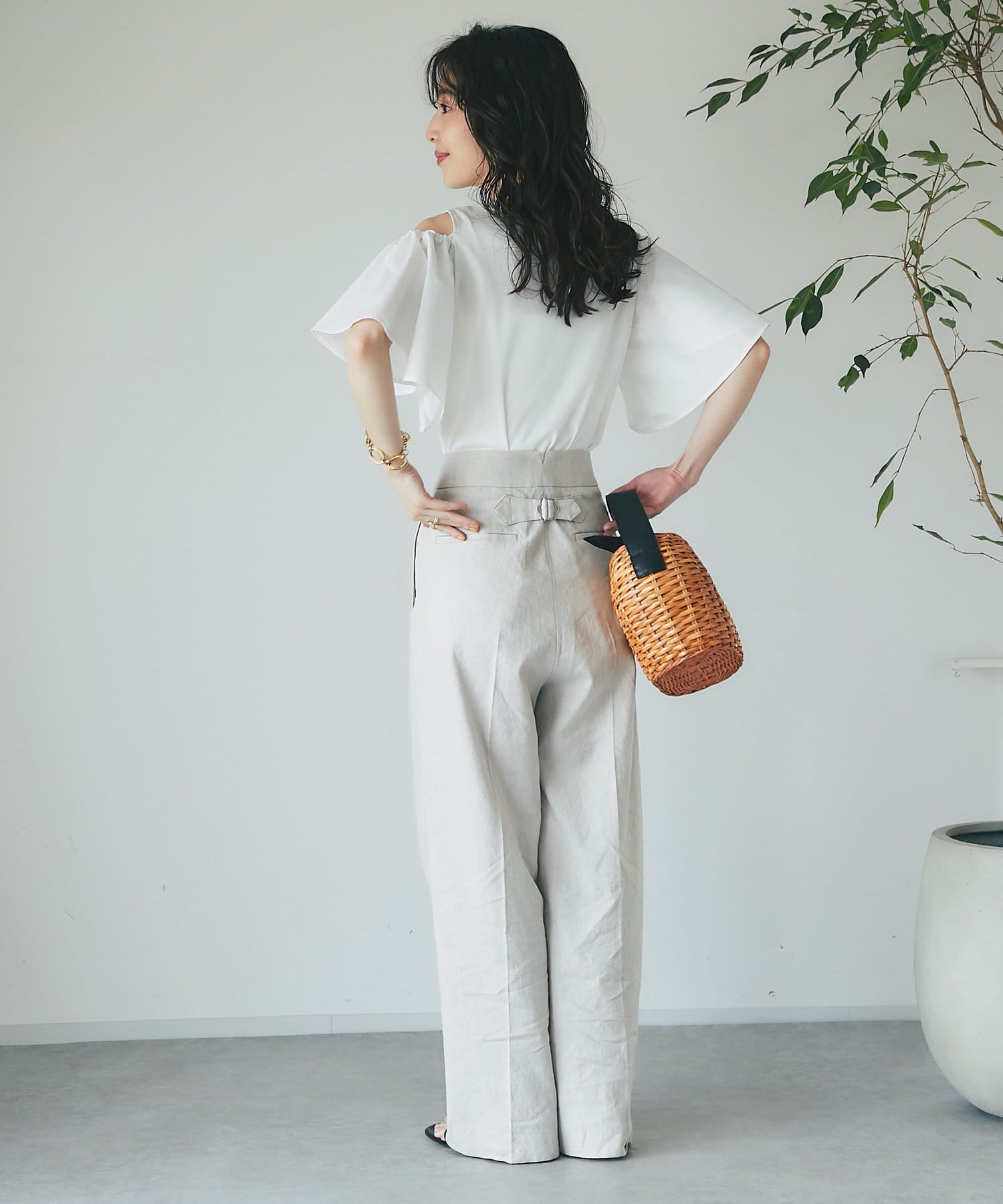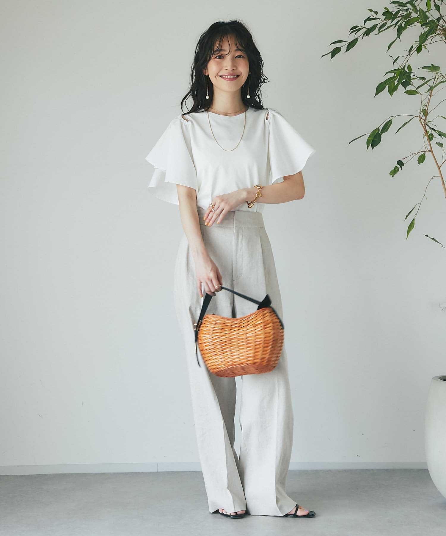 荷葉邊的體積和露肩的健康肌膚給人一種輕鬆的感覺。
