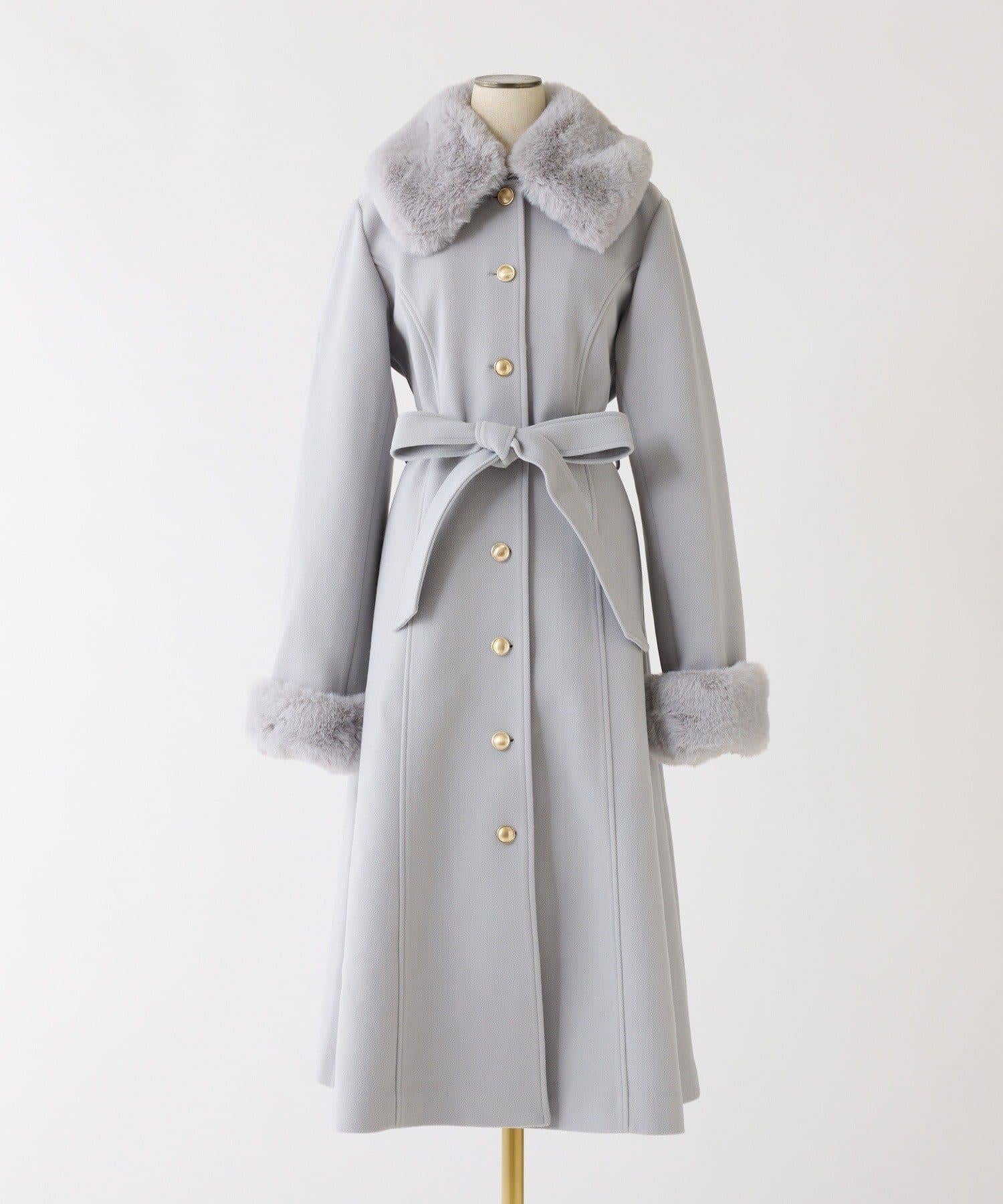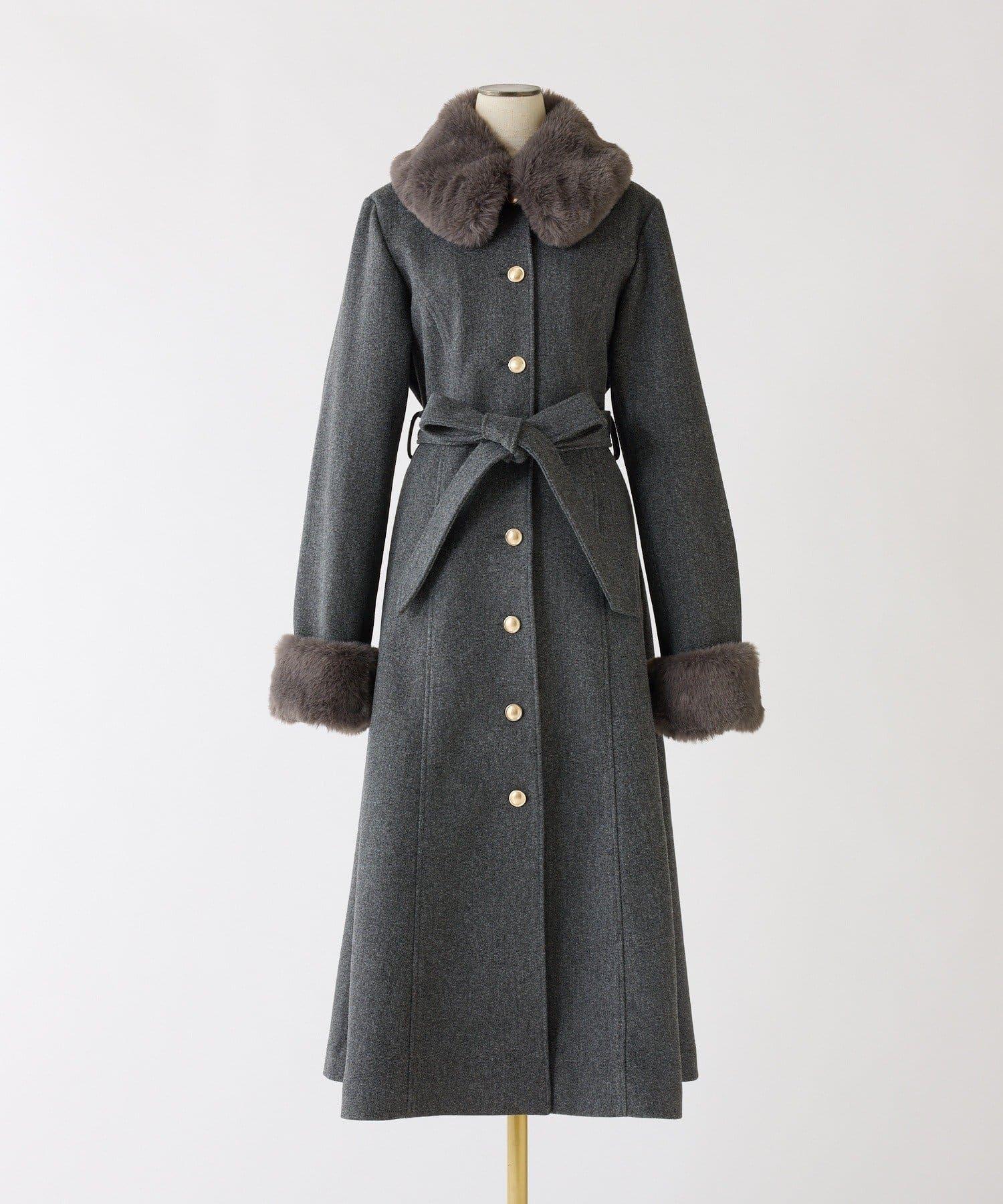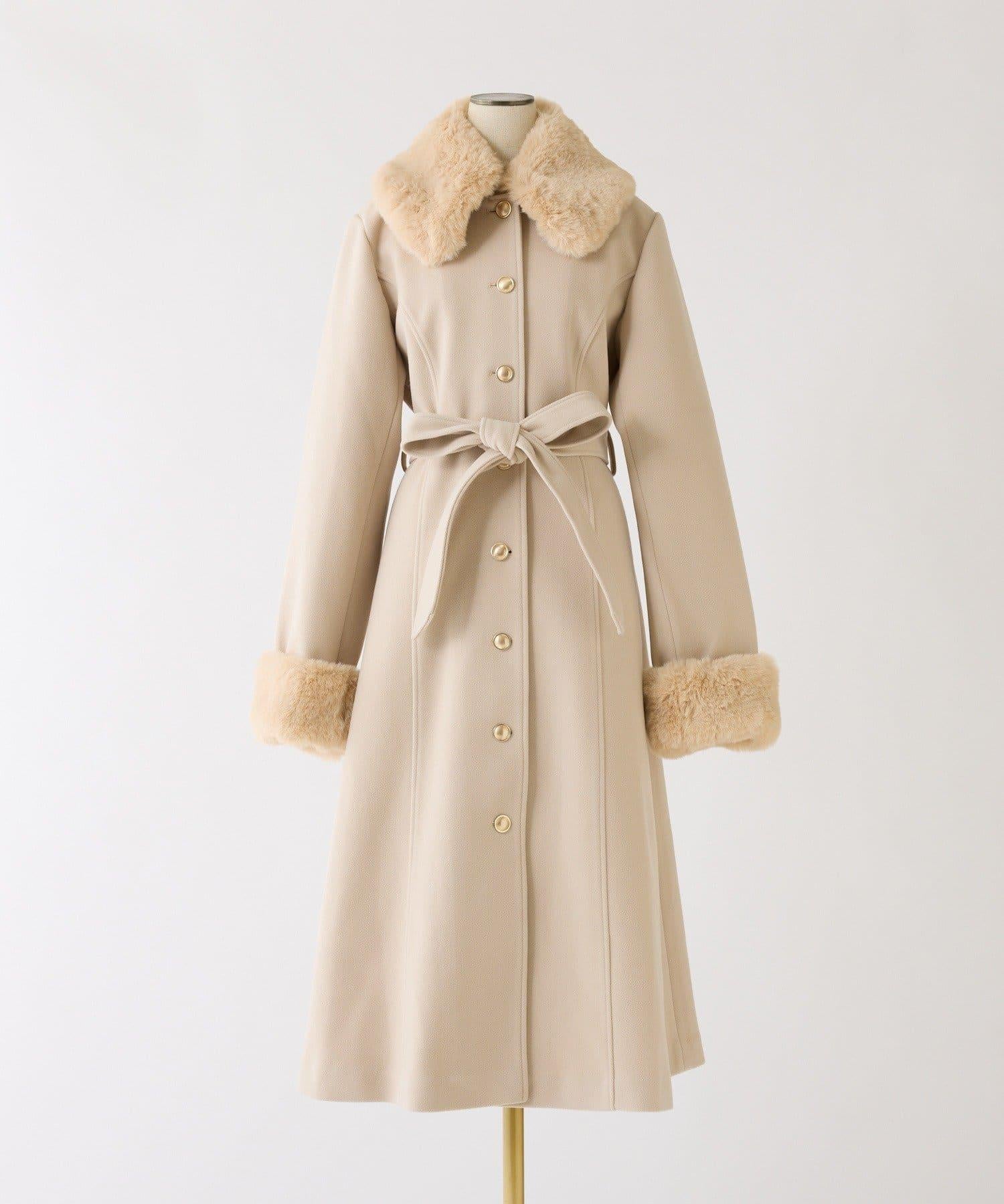 長款大衣採用女性化的 A 字輪廓,衣領和衣袖採用人造皮草。
