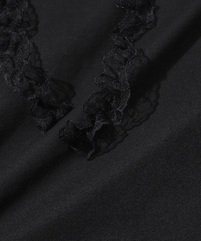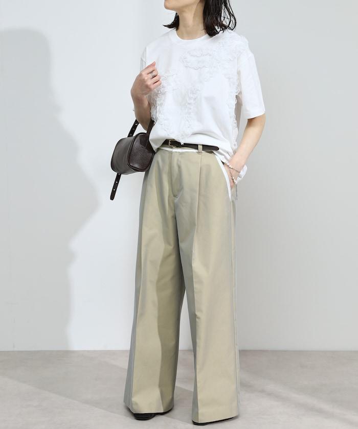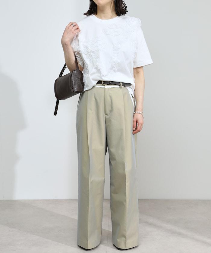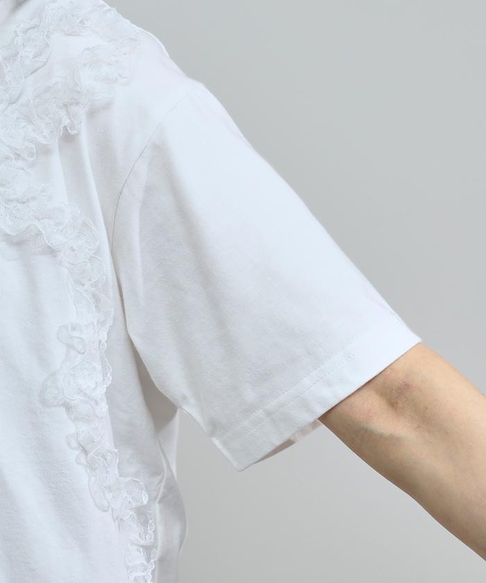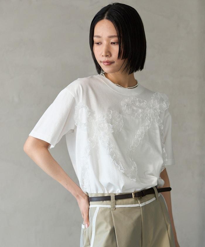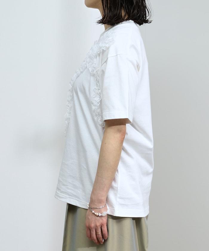 有機棉蕾絲領帶T恤/圓領前設計短袖T恤