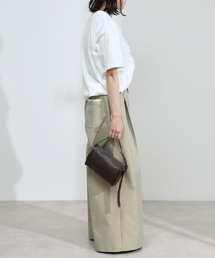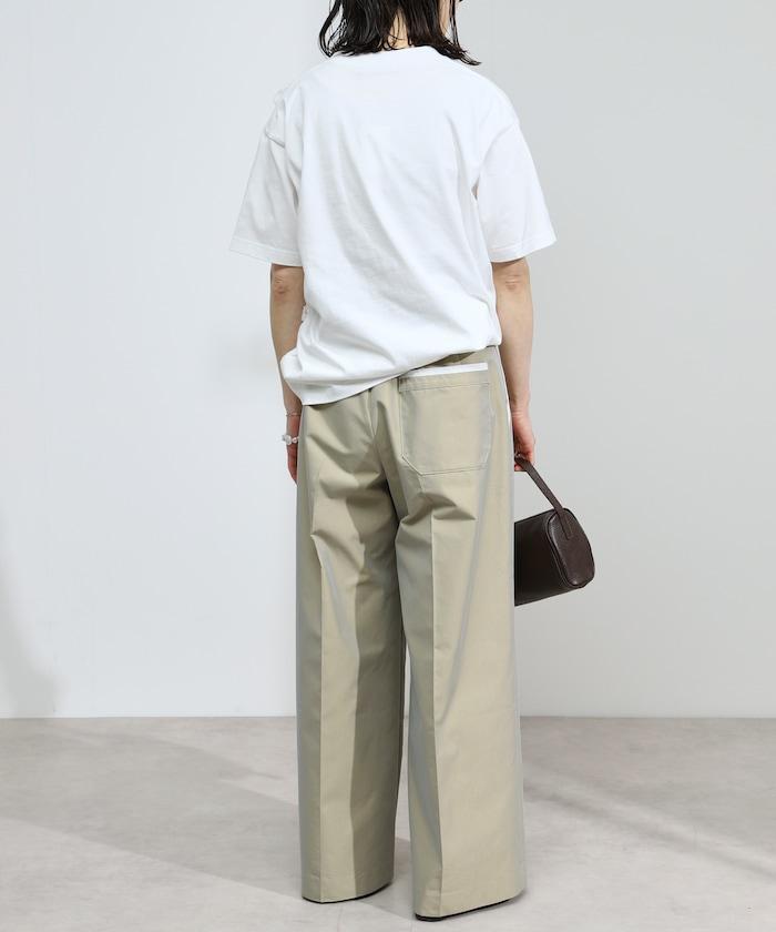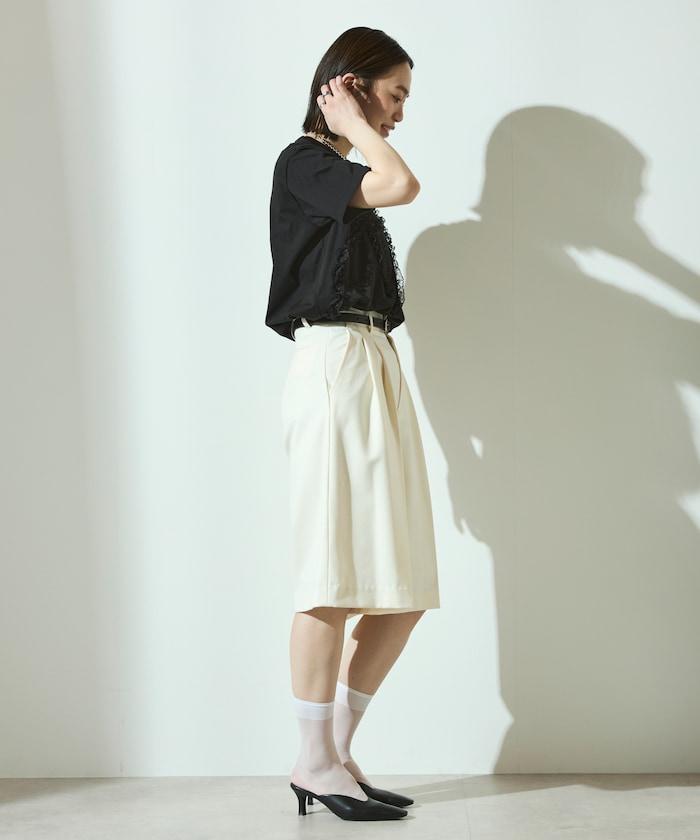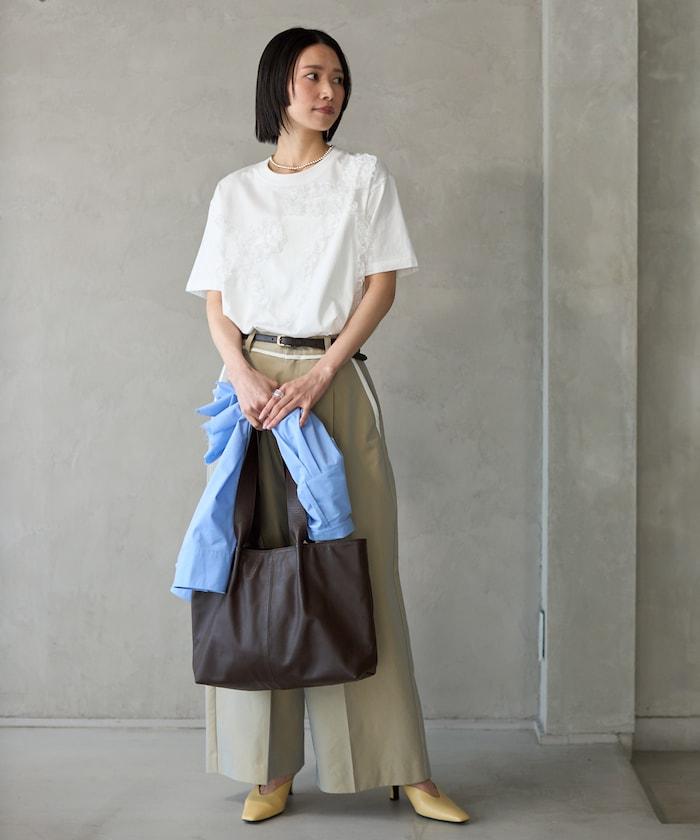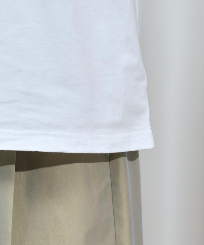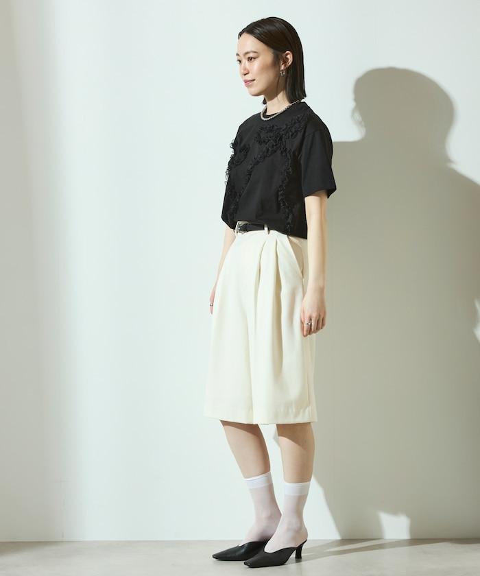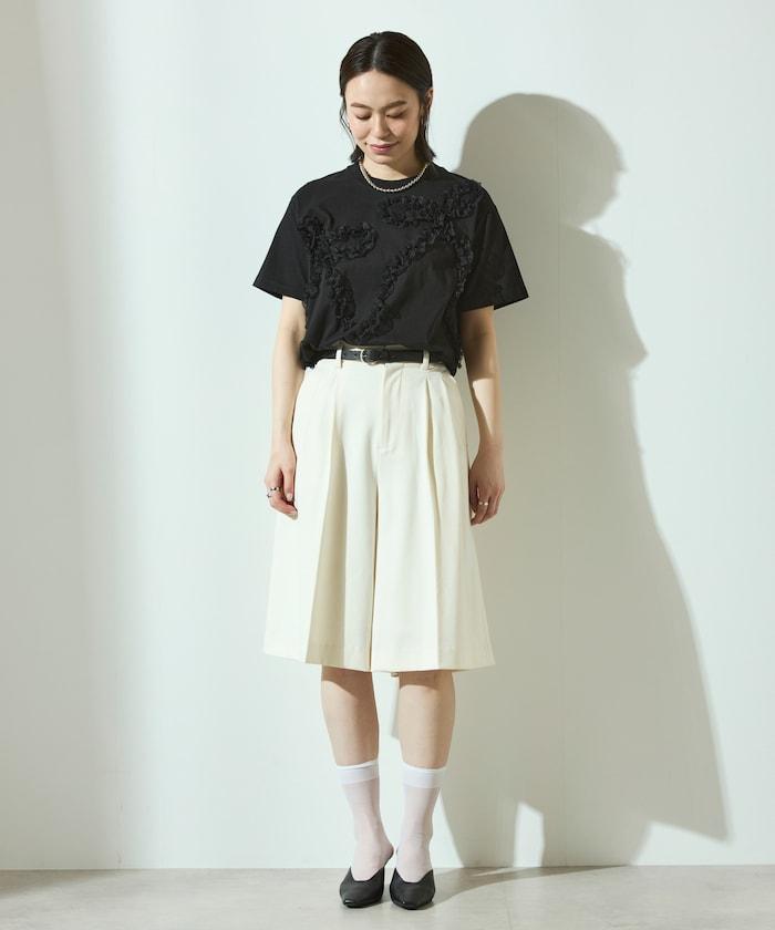 有機棉蕾絲領帶T恤/圓領前設計短袖T恤