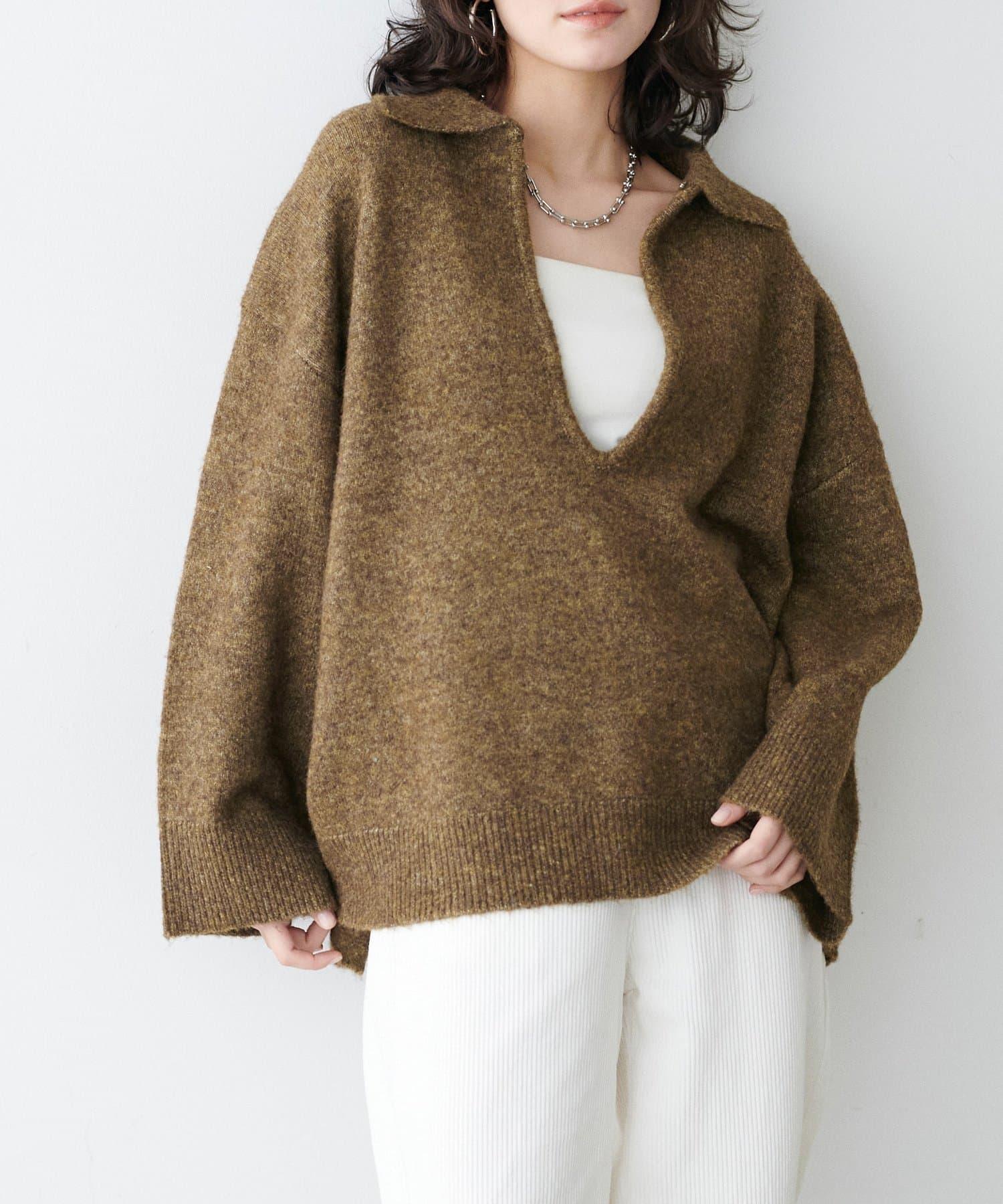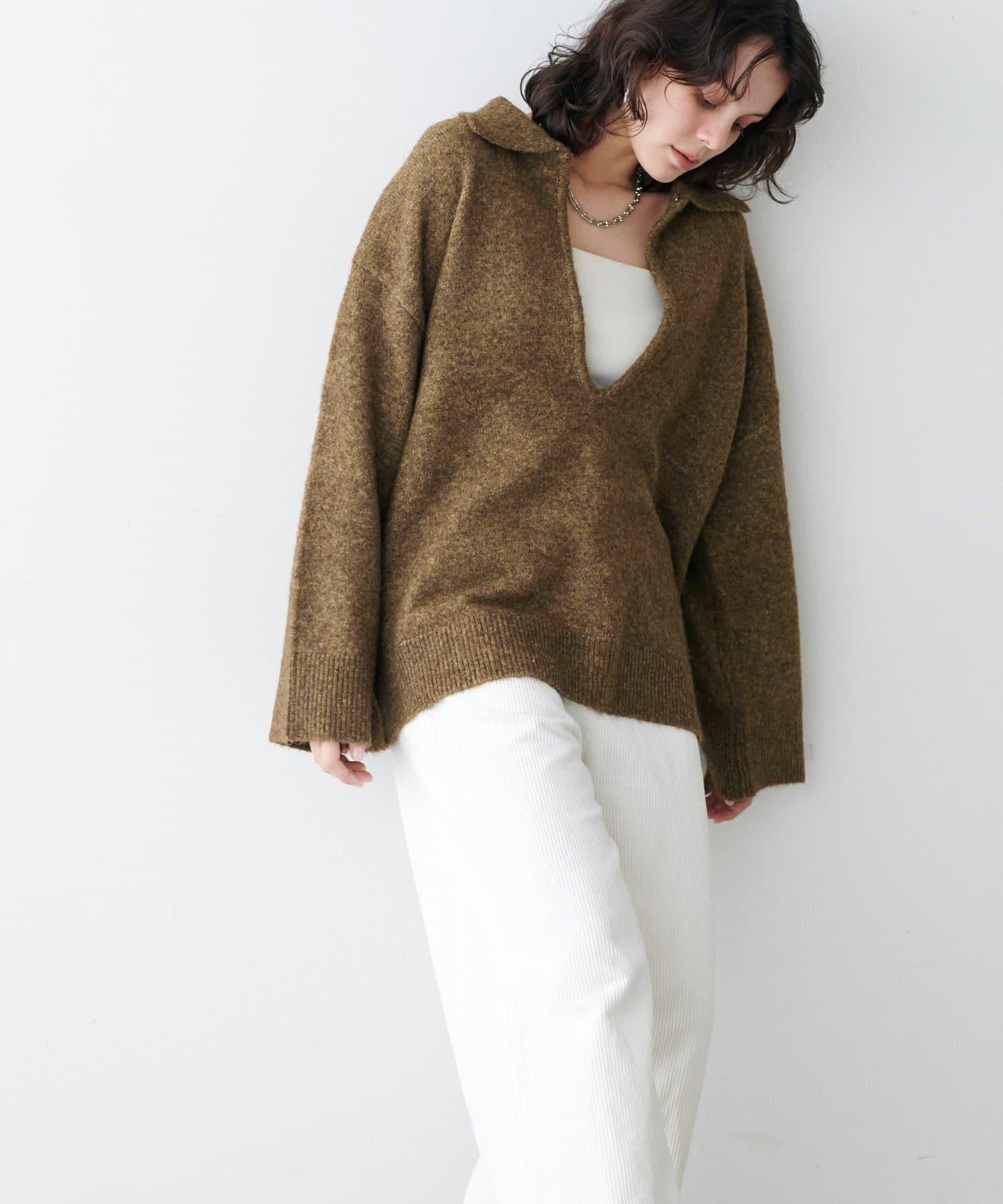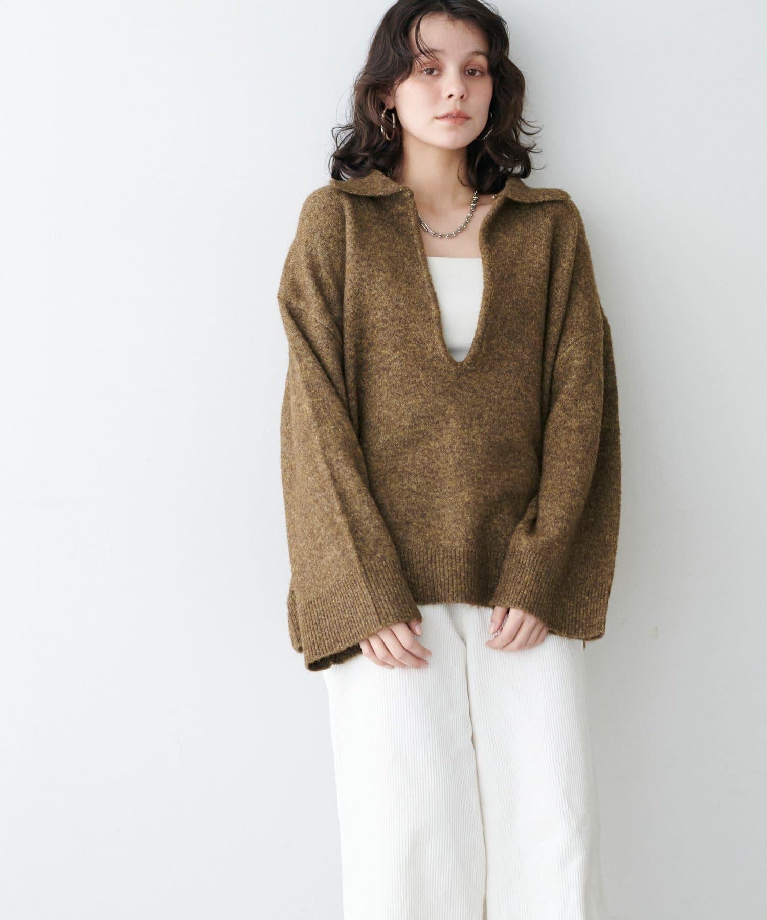 領口設計的針織套頭衫,採用木質色調,給人留下深刻印象。