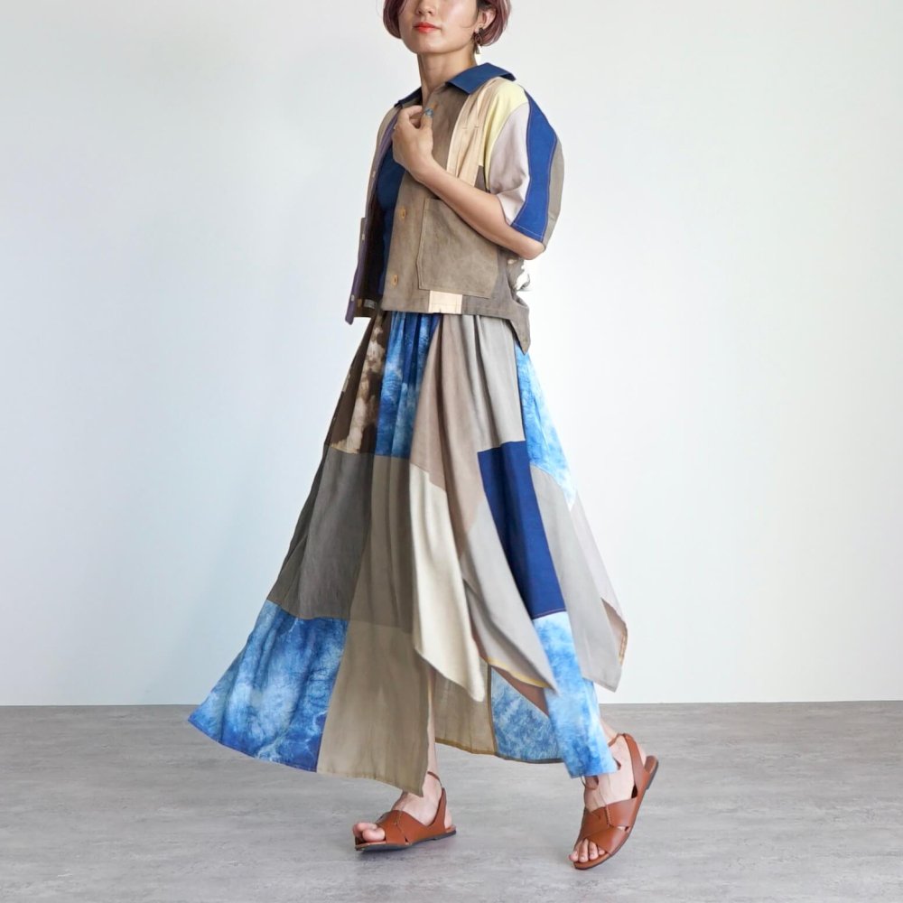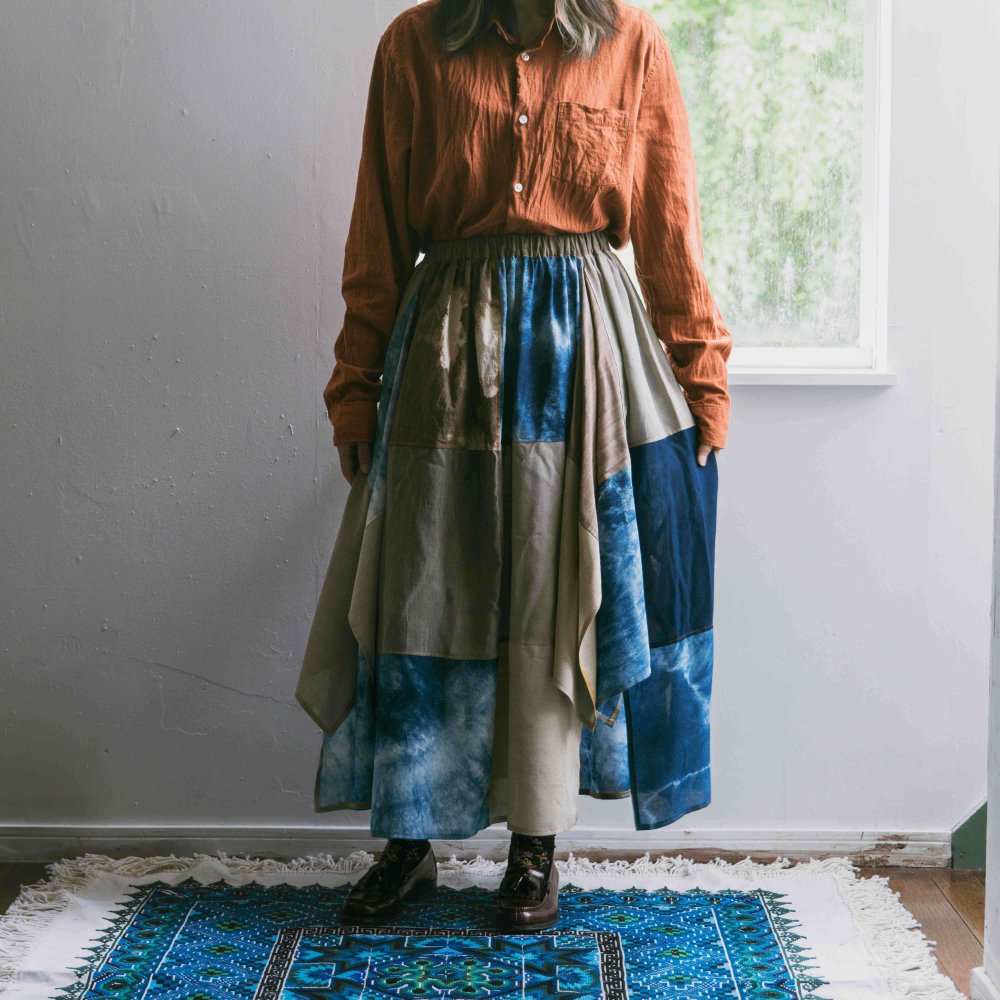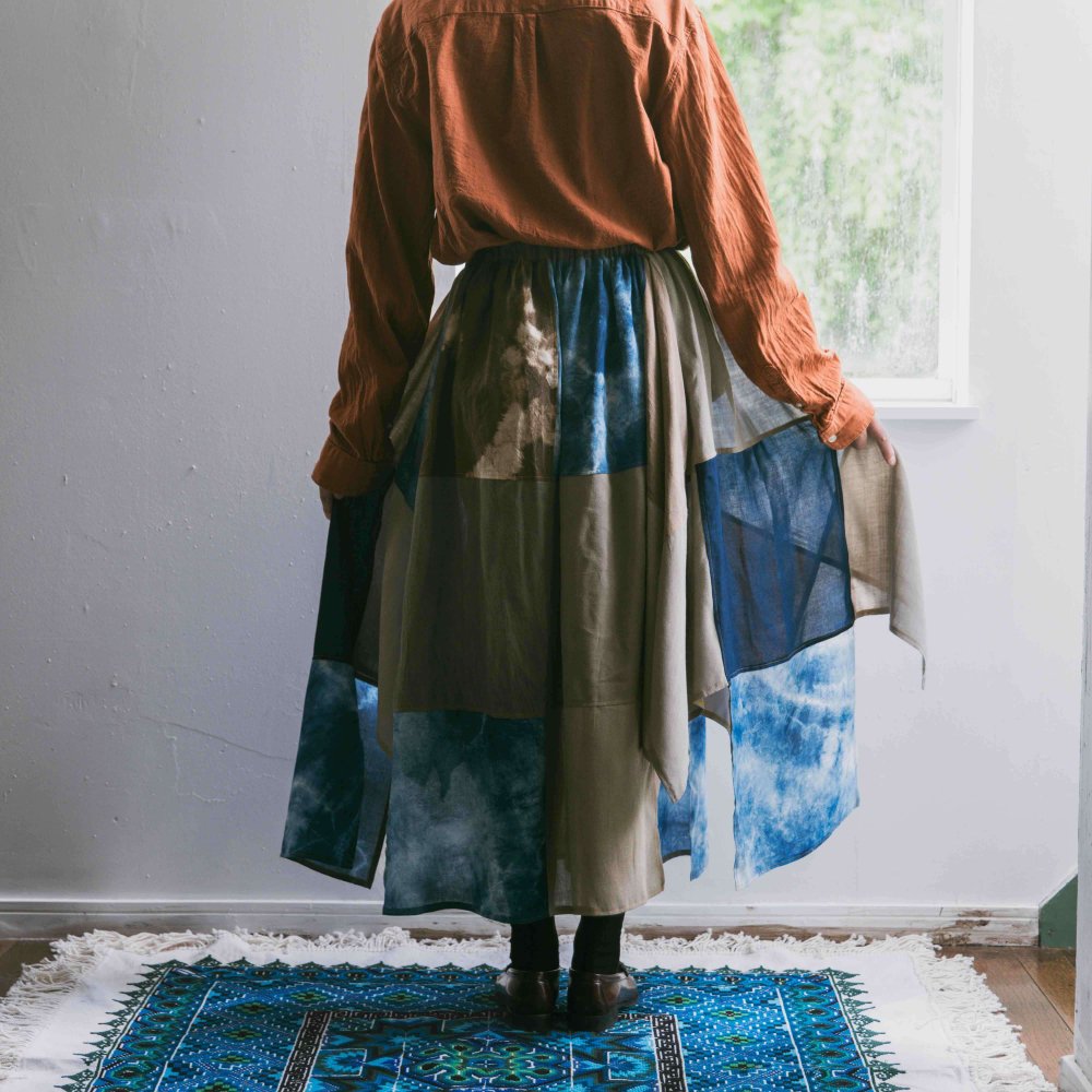 我用天然染料柿單寧、草染料和靛藍染料染色,製作了一條方形哈吉爾拼接裙。^^^這條裙子的輪廓不對稱。這款裙子的輪廓不對稱,具有出色的存在感!