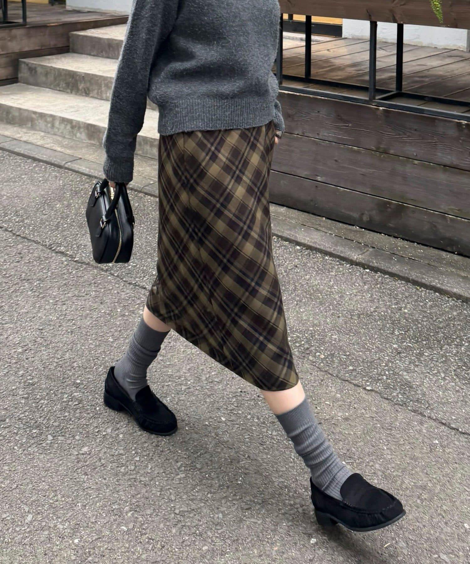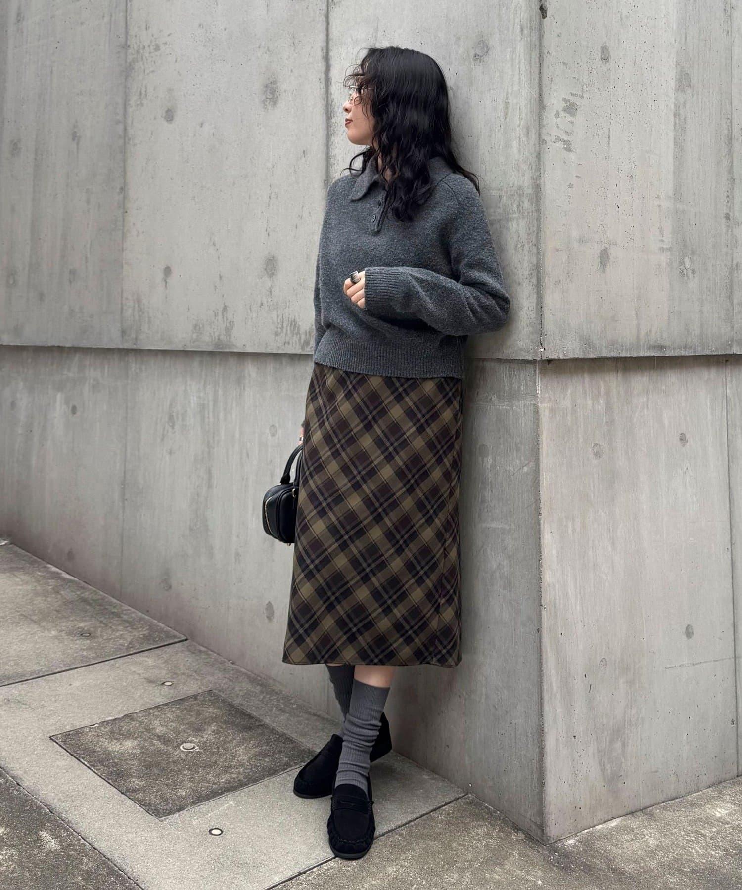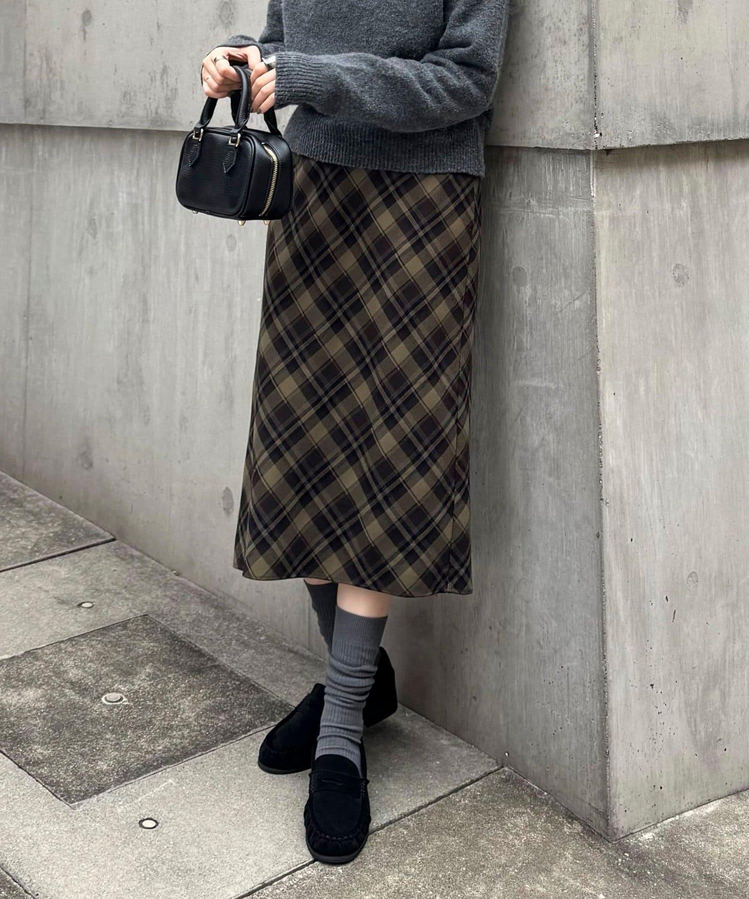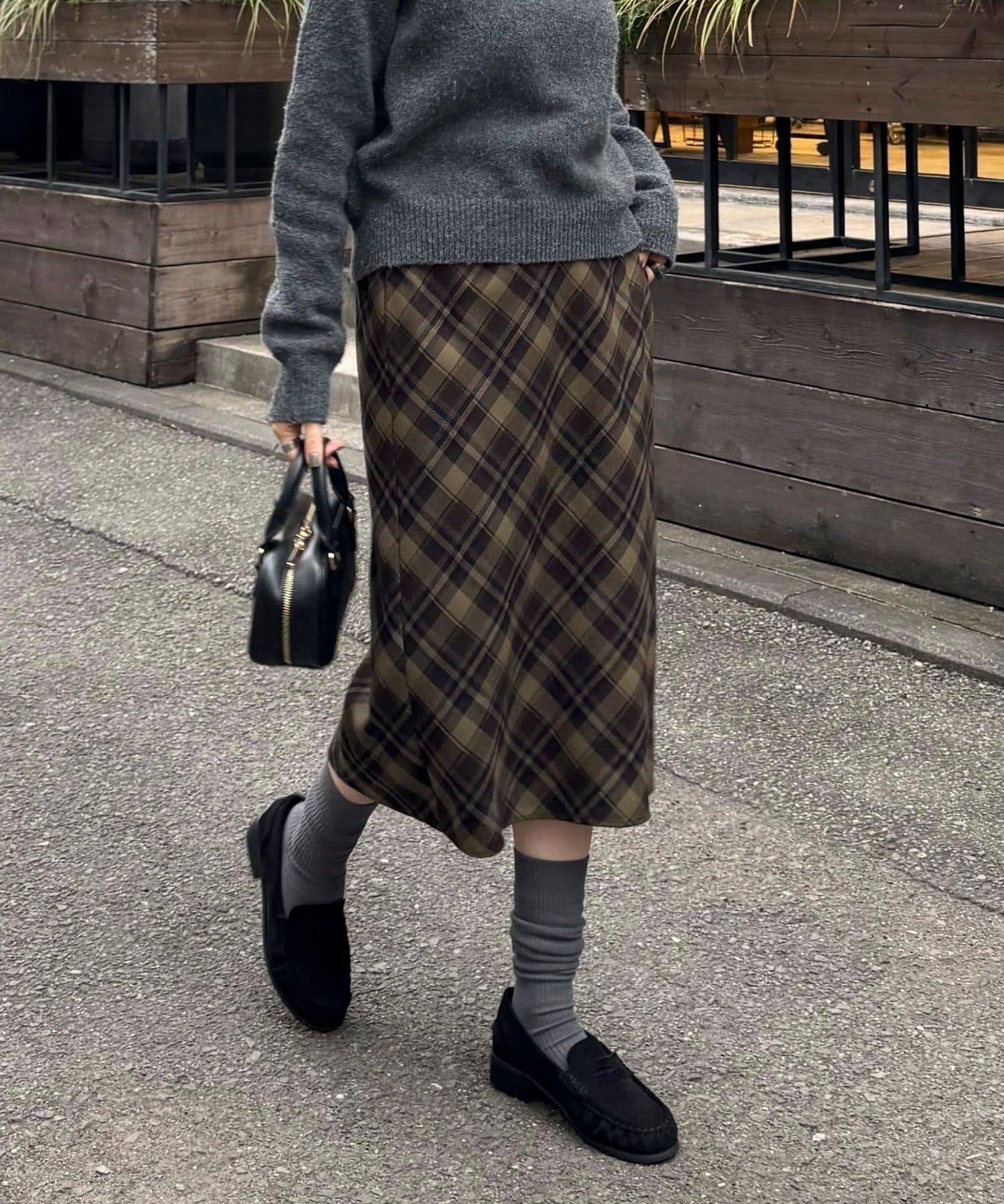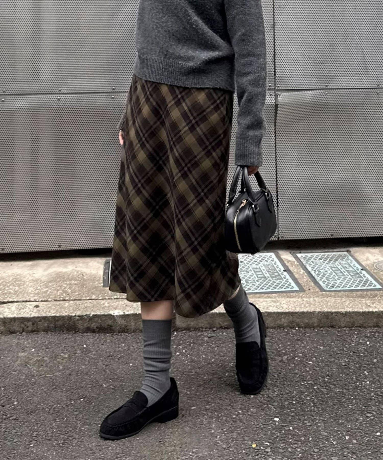 傳統格紋圖案的中長款半身裙,優雅而富有季節感。