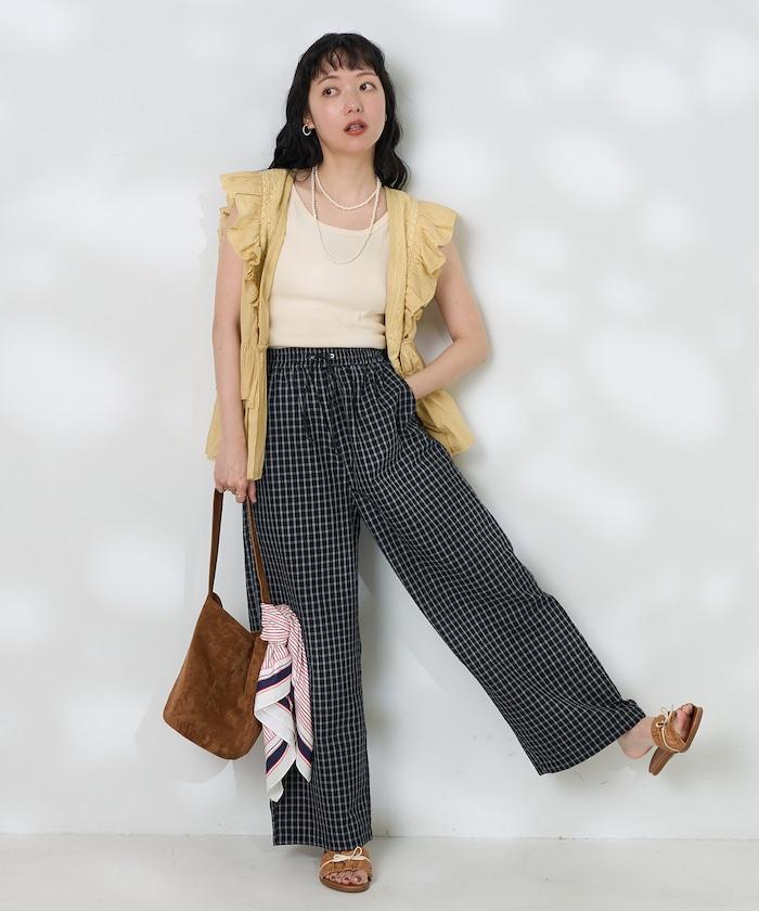 這款春夏格紋長褲可隨意搭配 T 恤,也可搭配各種上衣,如素色襯衫和襯衣。