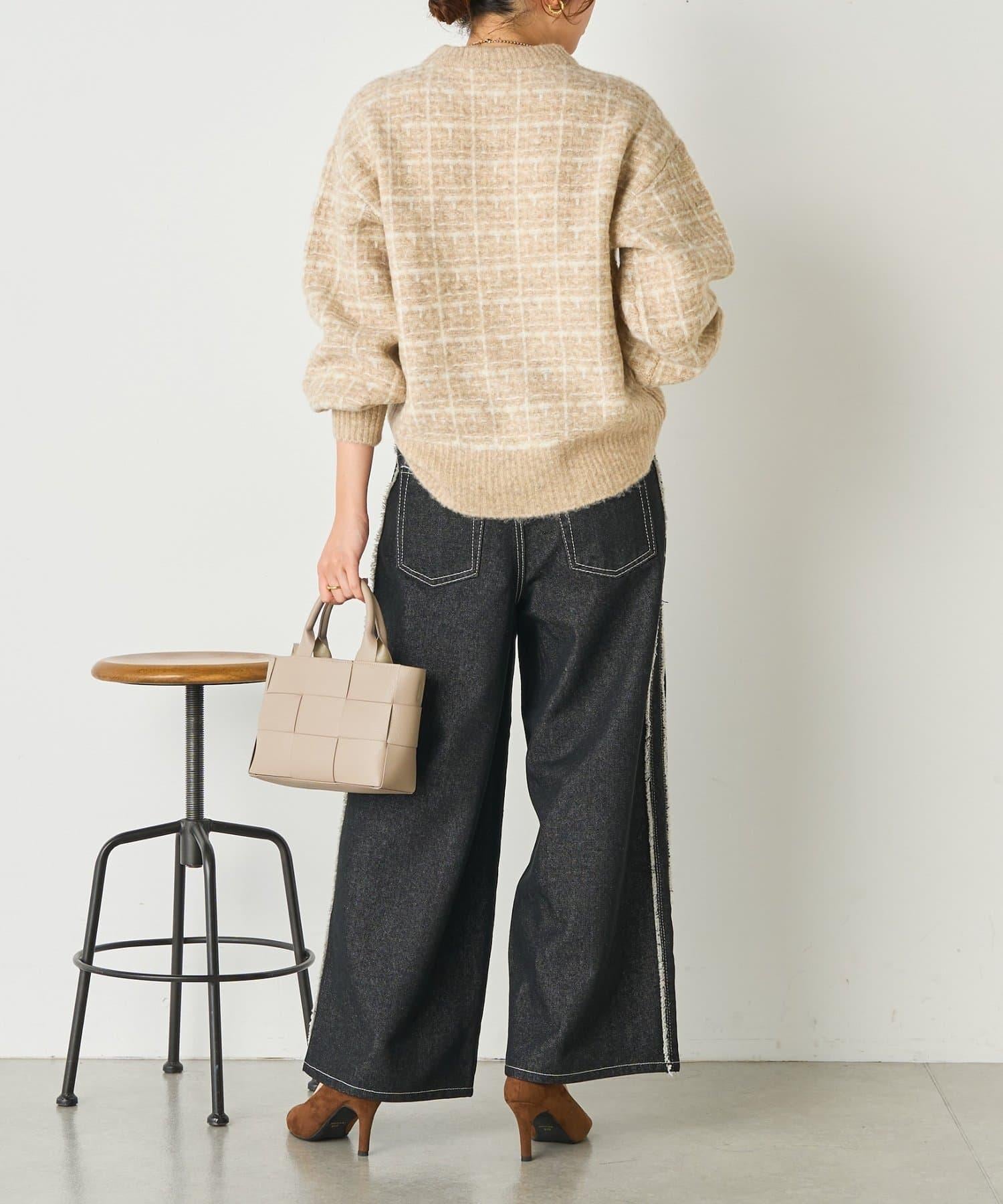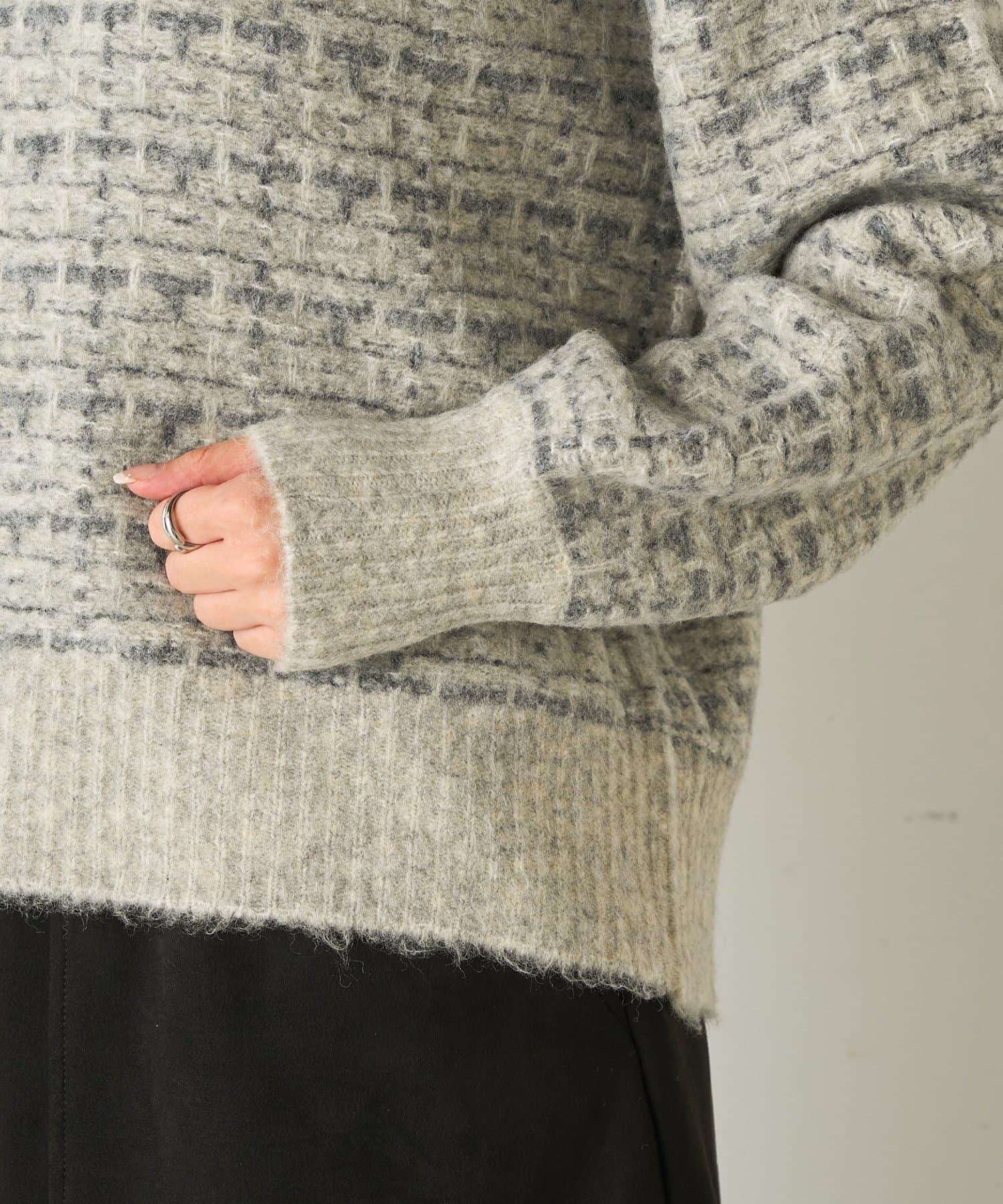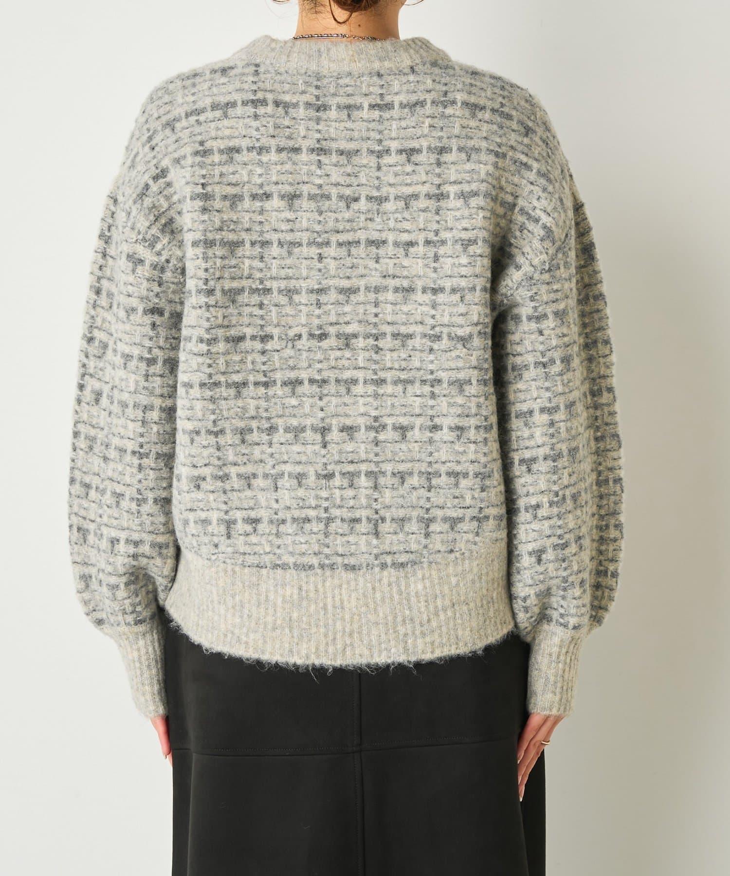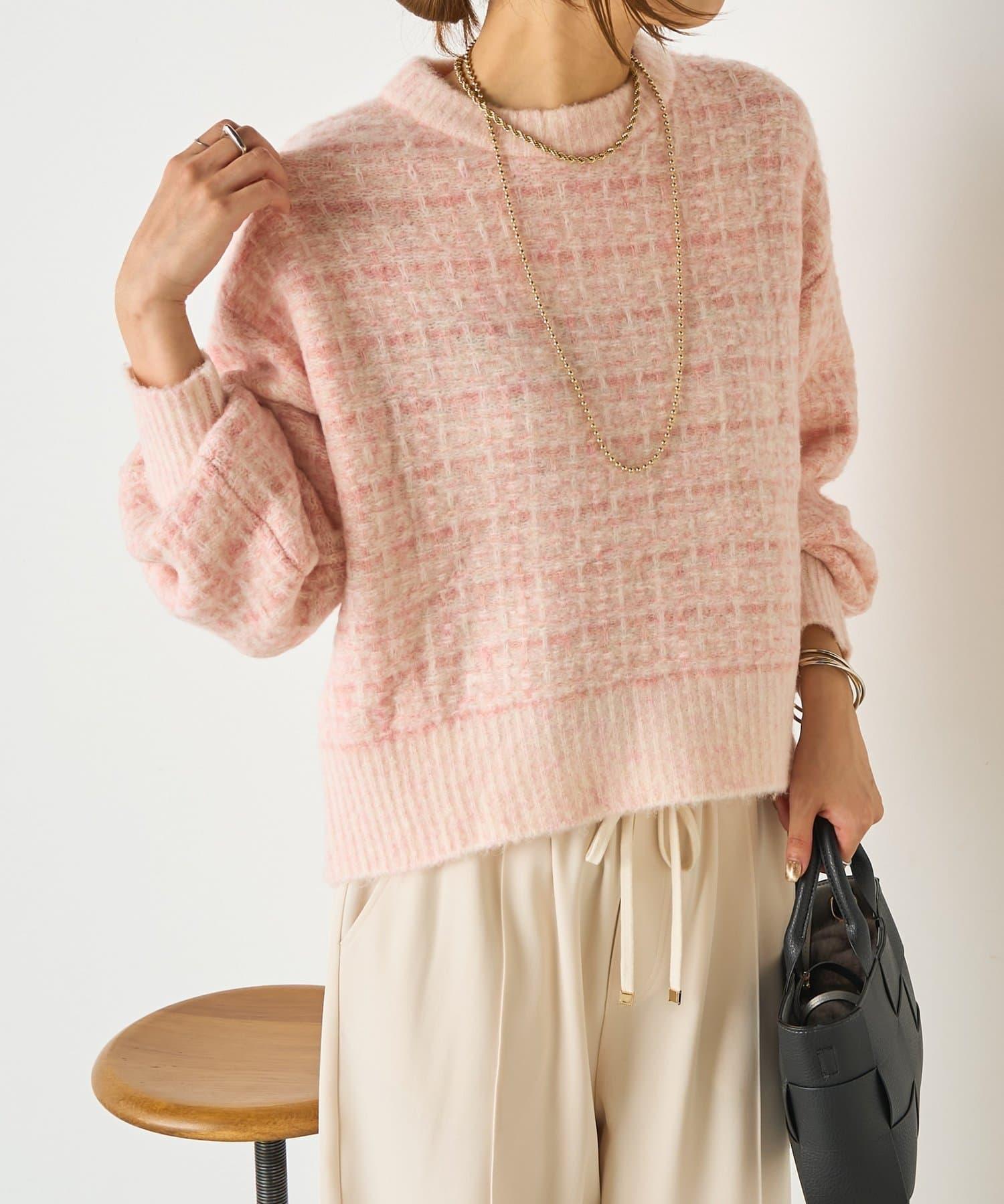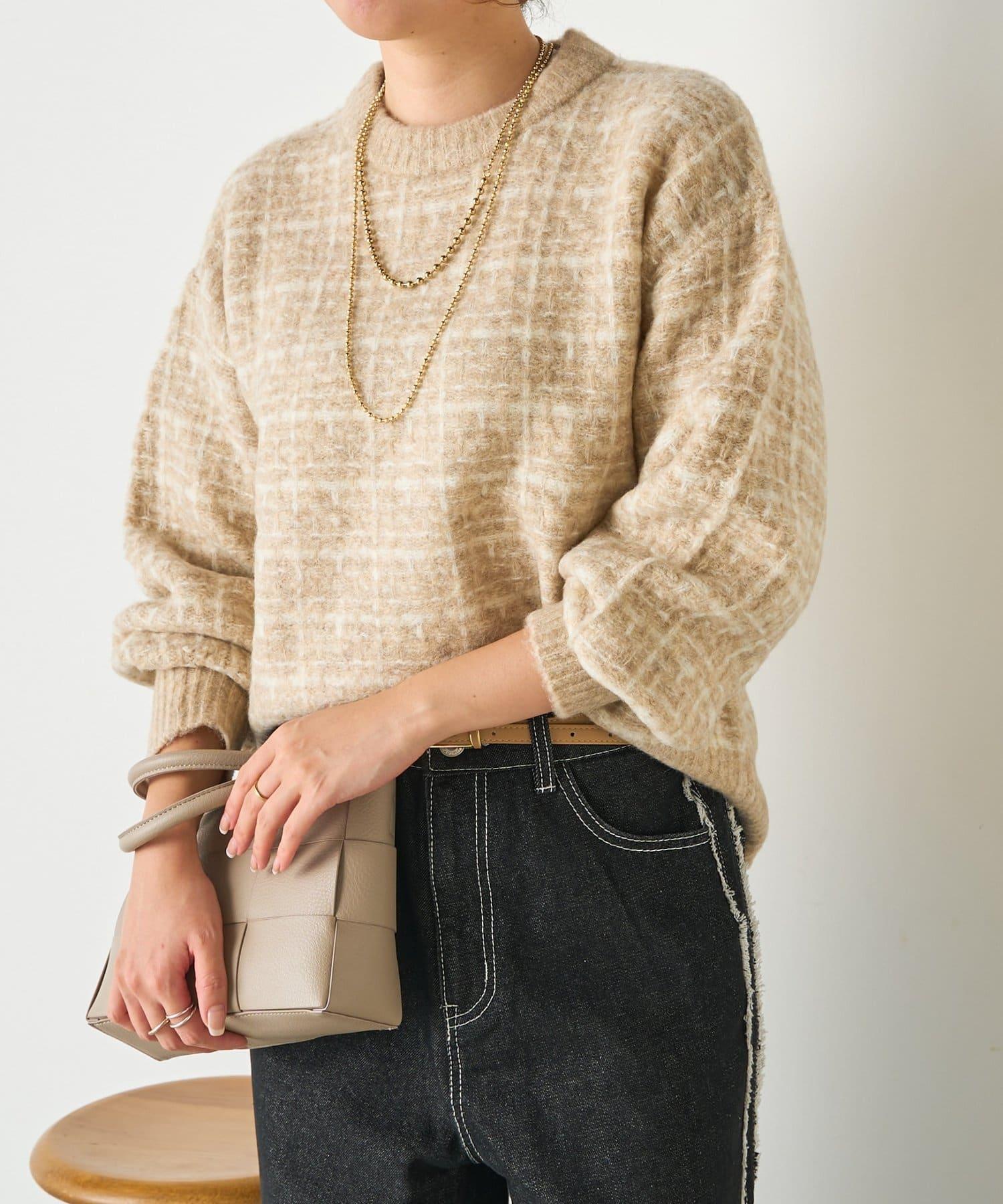 質地不均勻的針織面料非常搶眼,格子圓領針織面料。