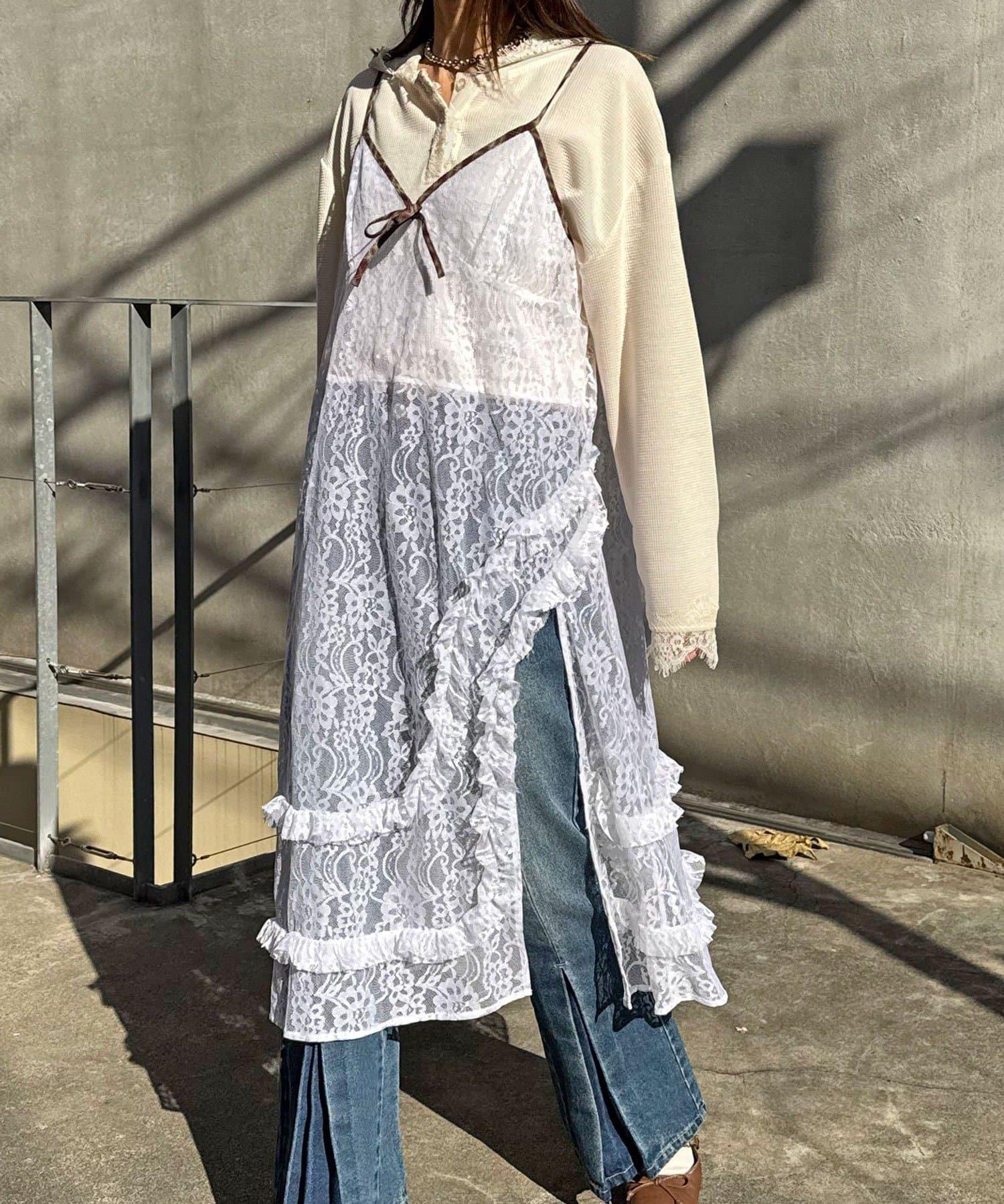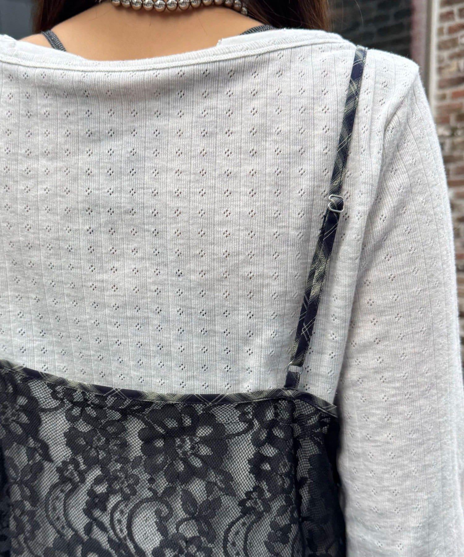 這款吊帶連衣裙採用精緻的蕾絲面料,配以棋盤格滾邊。