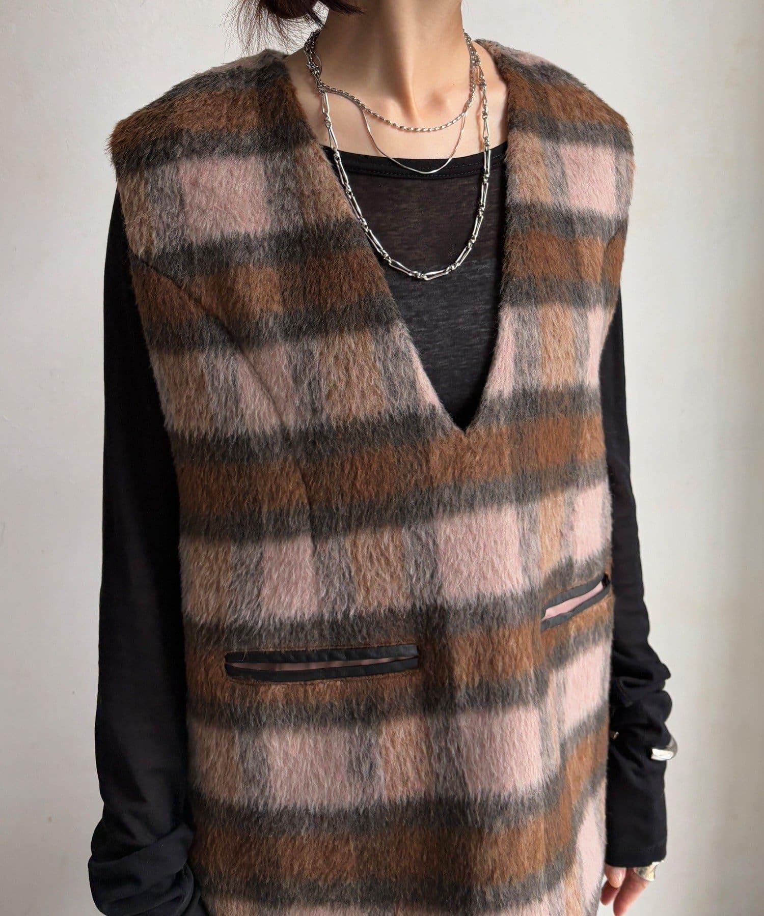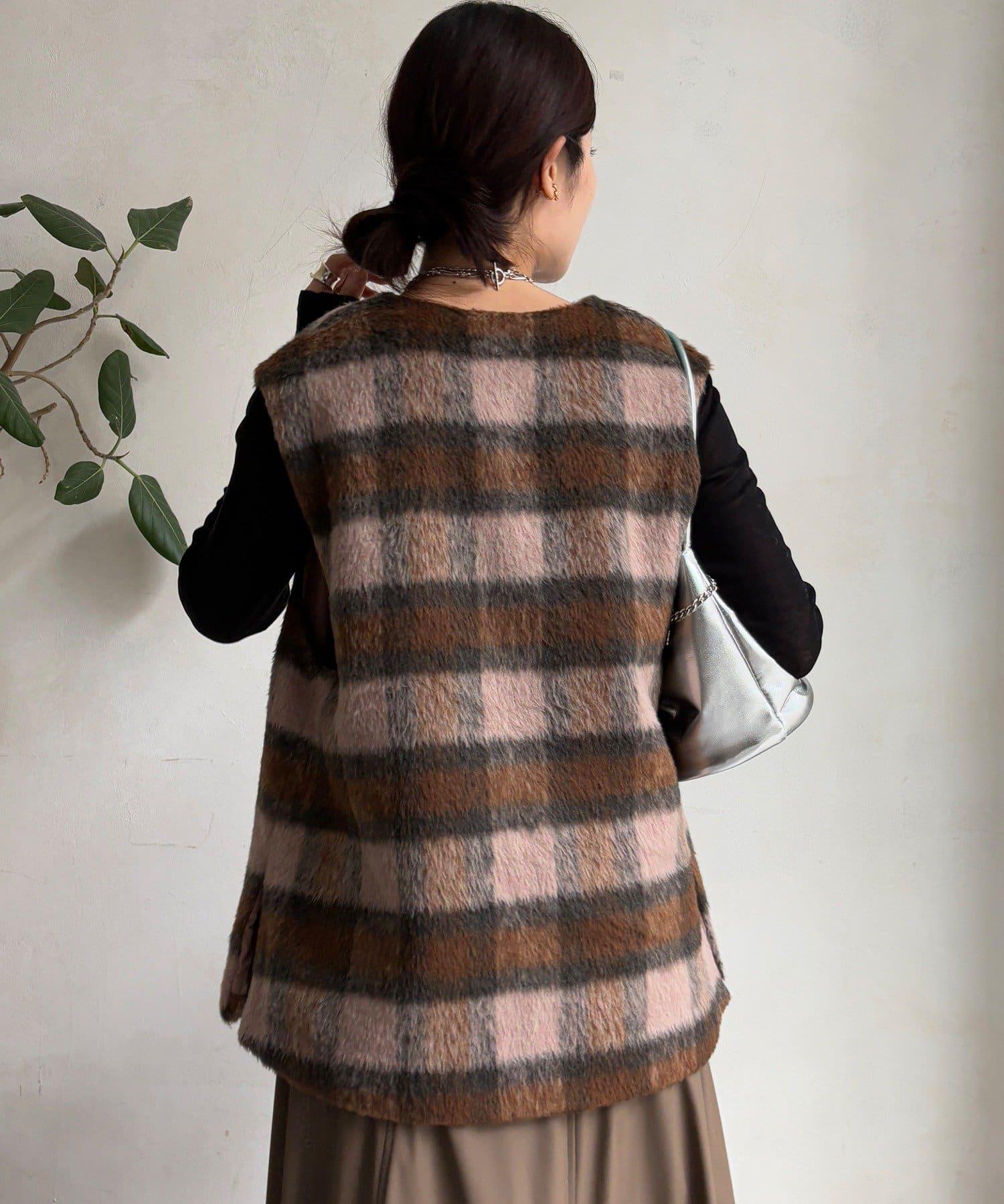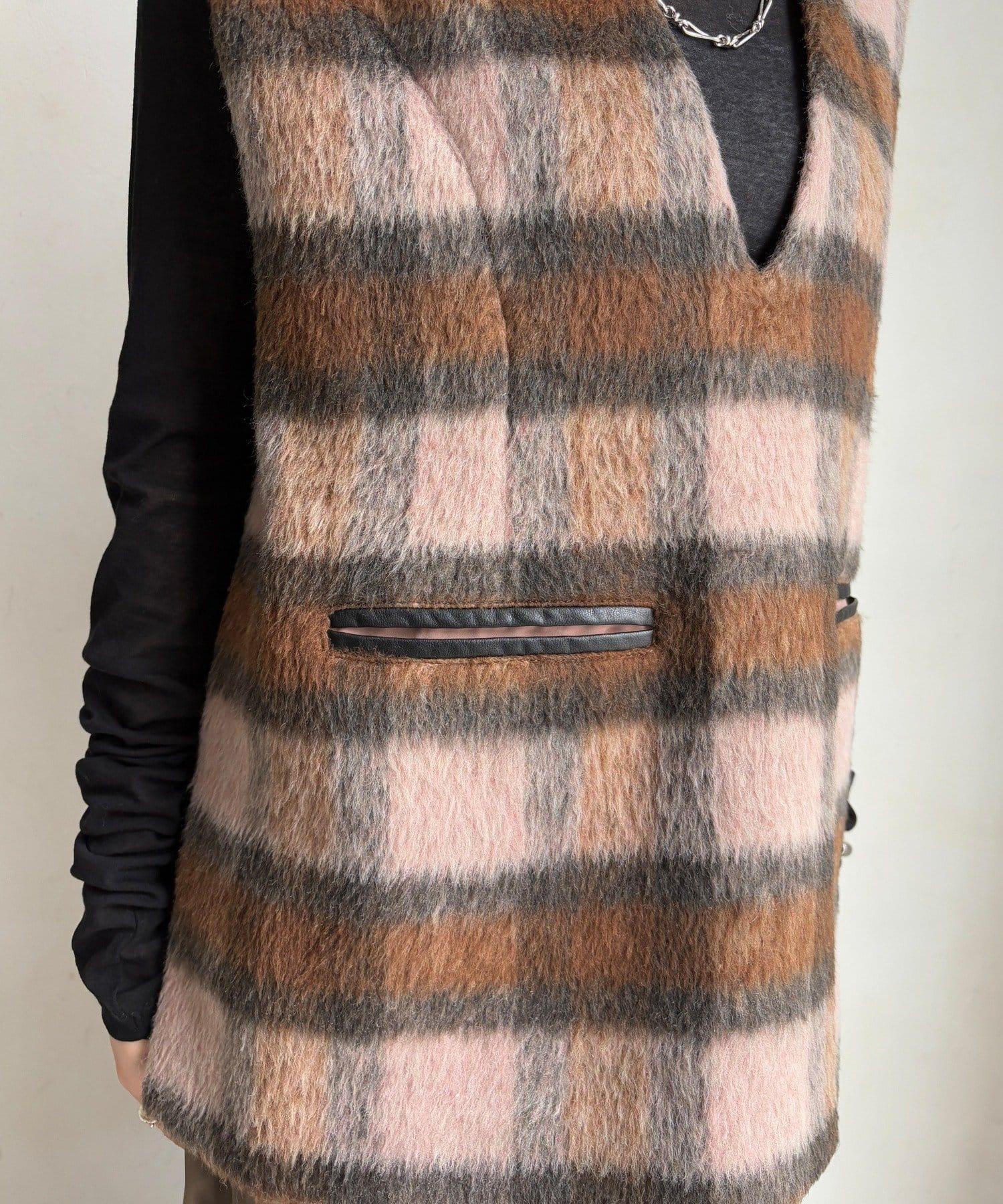 格紋馬甲採用毛茸茸的面料製成,手感蓬鬆舒適。