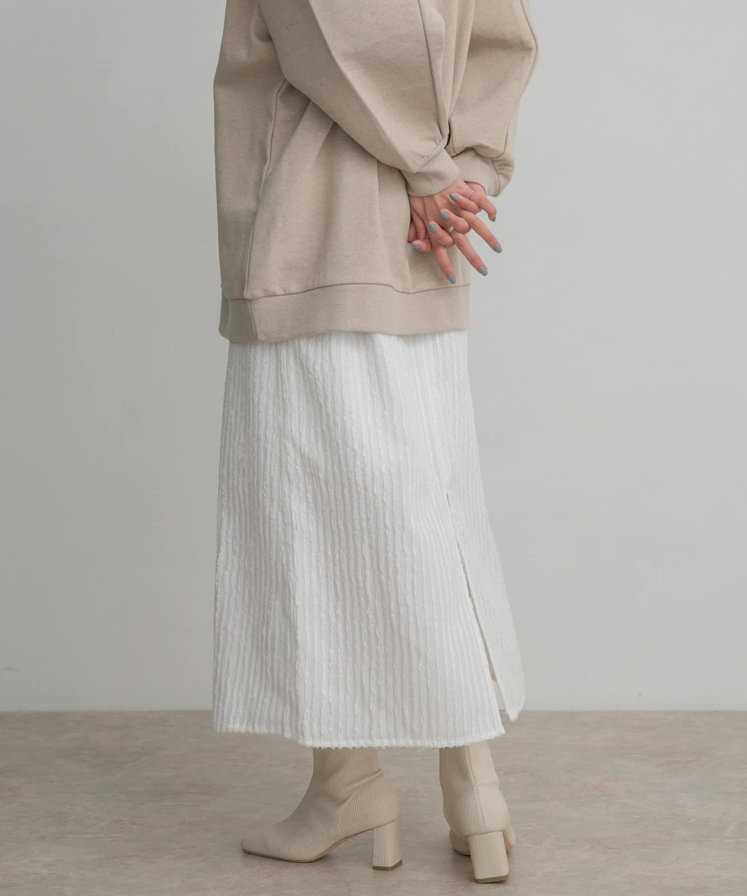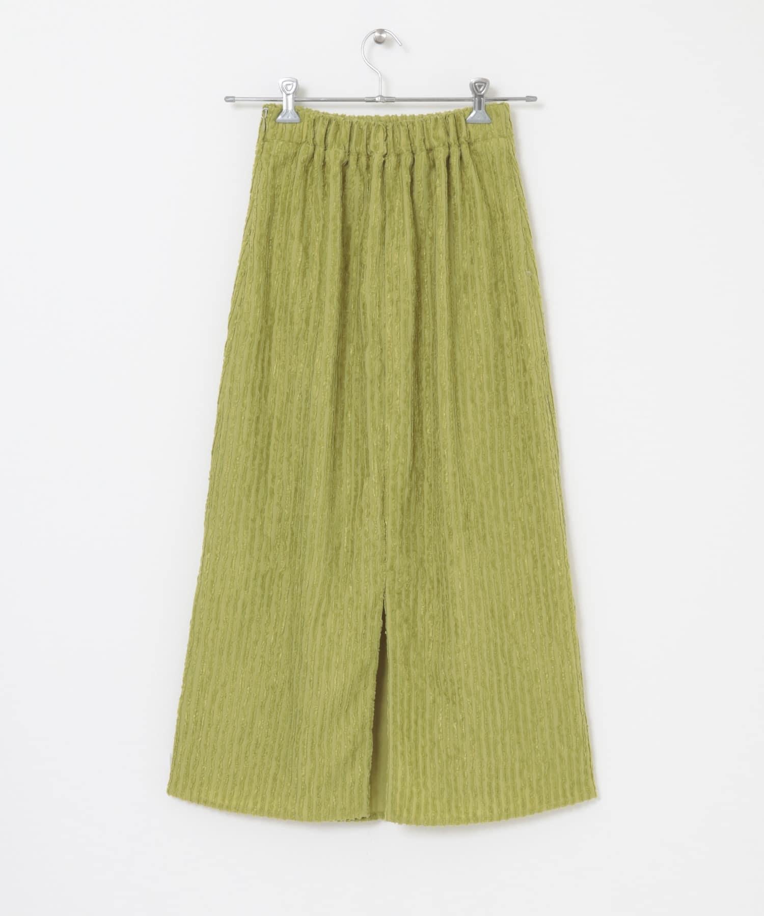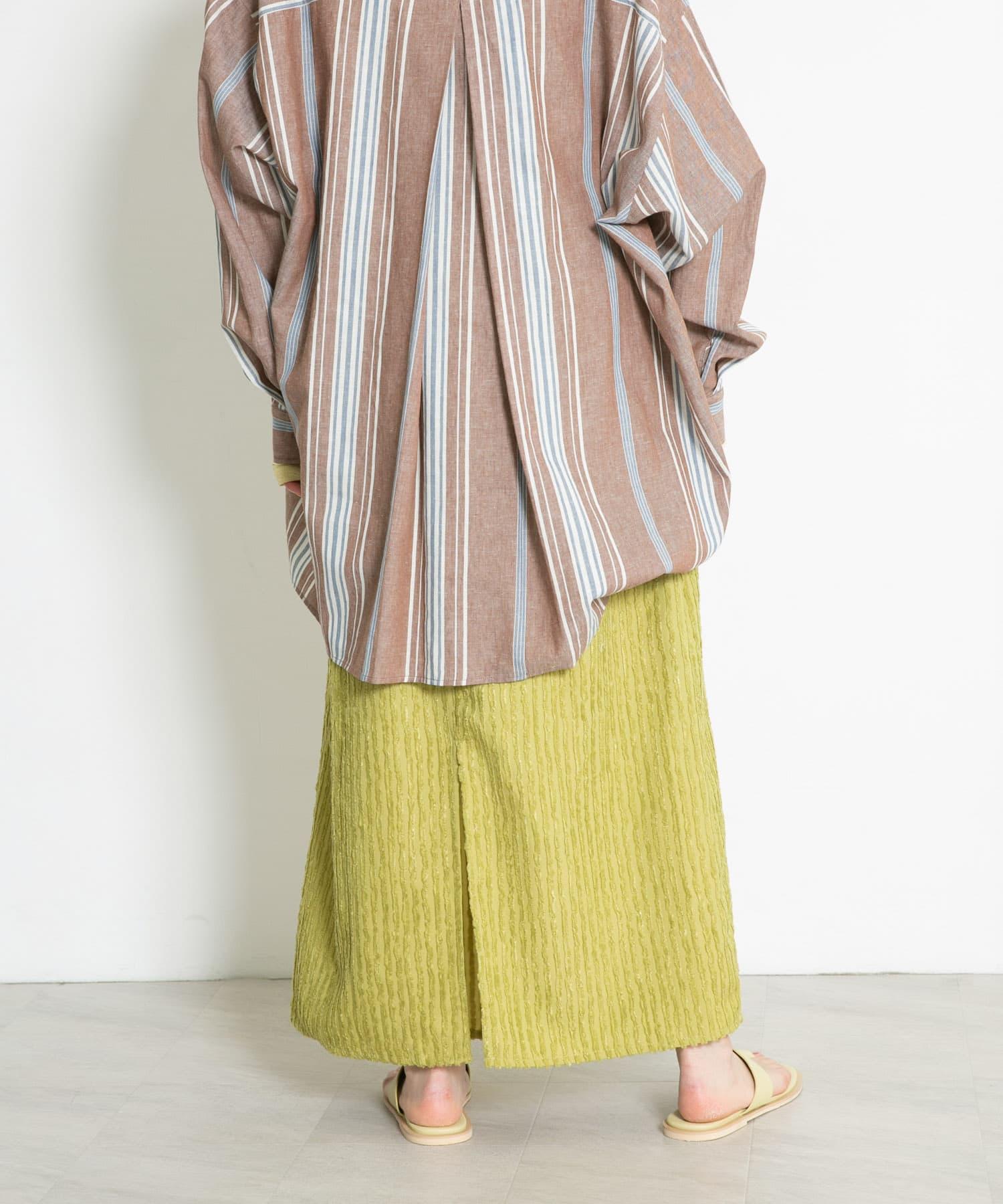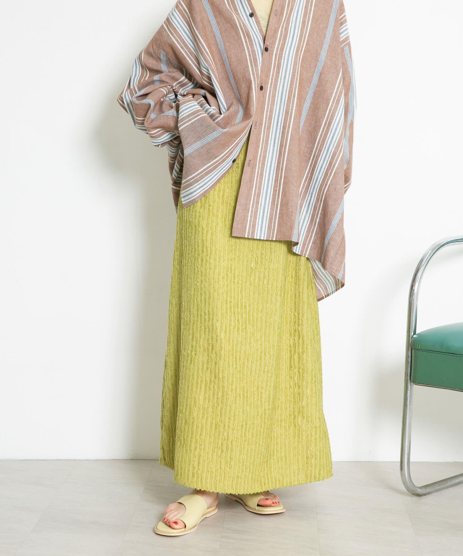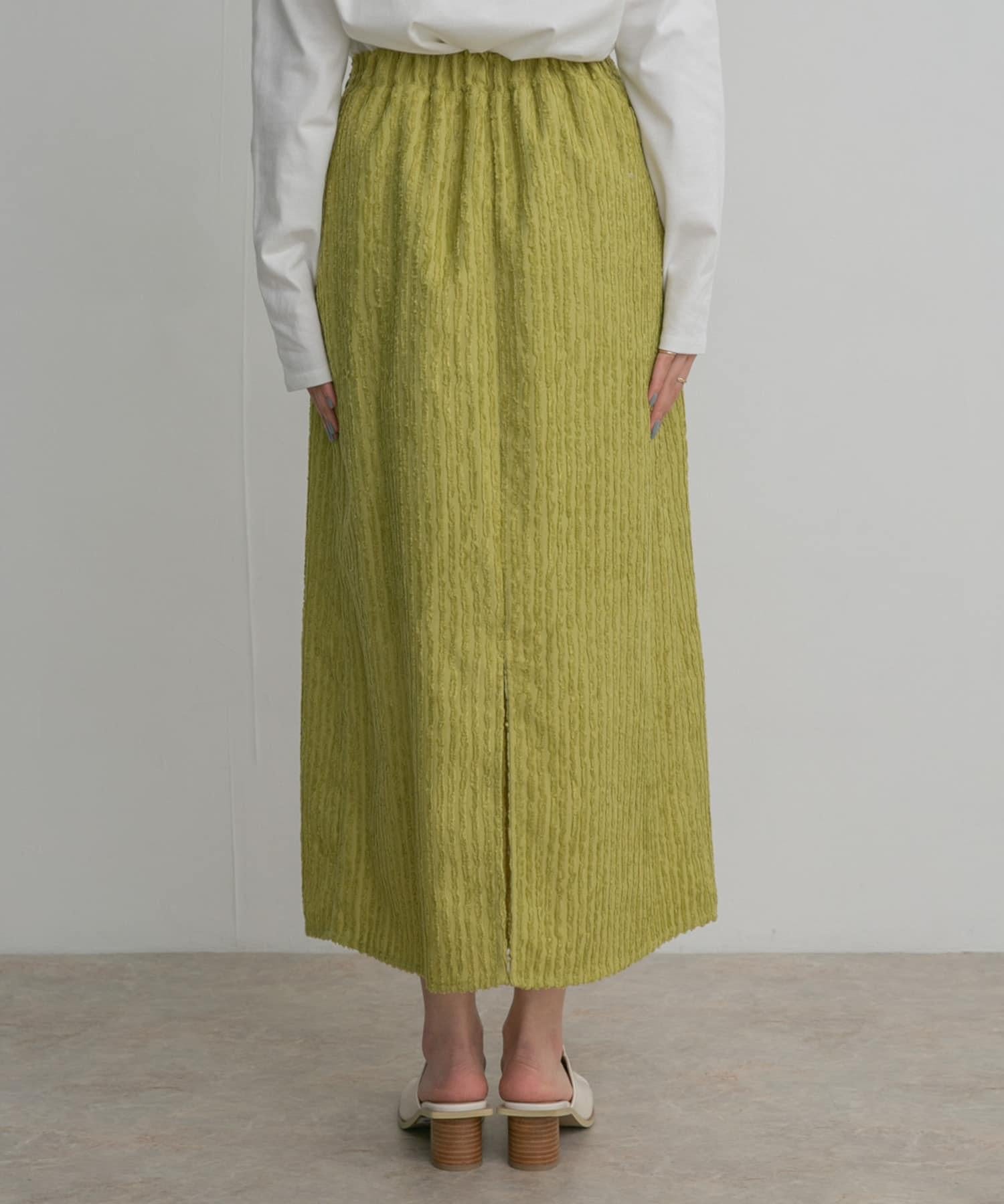 條紋提花圖案的基本款喇叭廓形裙,表面的紋理效果別具一格。值得注意的是,背部的鬆緊設計讓穿著更加舒適,背部的開衩設計營造出良好的休閒感。請選擇您喜歡的顏色。