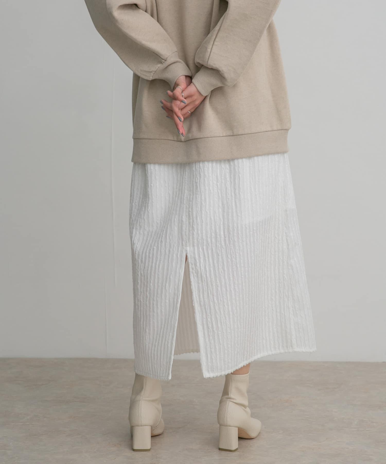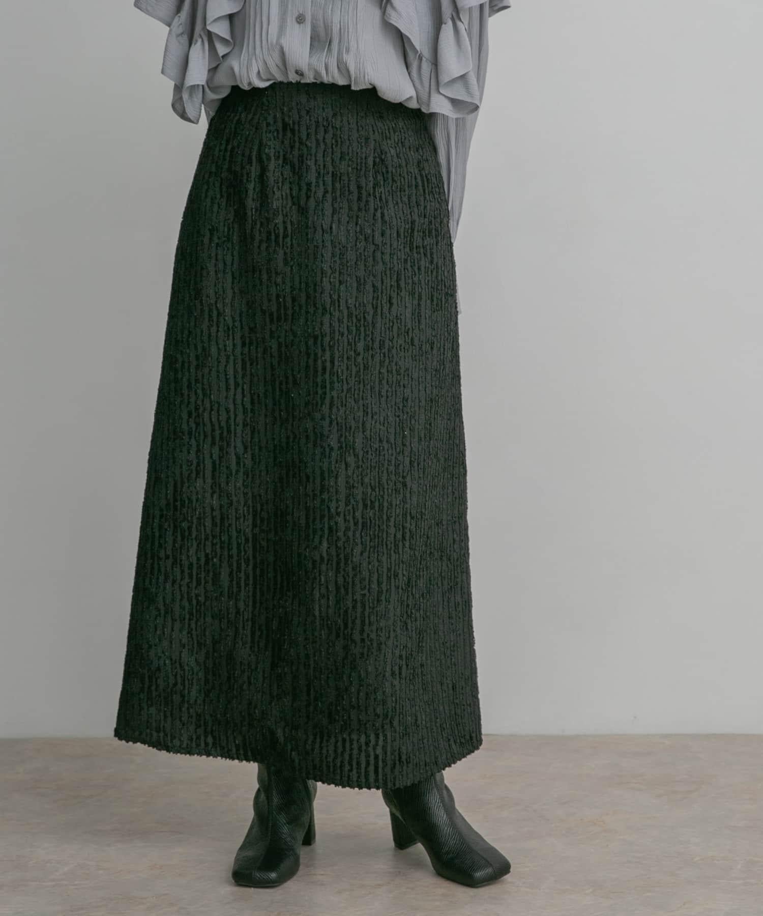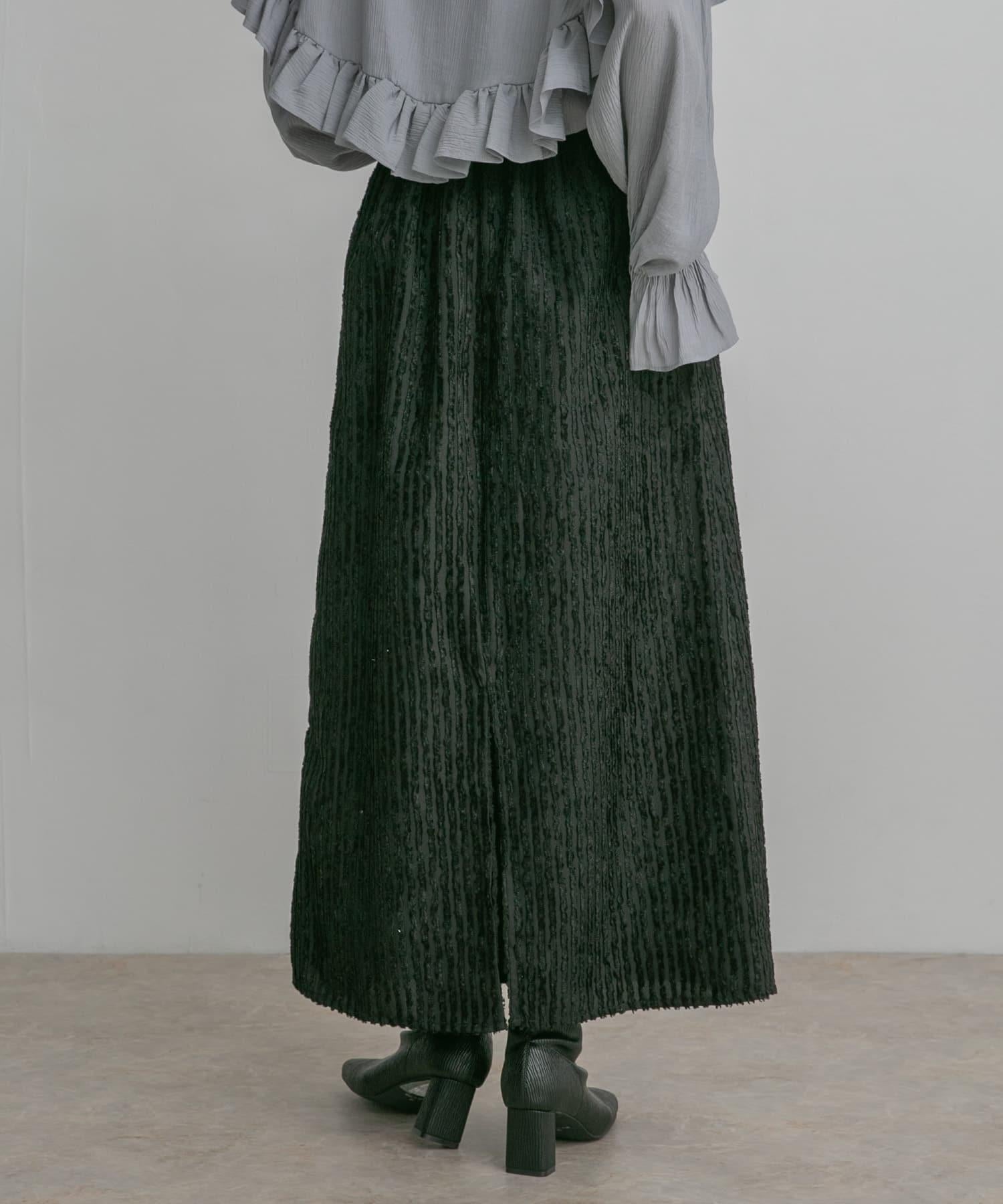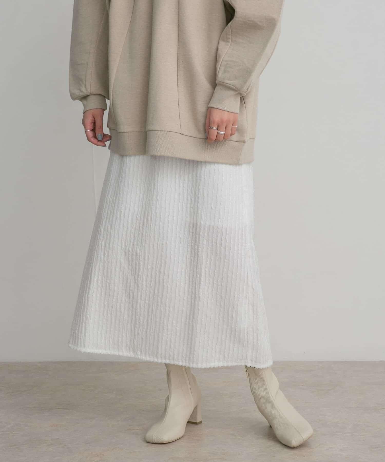 條紋提花圖案的基本款喇叭廓形裙,表面的紋理效果別具一格。值得注意的是,背部的鬆緊設計讓穿著更加舒適,背部的開衩設計營造出良好的休閒感。請選擇您喜歡的顏色。