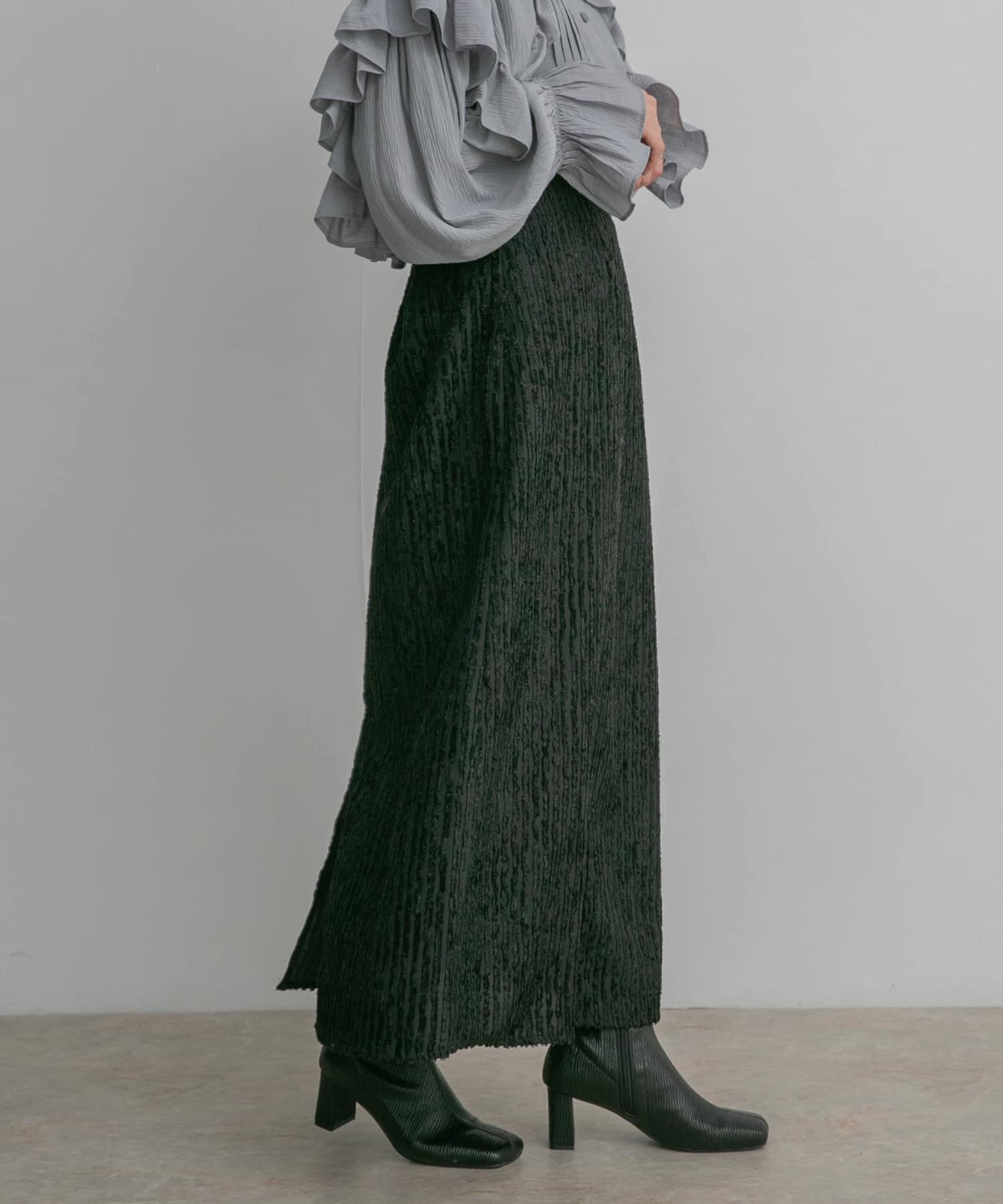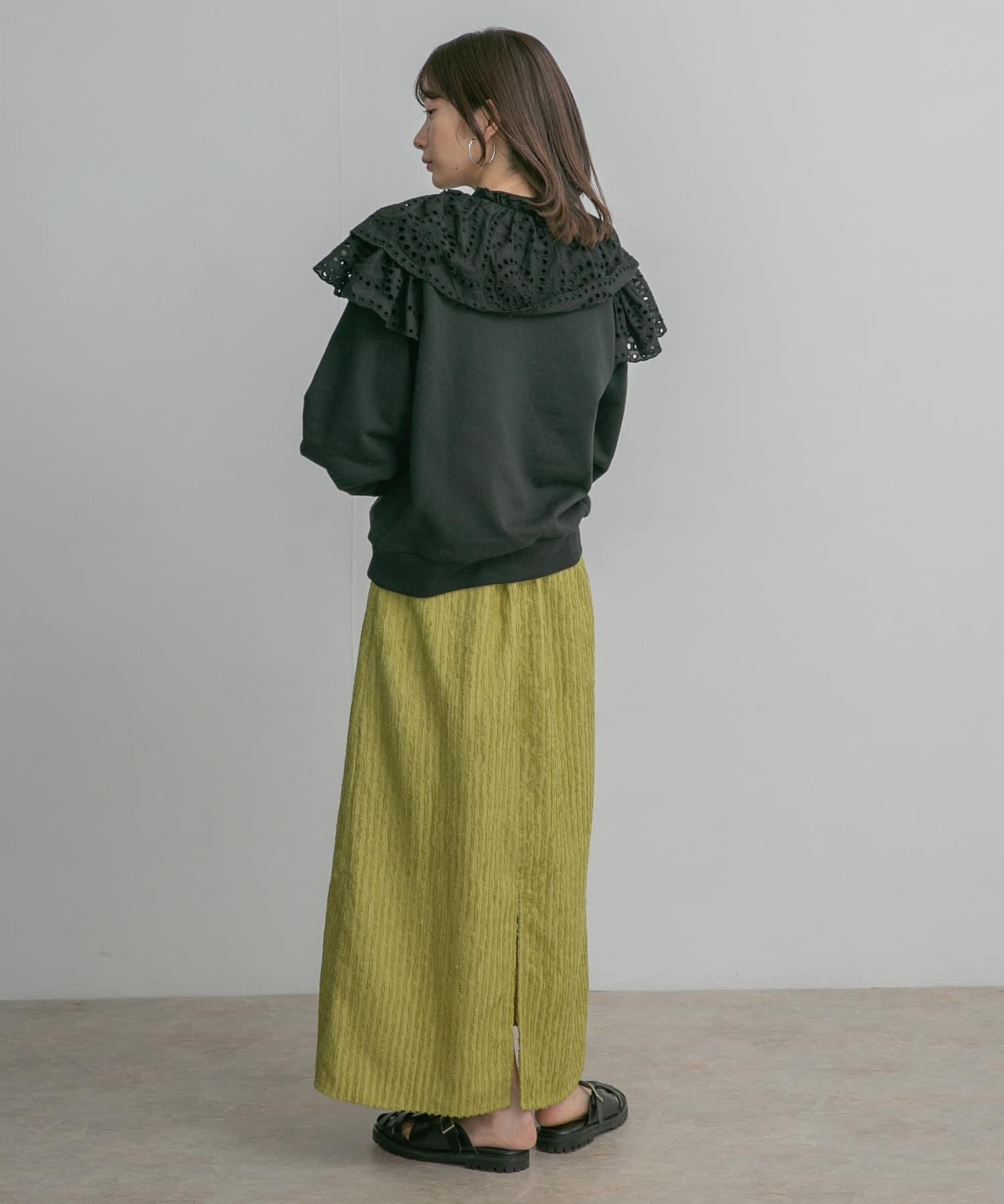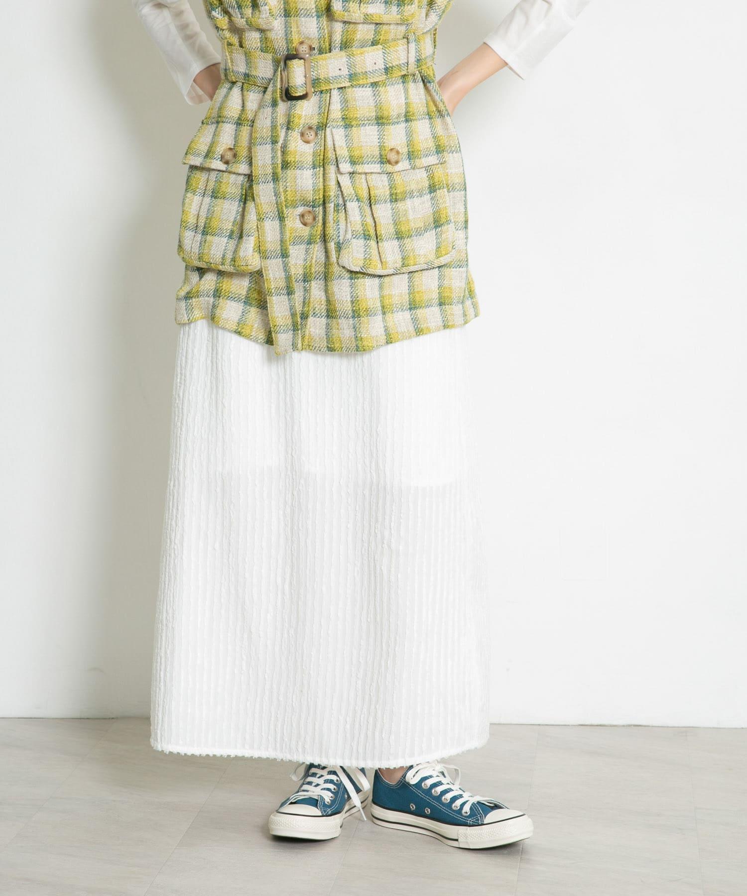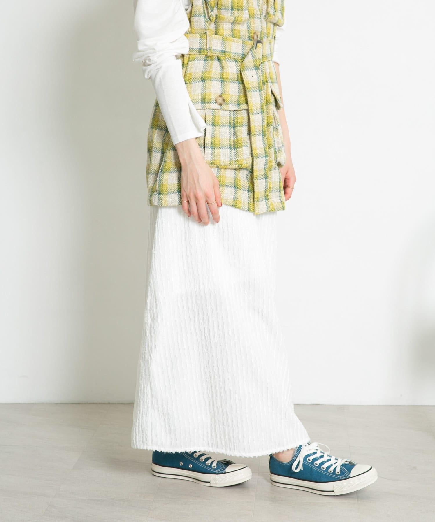 條紋提花圖案的基本款喇叭廓形裙,表面的紋理效果別具一格。值得注意的是,背部的鬆緊設計讓穿著更加舒適,背部的開衩設計營造出良好的休閒感。請選擇您喜歡的顏色。