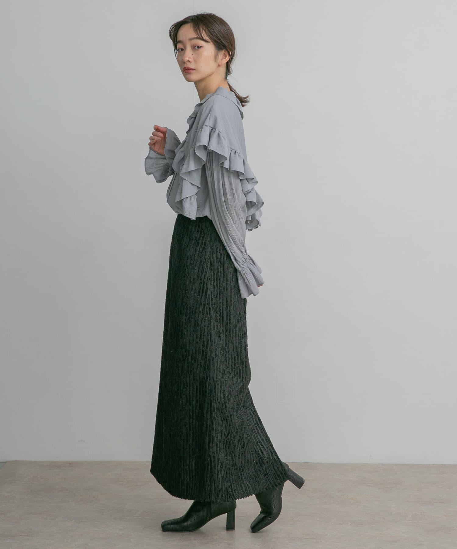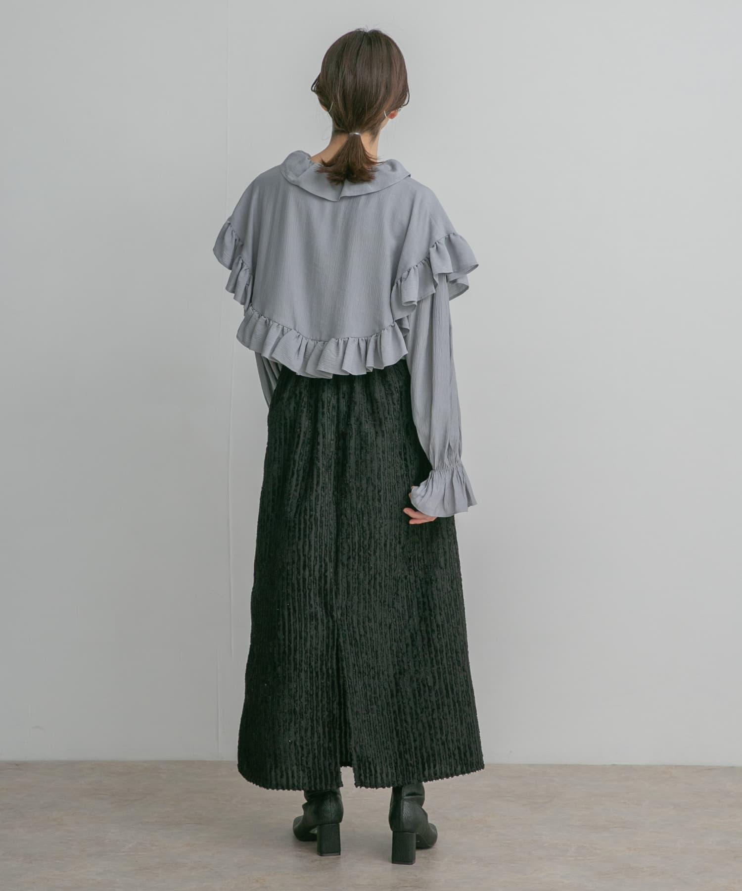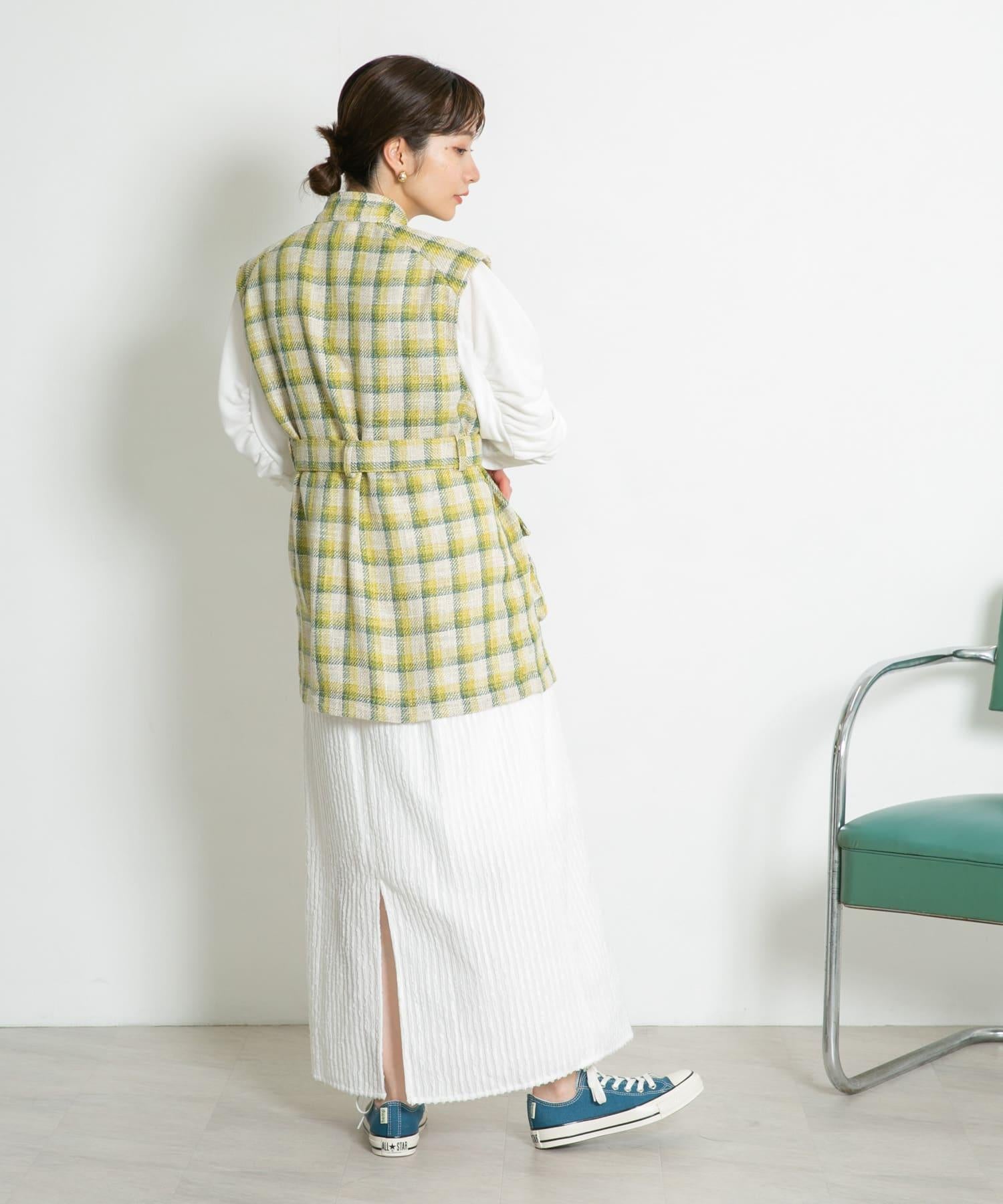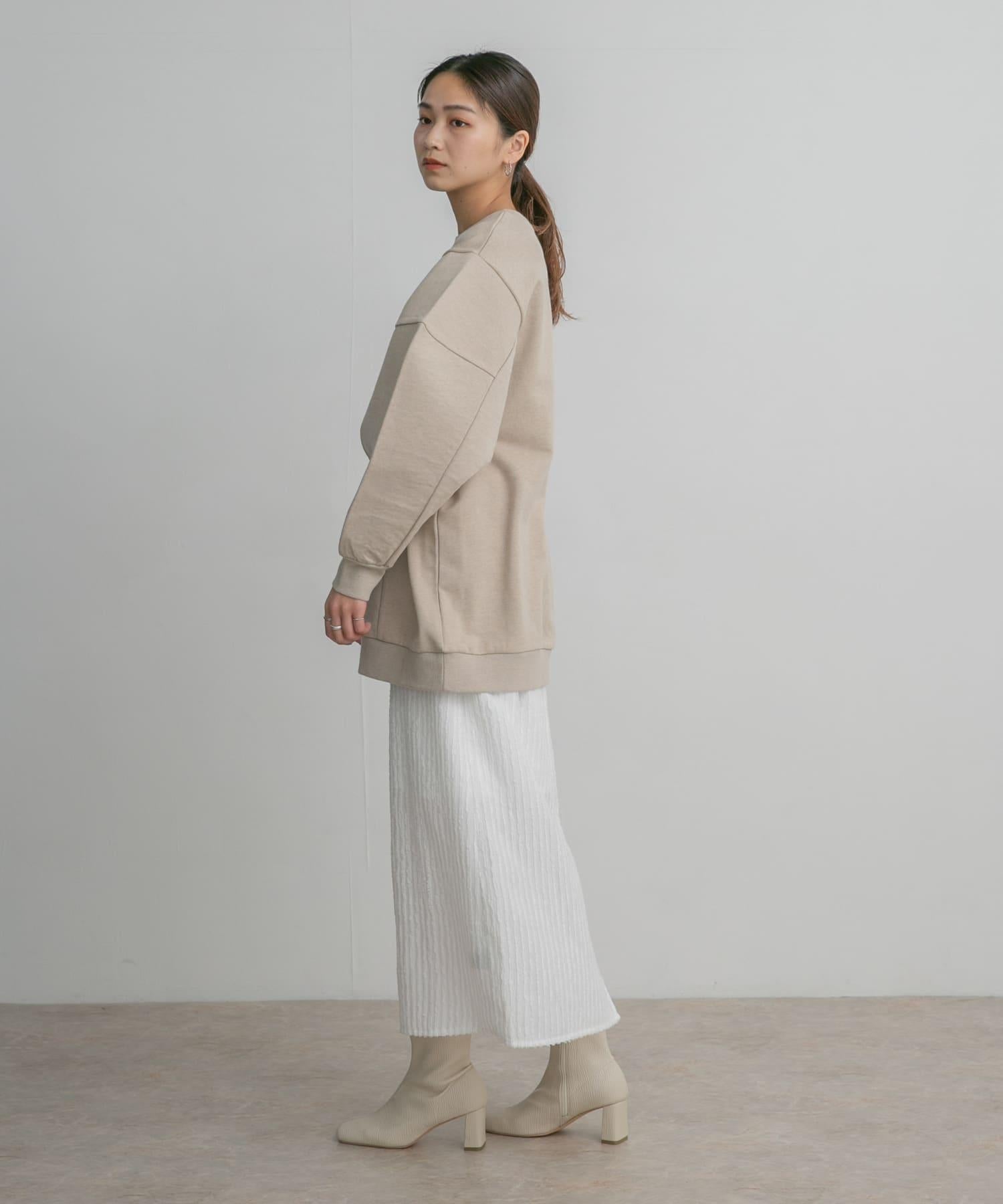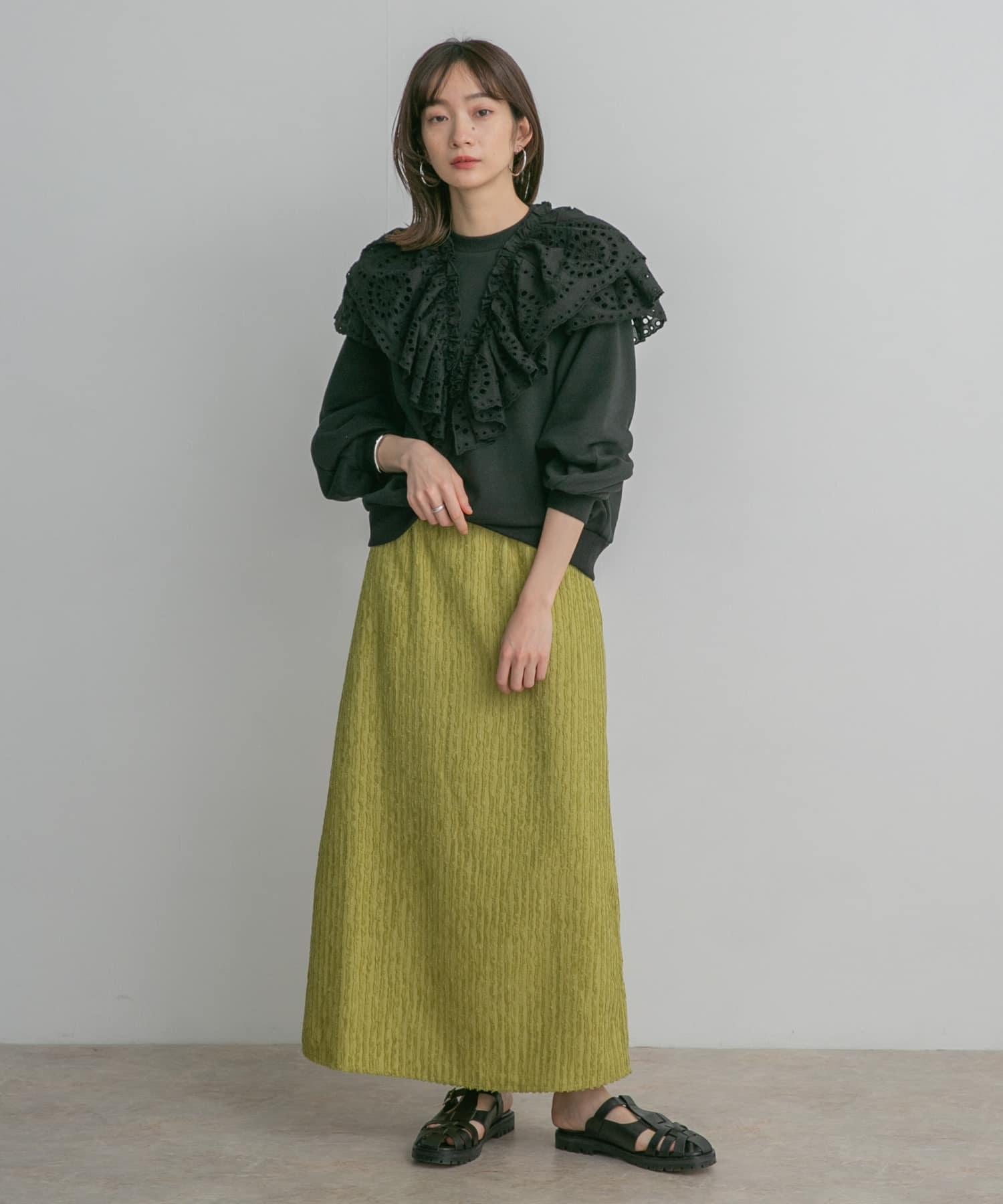 條紋提花圖案的基本款喇叭廓形裙,表面的紋理效果別具一格。值得注意的是,背部的鬆緊設計讓穿著更加舒適,背部的開衩設計營造出良好的休閒感。請選擇您喜歡的顏色。