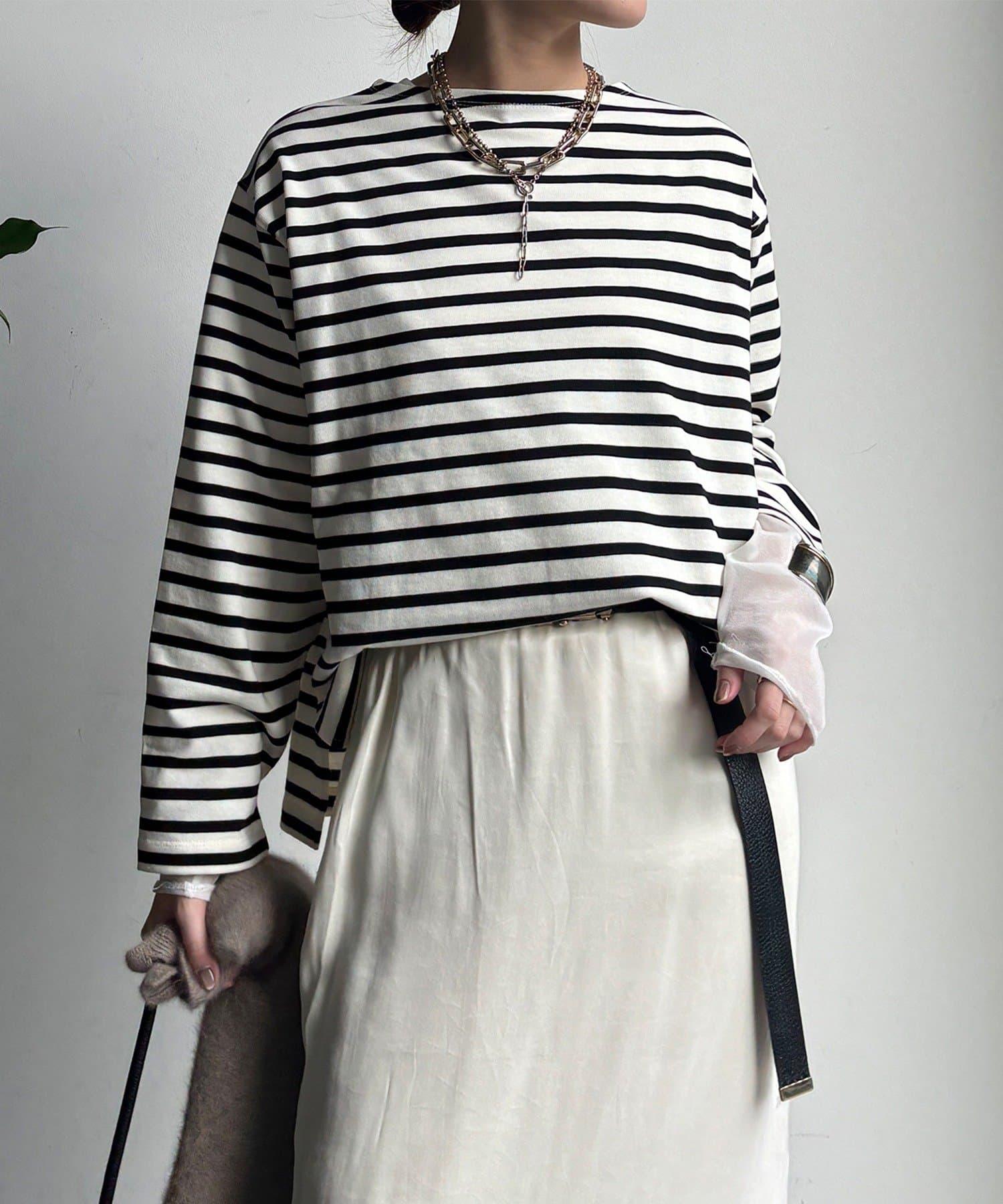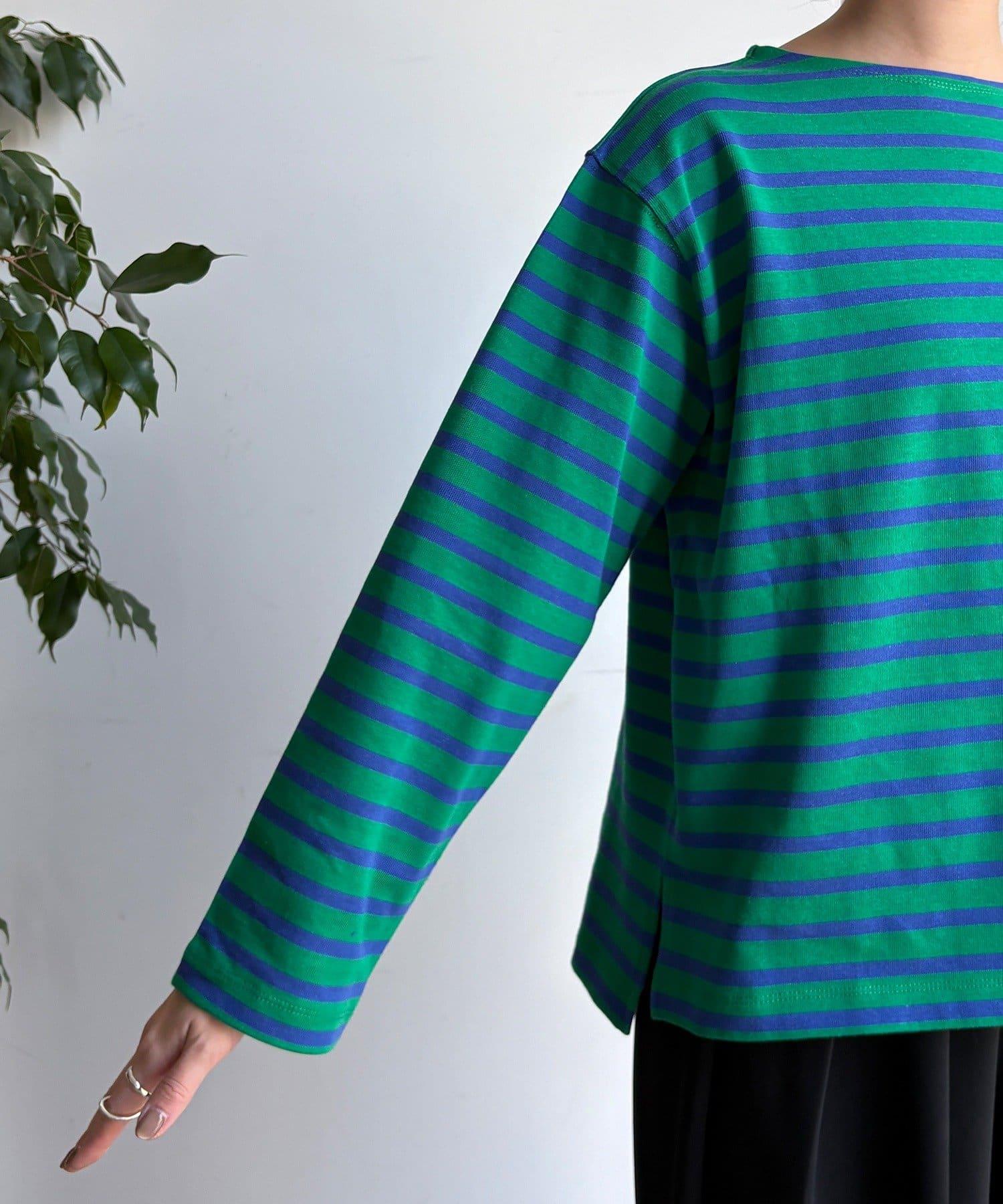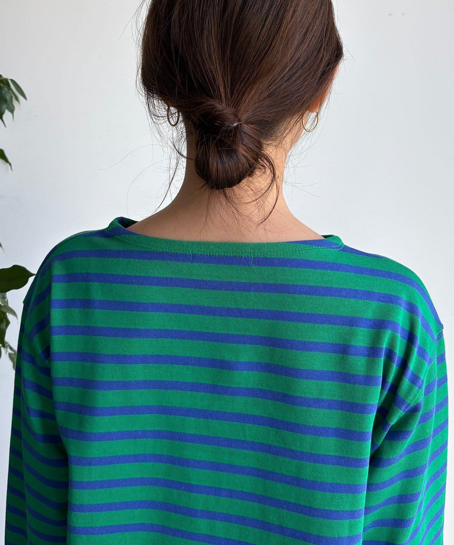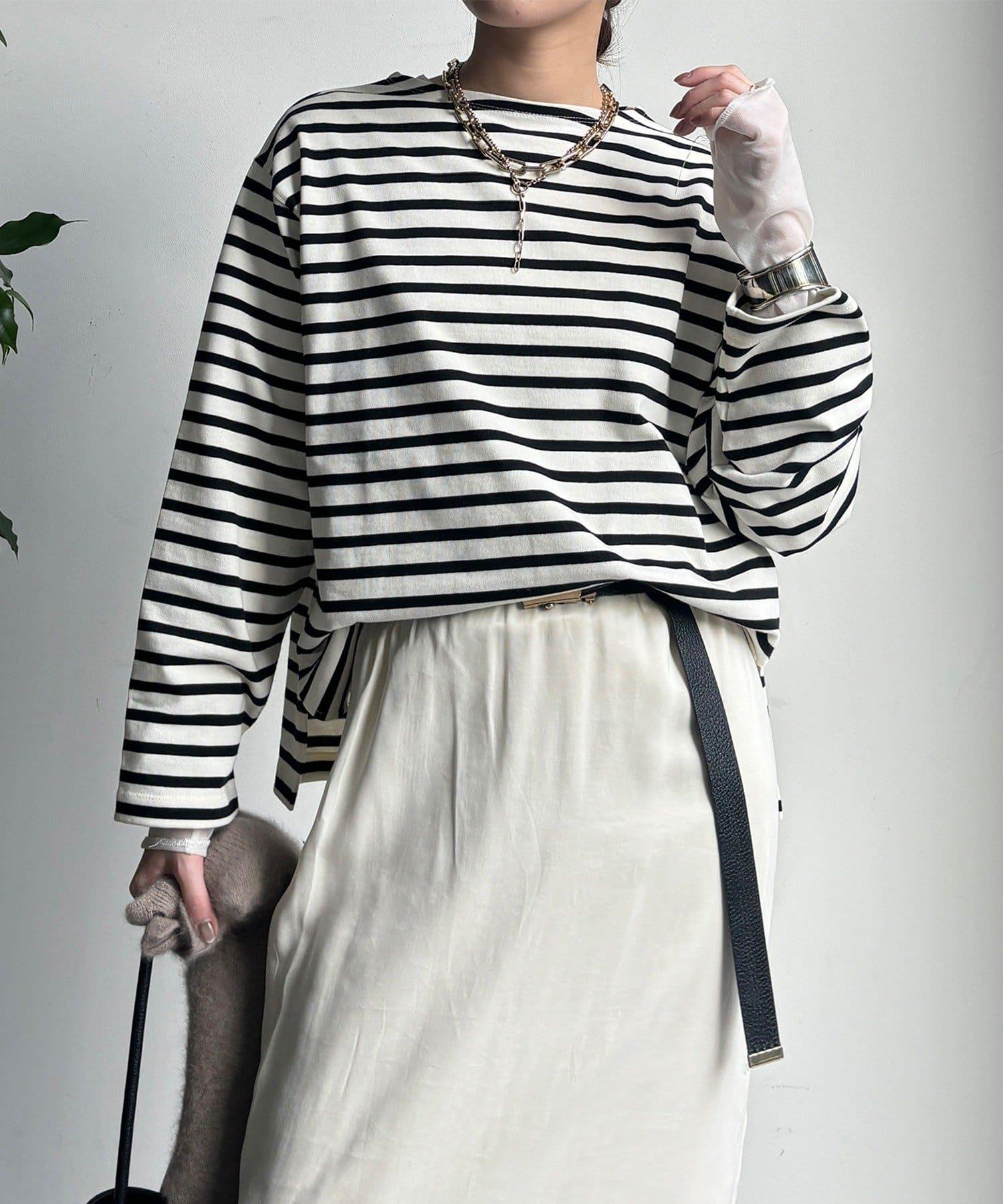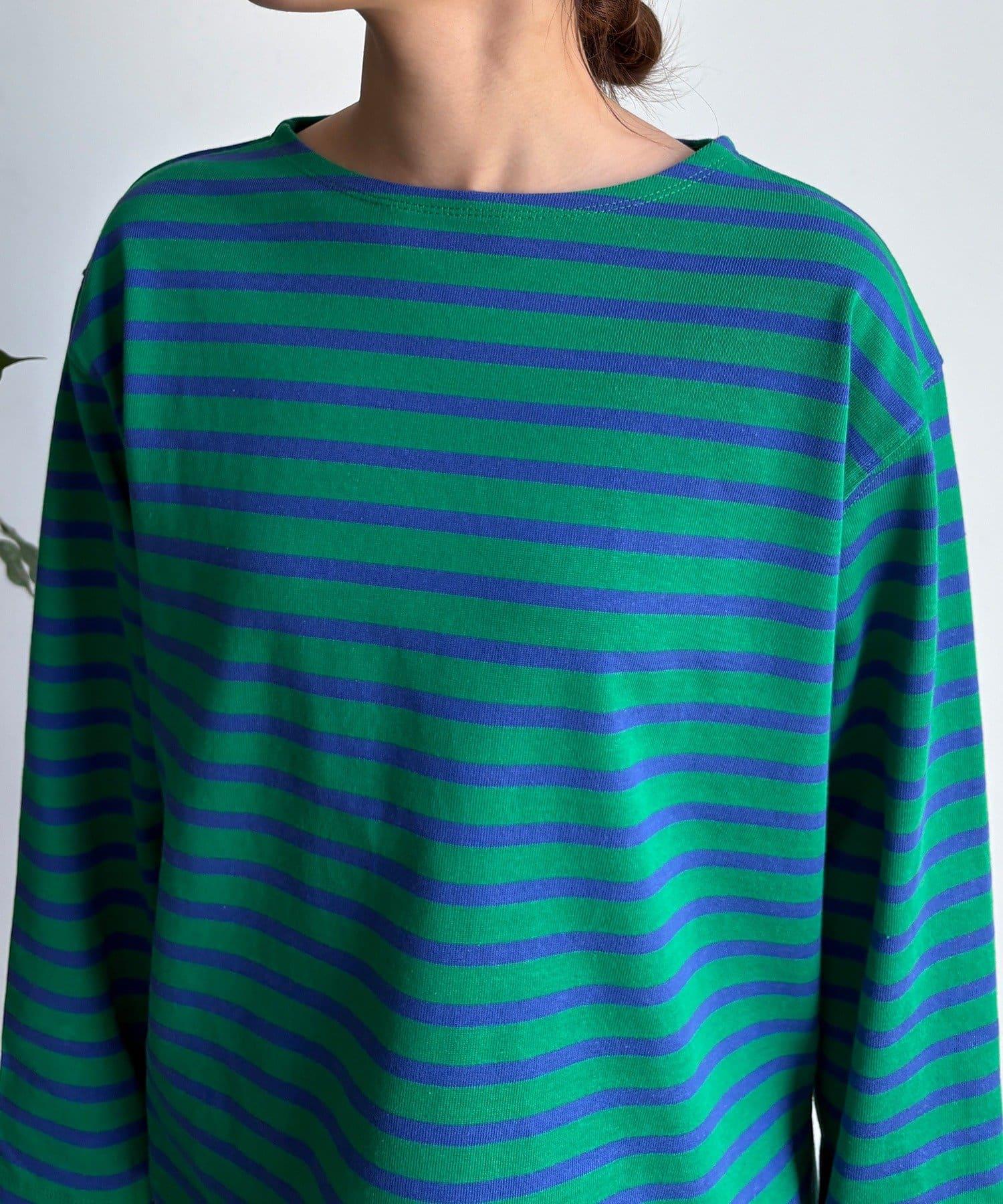 船領長款 T 恤,露出頸部,採用經典條紋圖案。